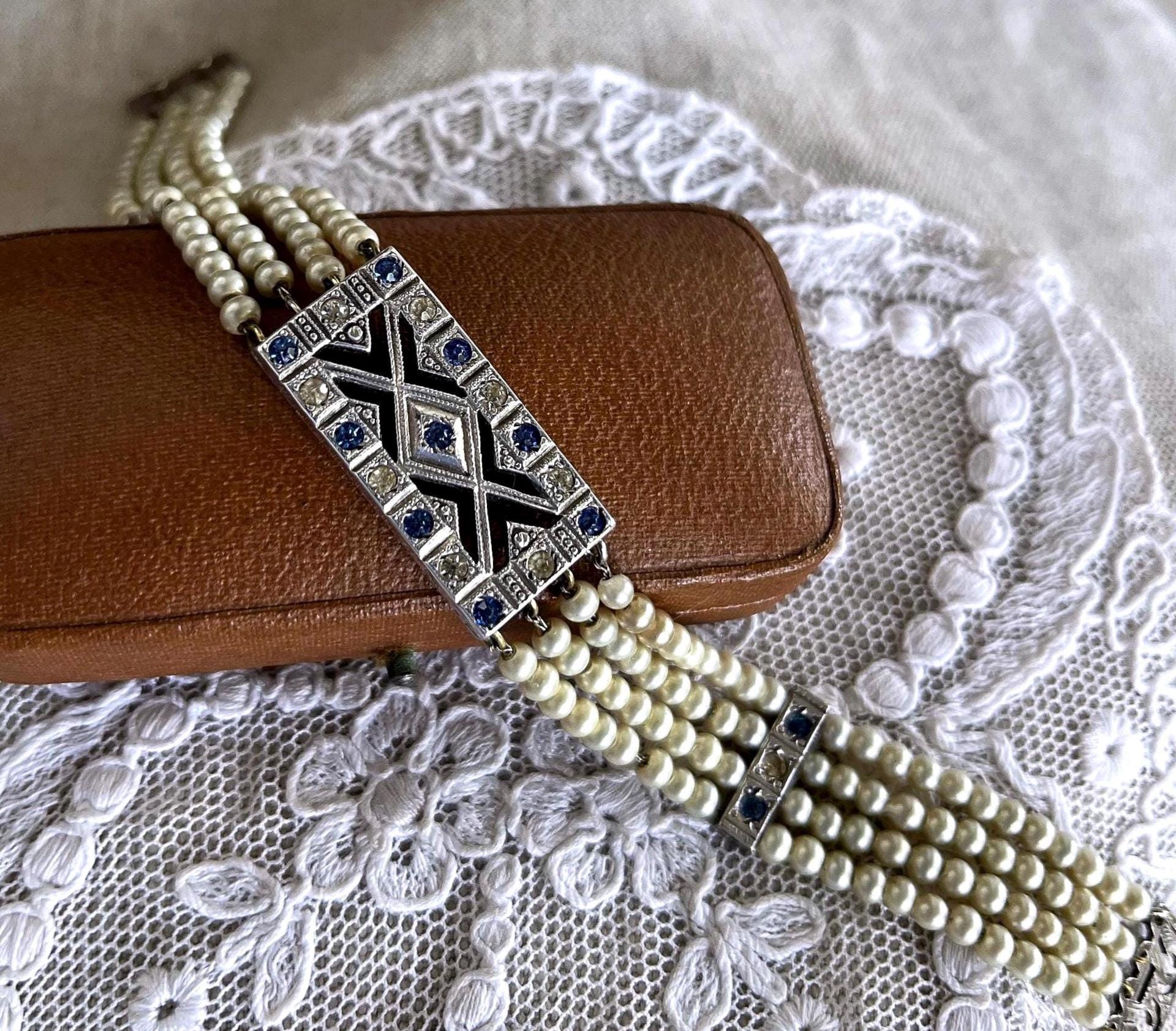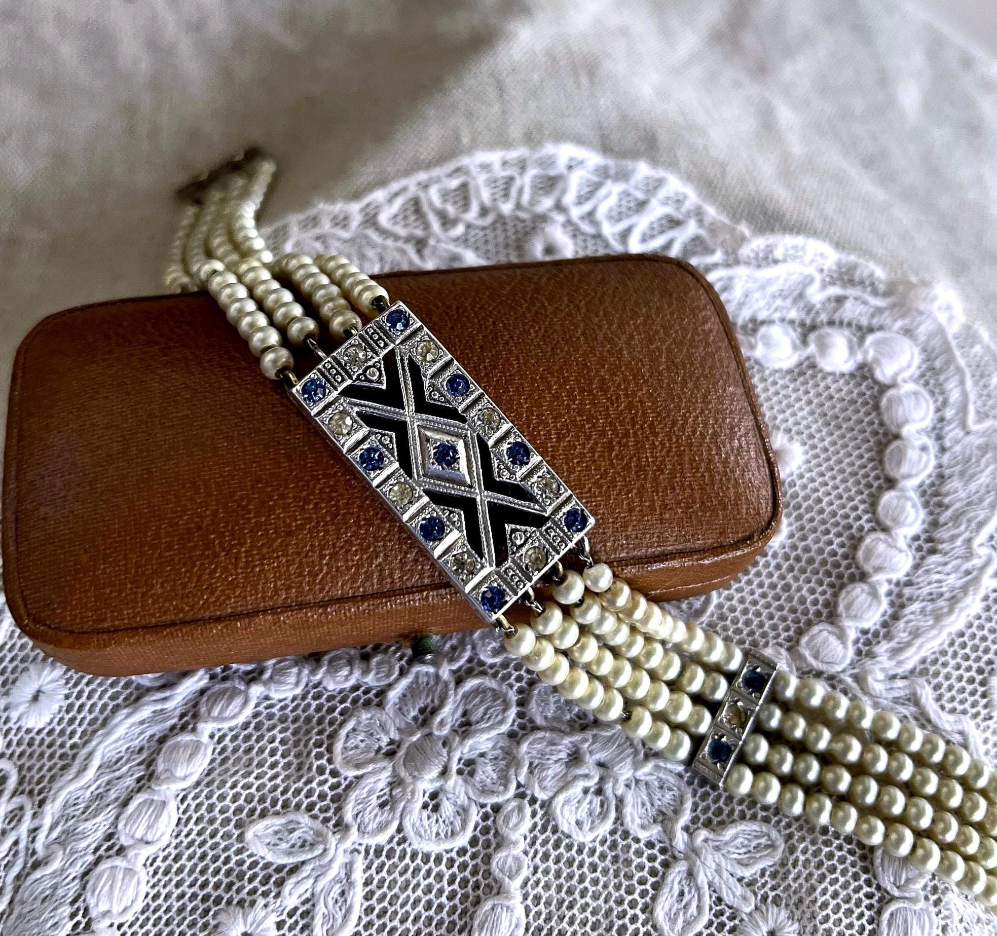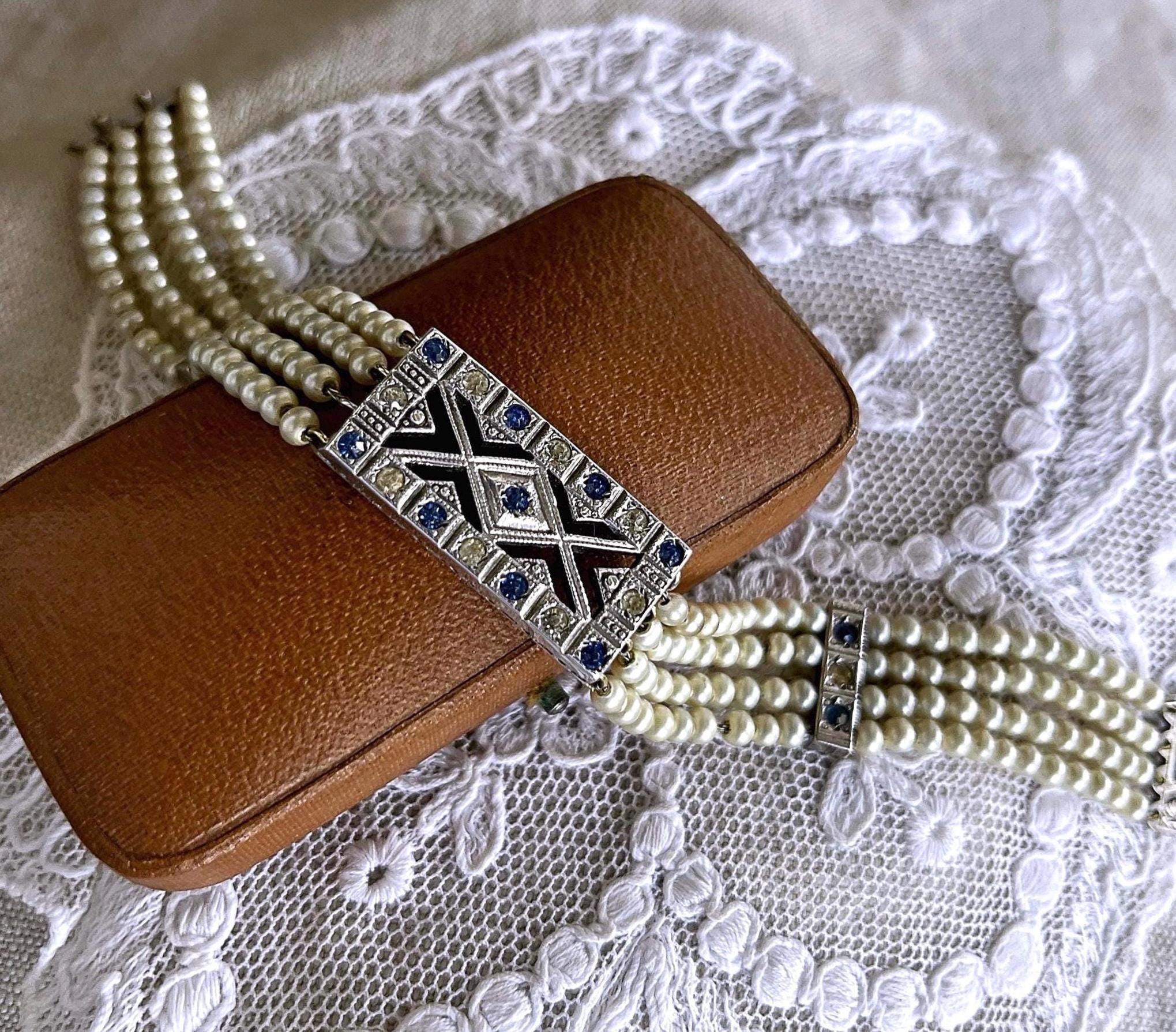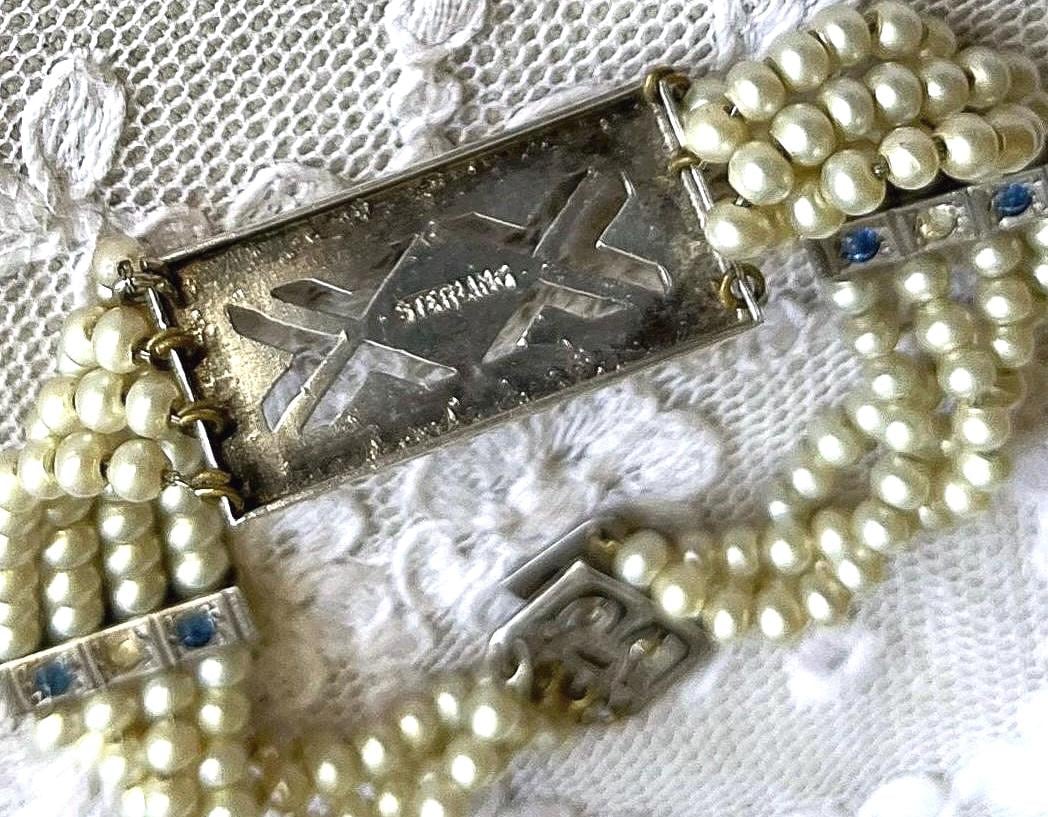 Featuring a feminine dainty antique Art Deco 1920-30s solid sterling silver triple strand Majorica glass pearl bracelet accented with brilliant faceted sapphire blue and white paste stones set in closed back settings. Bracelet is in excellent antique condition with functional antique button clasp, hallmarked STERLING on the inside of center focal point, with all stones intact. Bracelet measures approximately 7 inches around at 13.8 grams respectively. Such a beautiful antique bracelet, unique and one of a kind!