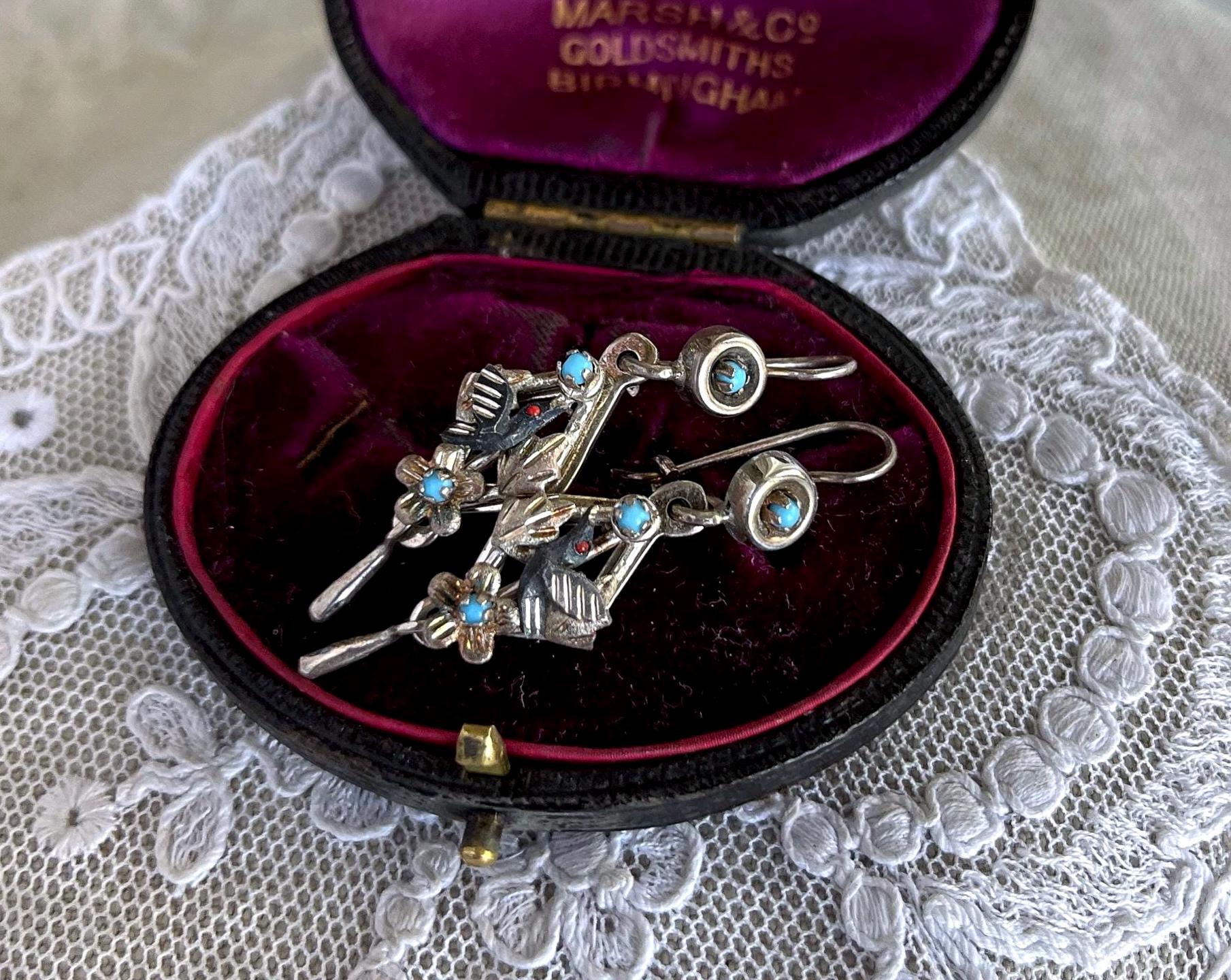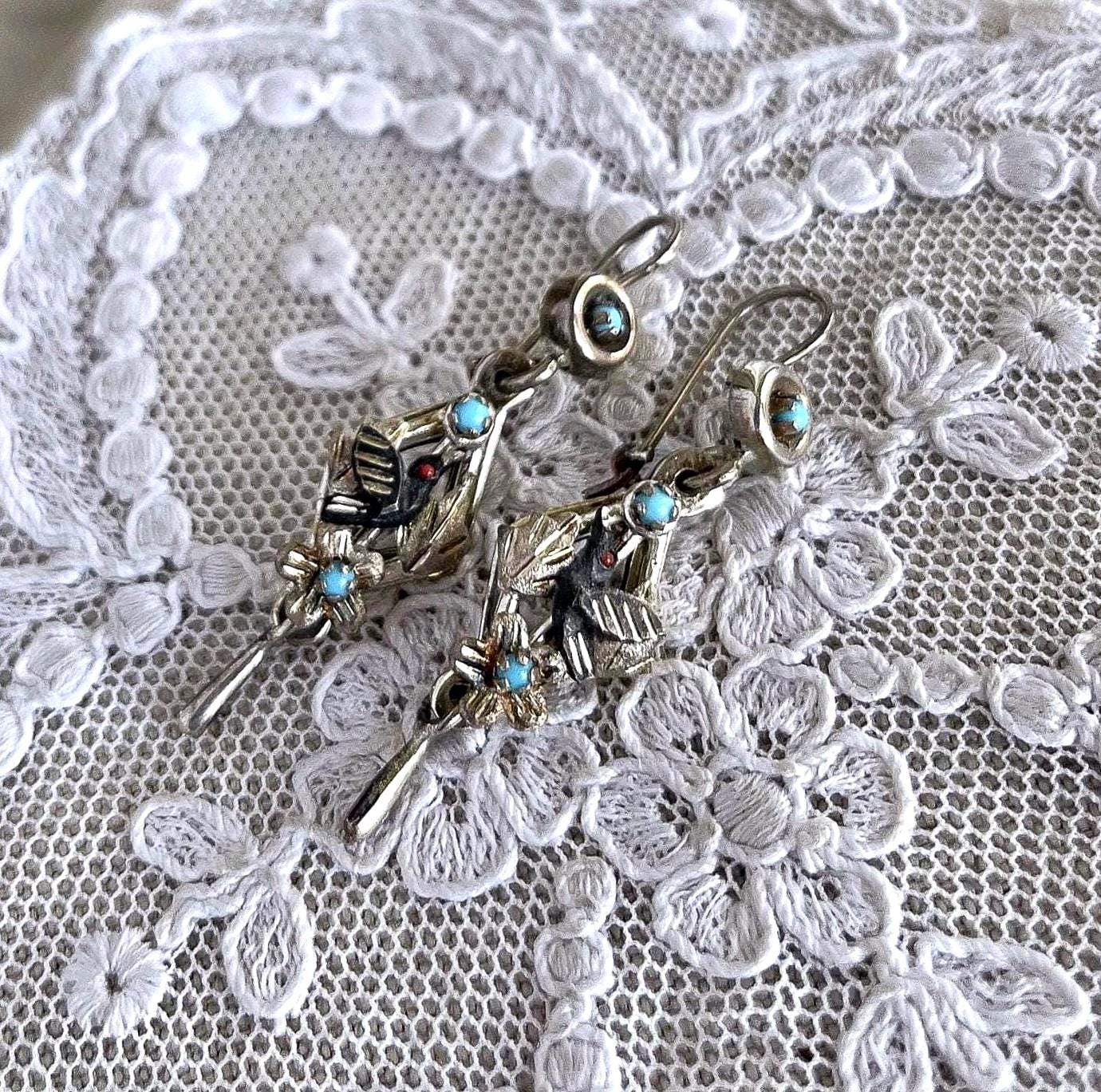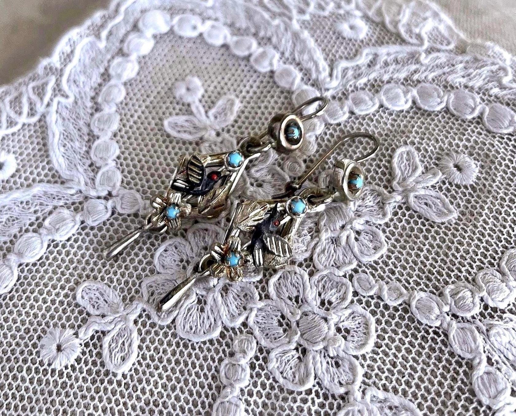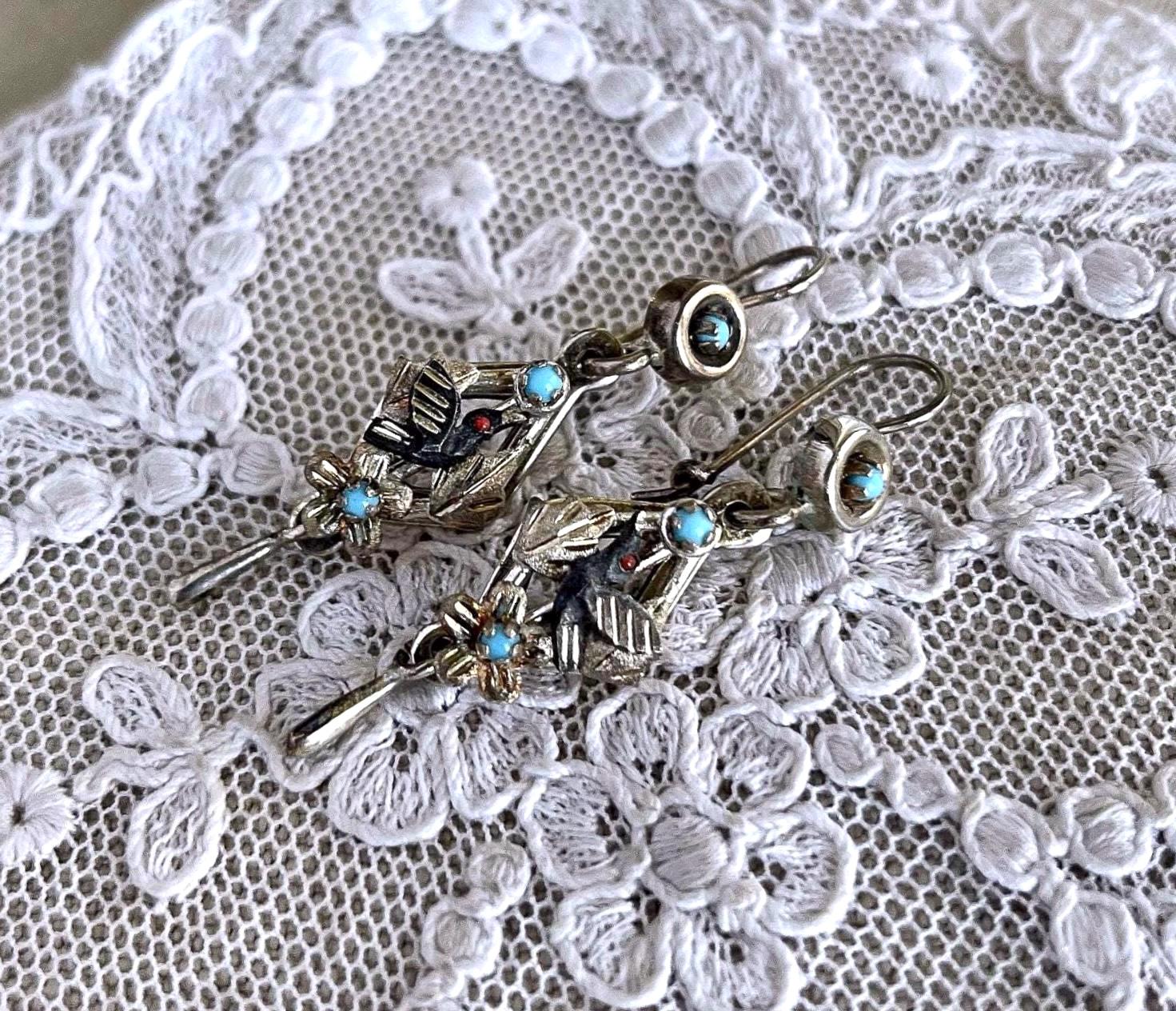 Featuring a unique pair of vintage Victorian revival pierced sterling silver Bird drop earrings adorned with genuine Coral and turquoise seed beads. Earrings are in excellent vintage condition, with functional intact clasps with all stones present. Measuring approximately 2 inches long at 6.52 grams respectively. Stamped on reverse , these are so beautiful, highly collectible and wearable.