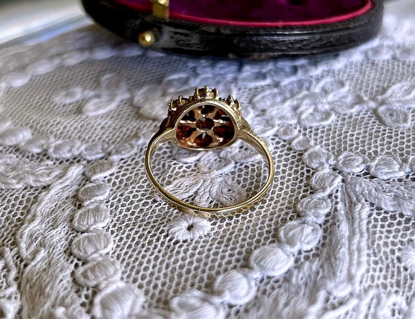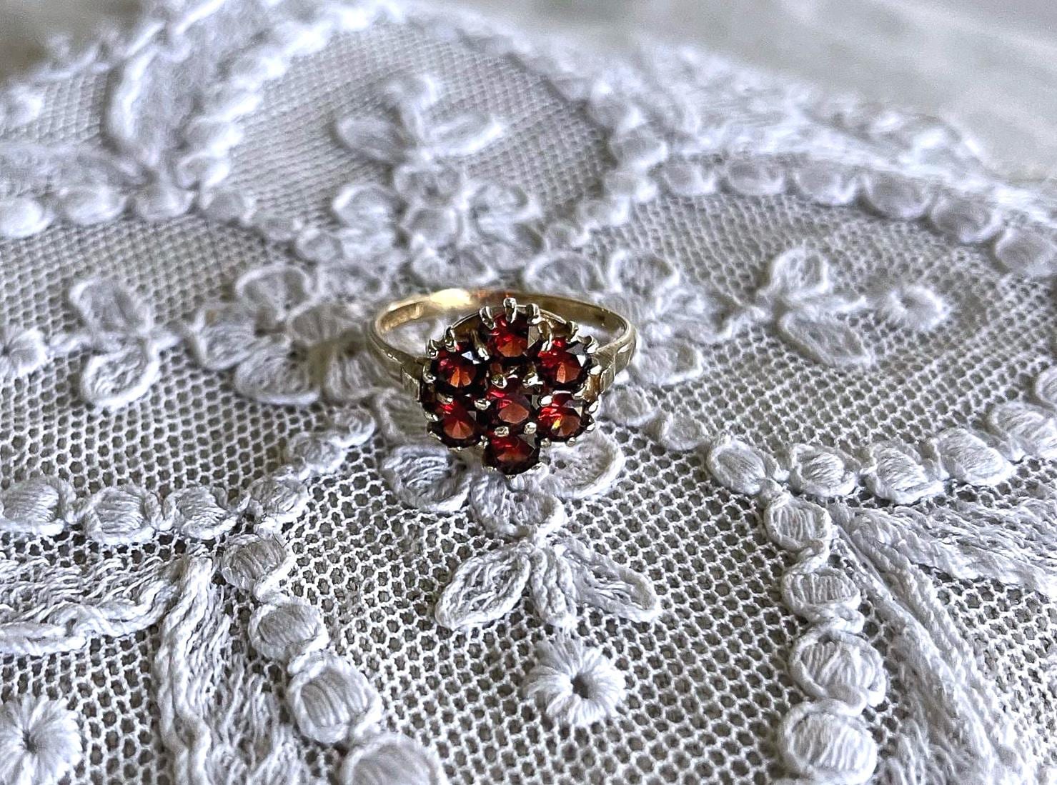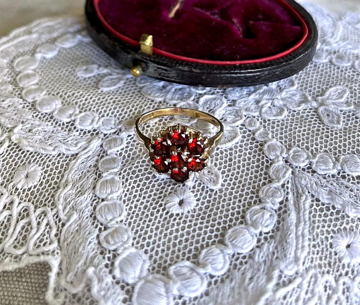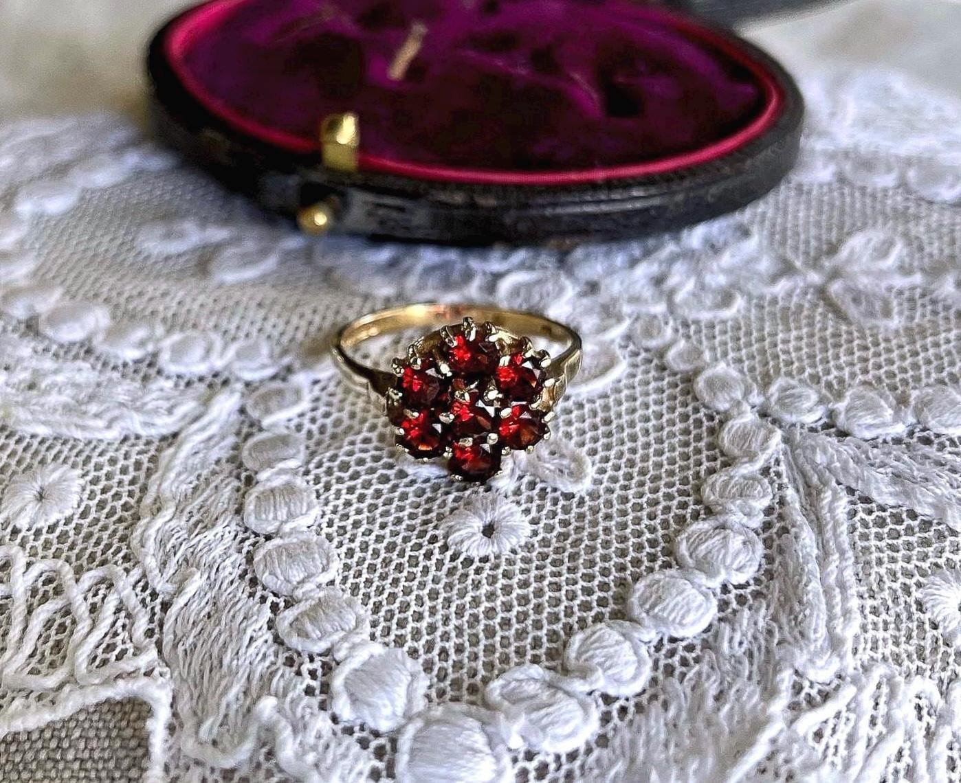 Featuring a wonderful vintage 9ct yellow gold Bohemian Revival Cluster ring adorned with beautiful faceted Rose Cut Garnets set in a beautiful gold setting. Ring is in beautiful condition with normal wear, stamped 333 FR 2 on the inside of band with all stones intact and accounted for. Approximately size 6 at 2.5 grams respectively this is a collectible wearable Heirloom piece, beautifully designed!