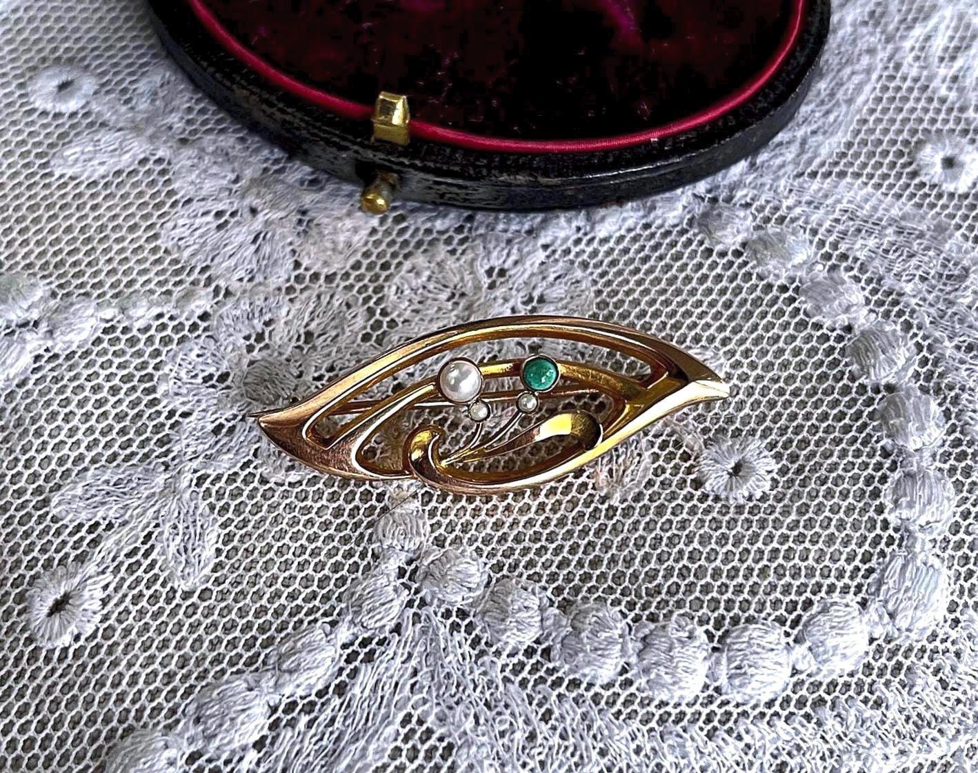 Featuring a lovely antique Art Nouveau 9K yellow and rose gold Lapel brooch adorned with luminous genuine seed pearls and Peking glass set in a decorative flowing settings. Brooch measure approximately 1.2 inch long at 1.61 grams respectively and is in excellent vintage condition, with all stones intact, hallmarked 9ct on the reverse. A charming piece, ready to wear and pass on for generations.