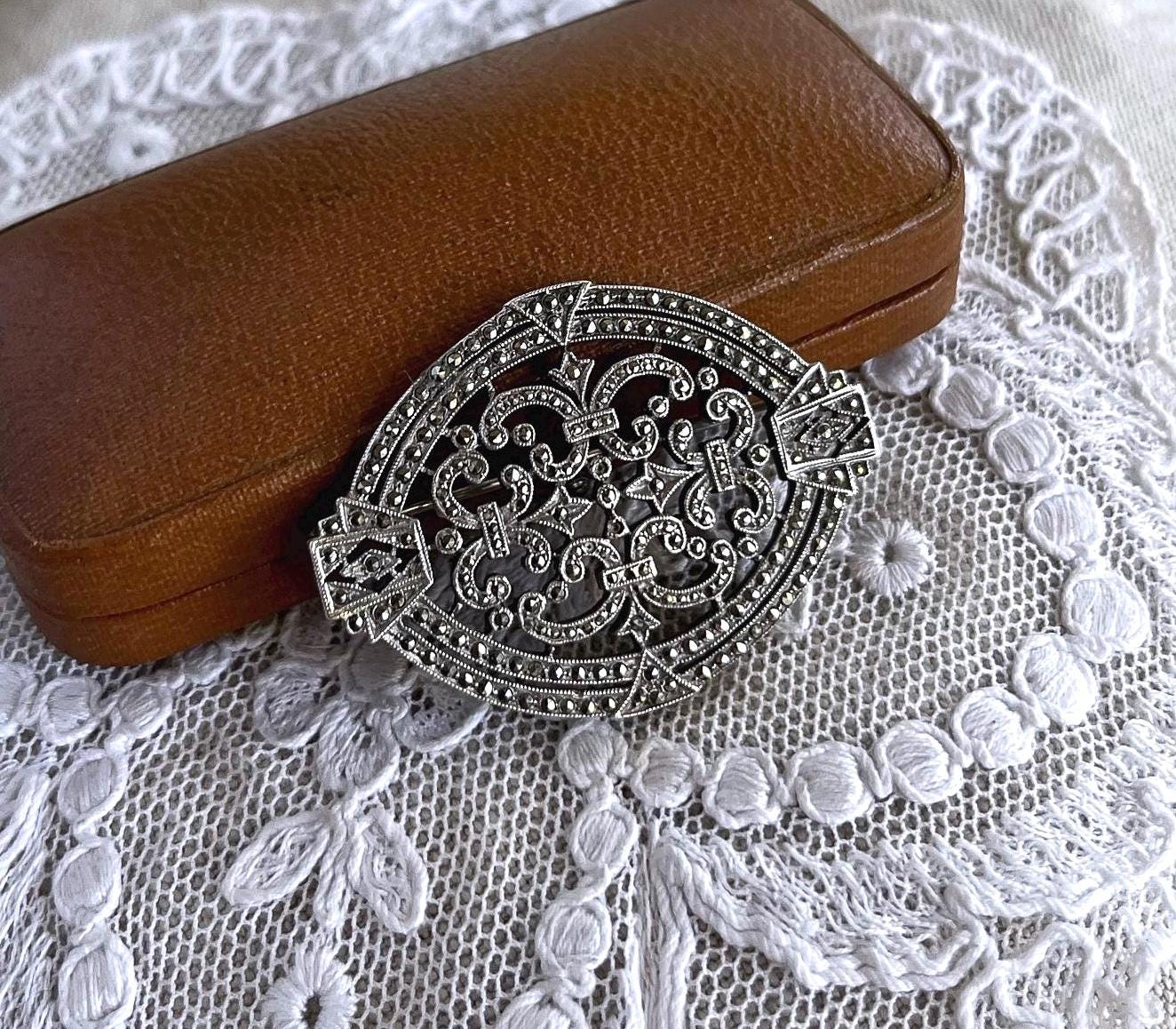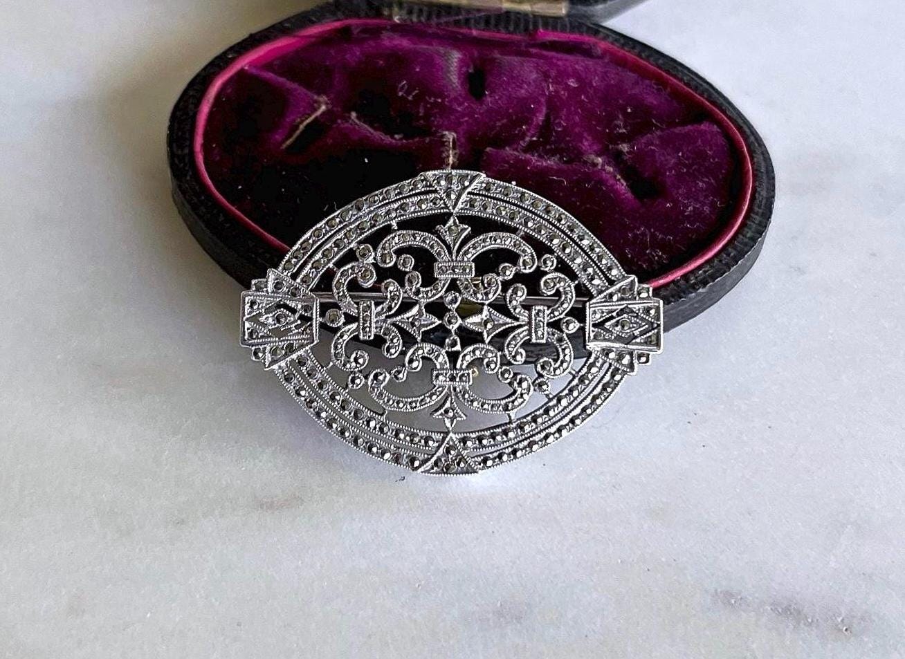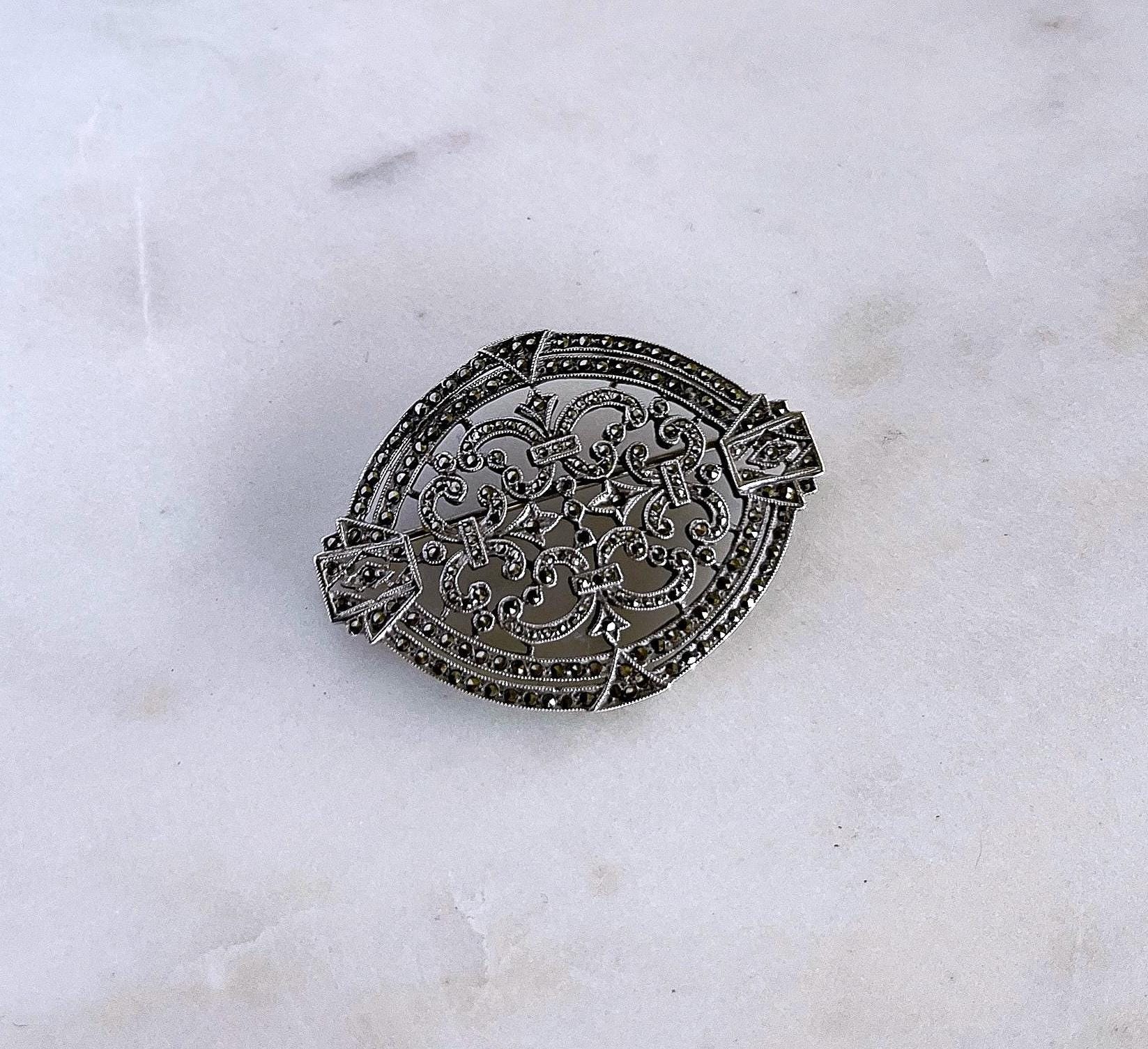 Featuring a vintage Ciner 1930s Art Deco highly collectible Sterling Silver statement Brooch adorned with brilliant and bright faceted marcasite crystals. Brooch is in fine vintage condition with a functional clasp, with all stones intact and accounted for. Brooch measures approximately 1.8 inches at 7.46 grams respectively, hallmarked CINER/STERLING as well as 2850 representing the style in their catalog on the reverse. Elegant,collectible and beautifully designed!