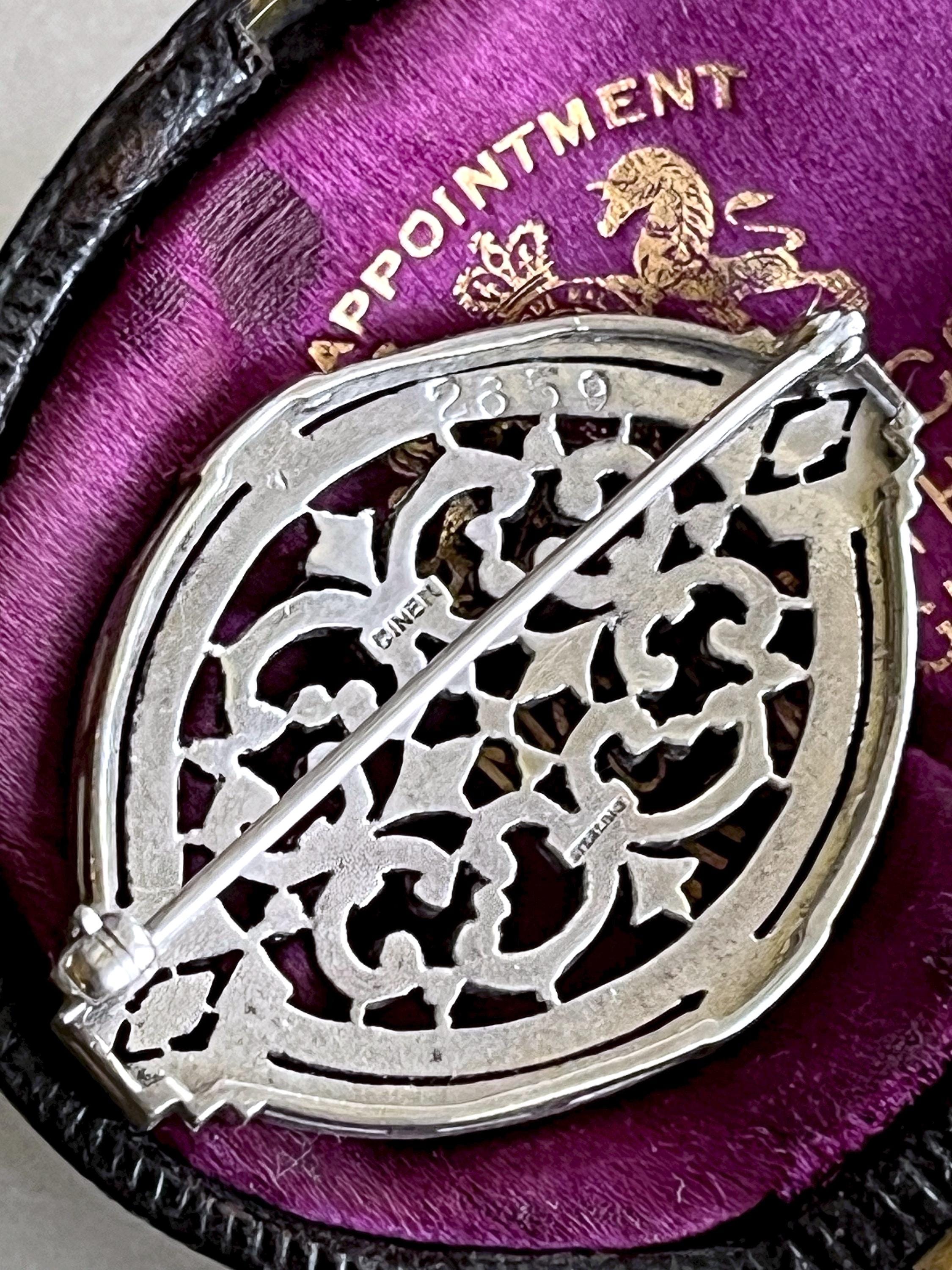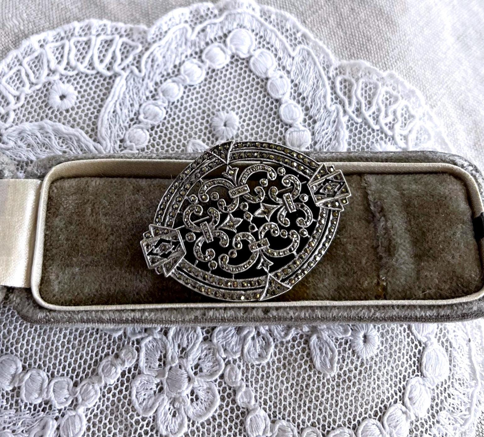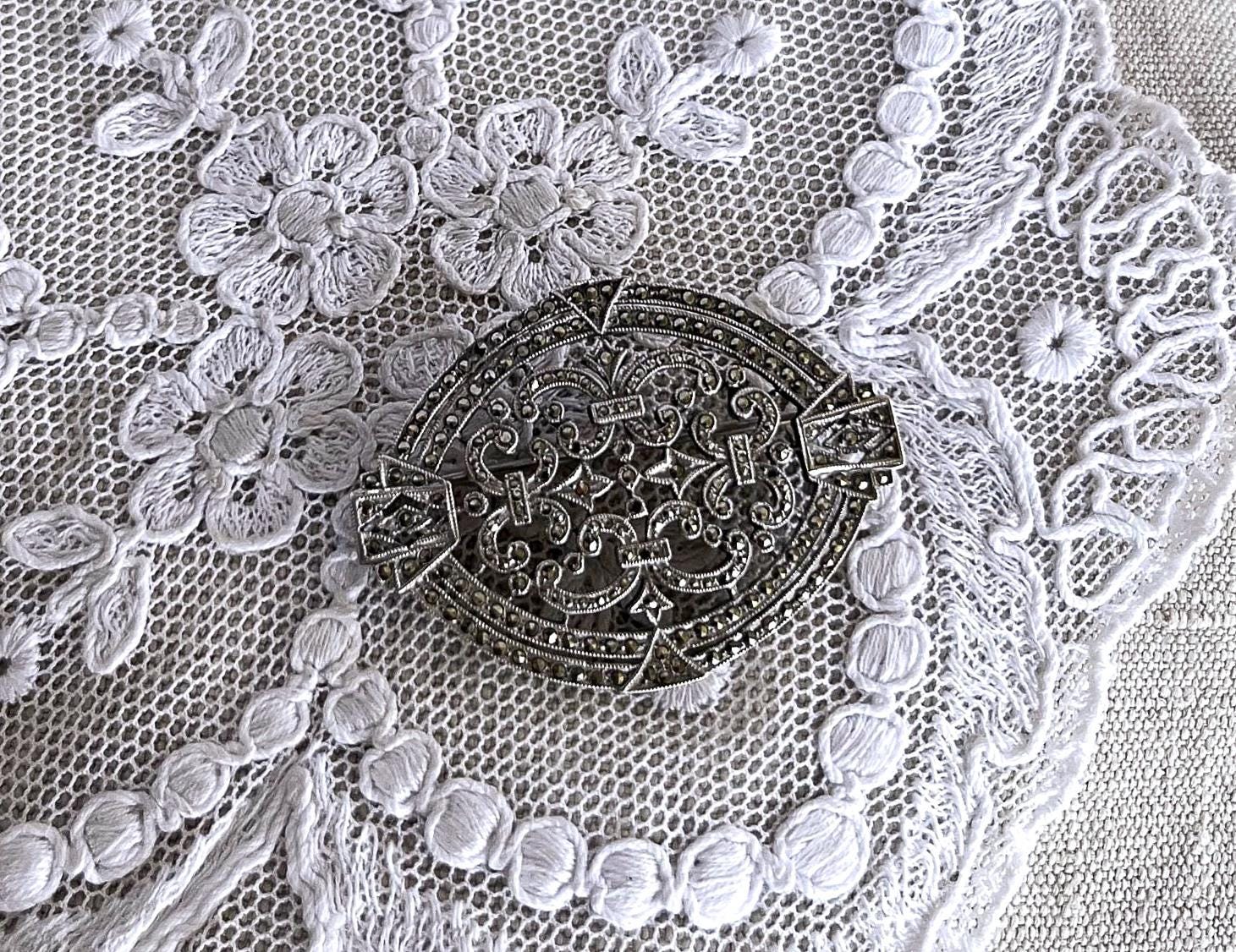 Featuring a vintage Ciner 1930s Art Deco highly collectible Sterling Silver statement Brooch adorned with brilliant and bright faceted marcasite crystals. Brooch is in fine vintage condition with a functional clasp, with all stones intact and accounted for. Brooch measures approximately 1.8 inches at 7.46 grams respectively, hallmarked CINER/STERLING as well as 2850 representing the style in their catalog on the reverse. Elegant,collectible and beautifully designed!