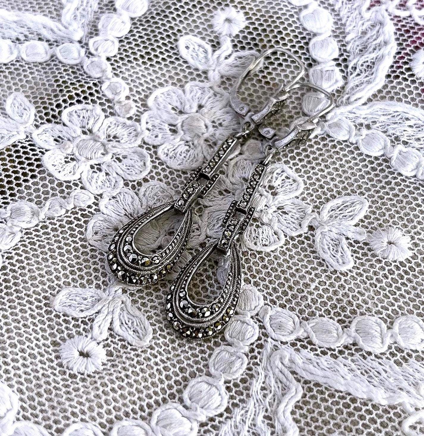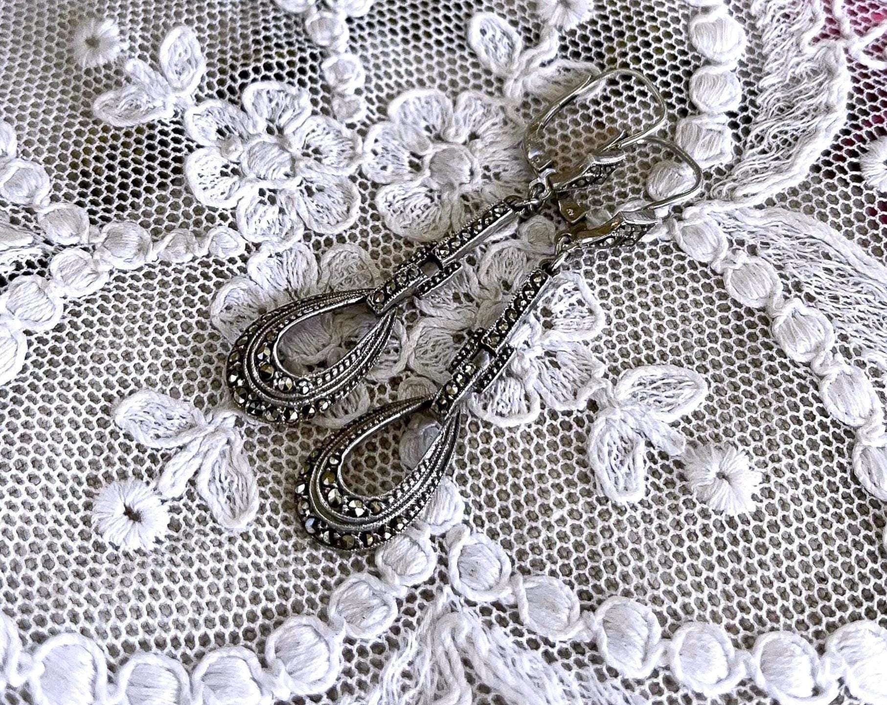 Featuring a beautiful pair of vintage Art Deco 935 silver pierced lever back drop earrings adorned with brilliant sparkling faceted Marcasite crystals. Earrings measure approximately 2.1 inches long at 3.81 grams respectively and are in excellent antique condition with functional clasps with all stones intact and accounted for, stamped 935 on the reverse of both pieces . These earrings are beautifully designed and handcrafted, collectible and ready to wear!