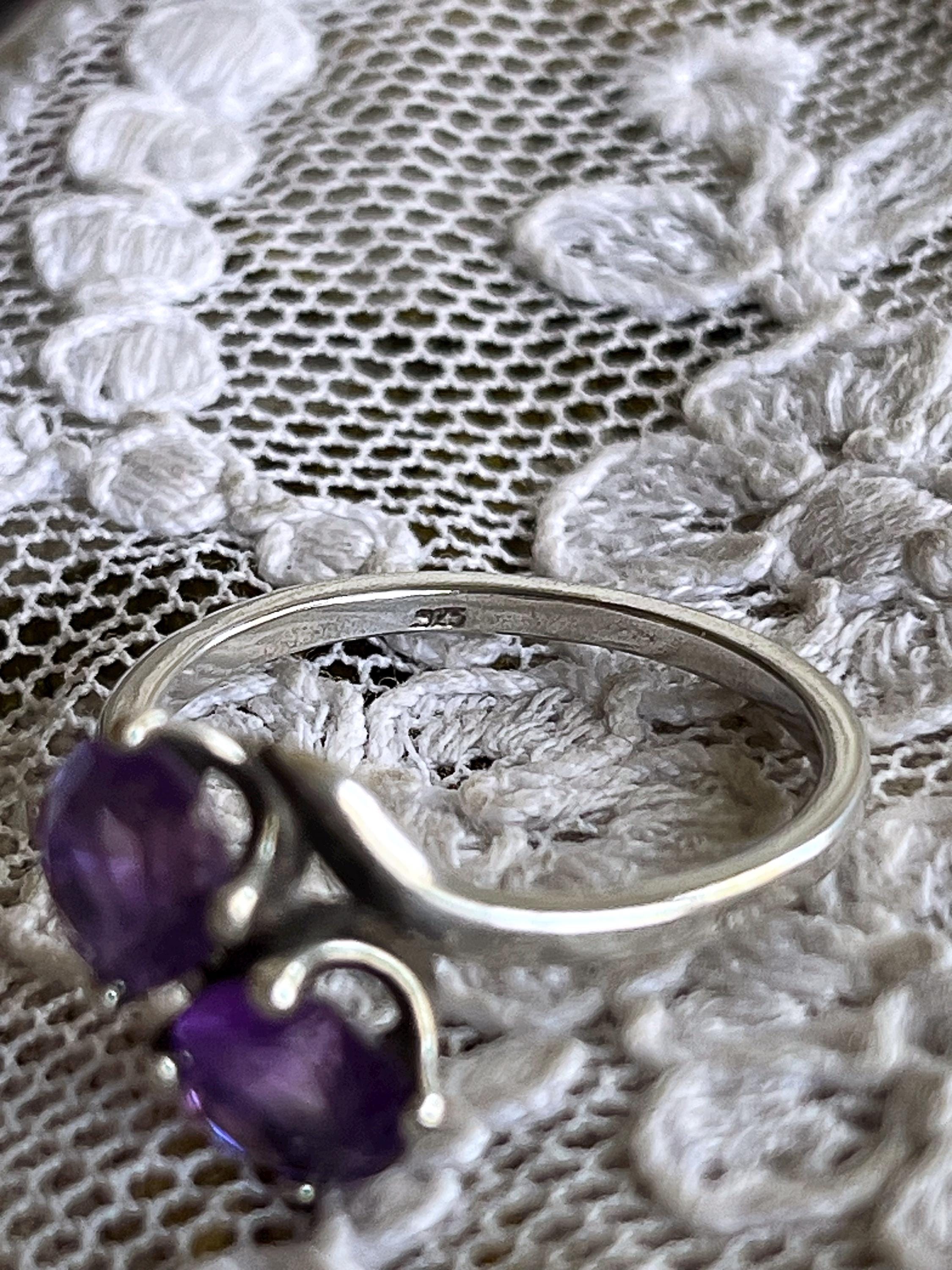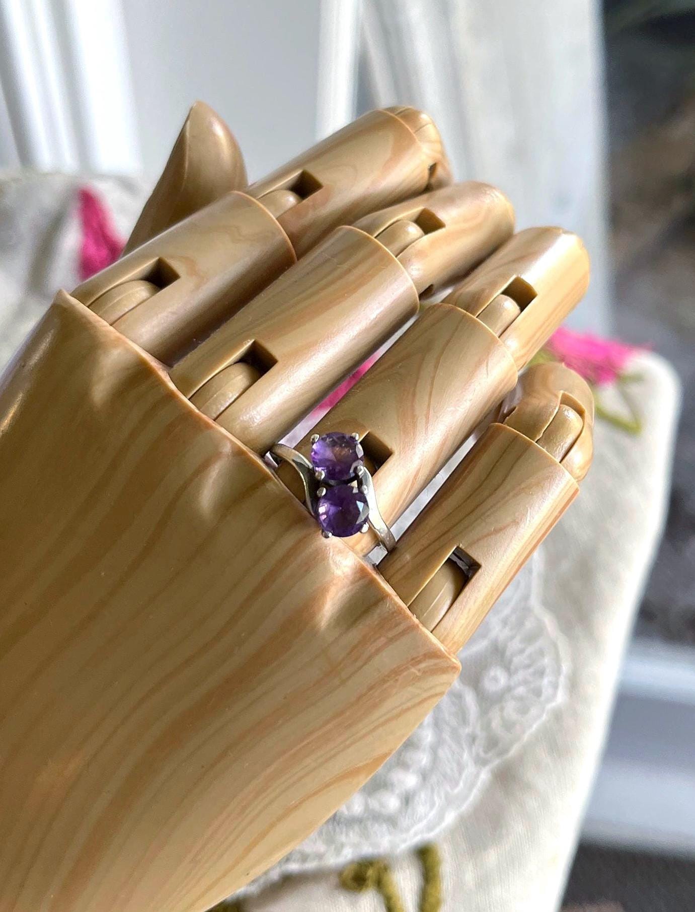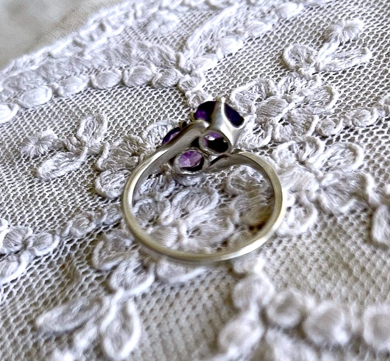 Featuring a lovely vintage Mid Century 1940s-60s Sterling Silver size 7 decorative doublet ring adorned with beautiful faceted amethyst purple paste stones. Ring is in excellent vintage condition with minimal wear with stones intact and accounted for. Ring is approximately size 7 at 1.58 grams respectively and is beautifully designed and ready to wear!