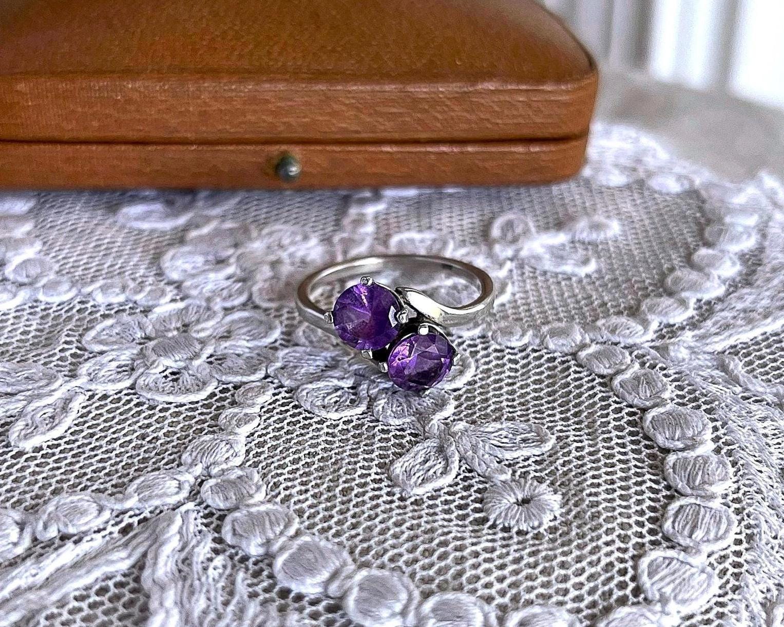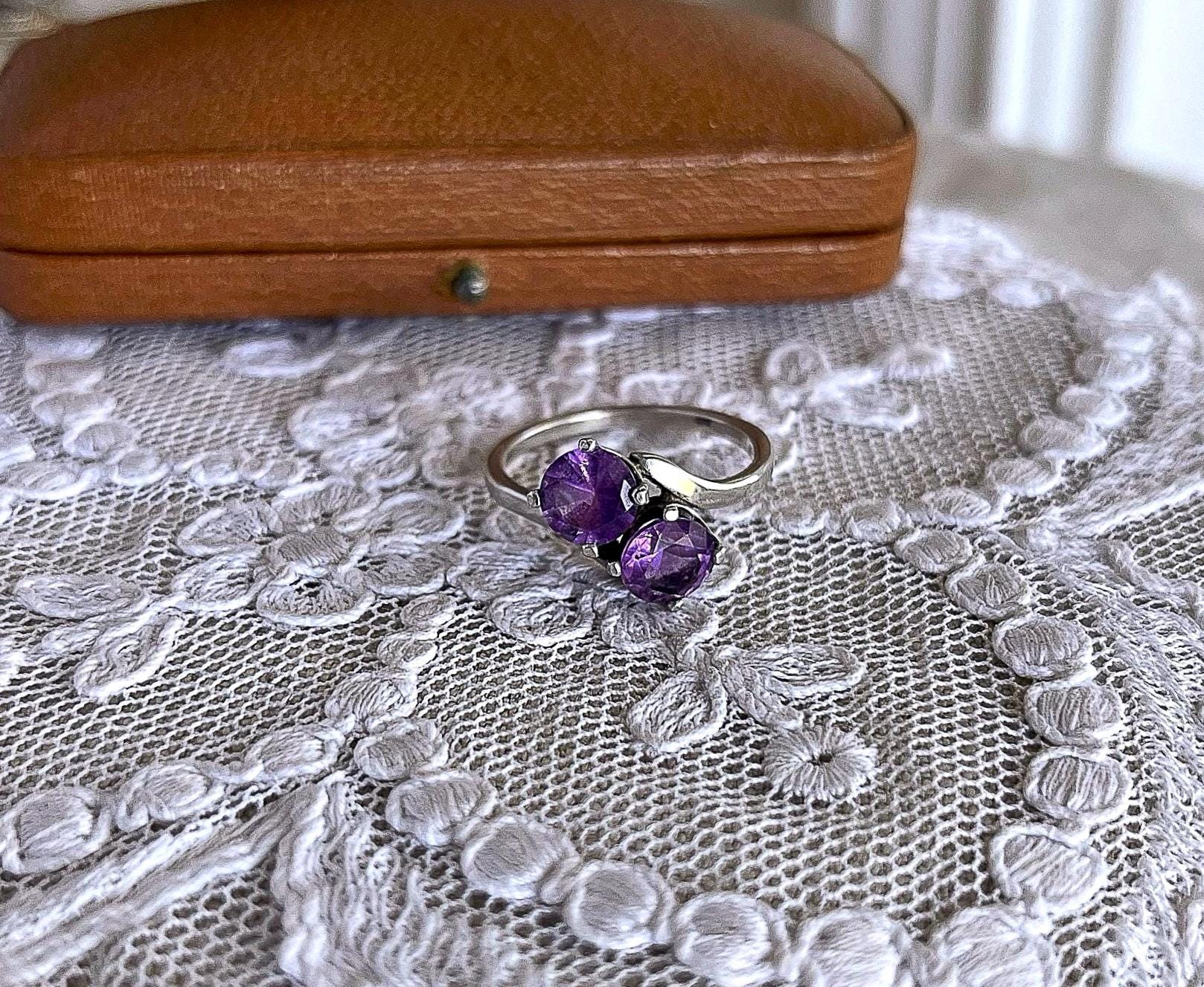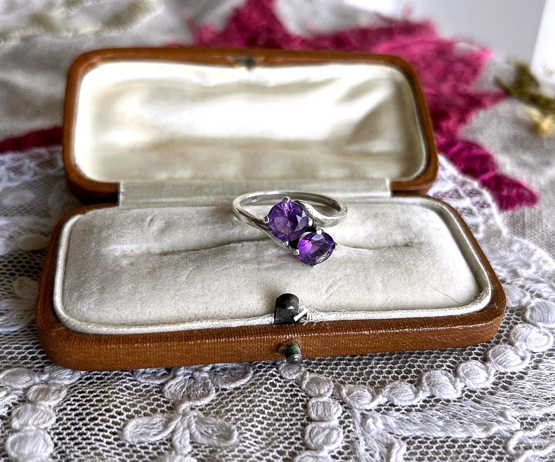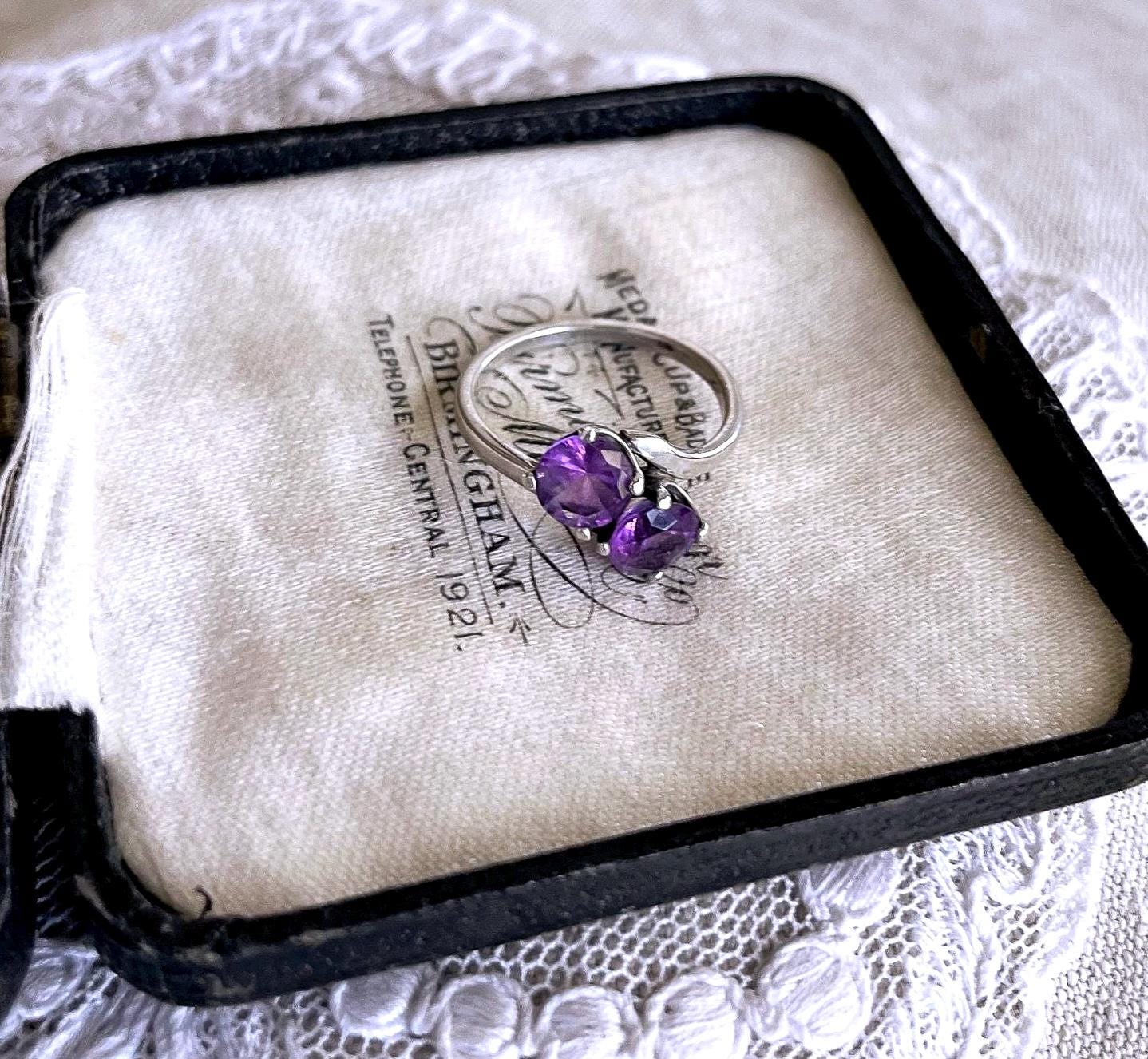 Featuring a lovely vintage Mid Century 1940s-60s Sterling Silver size 7 decorative doublet ring adorned with beautiful faceted amethyst purple paste stones. Ring is in excellent vintage condition with minimal wear with stones intact and accounted for. Ring is approximately size 7 at 1.58 grams respectively and is beautifully designed and ready to wear!
