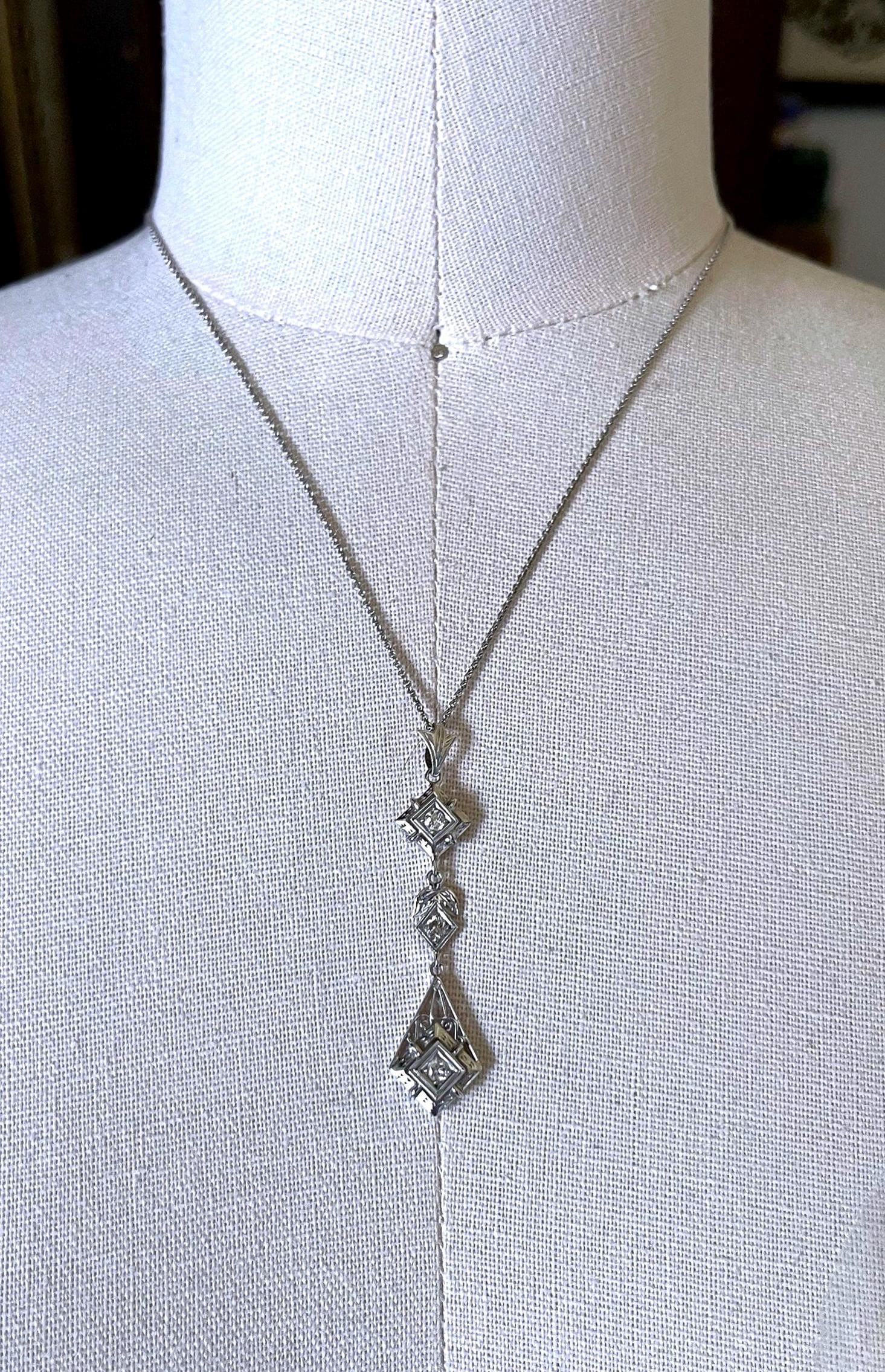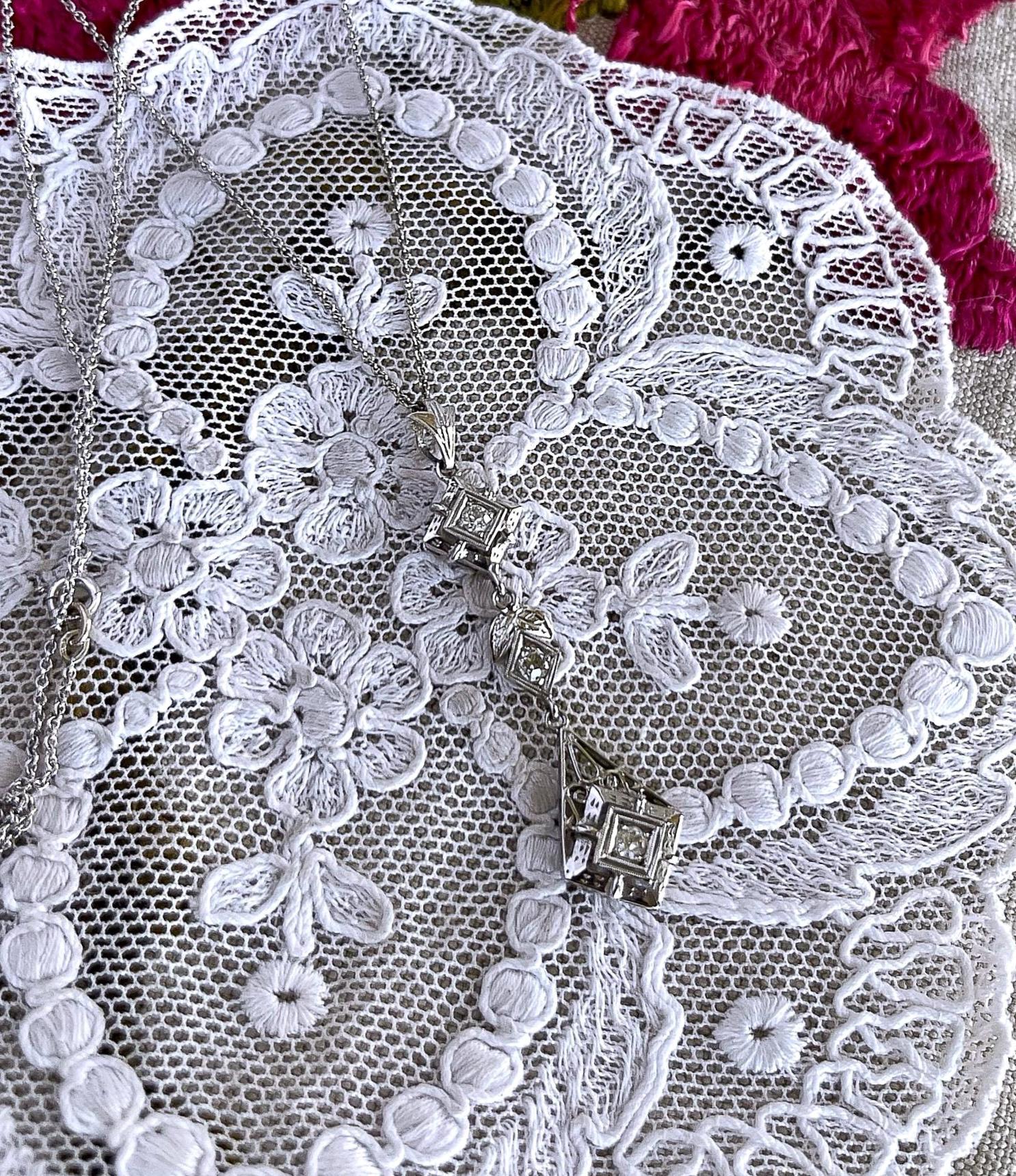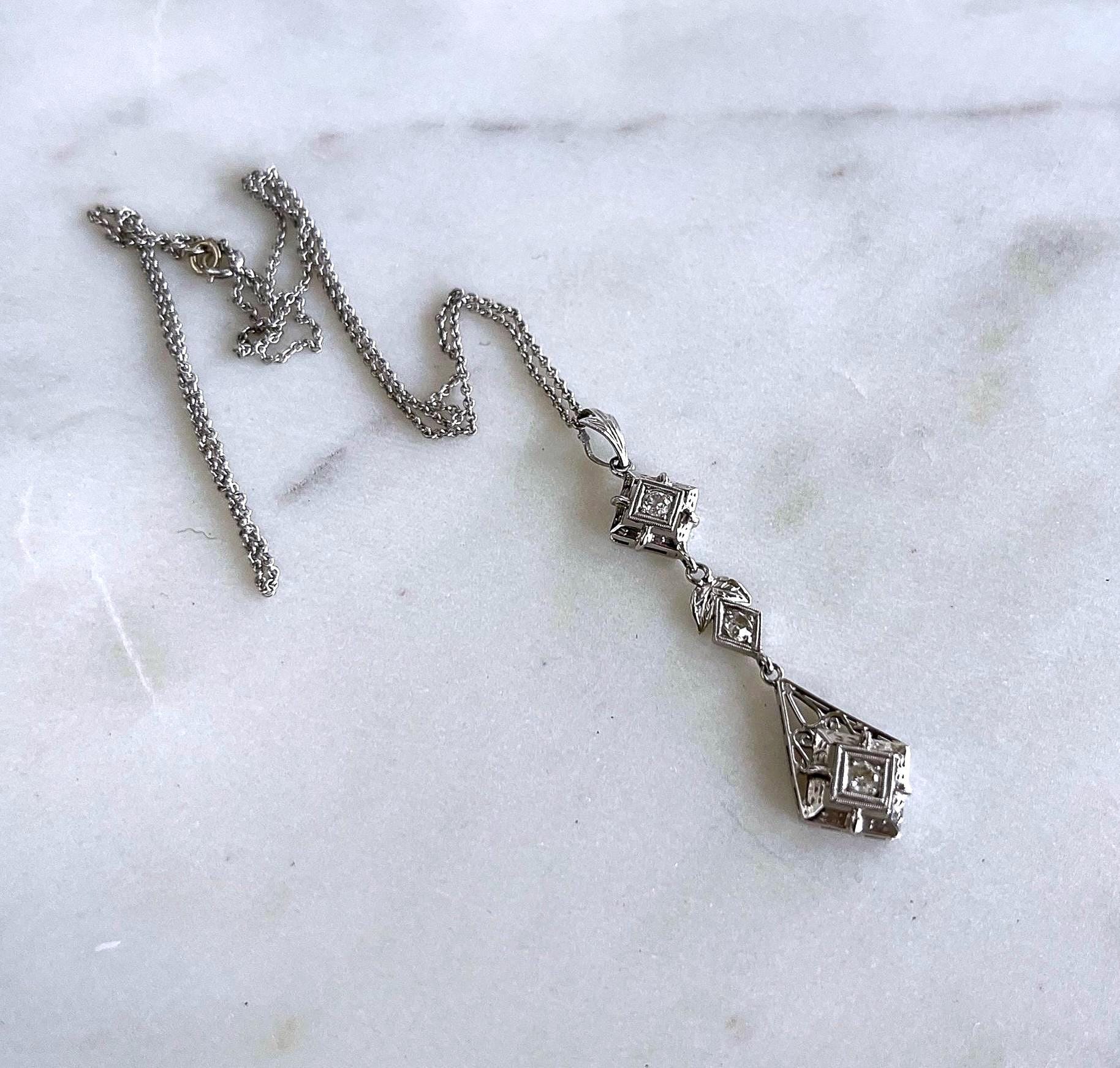 Featuring an absolutely stunning Edwardian style 18K white gold filigree pendant necklace adorned with a dazzling genuine faceted diamonds set in fancy open settings. This elegant necklace measures approximately 16 inches around with a 2.1 inch pendant drop at 3.1 grams respectively with approximately .75 carats with a beautiful clarity. In pristine condition with functional hallmarked 18k on the bale, virtually no wear with all stones intact and accounted for. Sits beautifully on the neck, sparkles like crazy!
