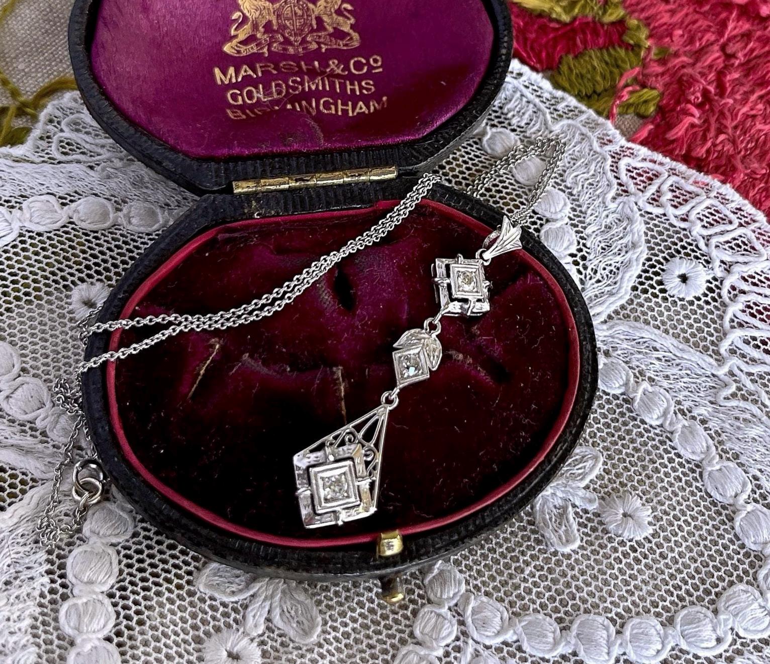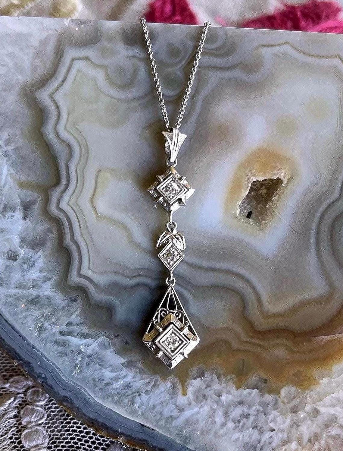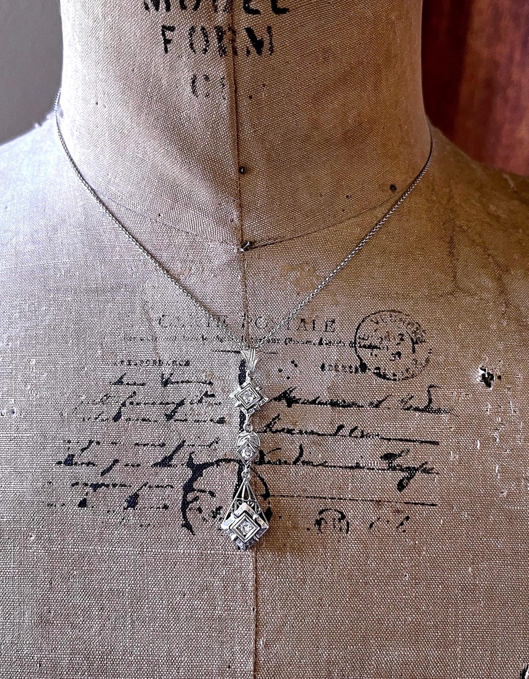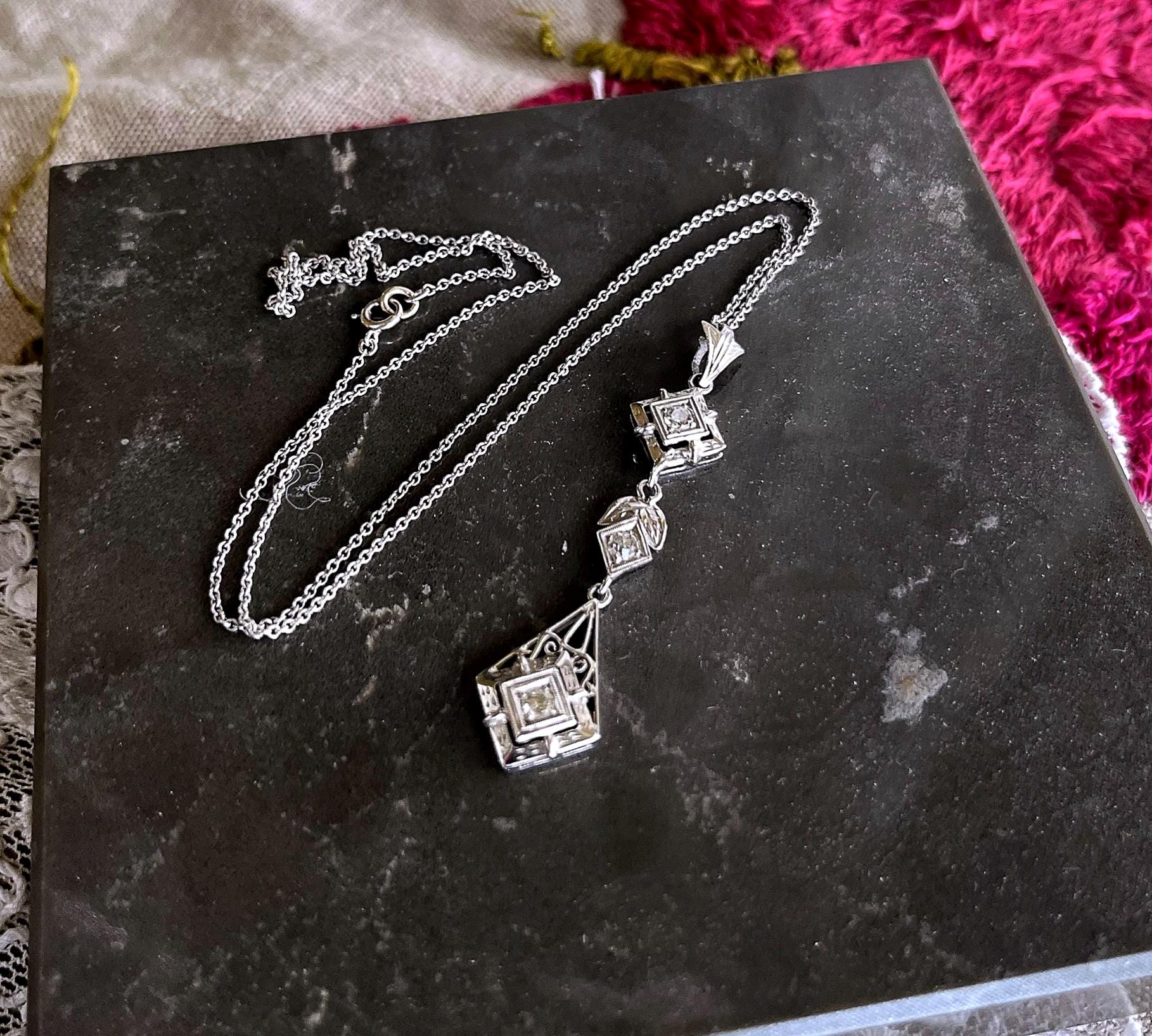 Featuring an absolutely stunning Edwardian style 18K white gold filigree pendant necklace adorned with a dazzling genuine faceted diamonds set in fancy open settings. This elegant necklace measures approximately 16 inches around with a 2.1 inch pendant drop at 3.1 grams respectively with approximately .75 carats with a beautiful clarity. In pristine condition with functional hallmarked 18k on the bale, virtually no wear with all stones intact and accounted for. Sits beautifully on the neck, sparkles like crazy!