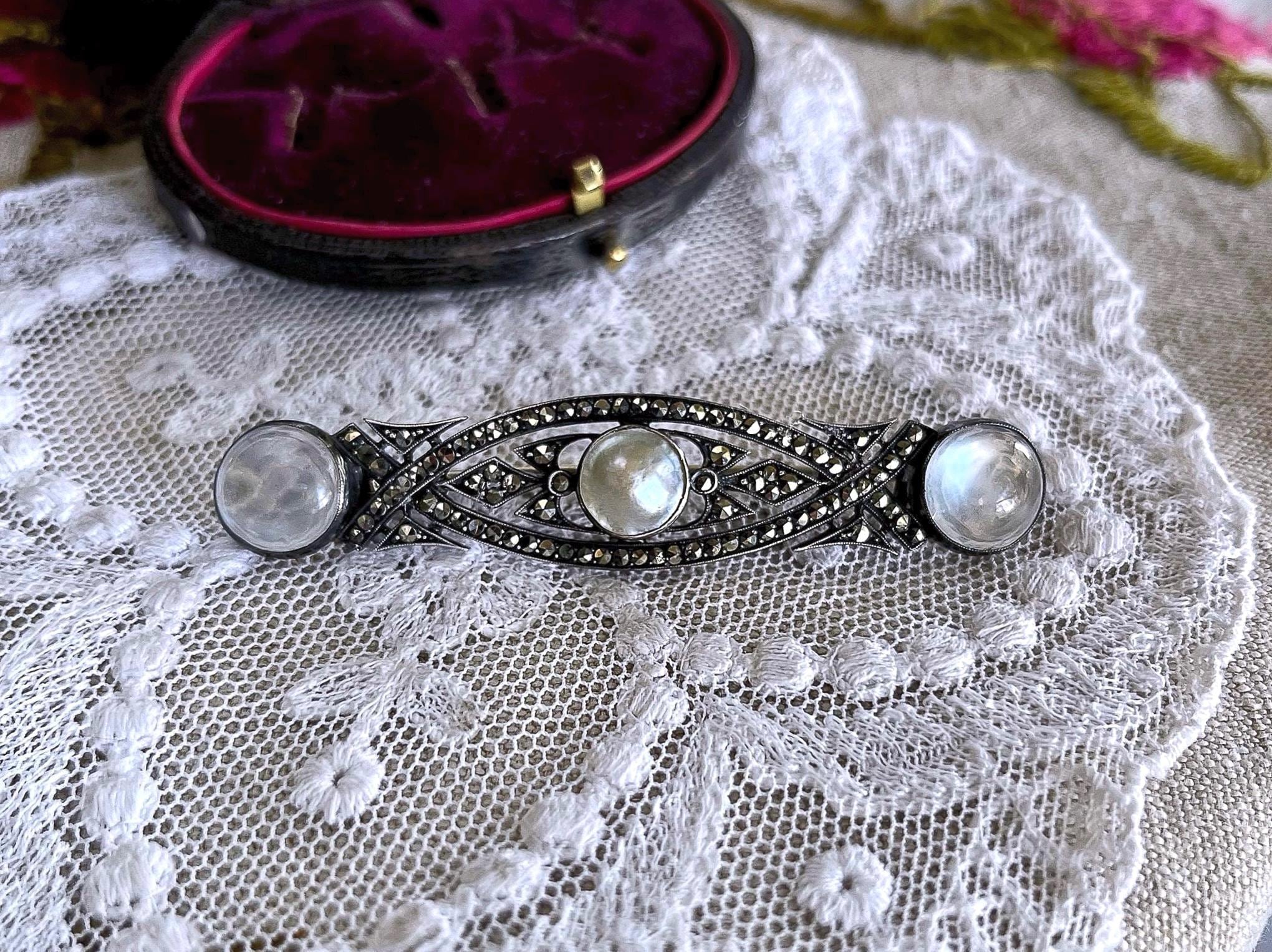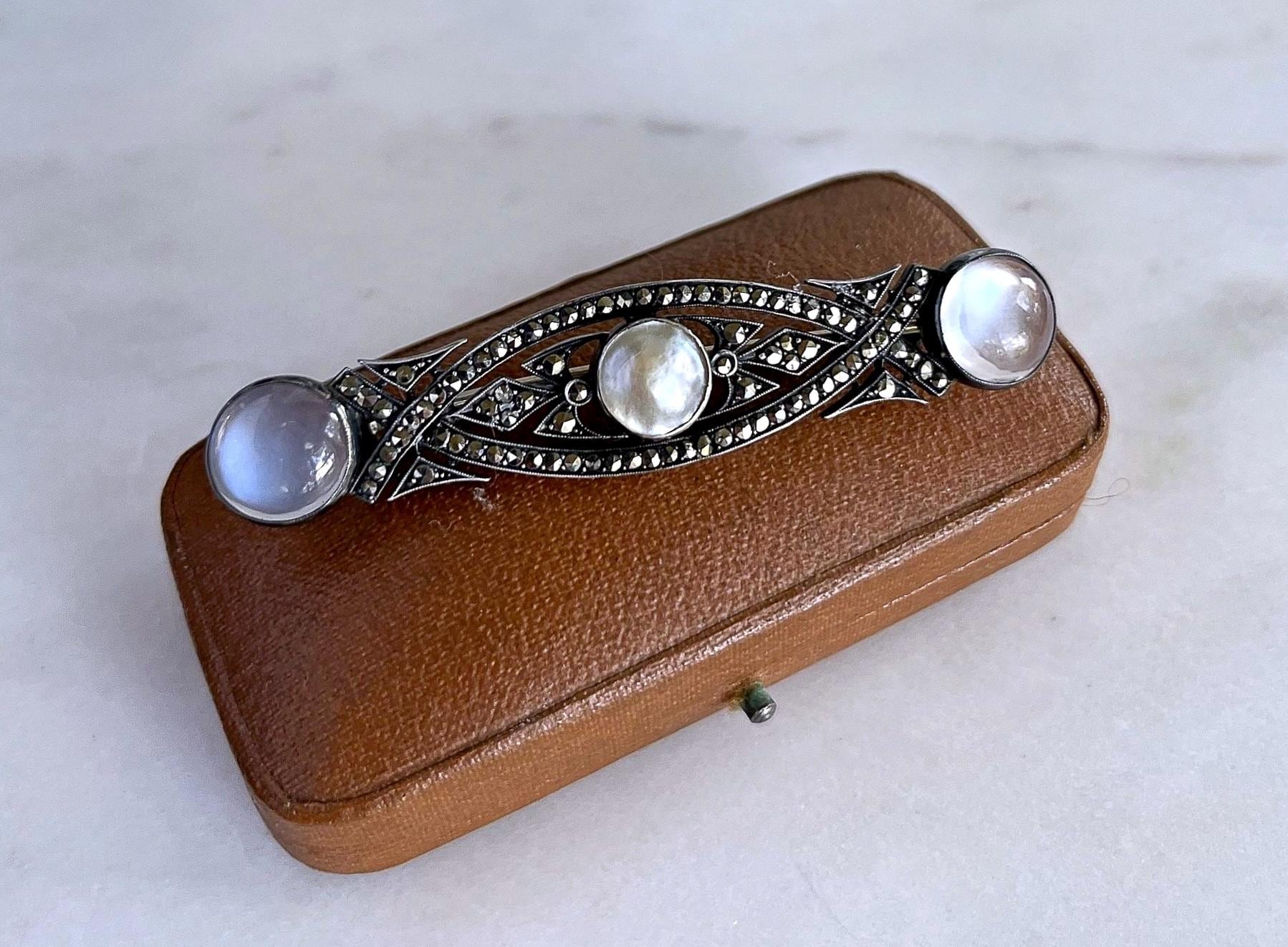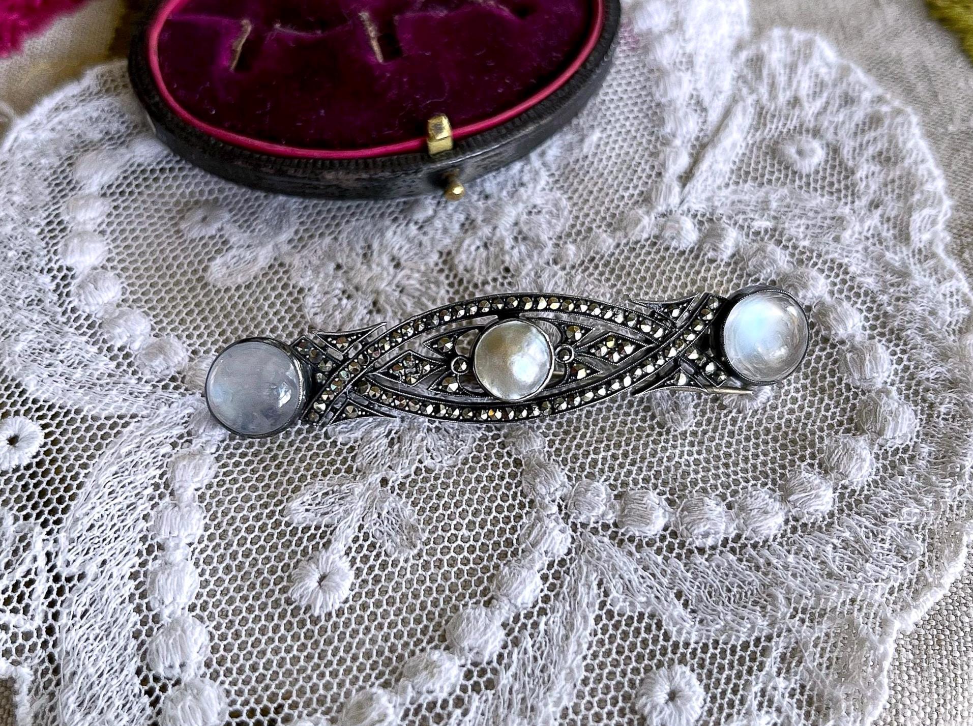 Featuring a ethereal antique Art Deco German 935 silver brooch adorned with luminous genuine Moonstones and Blister pearl brilliant faceted Marcasite accents set in closed back settings. Brooch is in fine antique condition with a beautiful patina, a functional antique C clasp with all stones intact and accounted for. Approximately 2.5 inches at 7.39 grams respectively hallmarked on the reverse. A rare and highly collectible piece , the stones are mesmerizing!