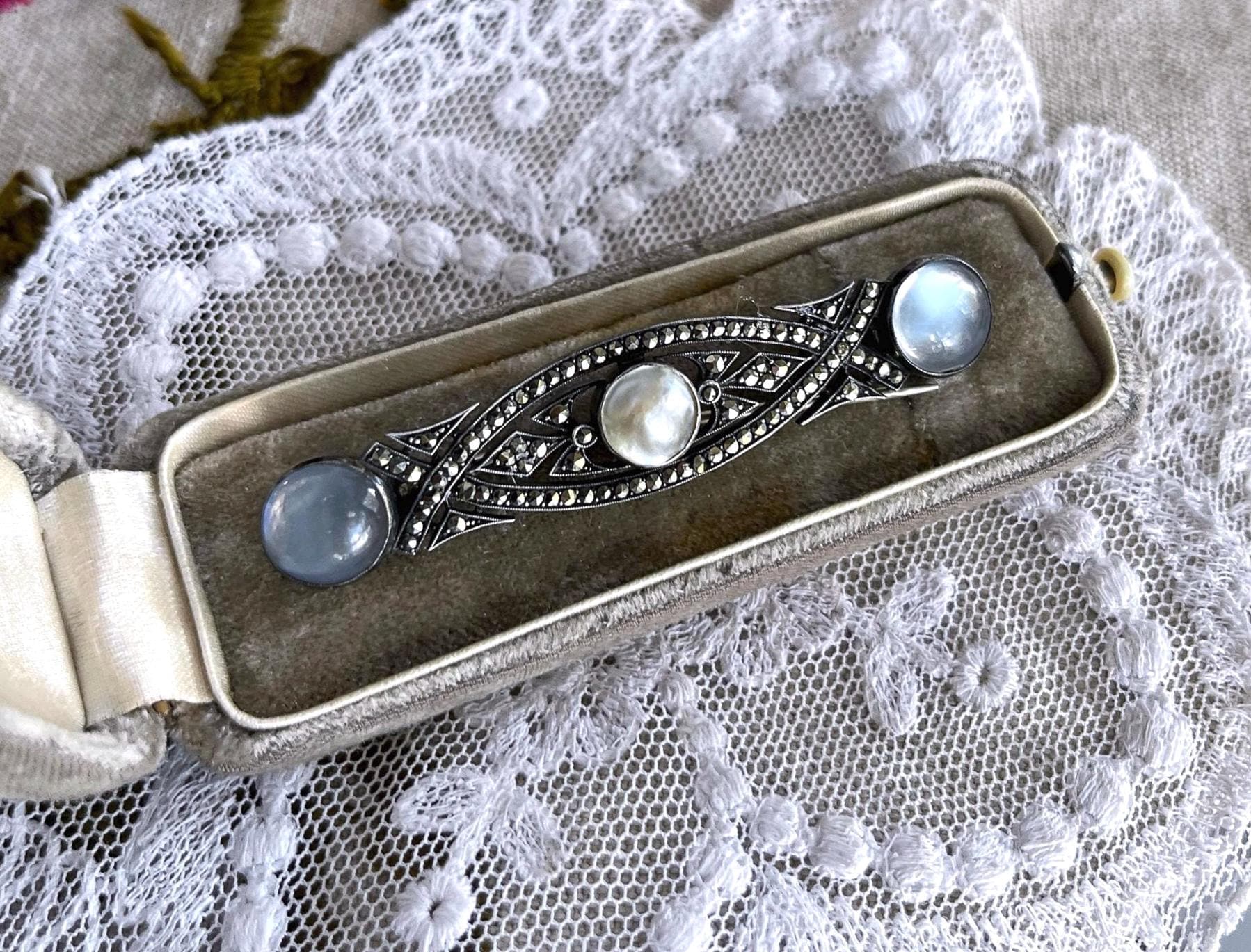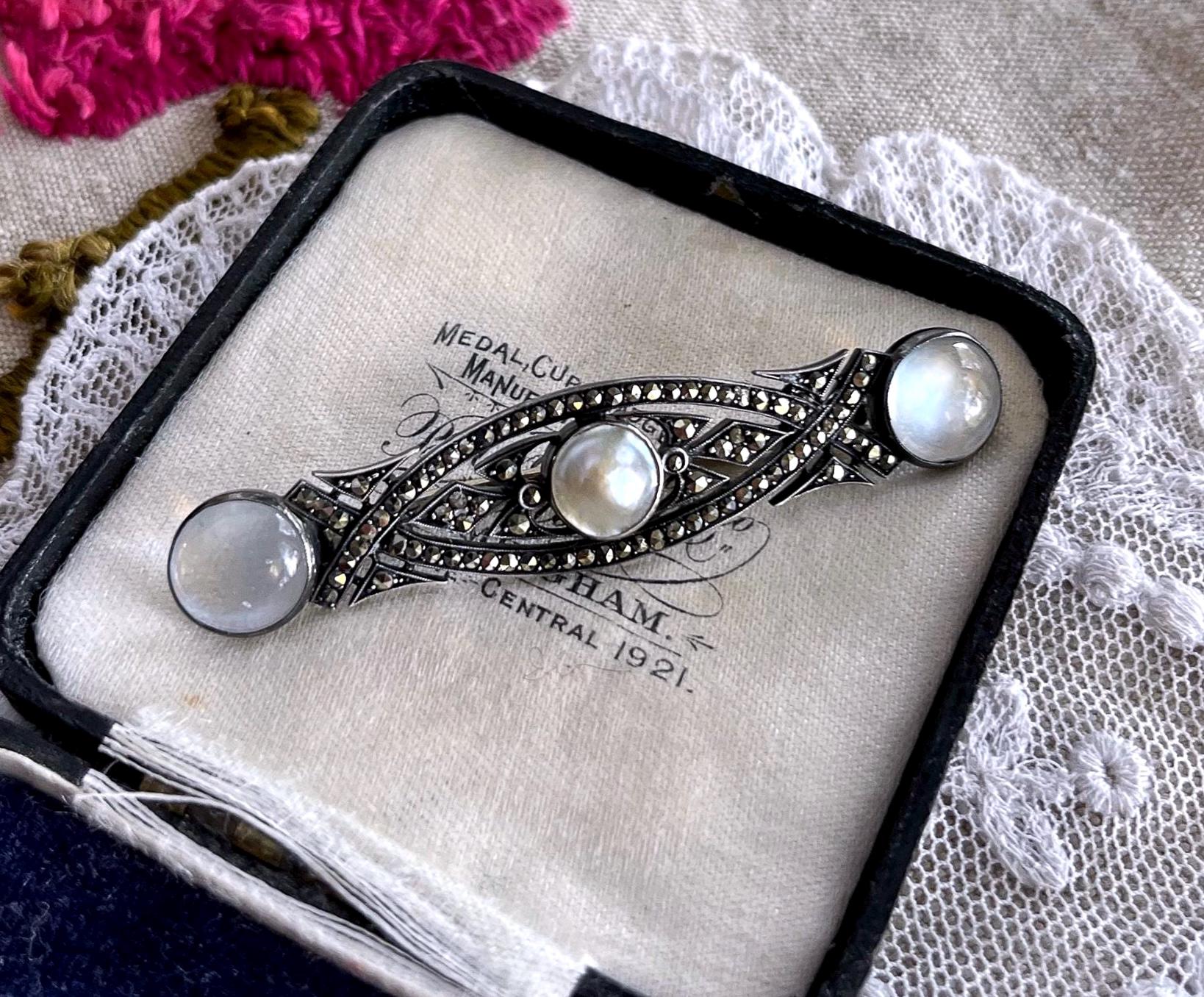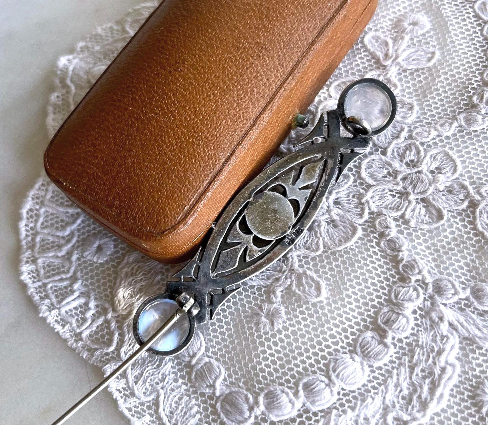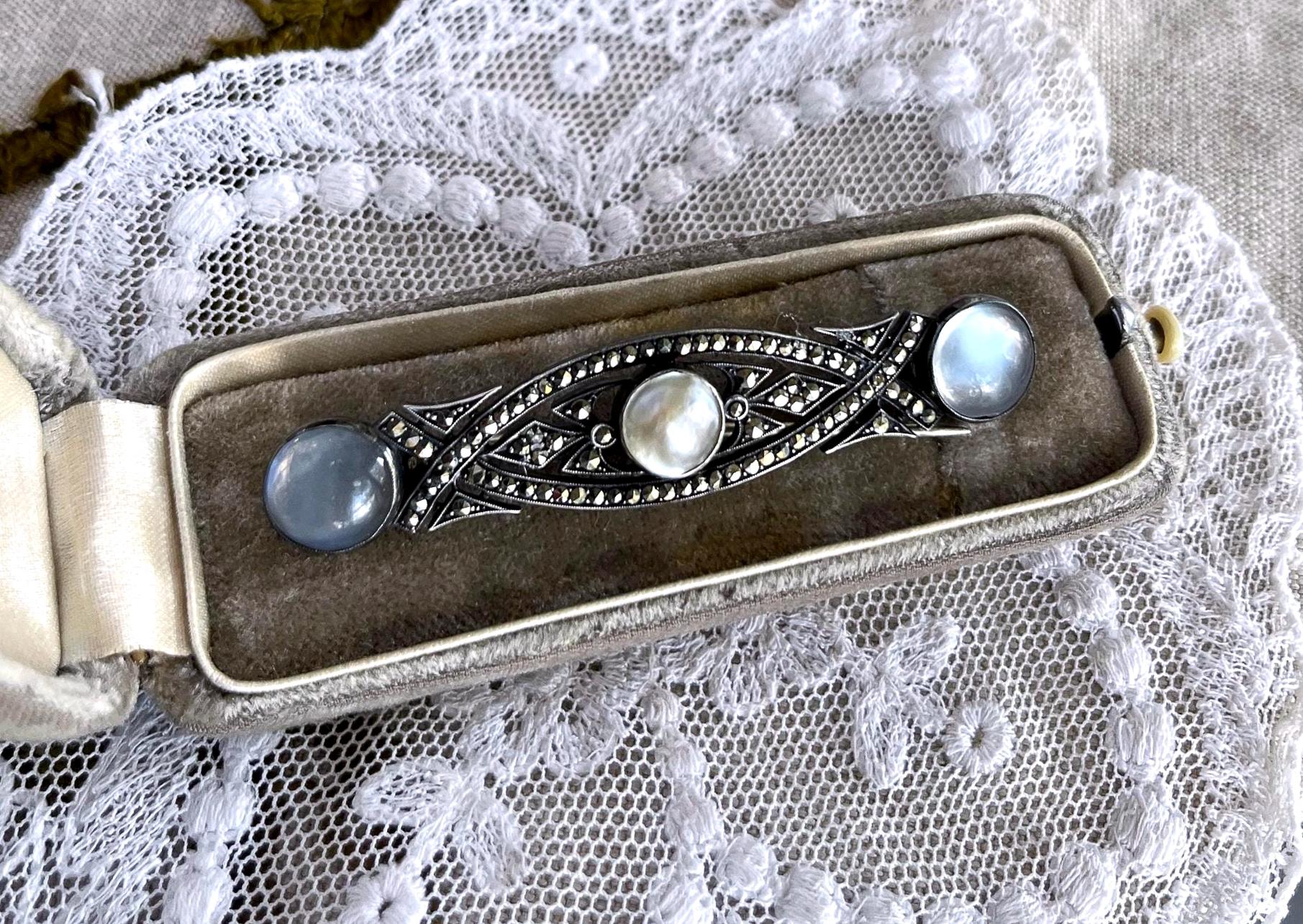 Featuring a ethereal antique Art Deco German 935 silver brooch adorned with luminous genuine Moonstones and Blister pearl brilliant faceted Marcasite accents set in closed back settings. Brooch is in fine antique condition with a beautiful patina, a functional antique C clasp with all stones intact and accounted for. Approximately 2.5 inches at 7.39 grams respectively hallmarked on the reverse. A rare and highly collectible piece , the stones are mesmerizing!