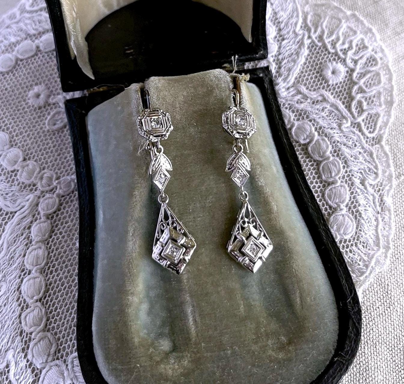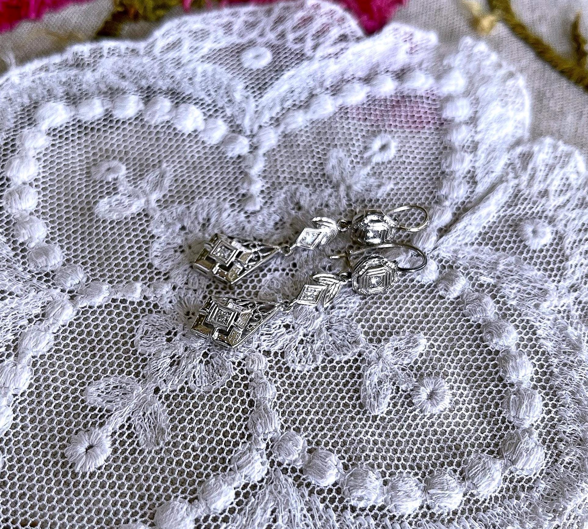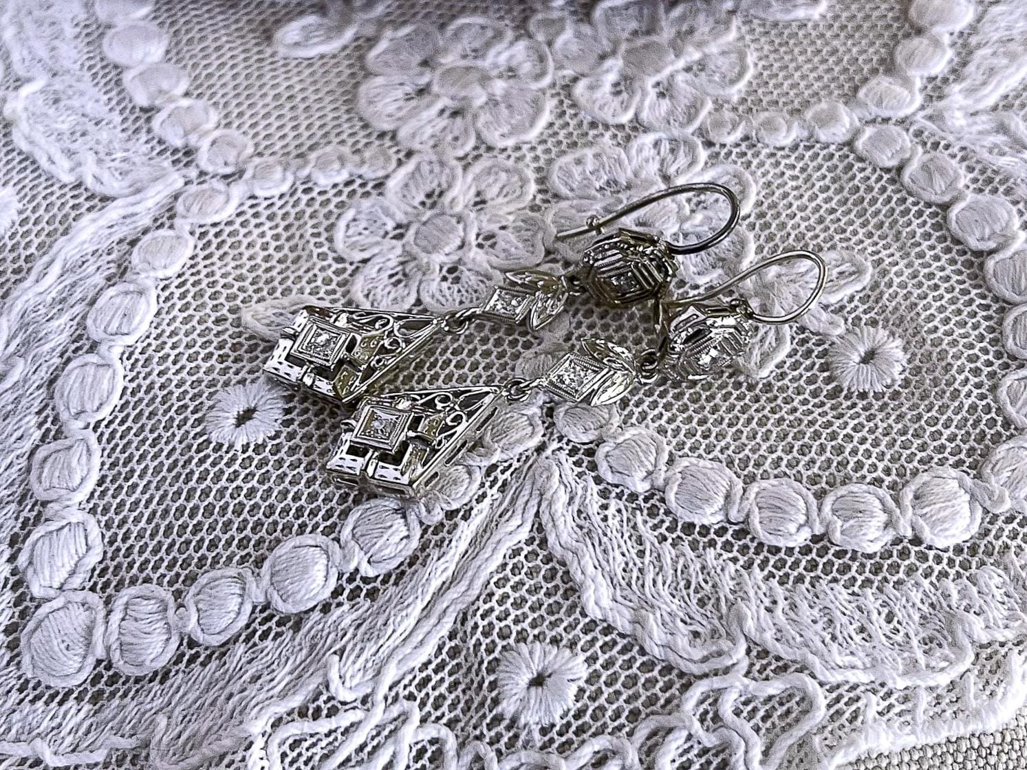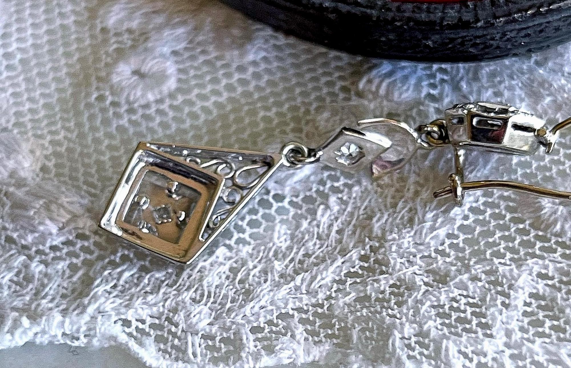 Featuring a luxurious pair of Edwardian revival 18K white gold filigree pierced drop earrings adorned with a dazzling genuine faceted diamonds set in fancy open settings. Earrings measure approximately 1.9 inches long at 4.31 grams respectively with approximately 1.00 carat with a beautiful clarity. In excellent condition with functional hallmarked clasps, virtually no wear with all stones intact and accounted for. These beauties are an elegant, timeless wearable investment!