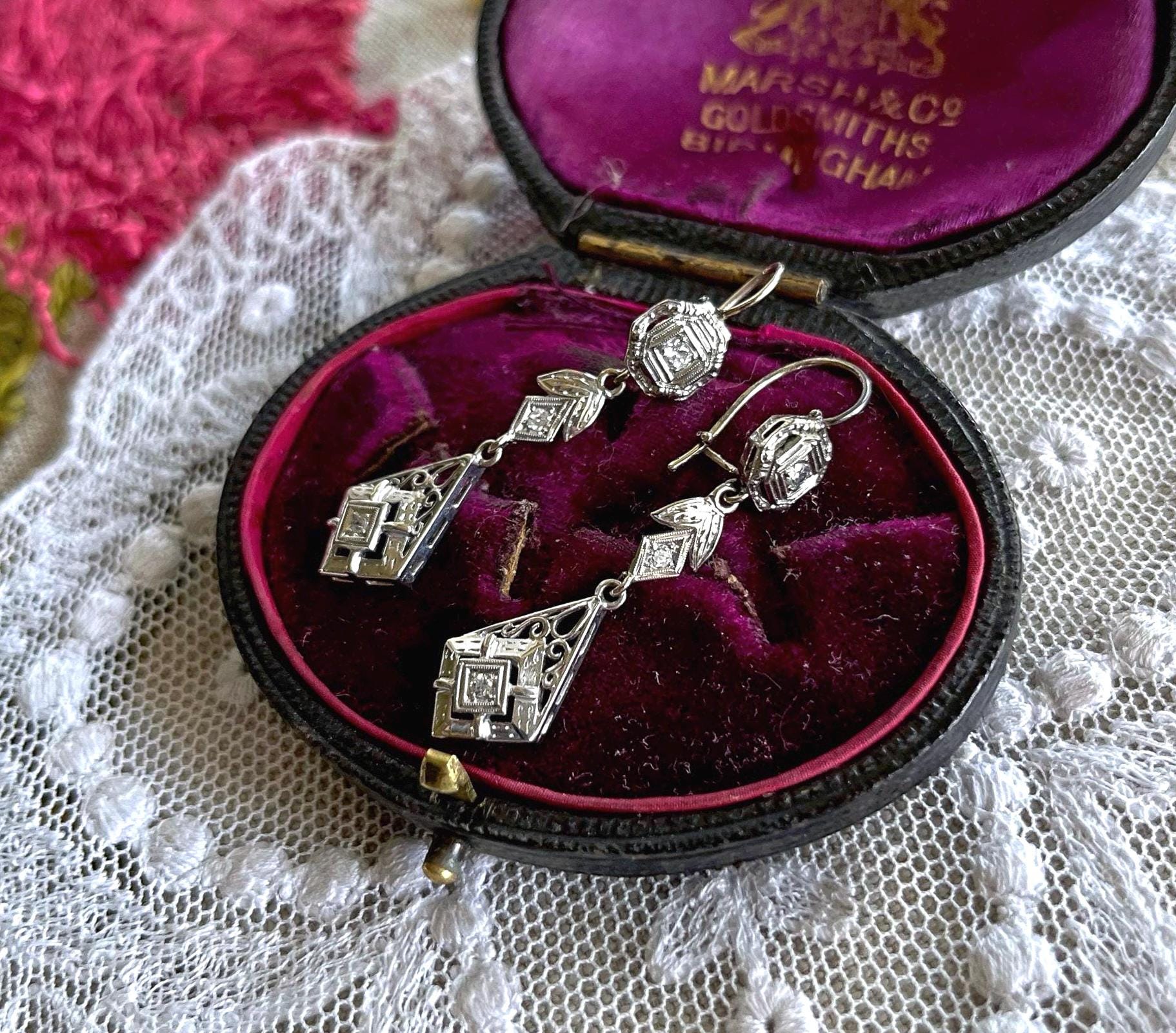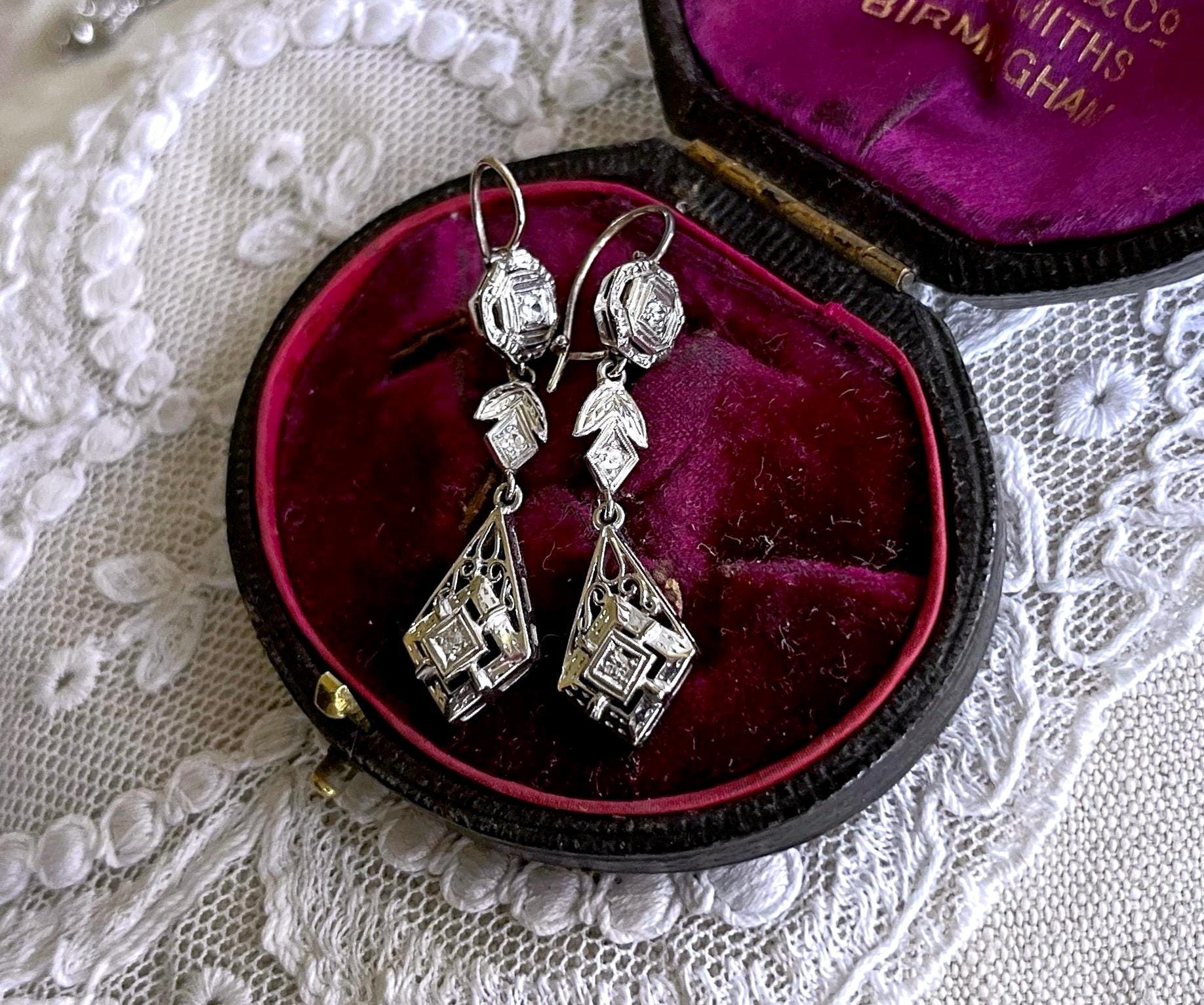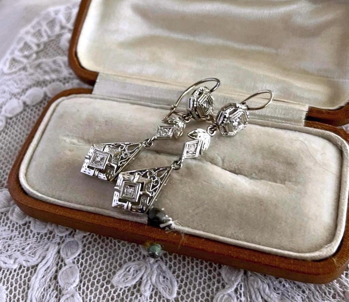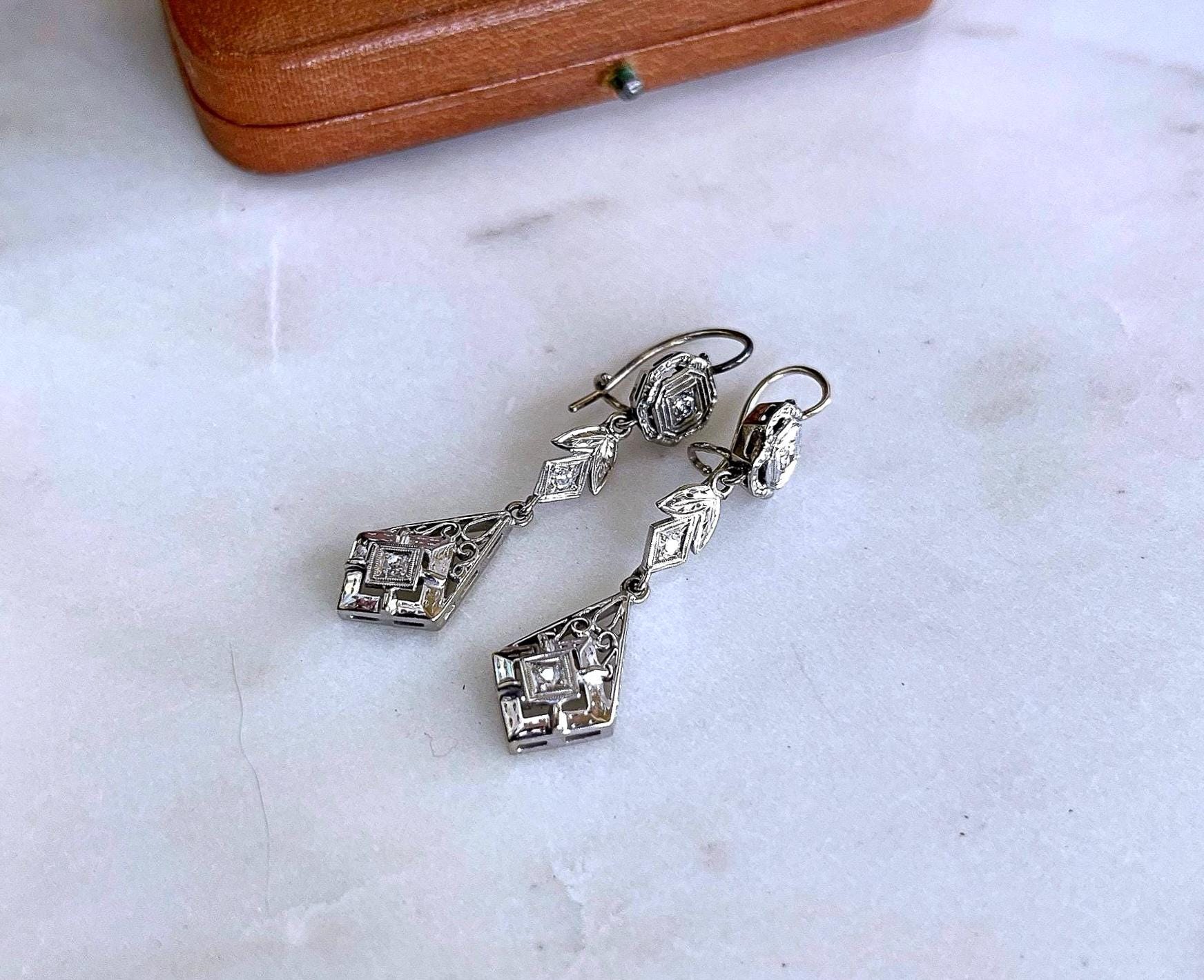 Featuring a luxurious pair of Edwardian revival 18K white gold filigree pierced drop earrings adorned with a dazzling genuine faceted diamonds set in fancy open settings. Earrings measure approximately 1.9 inches long at 4.31 grams respectively with approximately 1.00 carat with a beautiful clarity. In excellent condition with functional hallmarked clasps, virtually no wear with all stones intact and accounted for. These beauties are an elegant, timeless wearable investment!