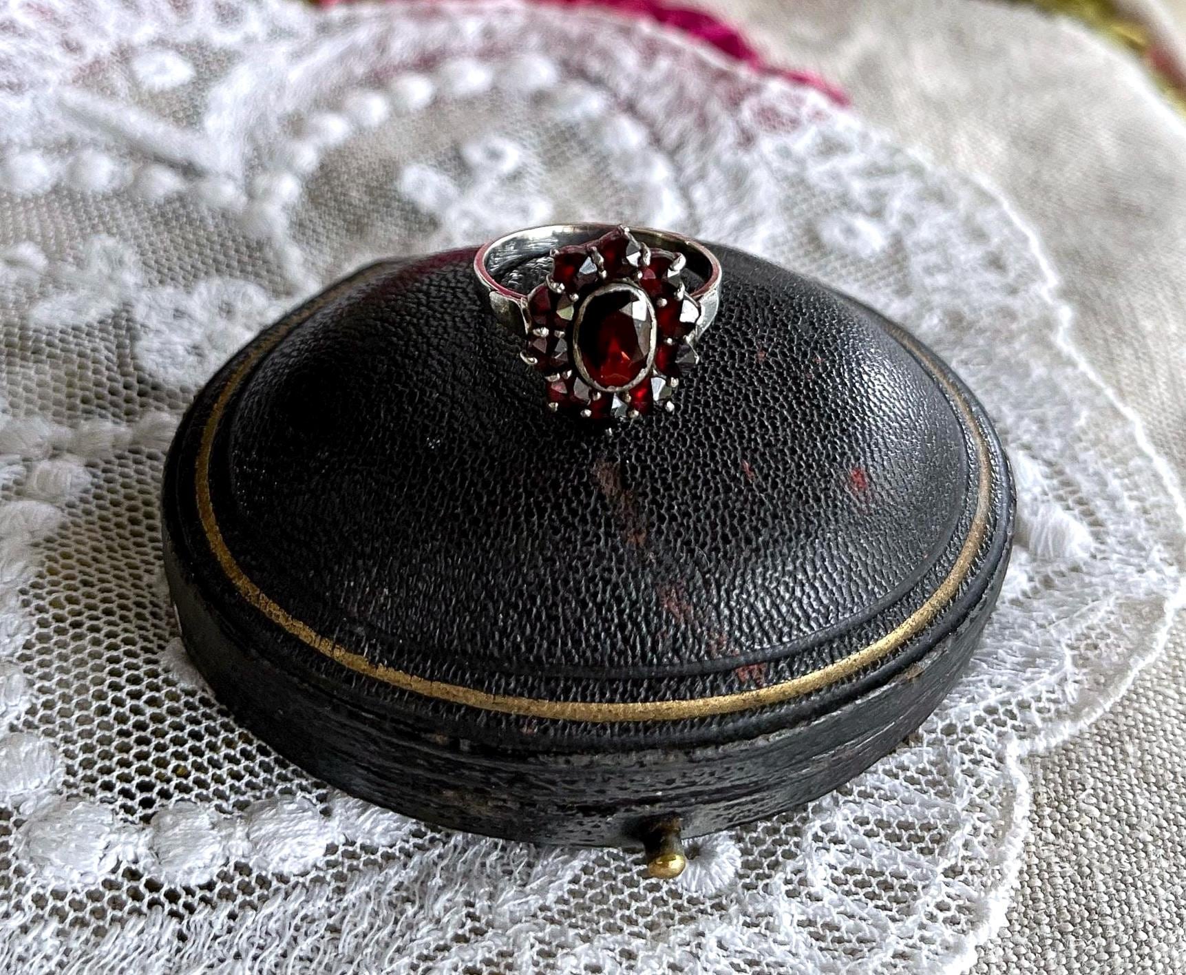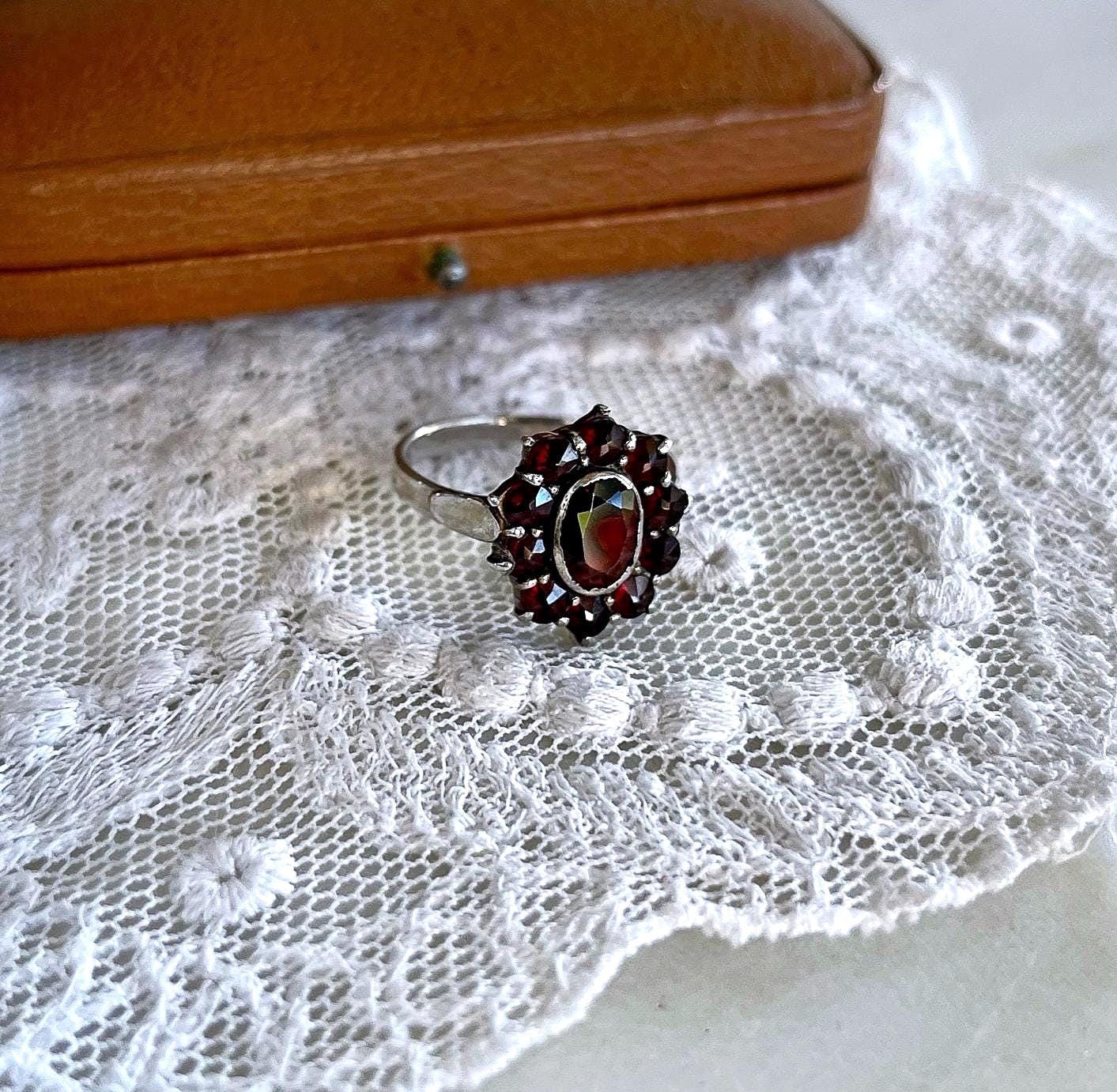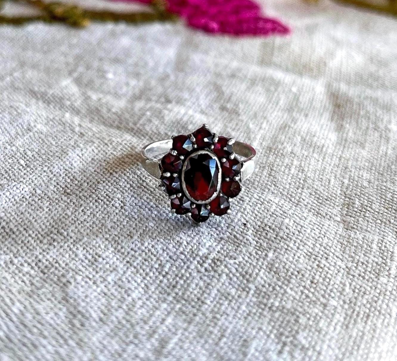 Featuring a spectacular vintage Bohemian revival old world 900 silver rose cut garnet cocktail ring adorned with beautiful faceted deep red Rose Cut Garnets set in a traditional Cluster setting. Ring is approximately size 6 at 2.72 grams respectively. Ring is in excellent vintage condition with normal wear with all stones intact and accounted for. Stamped 900 on the inside of band. Highly collectible, beautifully handcrafted vintage ring!