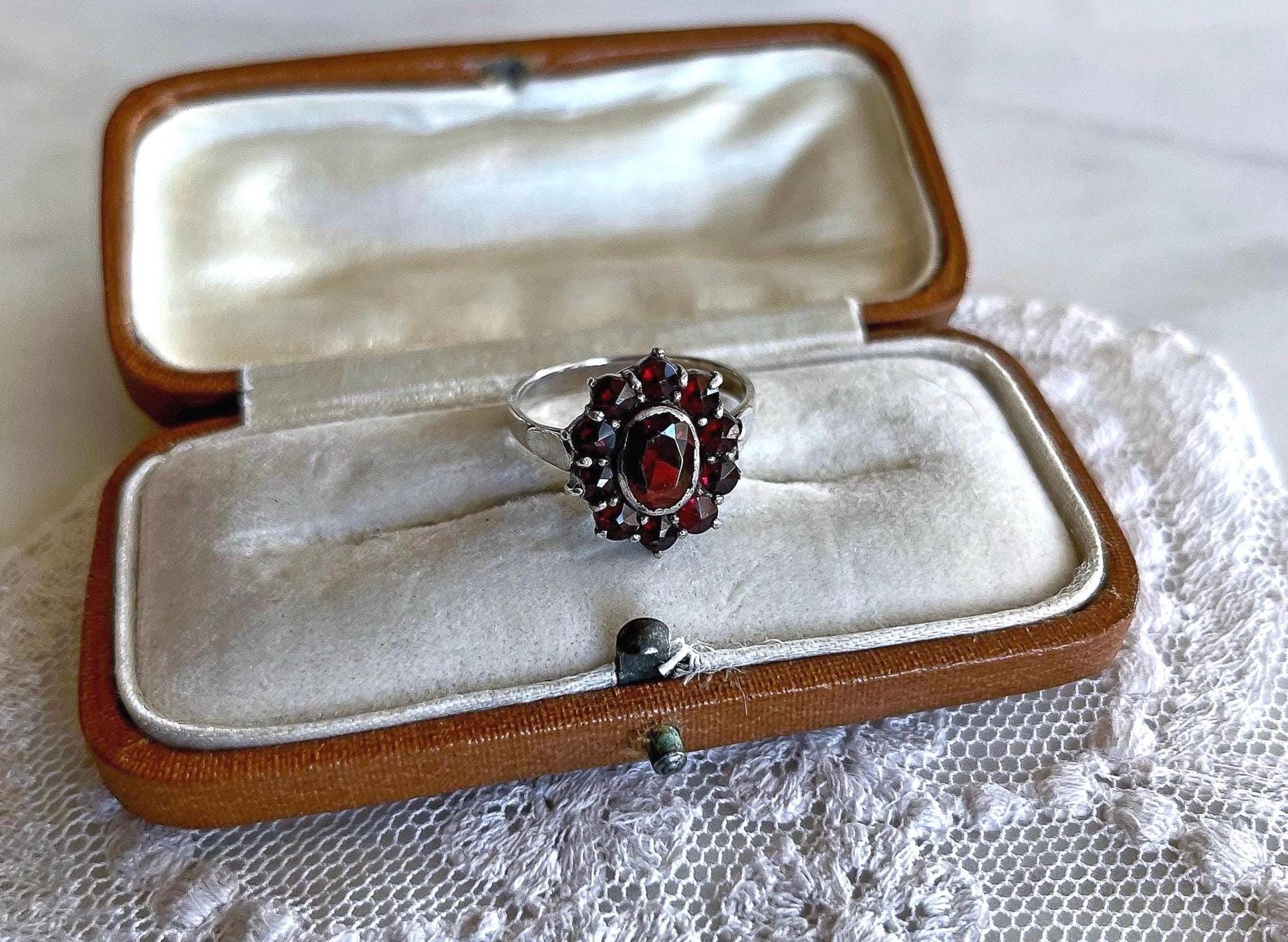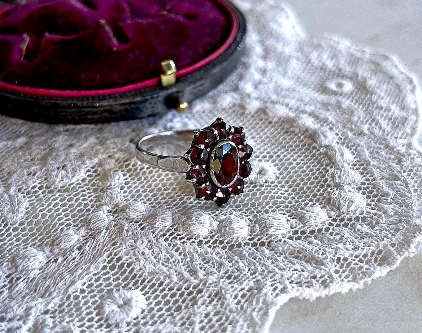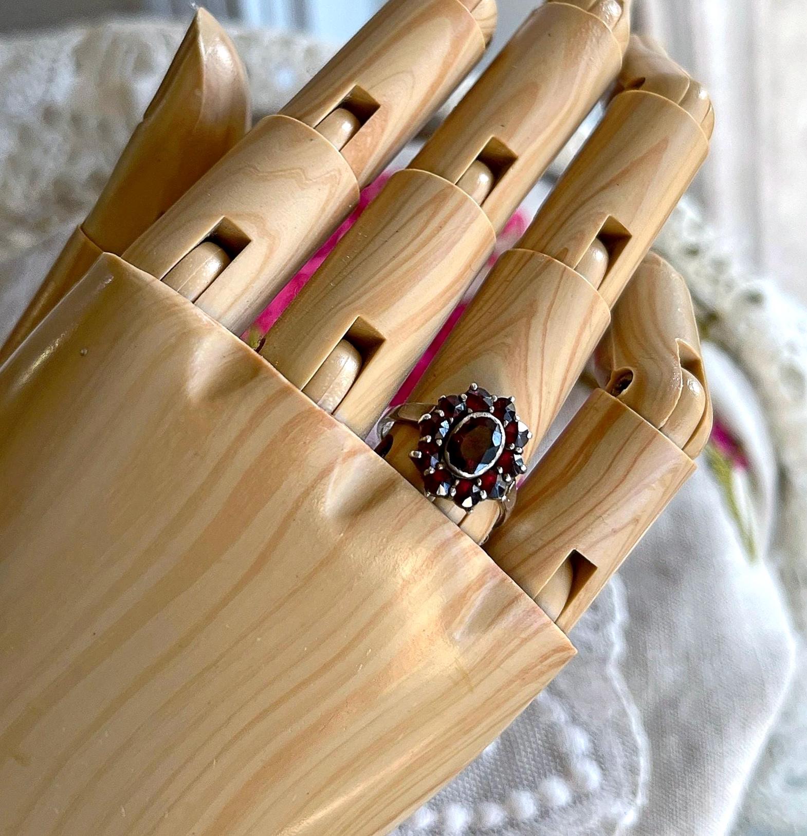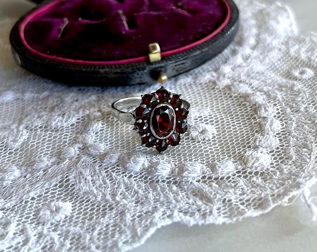 Featuring a spectacular vintage Bohemian revival old world 900 silver rose cut garnet cocktail ring adorned with beautiful faceted deep red Rose Cut Garnets set in a traditional Cluster setting. Ring is approximately size 6 at 2.72 grams respectively. Ring is in excellent vintage condition with normal wear with all stones intact and accounted for. Stamped 900 on the inside of band. Highly collectible, beautifully handcrafted vintage ring!
