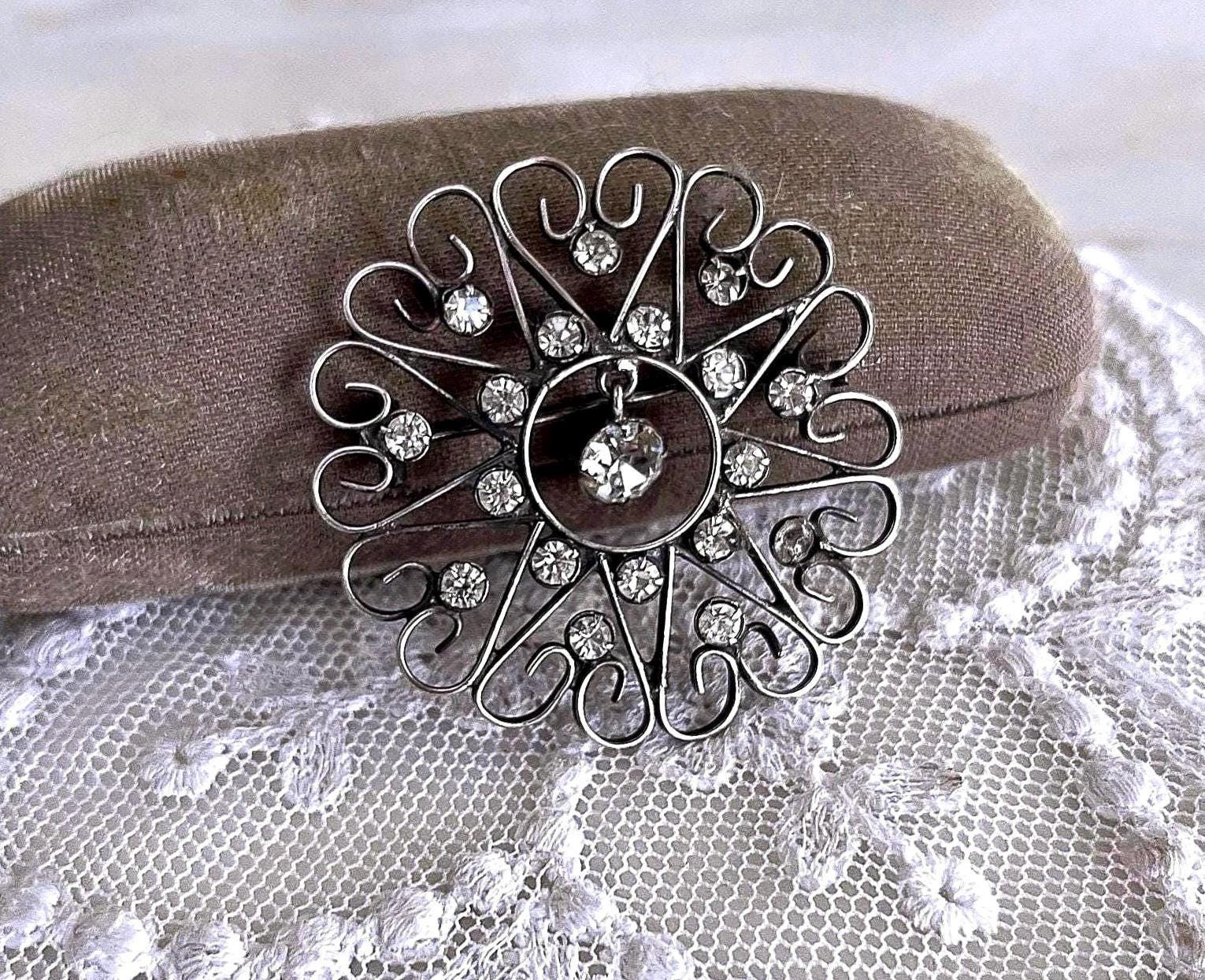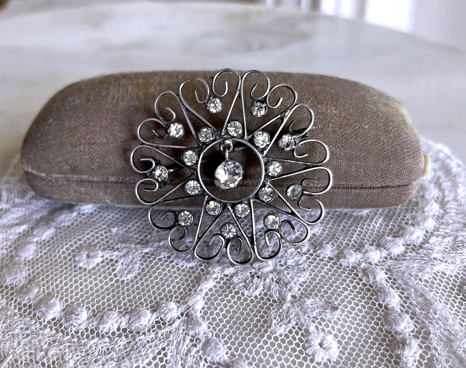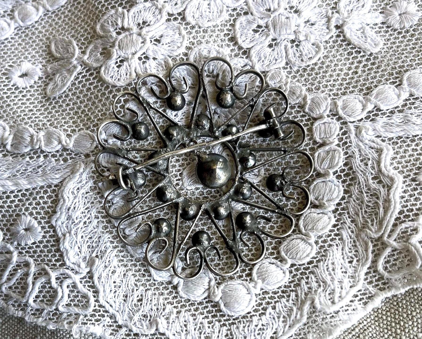 Featuring a dazzling antique 875 Kharkiv silver filigree brooch adorned with brilliant faceted paste stones set in a beautiful filigree closed bubble back settings. Brooch measures approximately 2 inches at 3.5 grams respectively and is in excellent antique condition with a lovely patina with all stones present. A unique and beautiful piece, hallmarked on the clasp.
