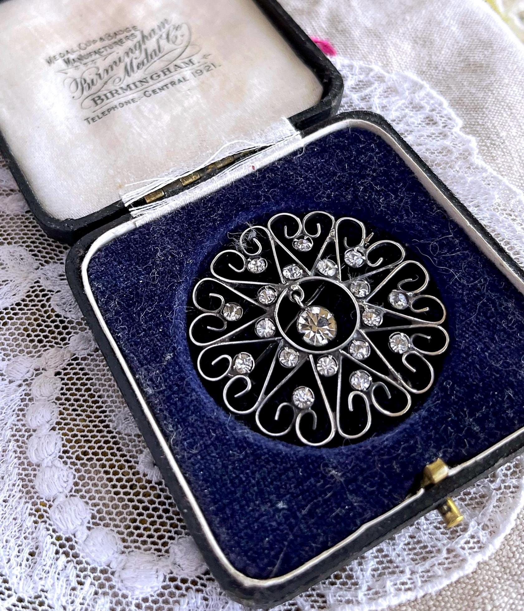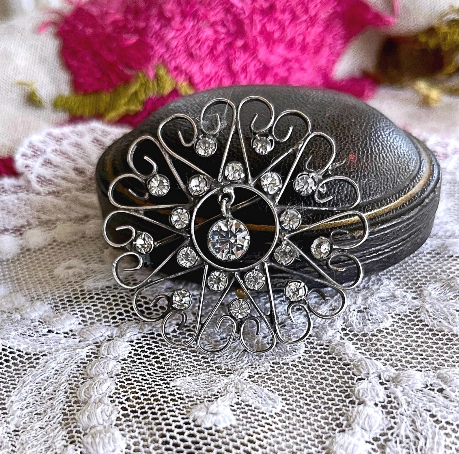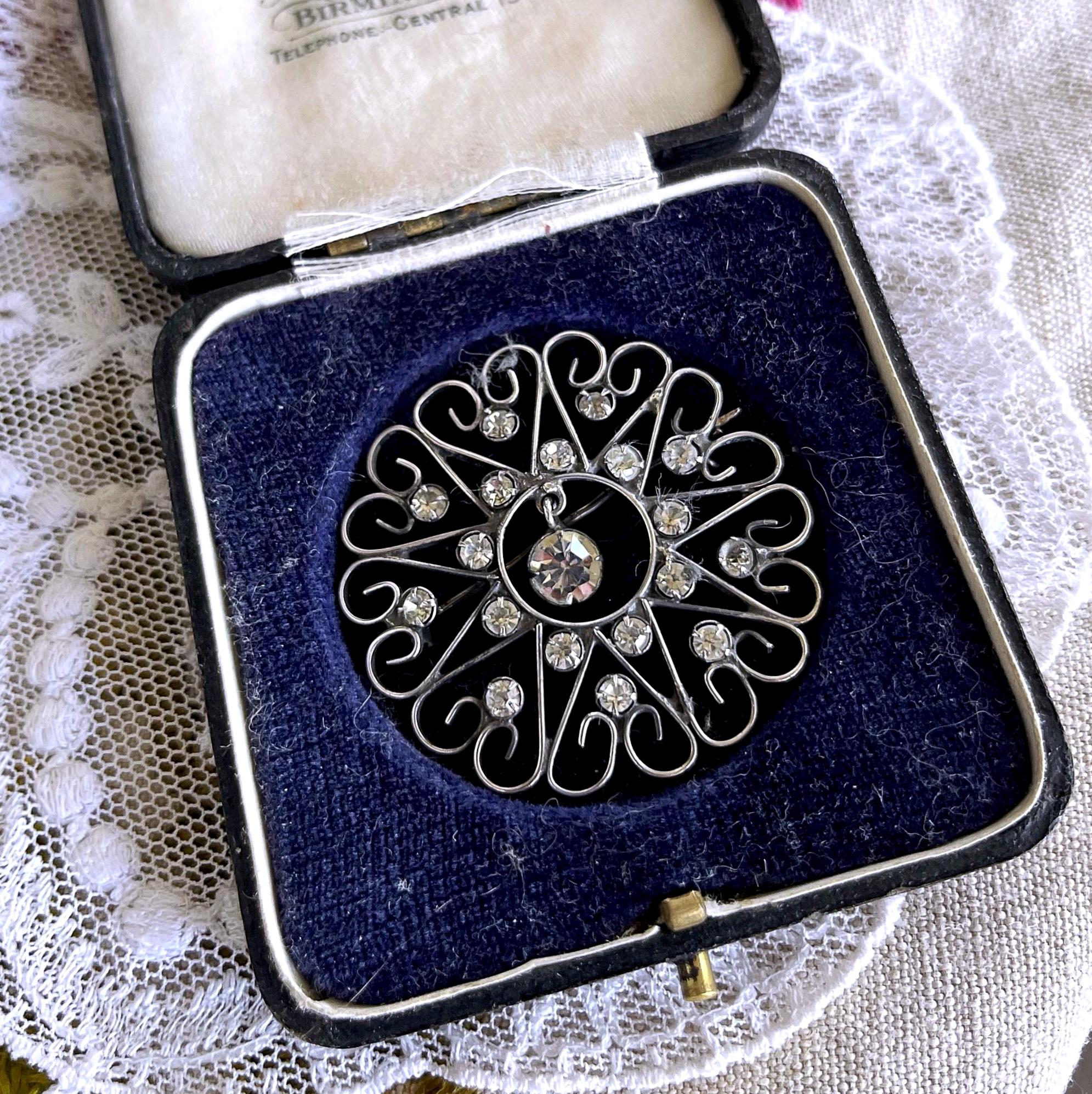 Featuring a dazzling antique 875 Kharkiv silver filigree brooch adorned with brilliant faceted paste stones set in a beautiful filigree closed bubble back settings. Brooch measures approximately 2 inches at 3.5 grams respectively and is in excellent antique condition with a lovely patina with all stones present. A unique and beautiful piece, hallmarked on the clasp.