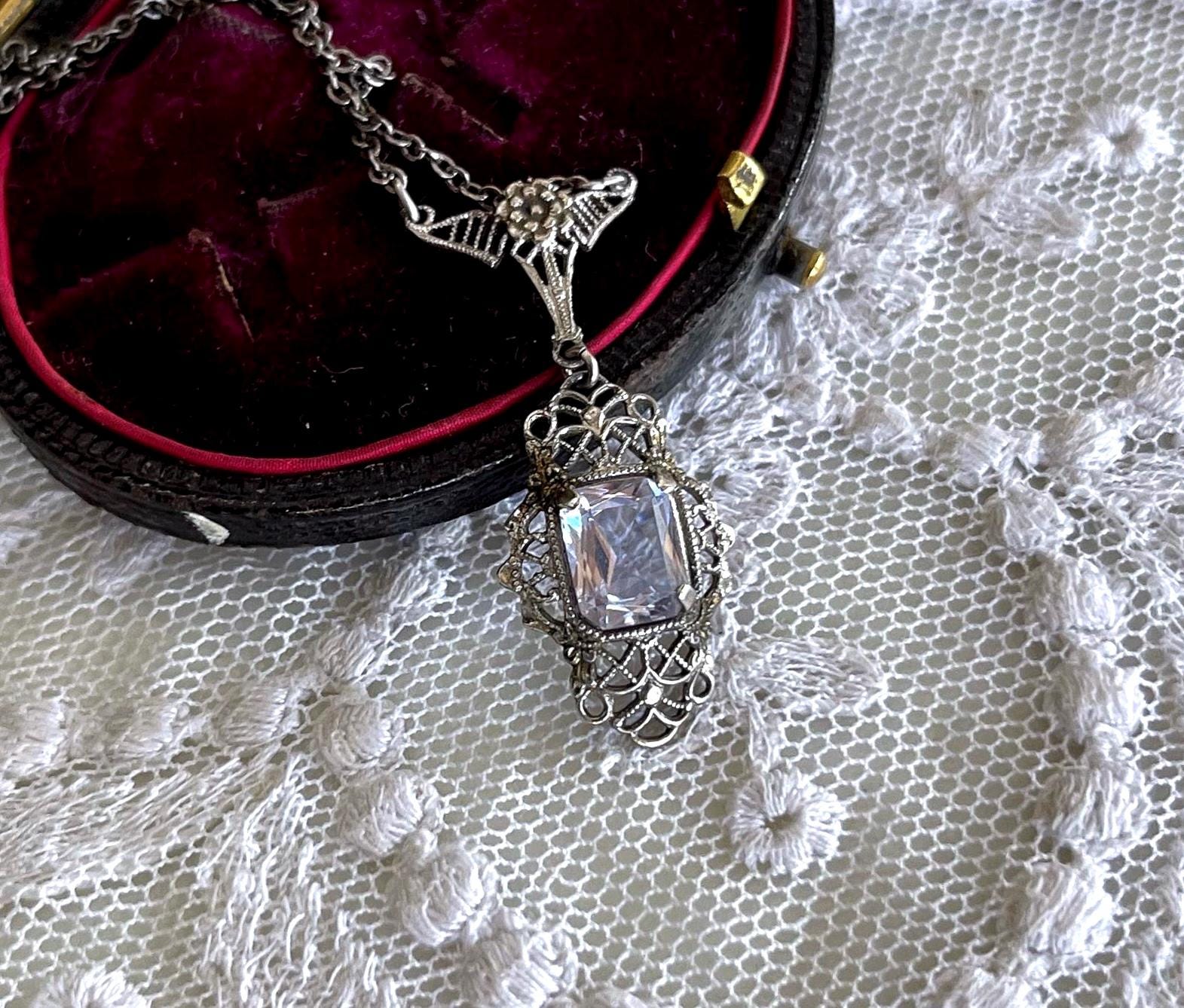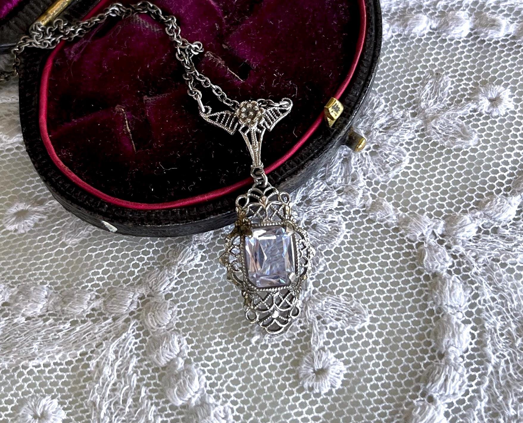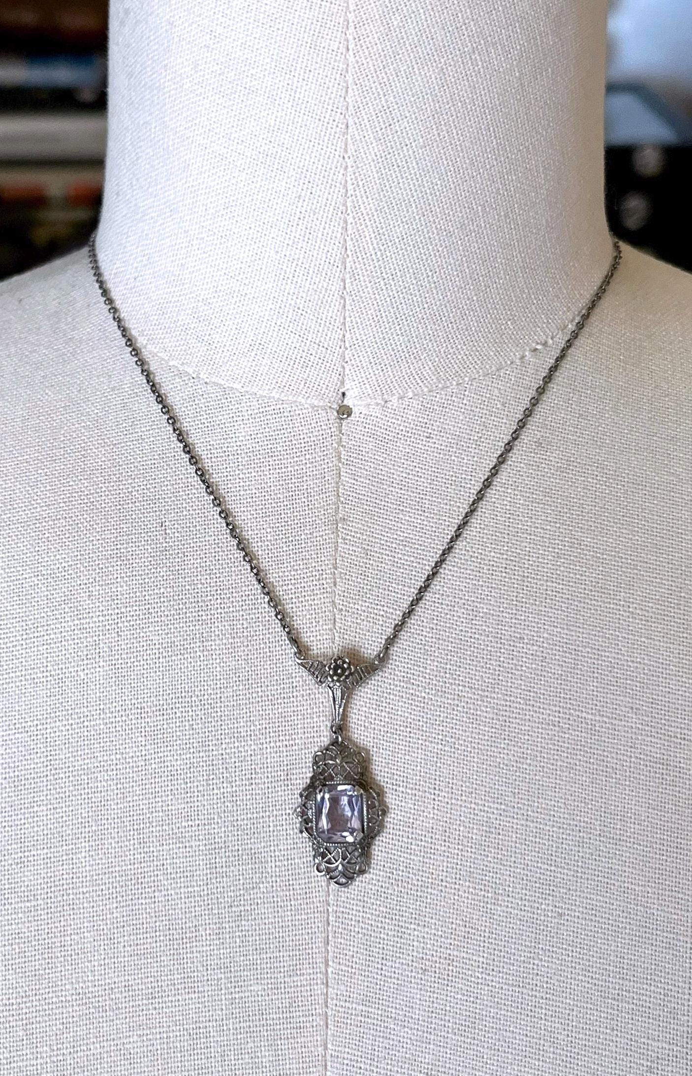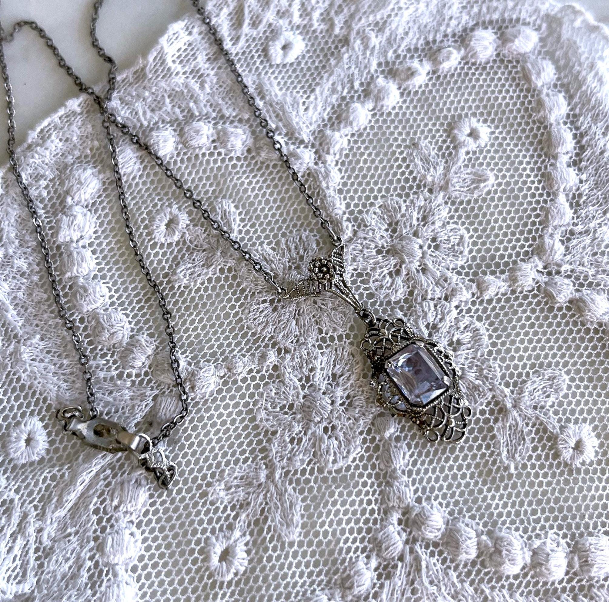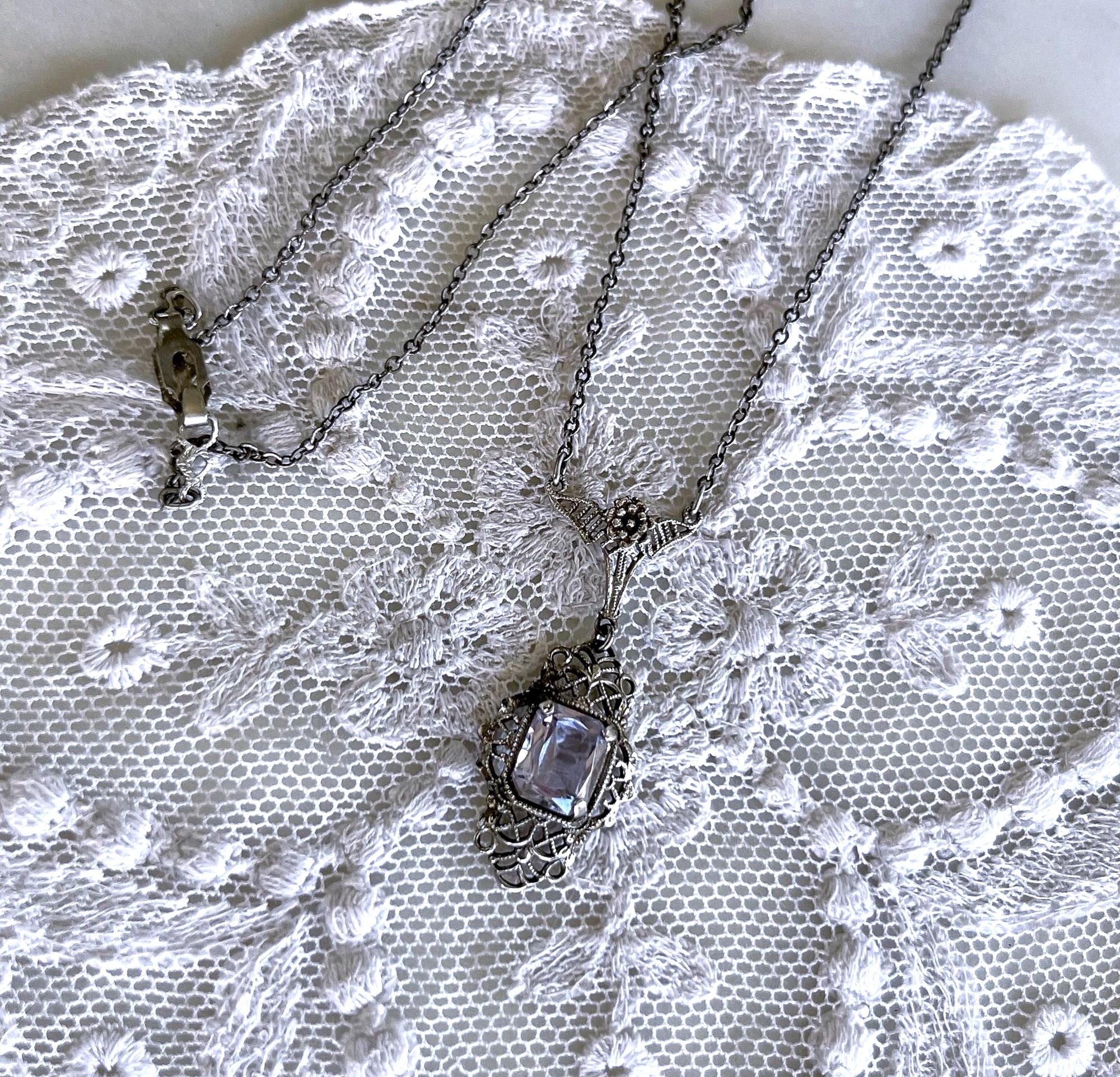 Featuring a beautiful dainty antique 1910s Edwardian rhodium plated silver filigree lavaliere necklace adorned with a dazzling open back pronged faceted Alexandrite paste stone set in a decorative filigree setting. Necklace measures approximately 15.2 inches around with a 1 1/4 inch pendant drop at 2.49 grams respectively. This gorgeous antique necklace is in excellent condition with a functional antique fold over clasp stamped STERLING, virtually no wear with stone intact. This lovely collectible necklace matches the ring previously listed, a truly magical piece!