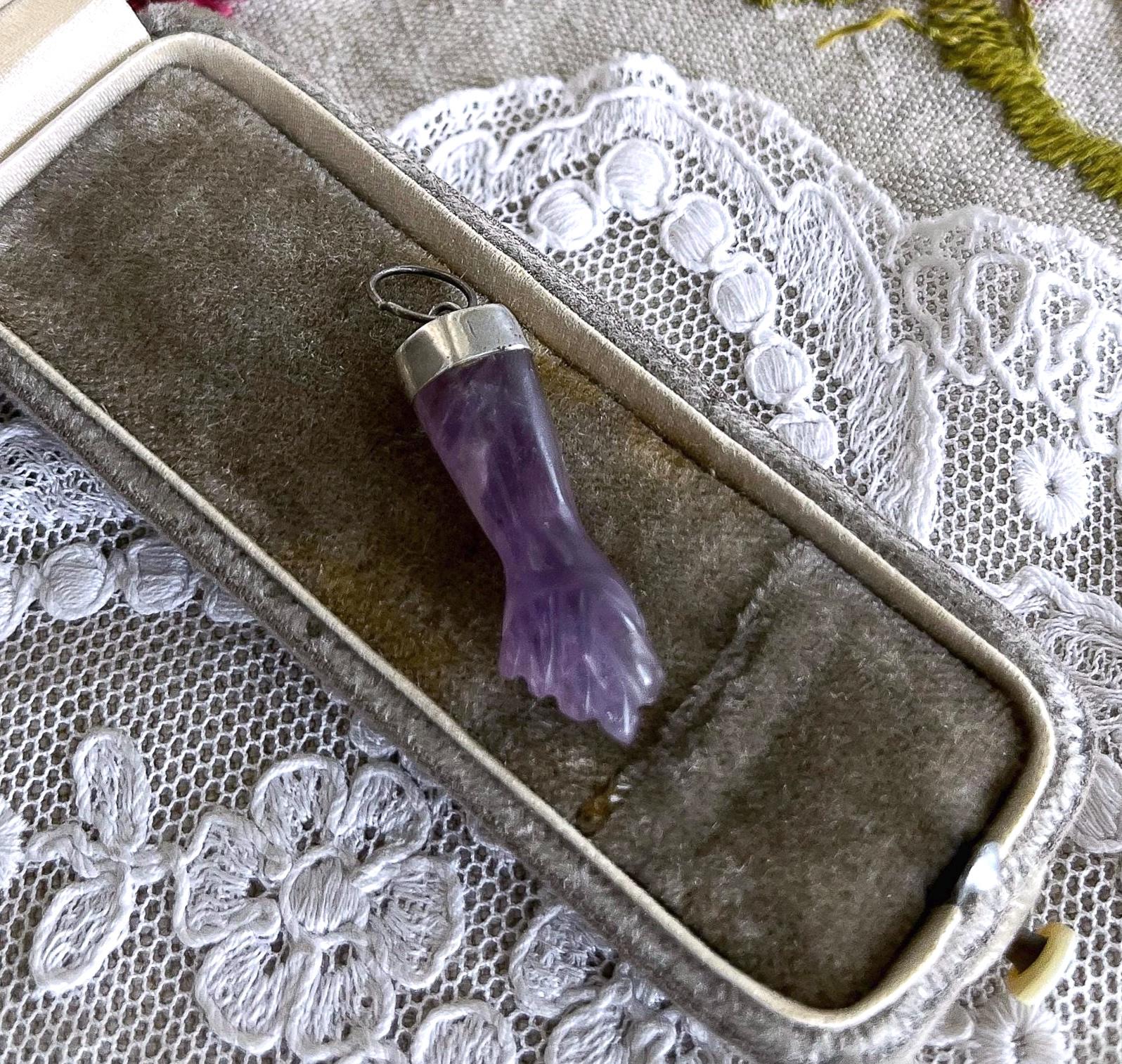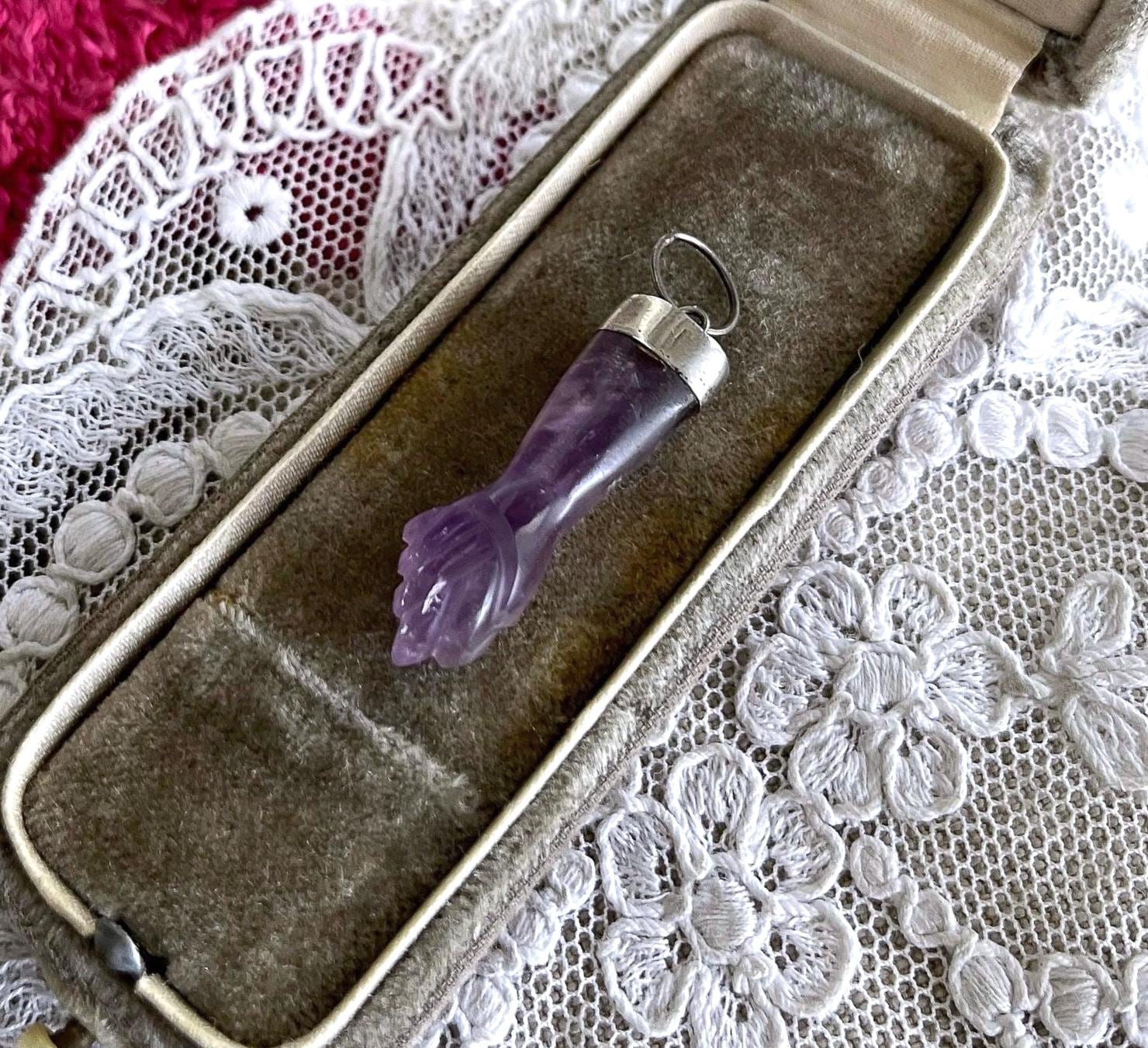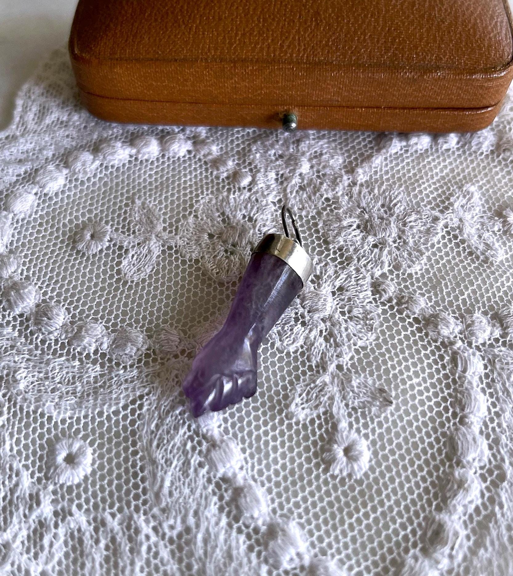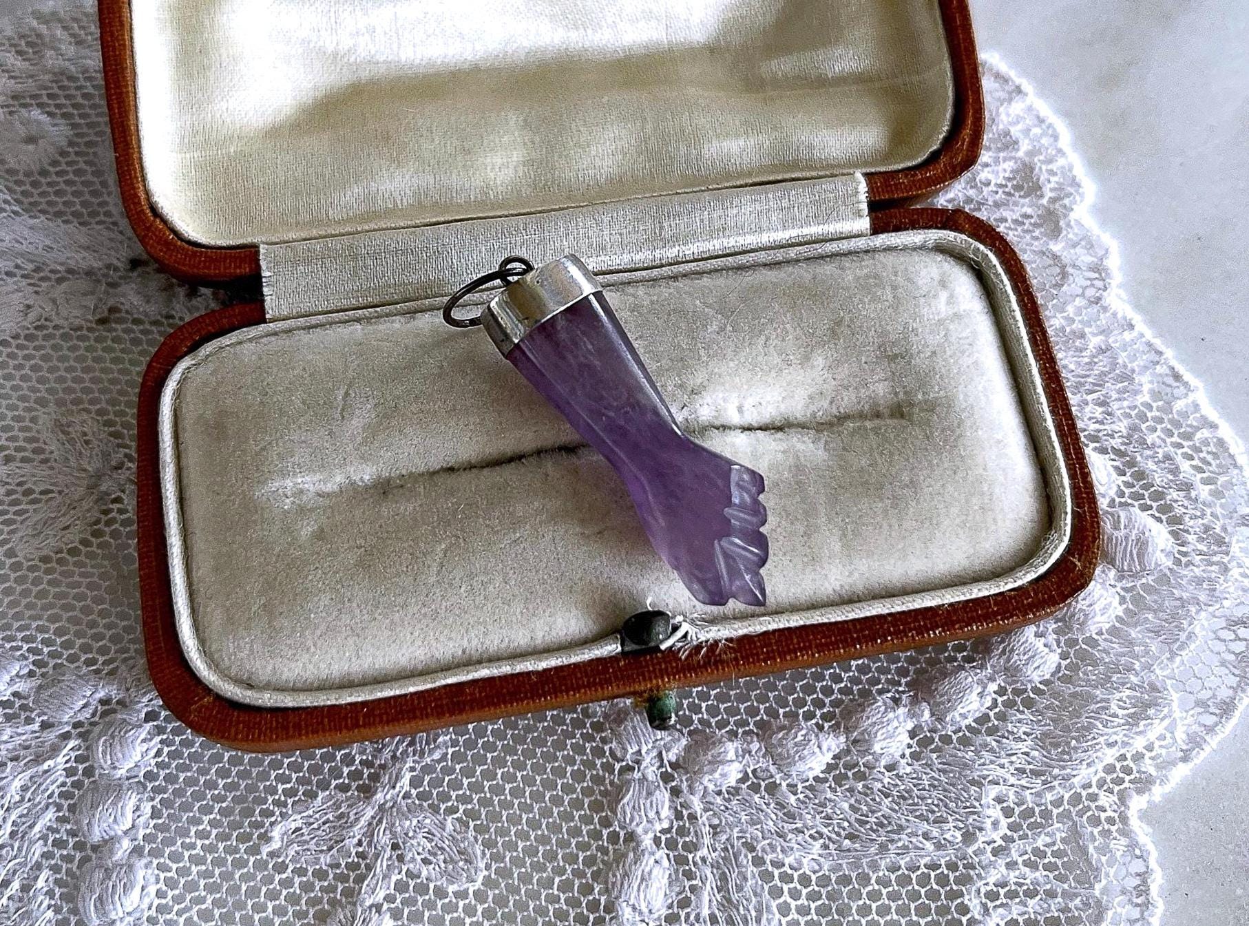 Featuring a wonderful lucky 900 silver genuine carved amethyst Figa hand amulet charm pendant. Pendant is in excellent antique condition, with a slight patina, with stone intact. measuring approximately 1.2 inches at 2.58 grams respectively. Beautifully made over 100 years ago, always appreciating and ready to wear and hand down for generations.