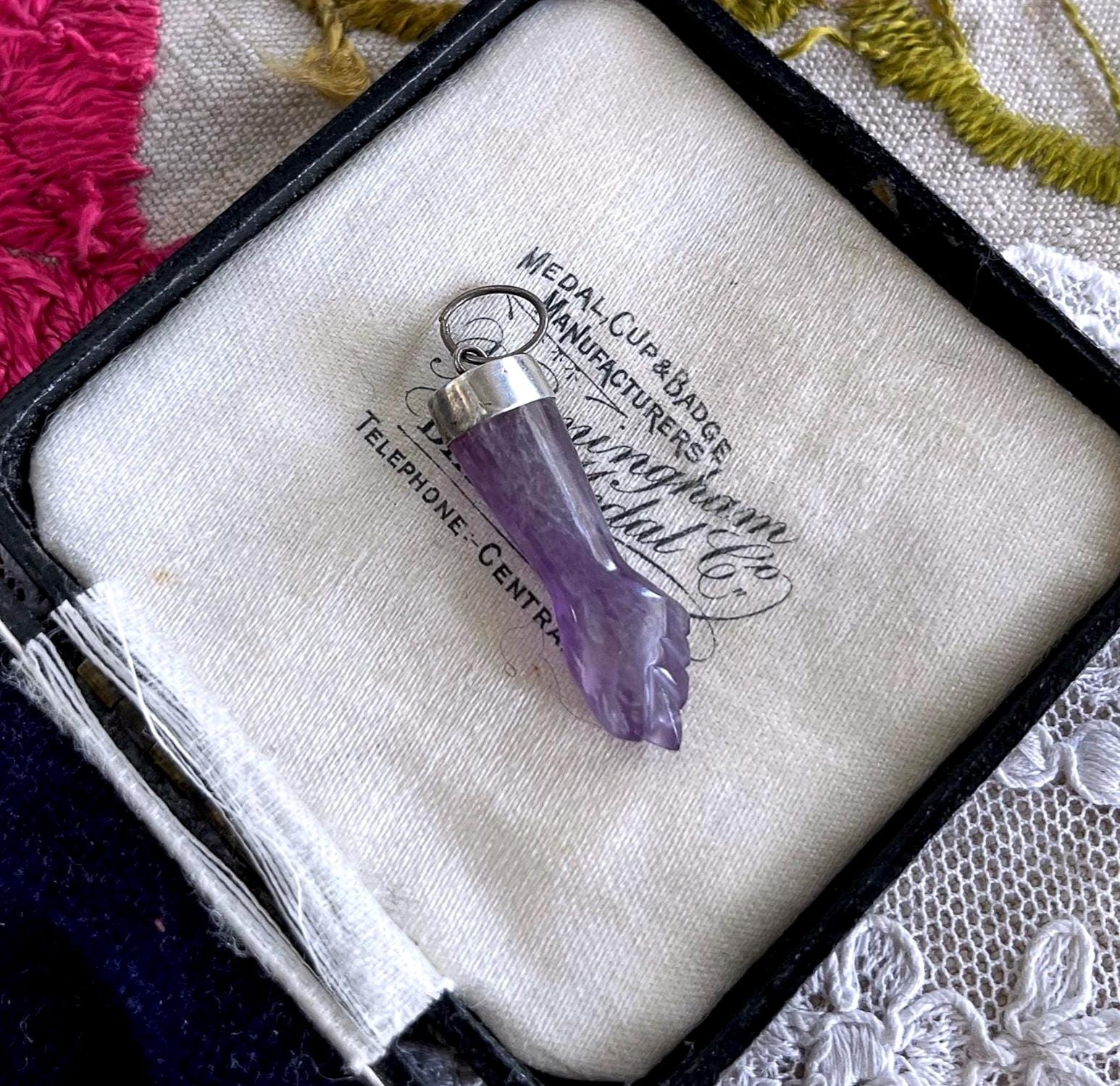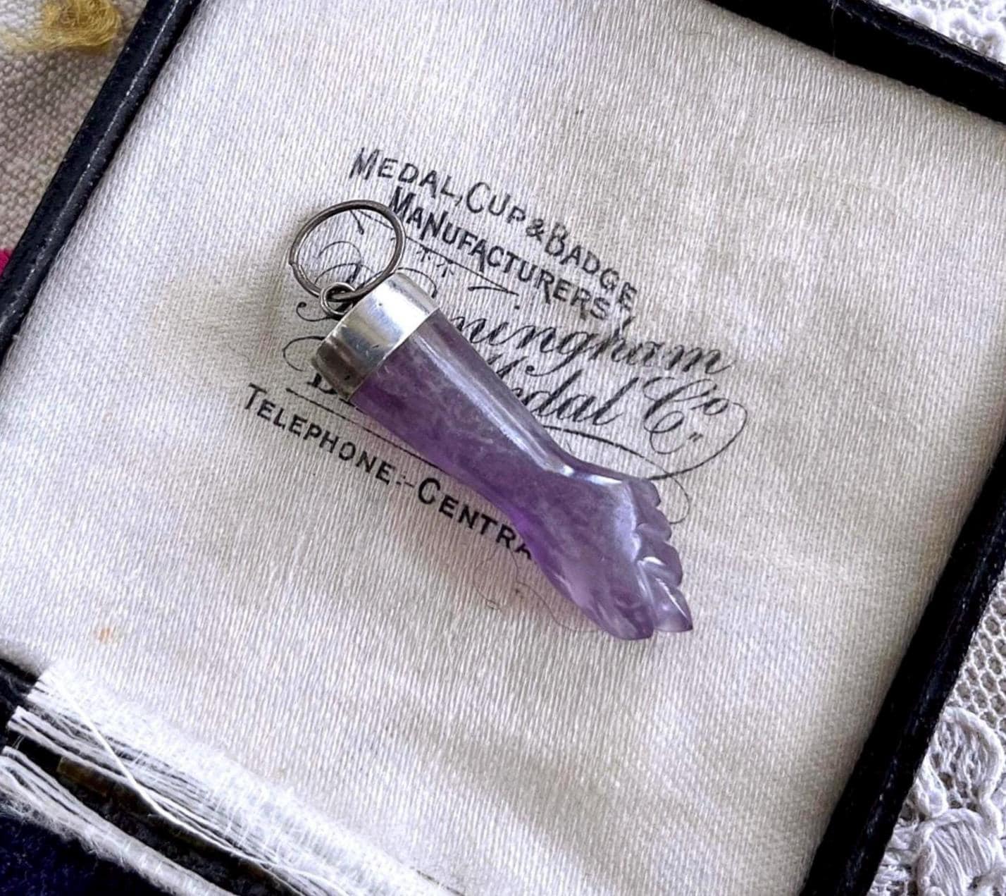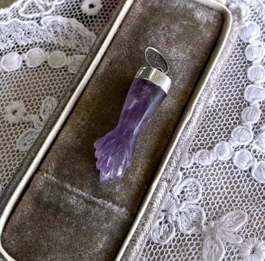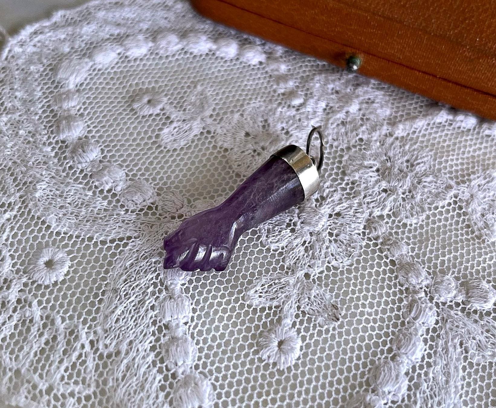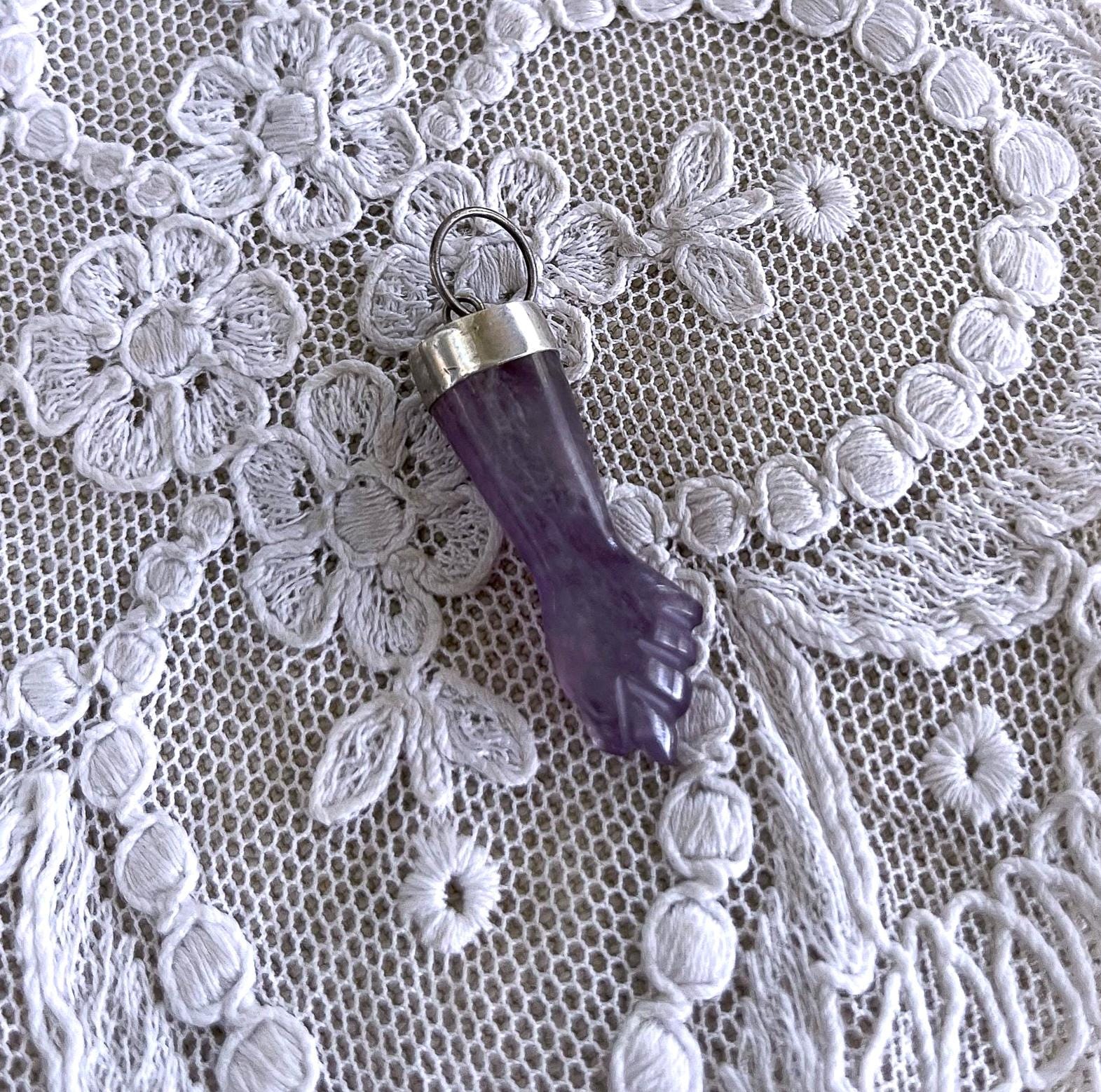 Featuring a wonderful lucky 900 silver genuine carved amethyst Figa hand amulet charm pendant. Pendant is in excellent antique condition, with a slight patina, with stone intact. measuring approximately 1.2 inches at 2.58 grams respectively. Beautifully made over 100 years ago, always appreciating and ready to wear and hand down for generations.