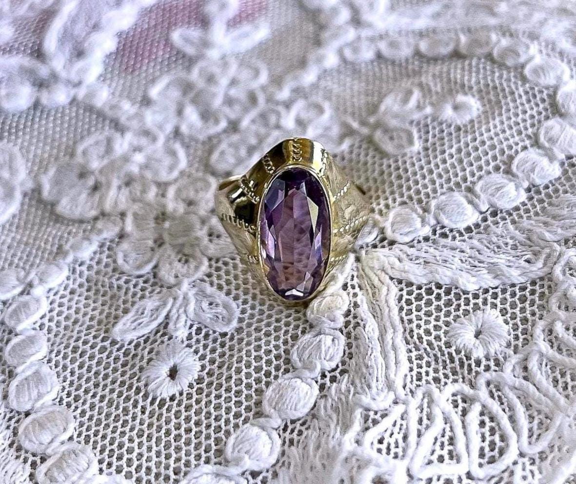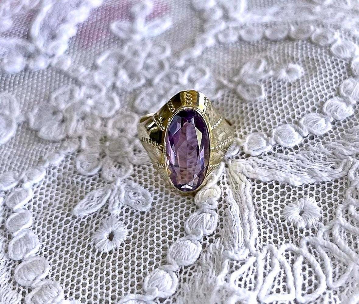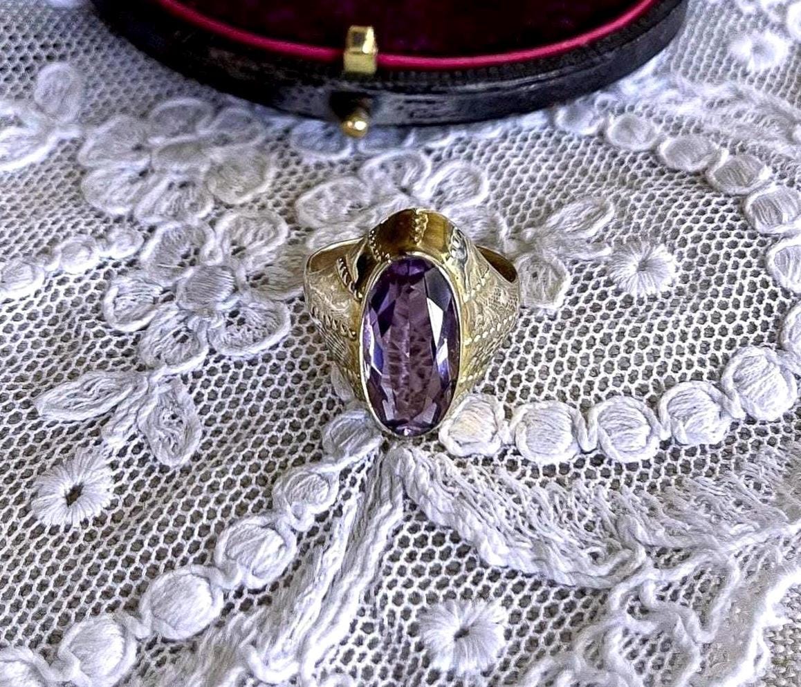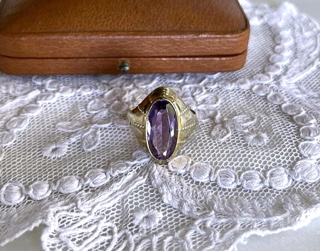 Featuring a gorgeous vintage Mid Century Modern beautifully made 9k yellow Gold Solitaire ring adorned with a beautiful genuine faceted Amethyst gemstone set in a solid gold bezel modernist setting. Ring is in excellent vintage condition with stone intact, approximately size 6 at 2.5 grams respectively. Stamped 333 on the inside of band this is a beautiful piece, demure and romantic!