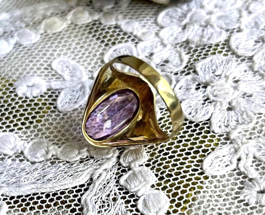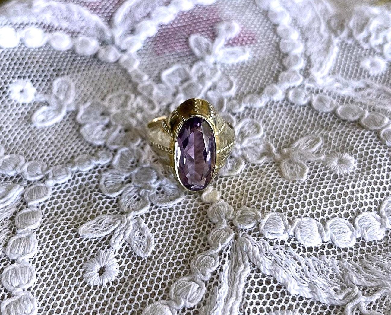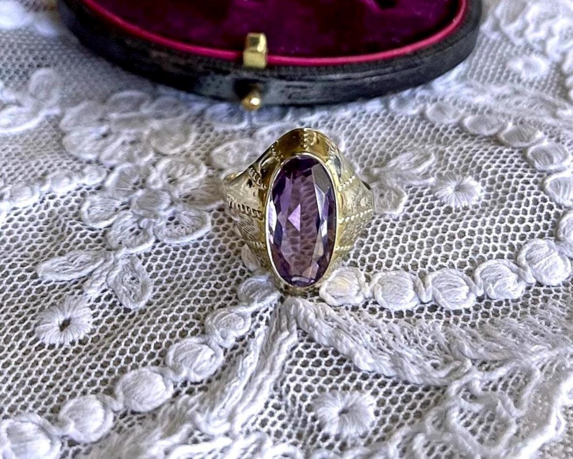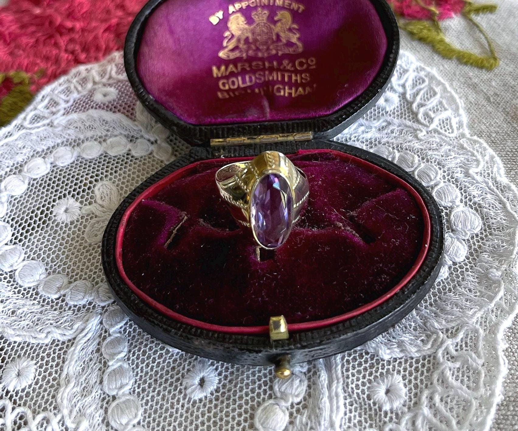 Featuring a gorgeous vintage Mid Century Modern beautifully made 9k yellow Gold Solitaire ring adorned with a beautiful genuine faceted Amethyst gemstone set in a solid gold bezel modernist setting. Ring is in excellent vintage condition with stone intact, approximately size 6 at 2.5 grams respectively. Stamped 333 on the inside of band this is a beautiful piece, demure and romantic!