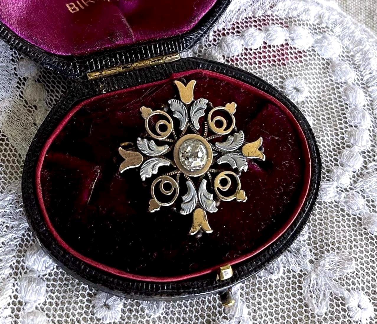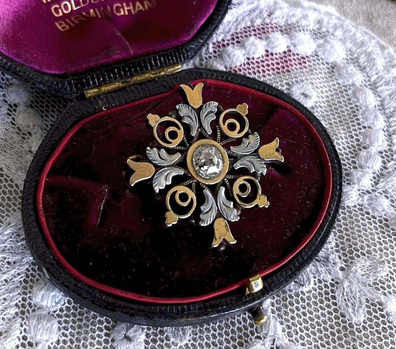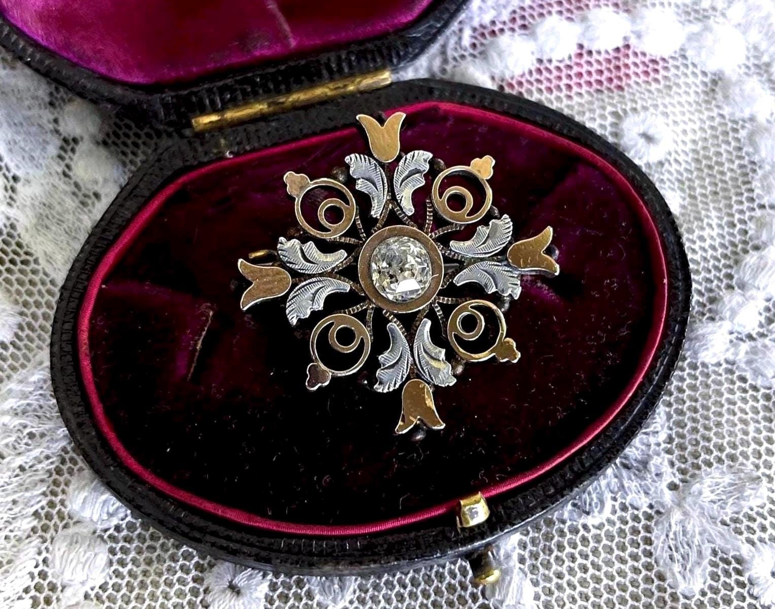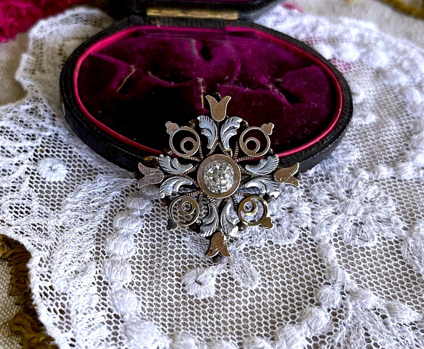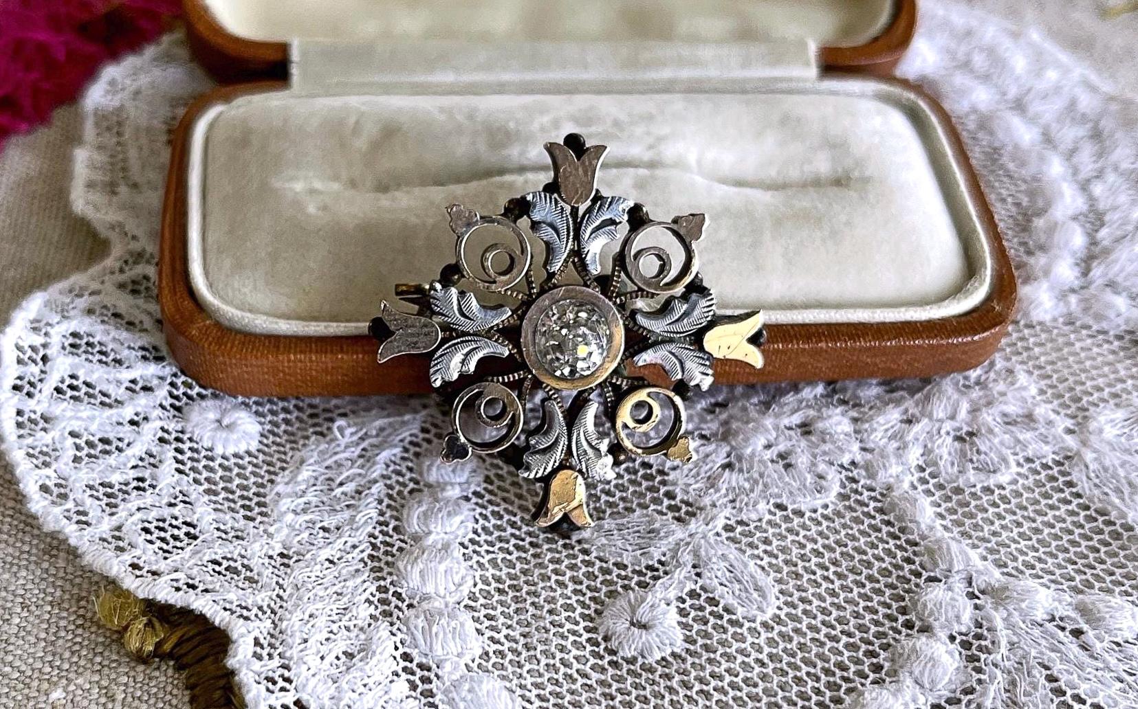 Featuring a dazzling antique Late Victorian sterling silver gold filled lapel brooch adorned with a gorgeous antique rise cut diamond foil back paste stone accented with delicate two tone scroll work with a star flower motif . Brooch is in excellent antique condition with normal wear with a functional antique clasp. Brooch measures approximately 1.9 inches long at 4.72 grams respectively . Hallmarked STERLING/GF on the reverse , this is a splendid, collectible, wearable piece.