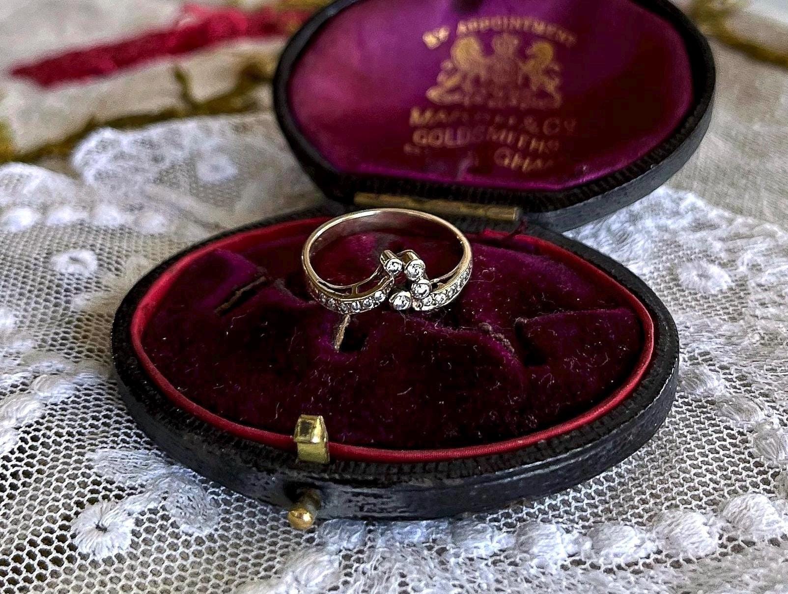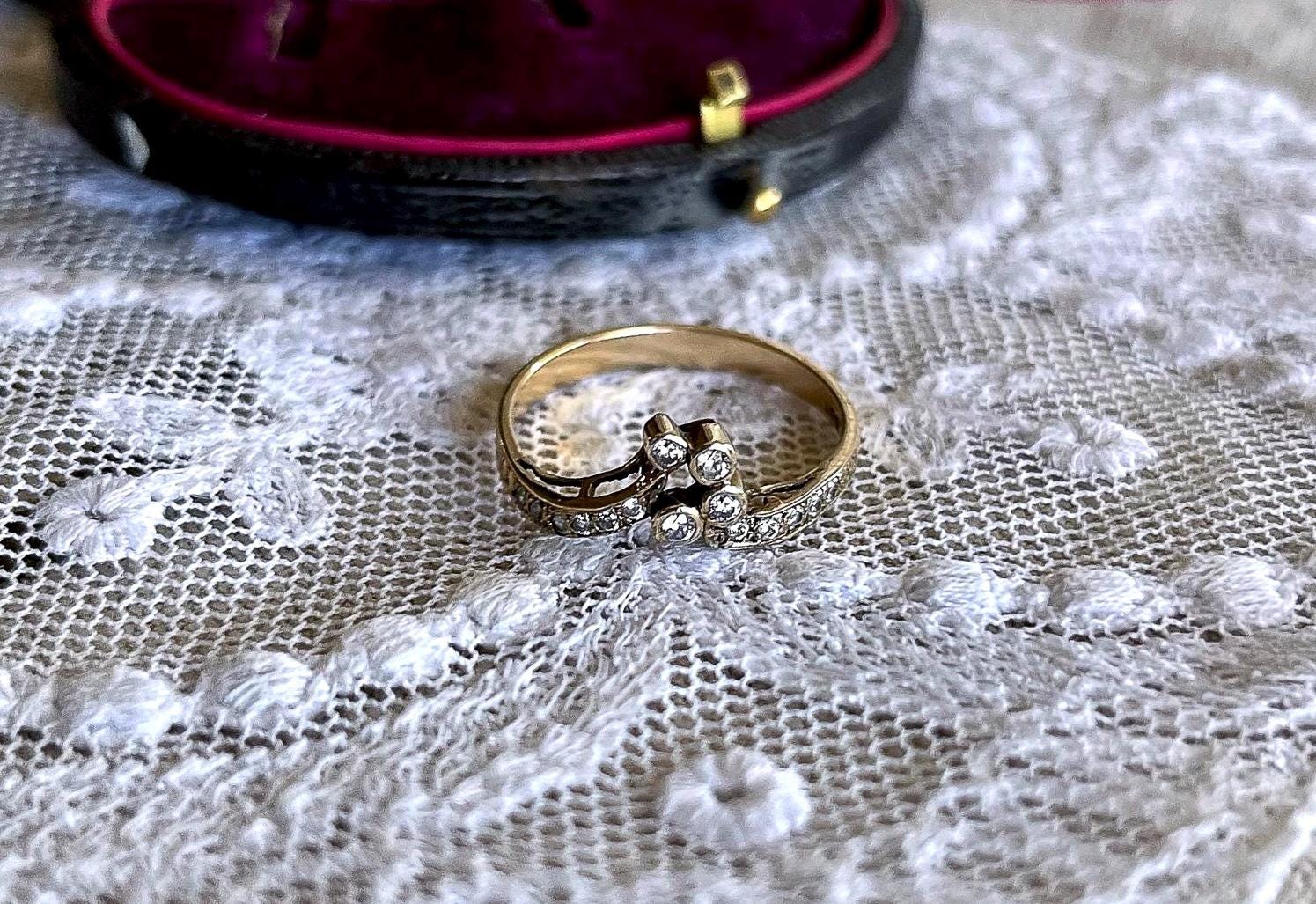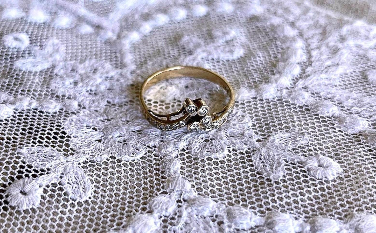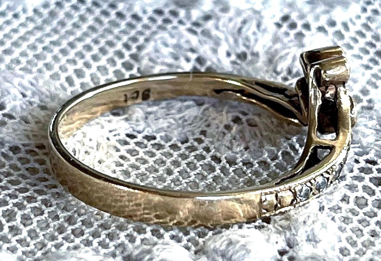 Featuring a beautiful vintage hallmarked 9k yellow gold size 7.5 cocktail ring adorned with genuine faceted Moissanite gemstones set in a decorative bezel settings. Ring is in excellent vintage condition with normal wear and all stones intact. Ring is approximately size 7.5 at 1.8 grams respectively and is hallmarked on the inside of band. A wonderful way to invest, a dazzling, unique piece.