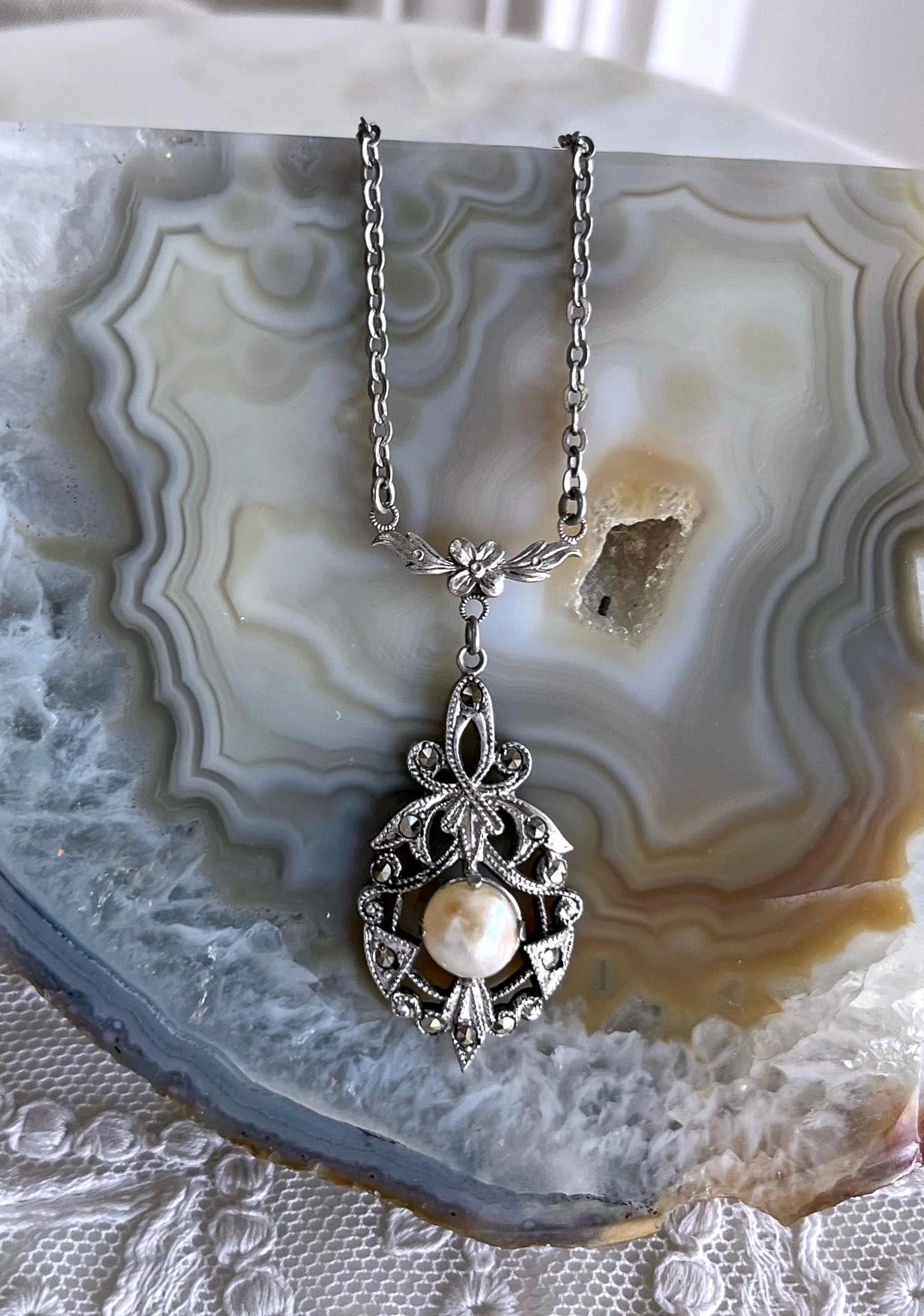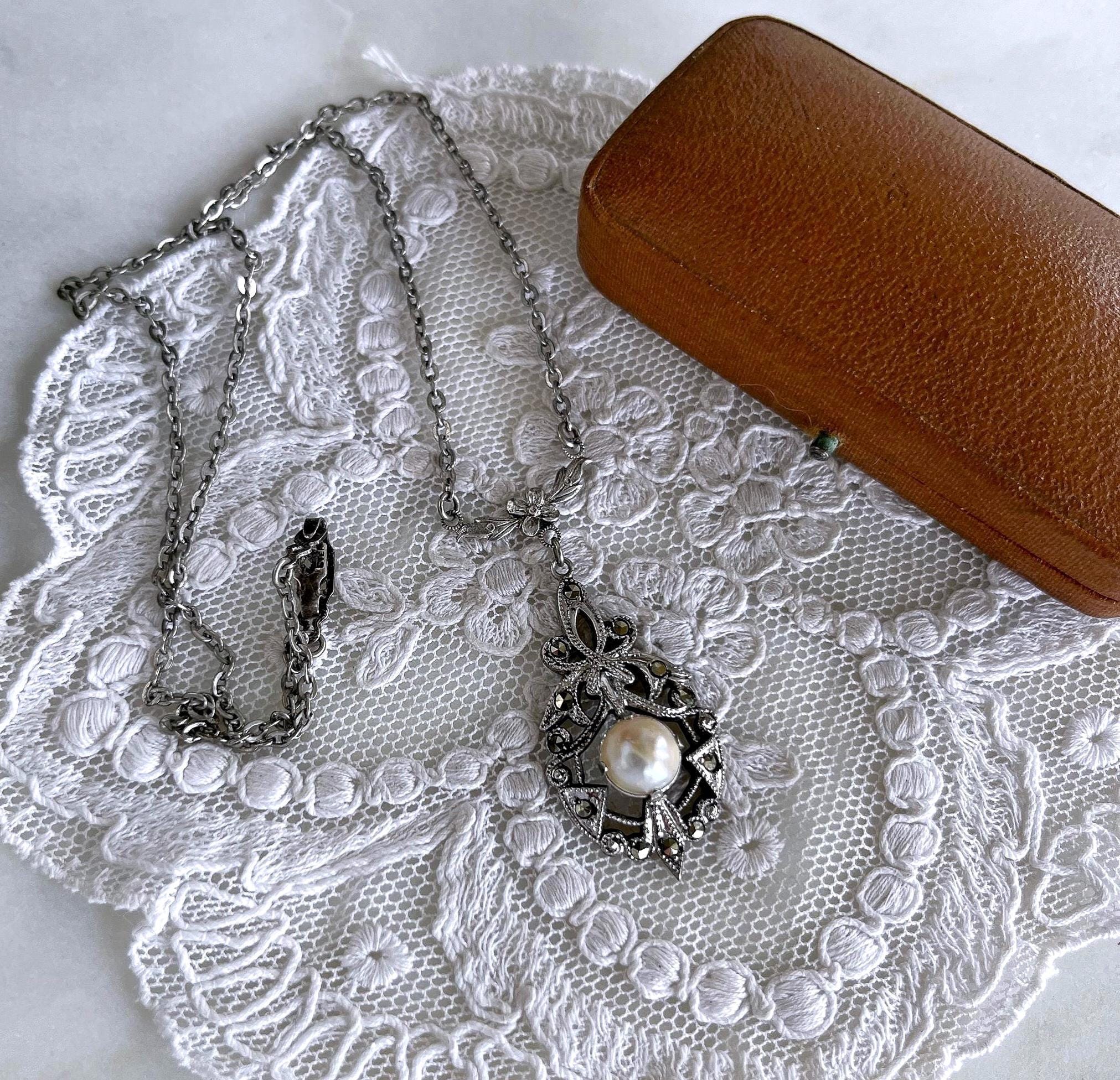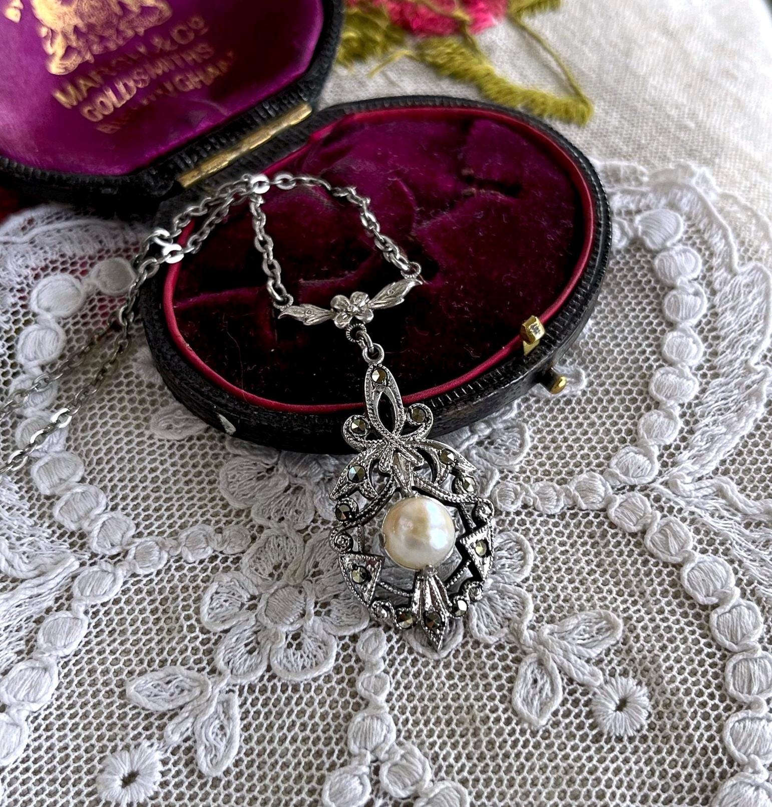 Featuring a romantic antique Edwardian Belle Époque sterling silver lavaliere necklace adorned with a luminous genuine Cultured Pearl accented with sparkling marcasite crystals set in an intricate delicate settings. Necklace is in excellent antique condition with a stamped functional antique fold clasp with all stones intact and accounted for. Measuring approximately 17 inches long with a 1.5 inch pendant drop at 5.9 grams respectively this is a truly unique exceptional piece, stamped STERLING on the reverse of pendant and clasp.