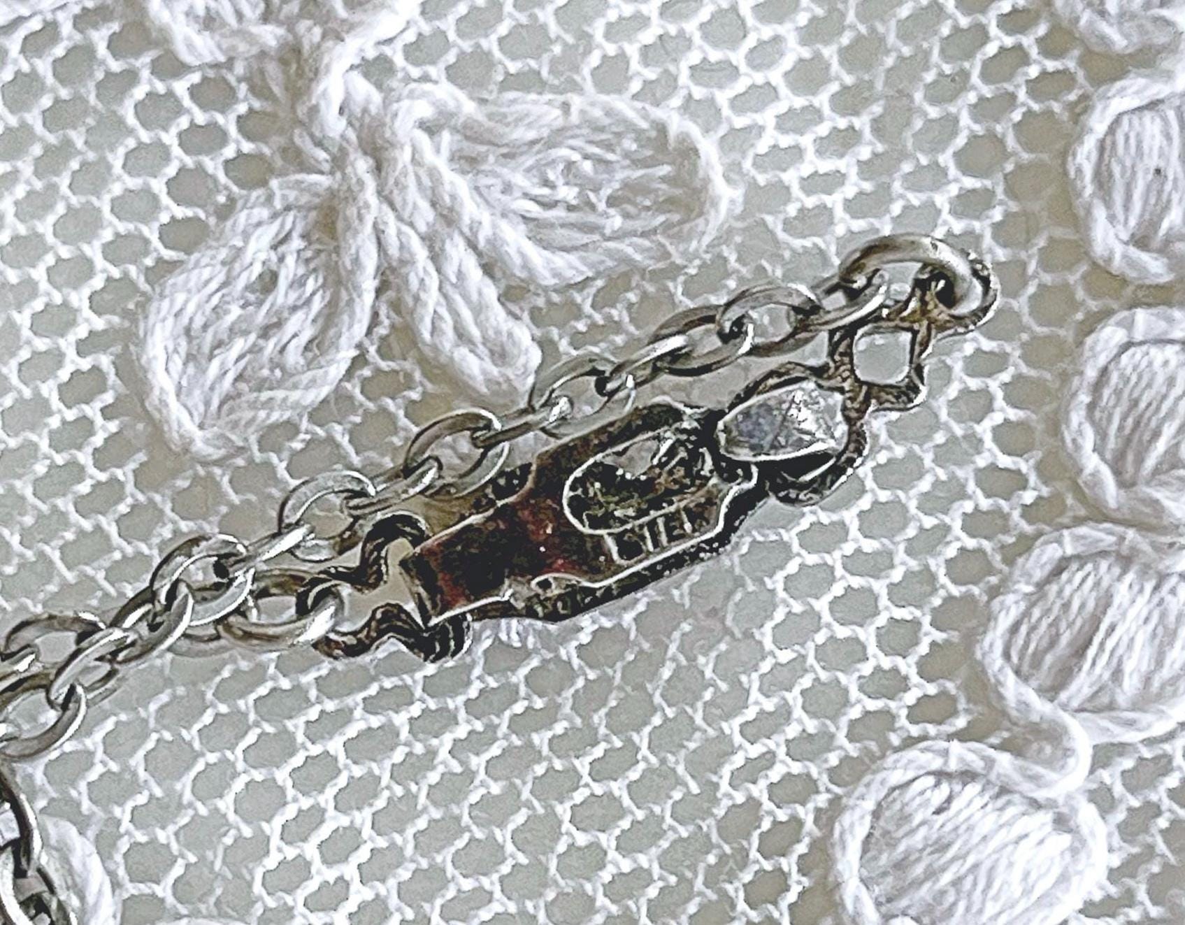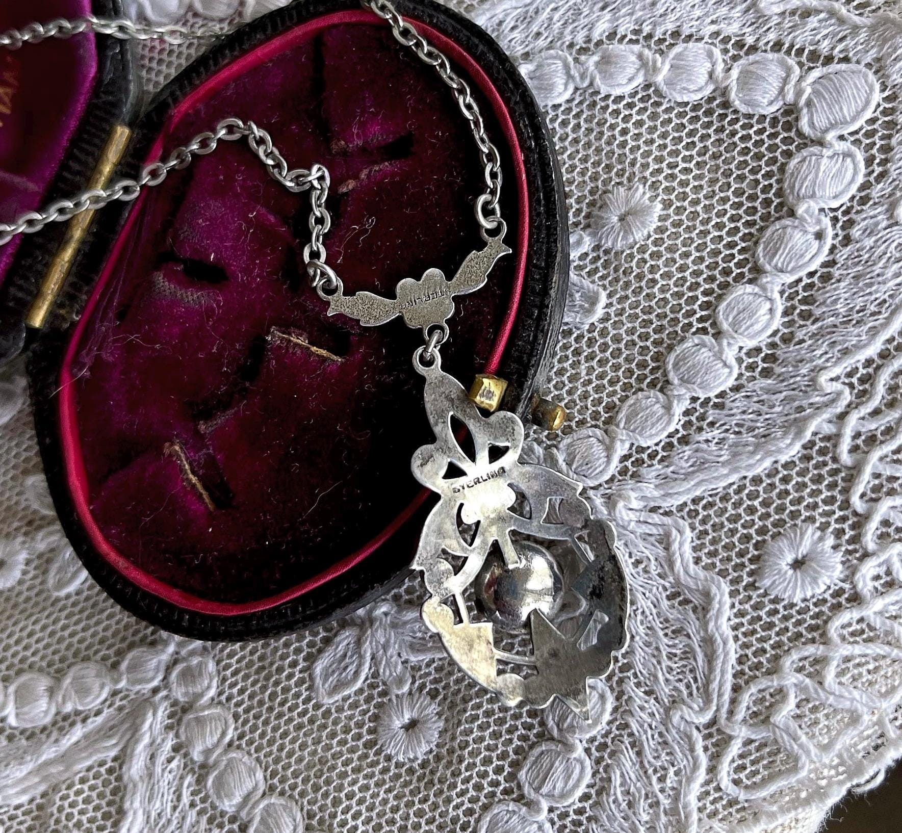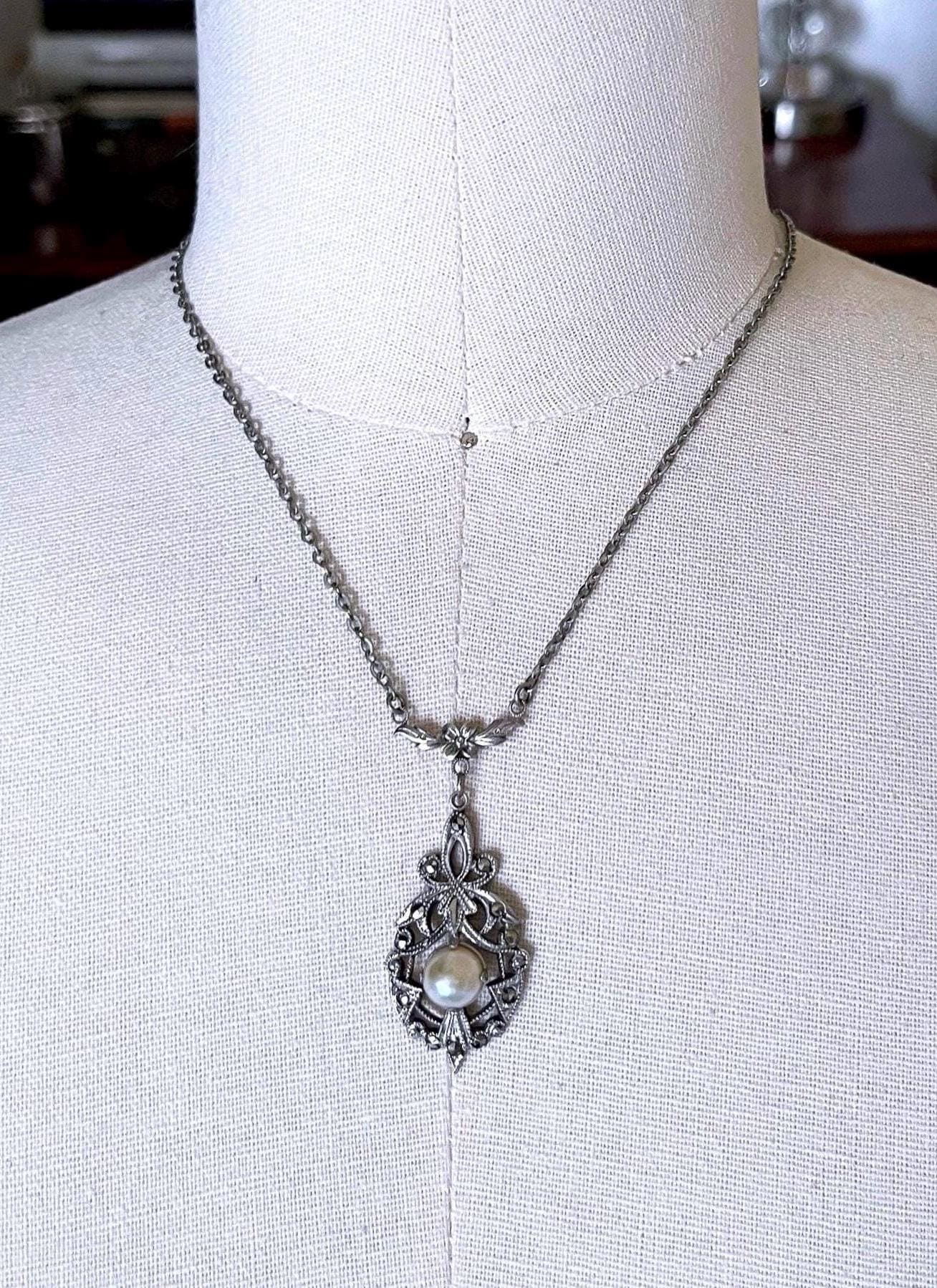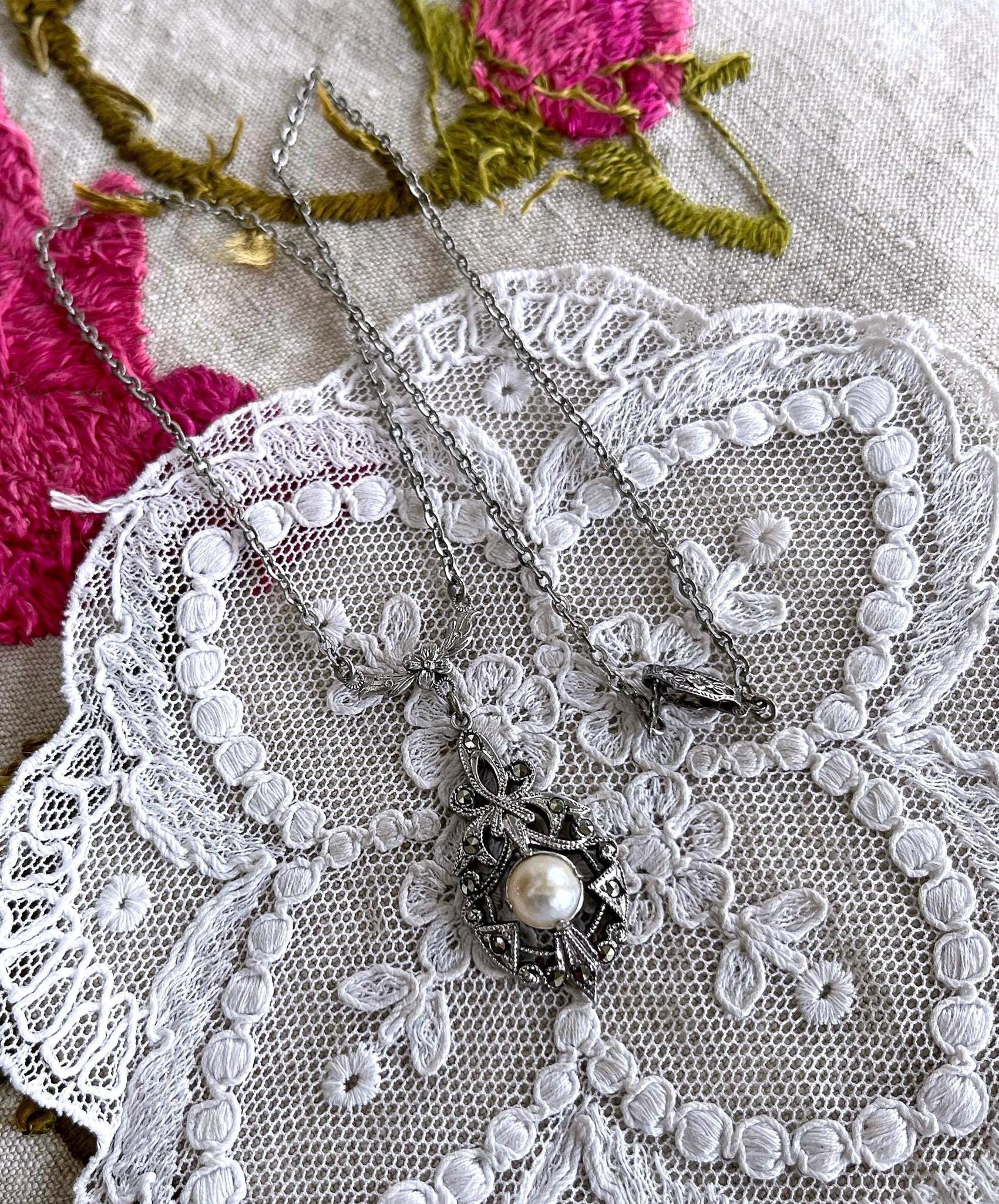 Featuring a romantic antique Edwardian Belle Époque sterling silver lavaliere necklace adorned with a luminous genuine Cultured Pearl accented with sparkling marcasite crystals set in an intricate delicate settings. Necklace is in excellent antique condition with a stamped functional antique fold clasp with all stones intact and accounted for. Measuring approximately 17 inches long with a 1.5 inch pendant drop at 5.9 grams respectively this is a truly unique exceptional piece, stamped STERLING on the reverse of pendant and clasp.