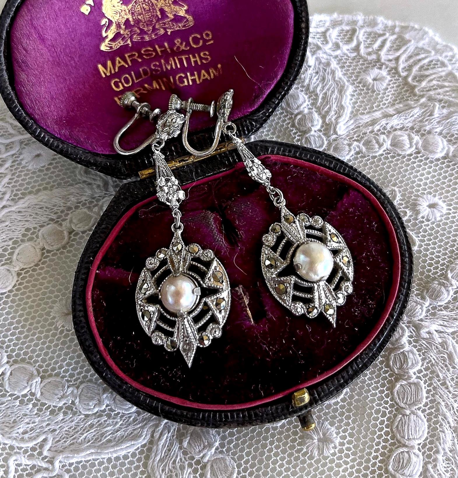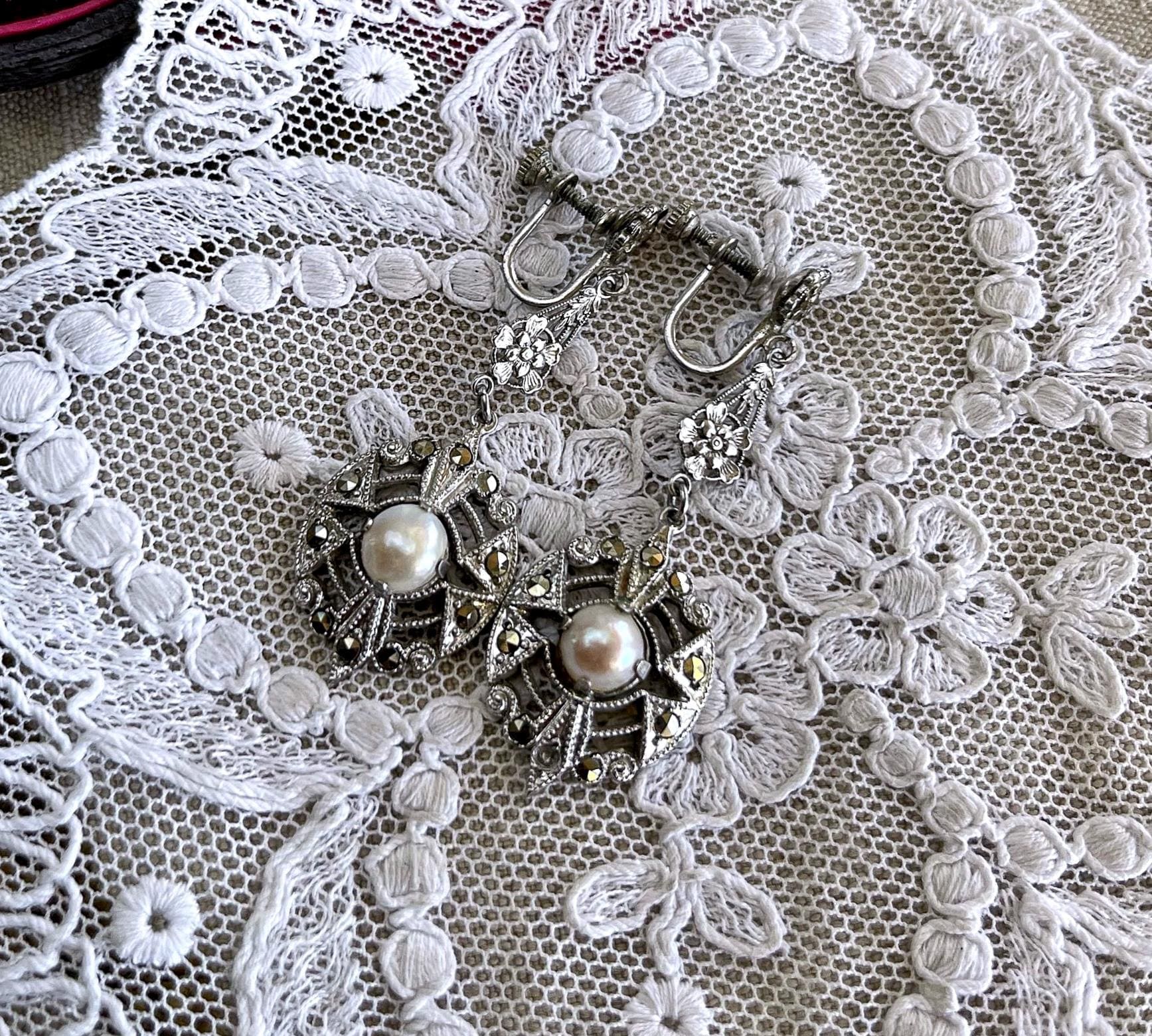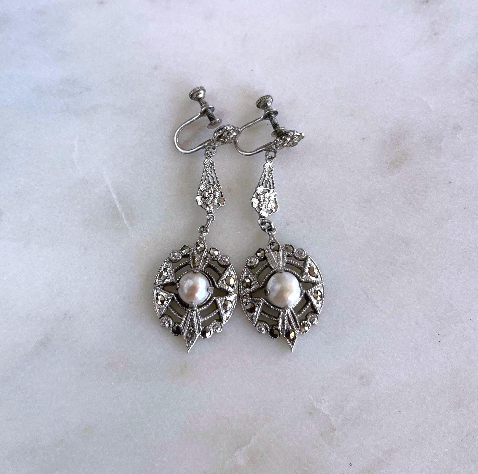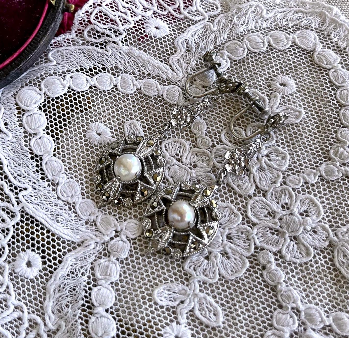 Featuring a fine pair of antique 1900s-1910s Edwardian Belle Époque sterling silver screw back drop earrings adorned with a luminous genuine Cultured Pearl accented with sparkling marcasite crystals set in an intricate closed back settings. Earrings are in excellent antique condition with functional hallmarked clasps and all stones intact and accounted for also stamped in the reverse of drops. Measuring approximately 2 inches long at 5.99 grams respectively these beauties are ready to wear and pass on for generations.