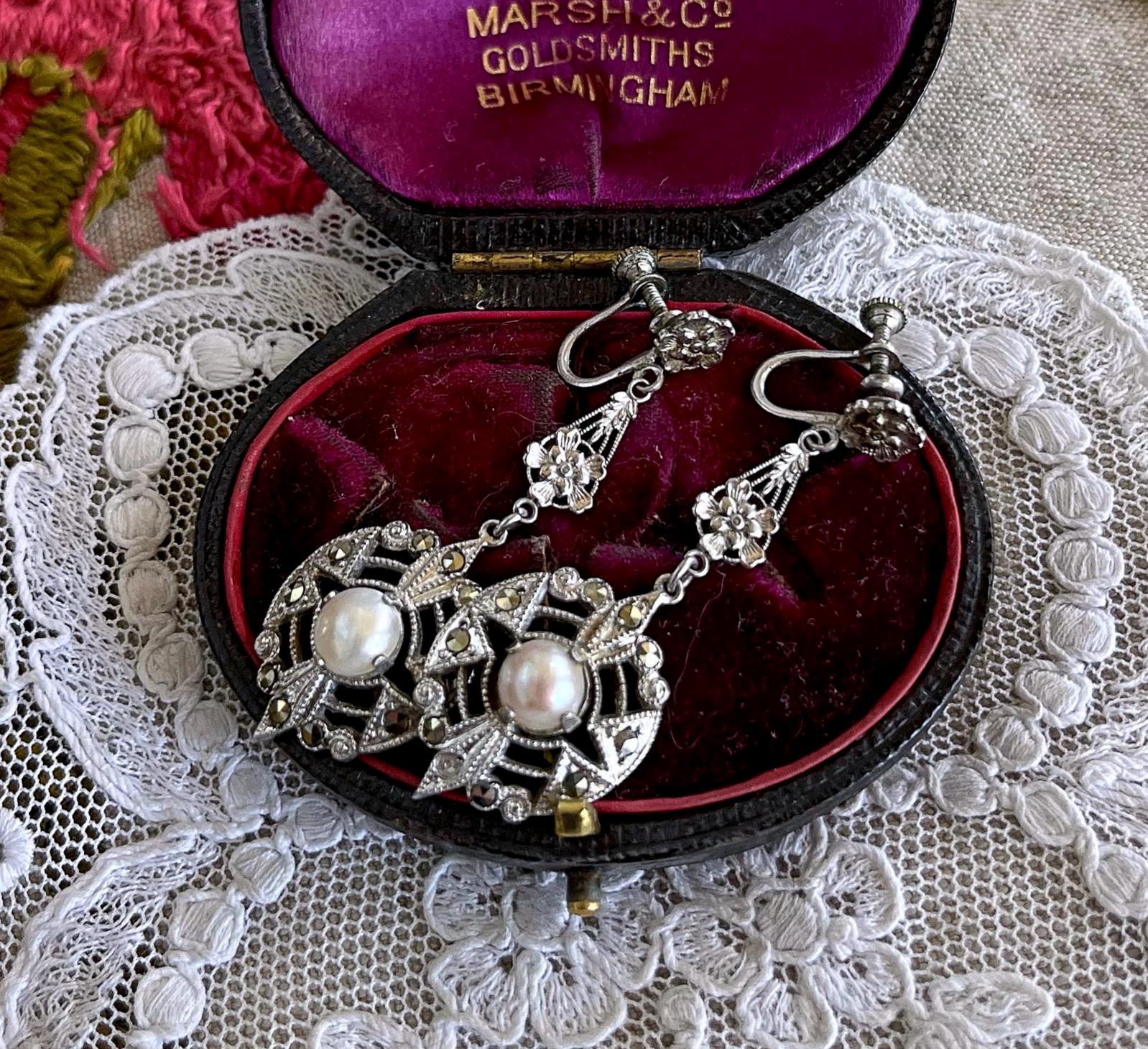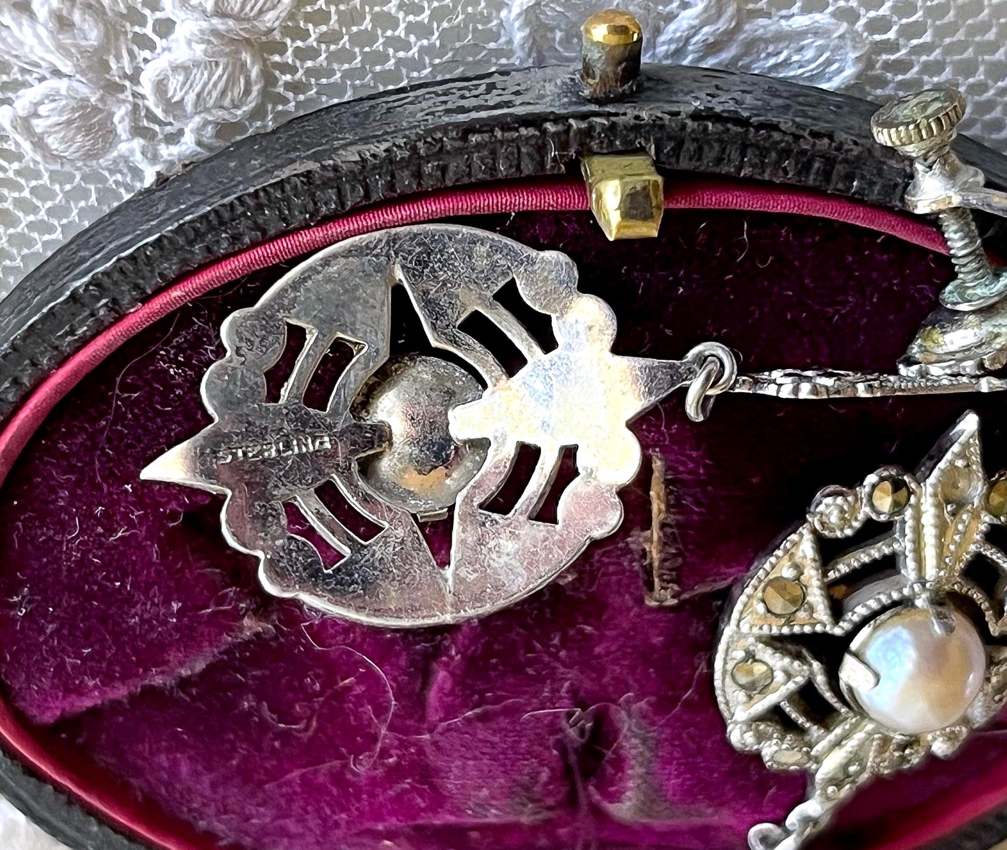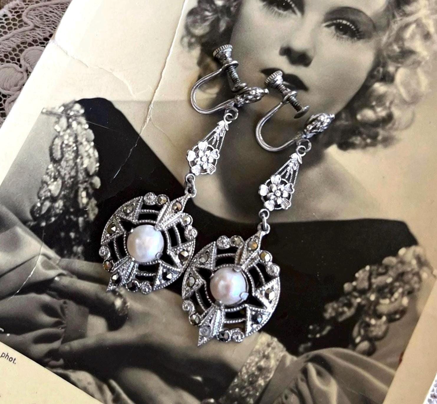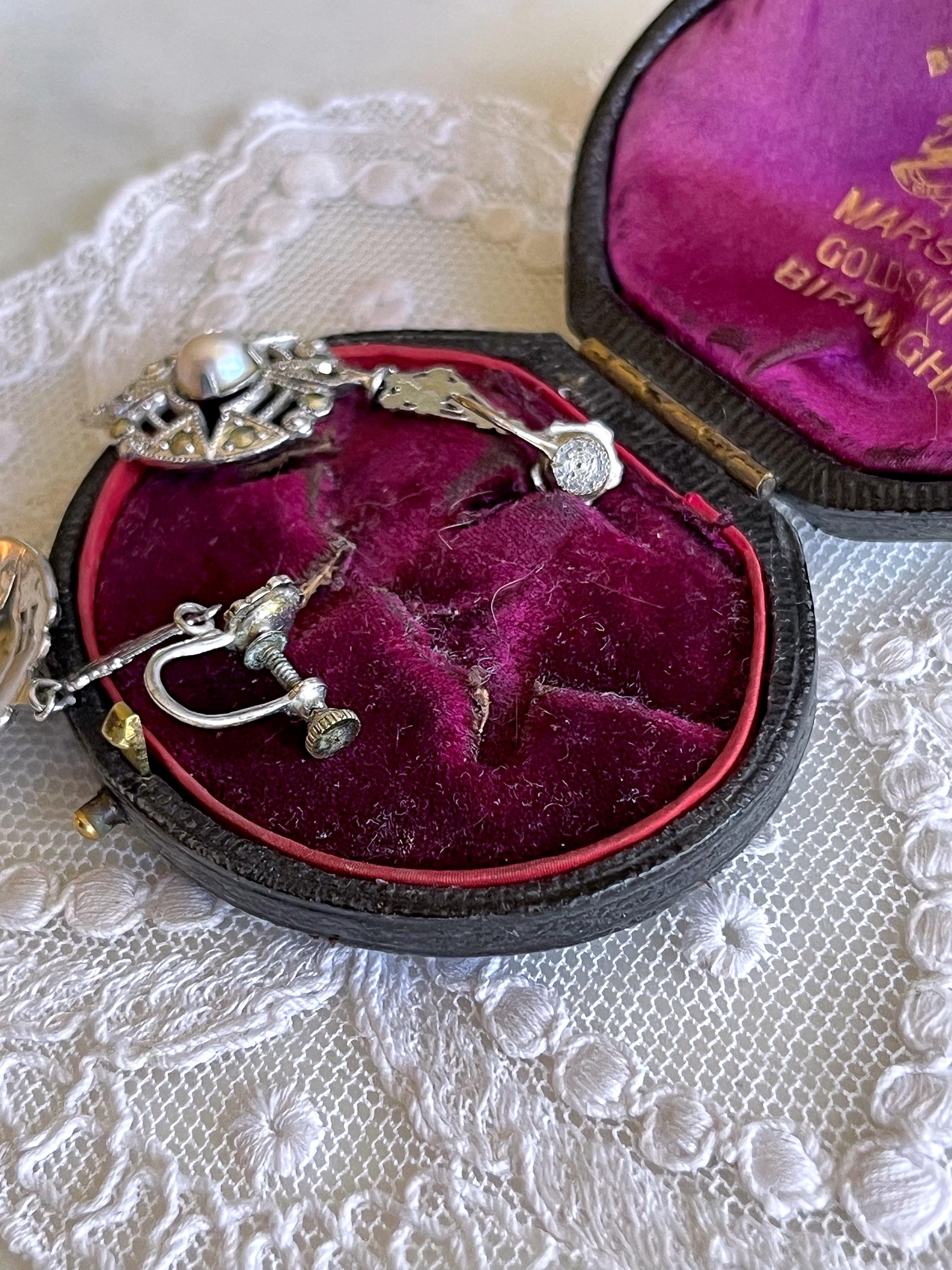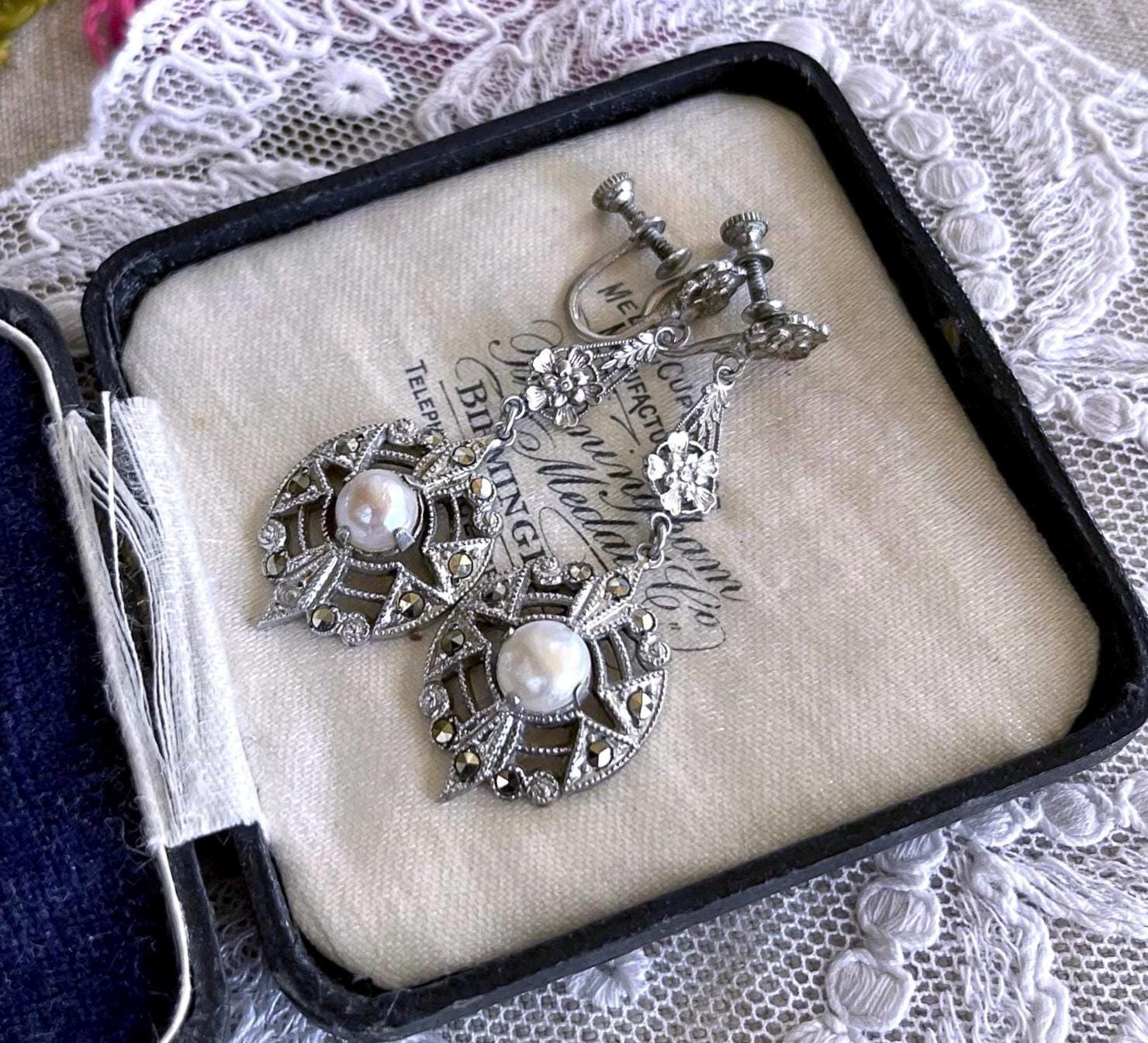 Featuring a fine pair of antique 1900s-1910s Edwardian Belle Époque sterling silver screw back drop earrings adorned with a luminous genuine Cultured Pearl accented with sparkling marcasite crystals set in an intricate closed back settings. Earrings are in excellent antique condition with functional hallmarked clasps and all stones intact and accounted for also stamped in the reverse of drops. Measuring approximately 2 inches long at 5.99 grams respectively these beauties are ready to wear and pass on for generations.