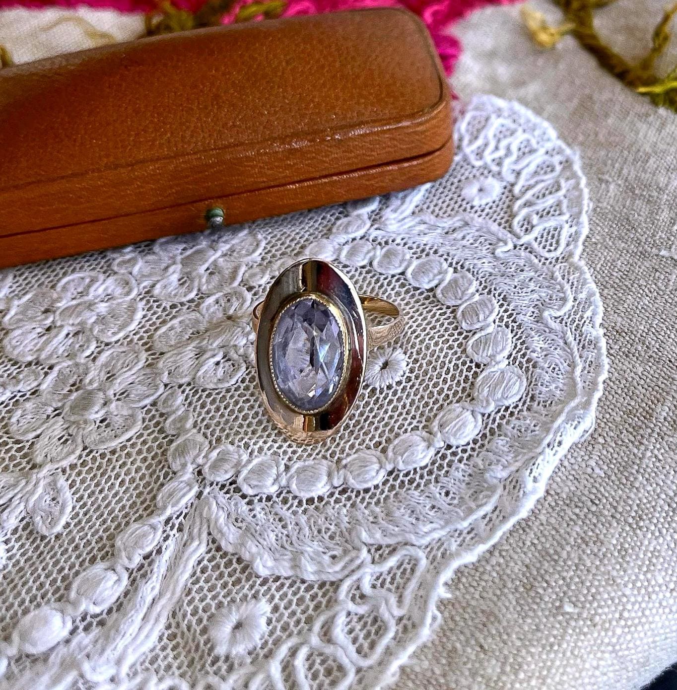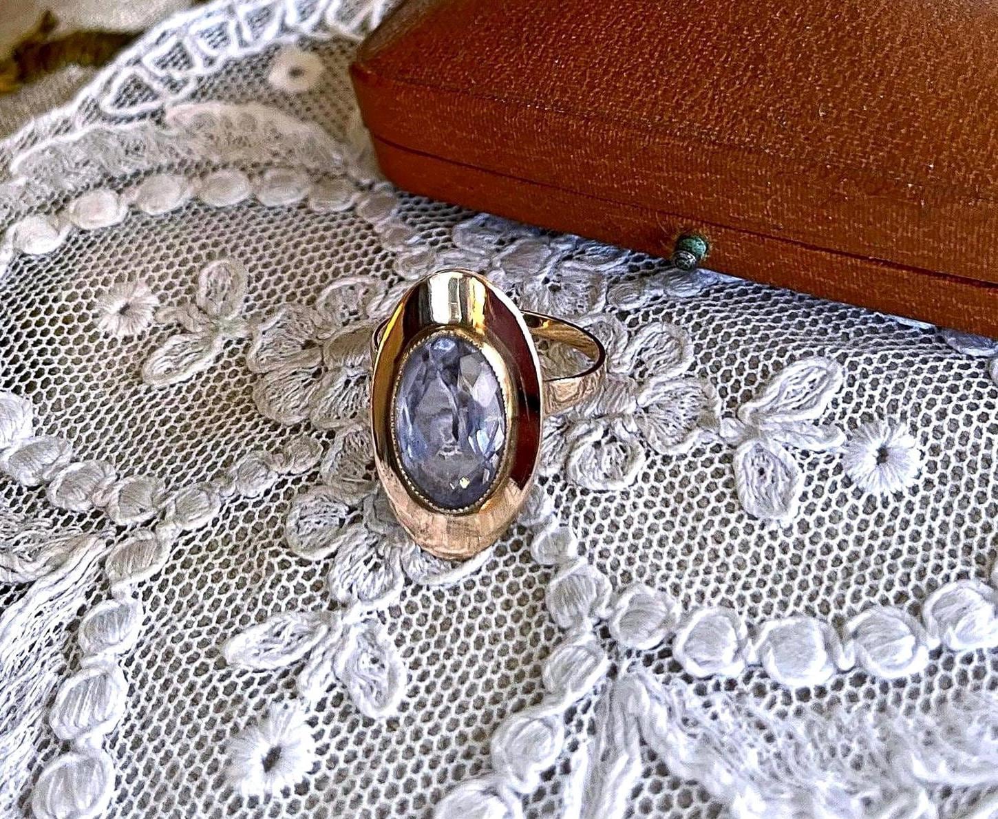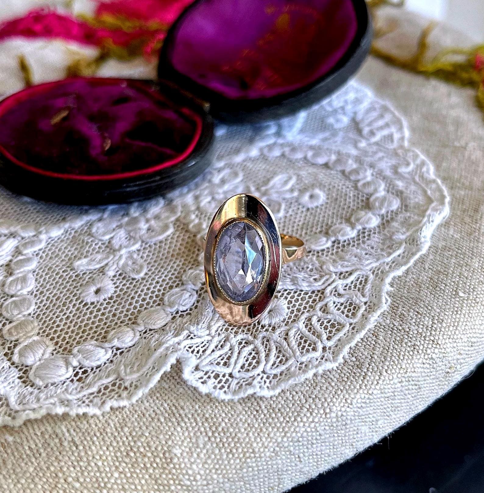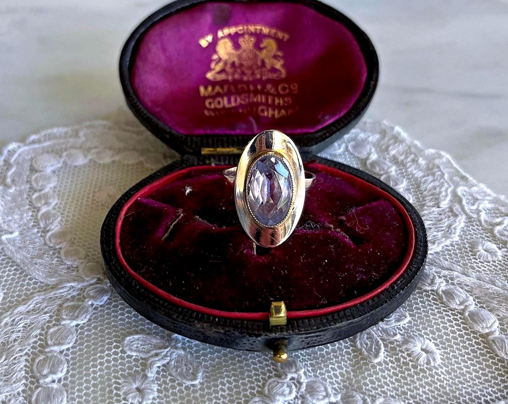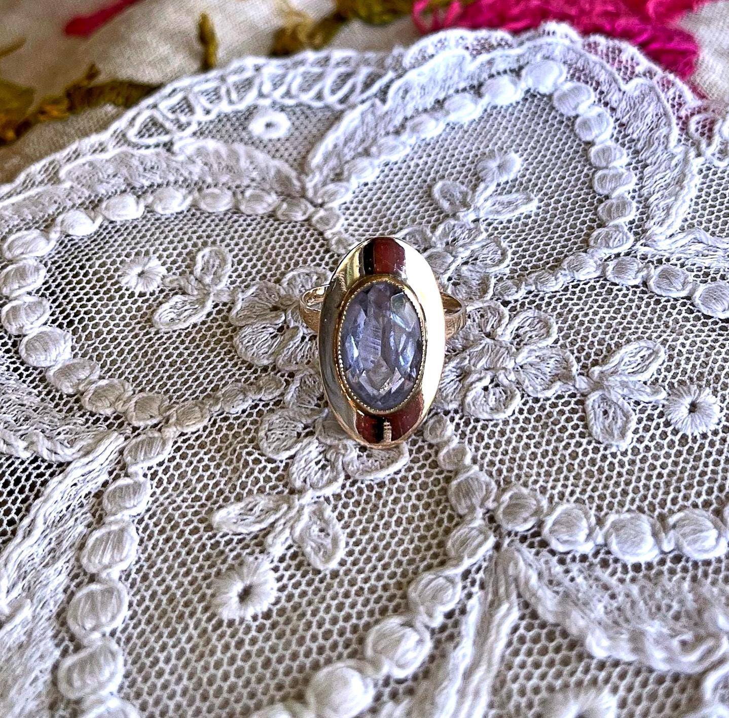 Featuring a wonderful antique 8K 333 gold Cocktail ring adorned with beautiful faceted lilac spinel stone set in a beautiful gold setting. Ring is in beautiful condition with normal wear, stamped 333 on the inside of band with all stones intact and accounted for. Approximately size 7.75 at 3.6 grams respectively this is a collectible wearable Heirloom piece, beautifully designed!