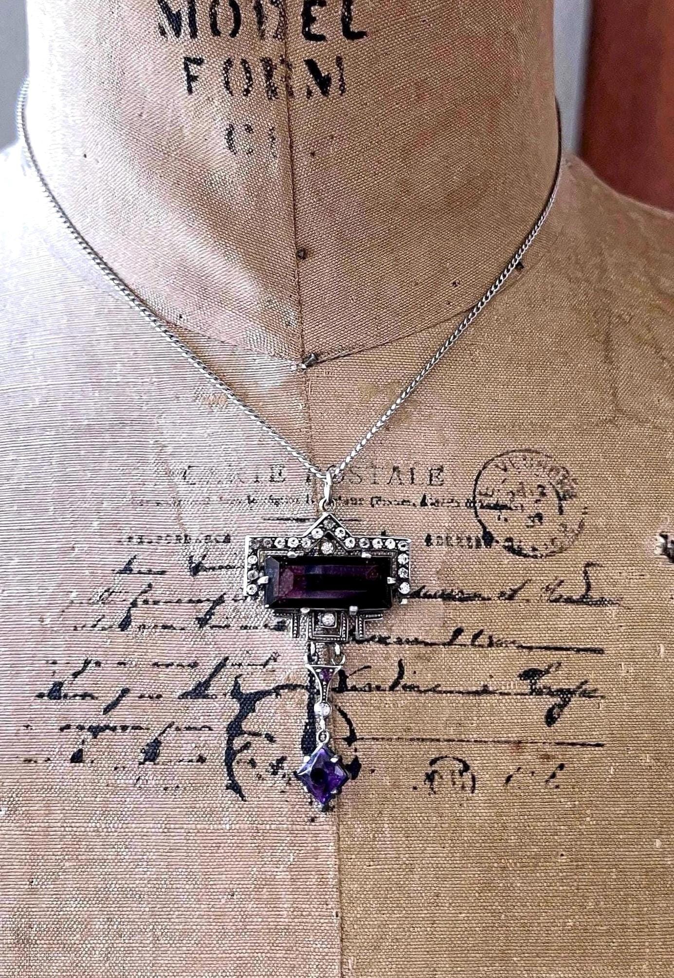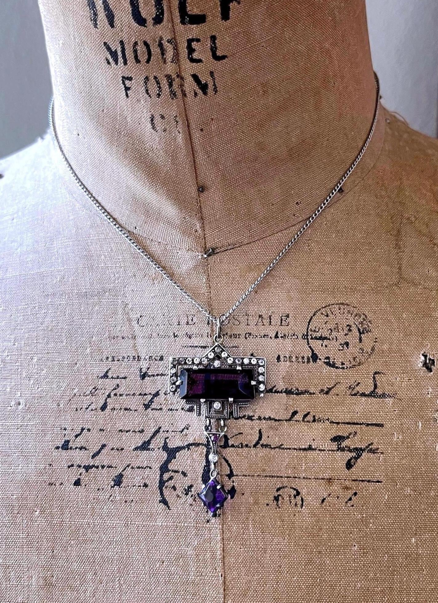 Featuring a lovely antique H&H Hamilton & Hamilton Jr Inc. fine sterling silver pendant necklace adorned with a beautiful Amethyst purple and white Paste Stone crystals set in a decorative Sterling setting. Necklace measures approximately 17 inches around with pendant measuring approximately 2.1 inches at 7.48 grams respectively. This lovely collectible necklace is in excellent antique condition with a functional stamped C spring clasp, a slight patina with all stones intact and accounted for, stamped *H&H/STERLING on the reverse of pendant . Elegant, collectible and wearable, this is a beautifully designed and elegant antique necklace!
