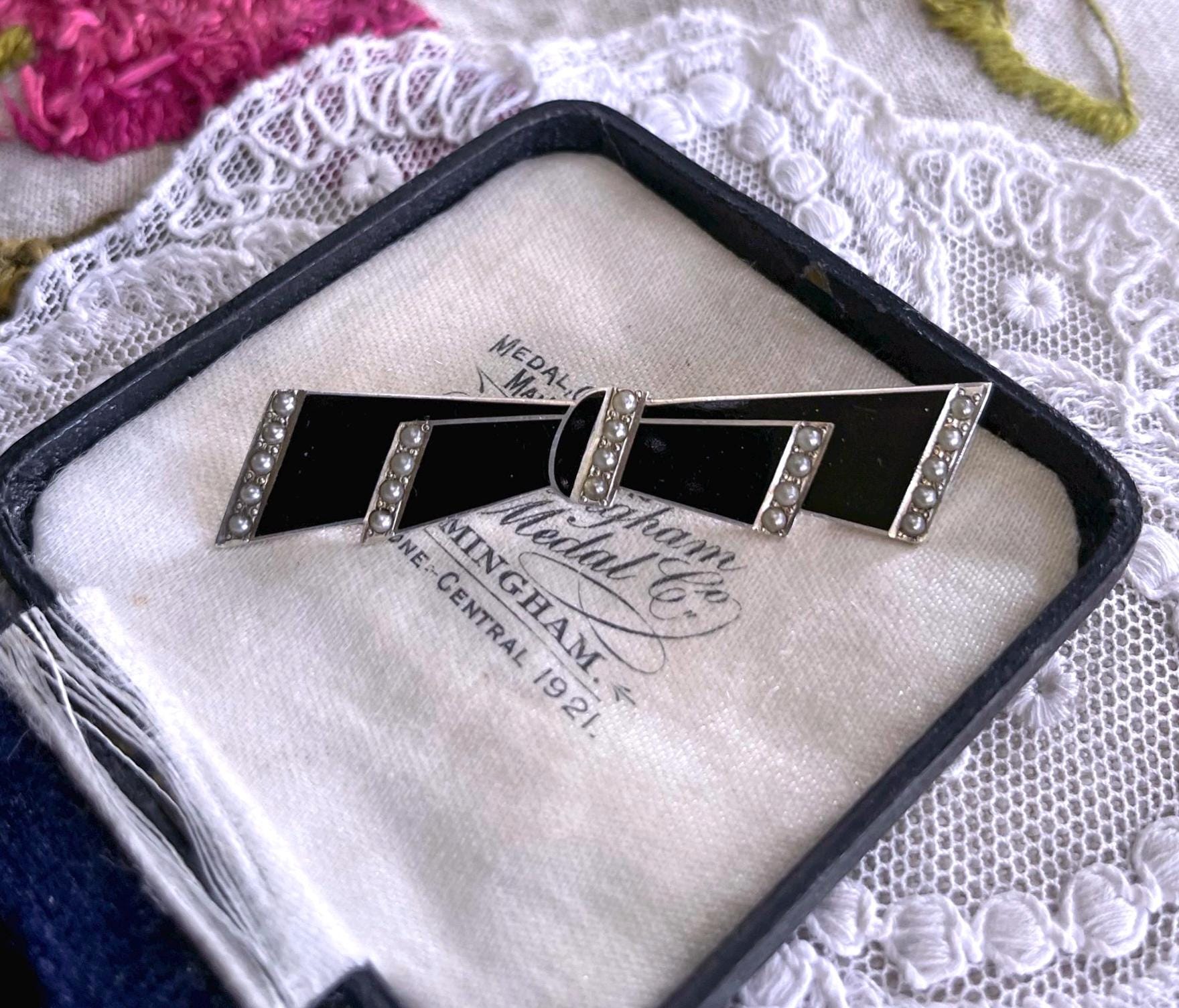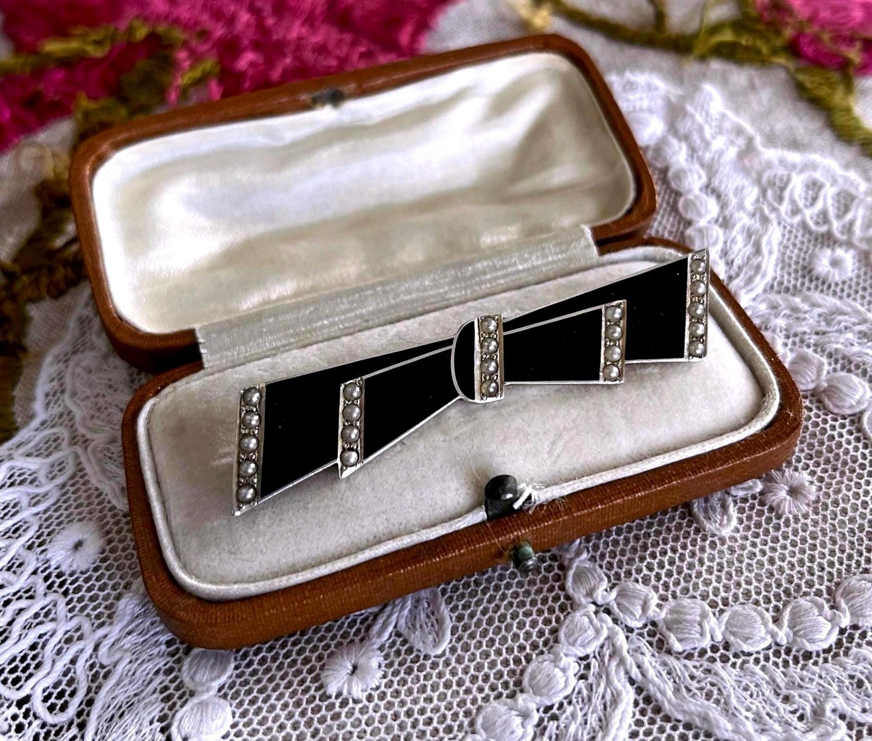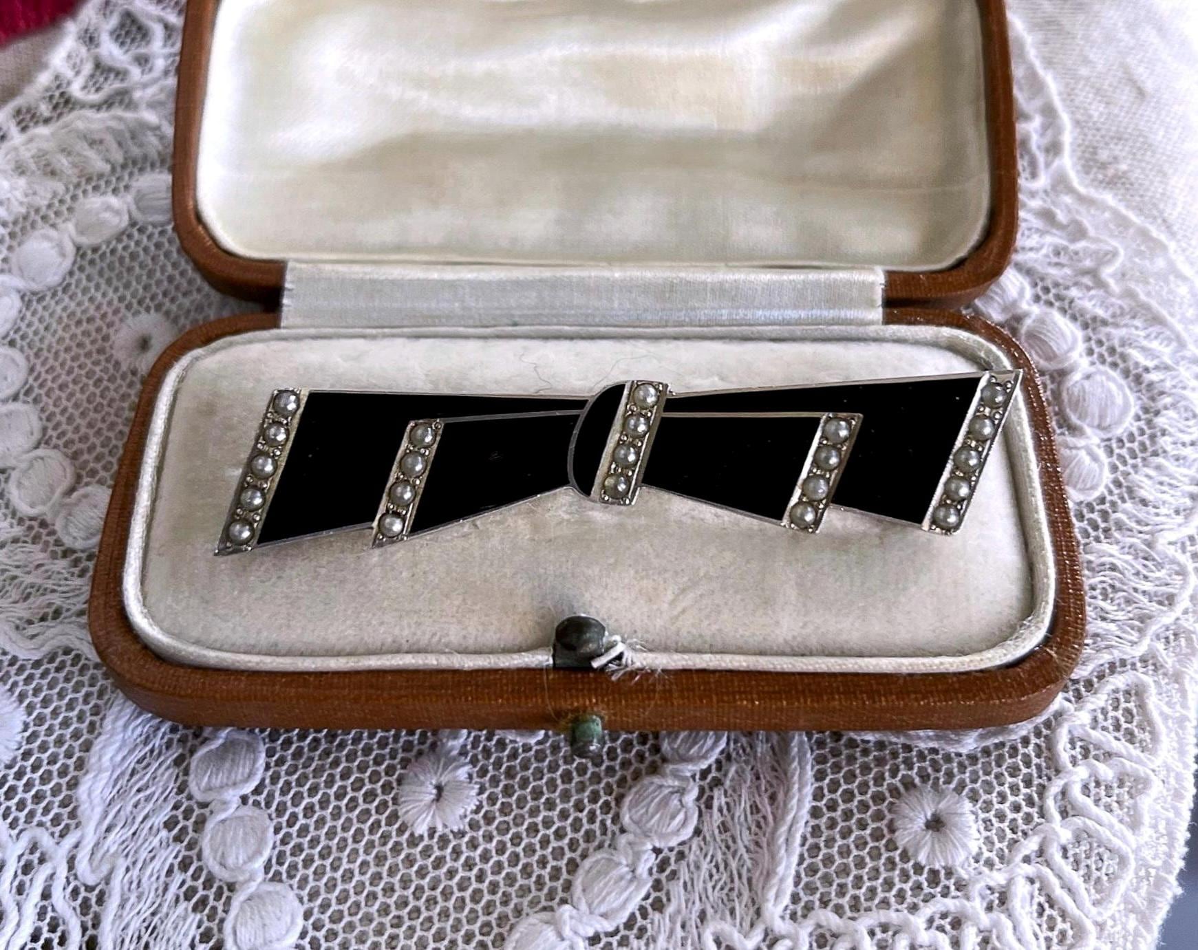 Featuring a fine vintage 1930s Foster and Bailey F&B Art Deco sterling silver Bow brooch adorned with beautiful genuine Seed Pearls accented with black enamel work. This beautiful piece is in excellent condition with a functional clasp, a slight patina with all Pearls accounted for and enamel intact. Brooch measures approximately 2 inches in diameter at 6.57 grams respectively, stamped STERLING F&B on the reverse . Rare and beautifully designed this elegant brooch is ready to wear and pass on for generations.