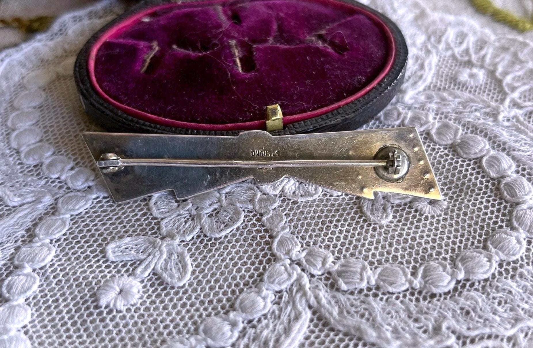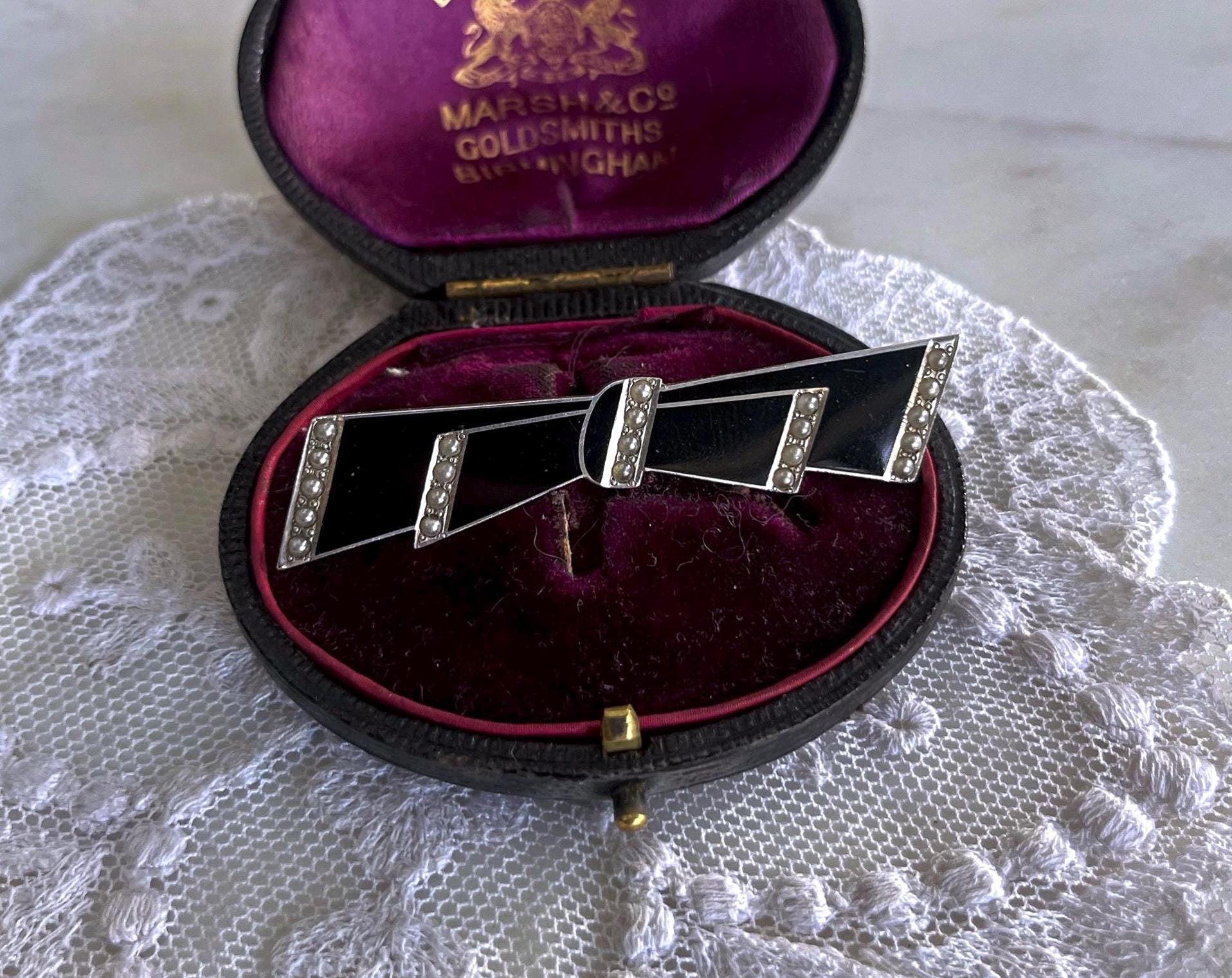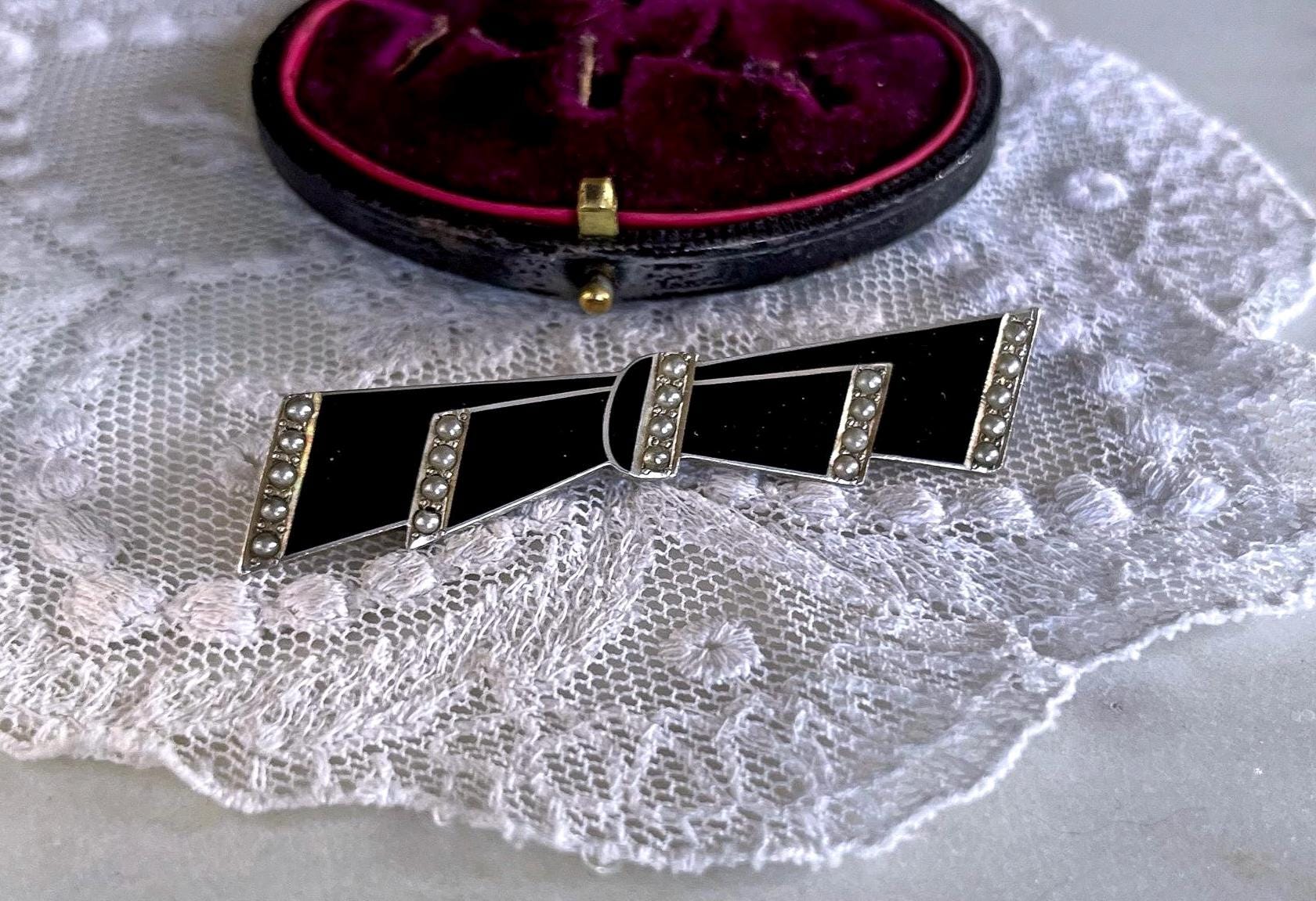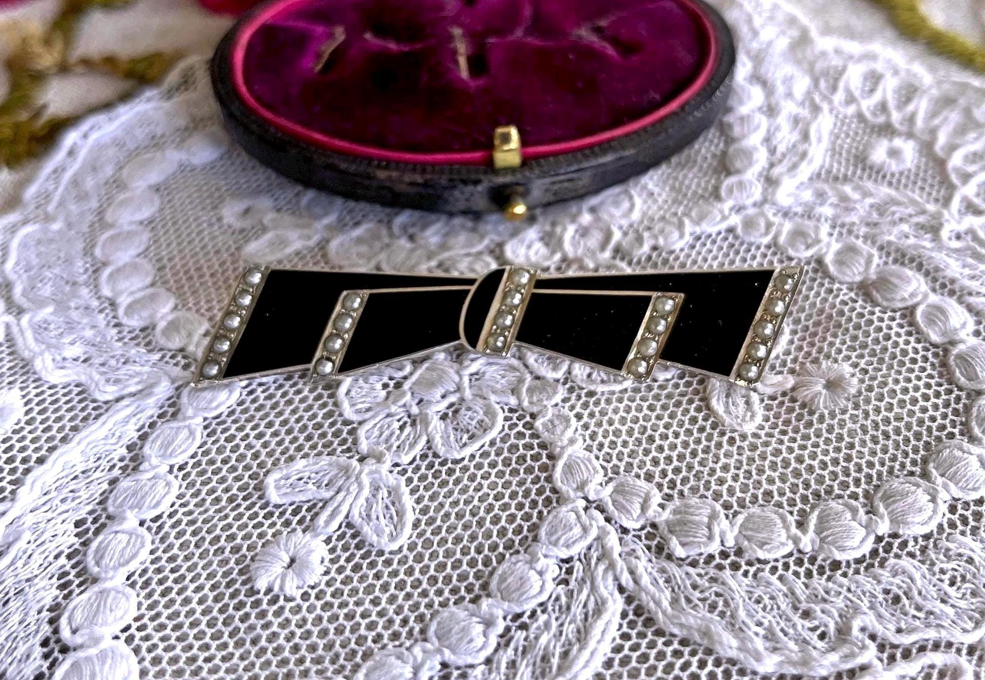Featuring a fine vintage 1930s Foster and Bailey F&B Art Deco sterling silver Bow brooch adorned with beautiful genuine Seed Pearls accented with black enamel work. This beautiful piece is in excellent condition with a functional clasp, a slight patina with all Pearls accounted for and enamel intact. Brooch measures approximately 2 inches in diameter at 6.57 grams respectively, stamped STERLING F&B on the reverse . Rare and beautifully designed this elegant brooch is ready to wear and pass on for generations.