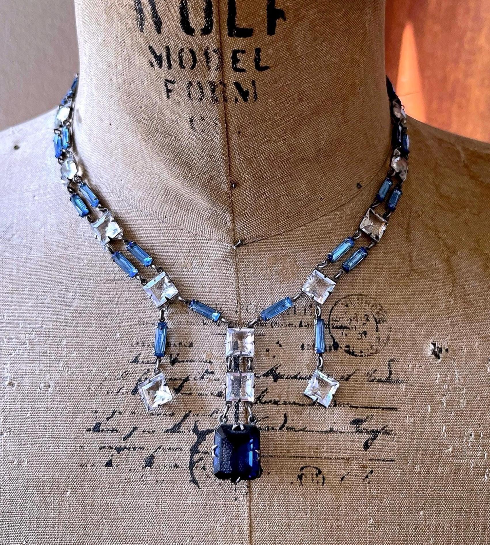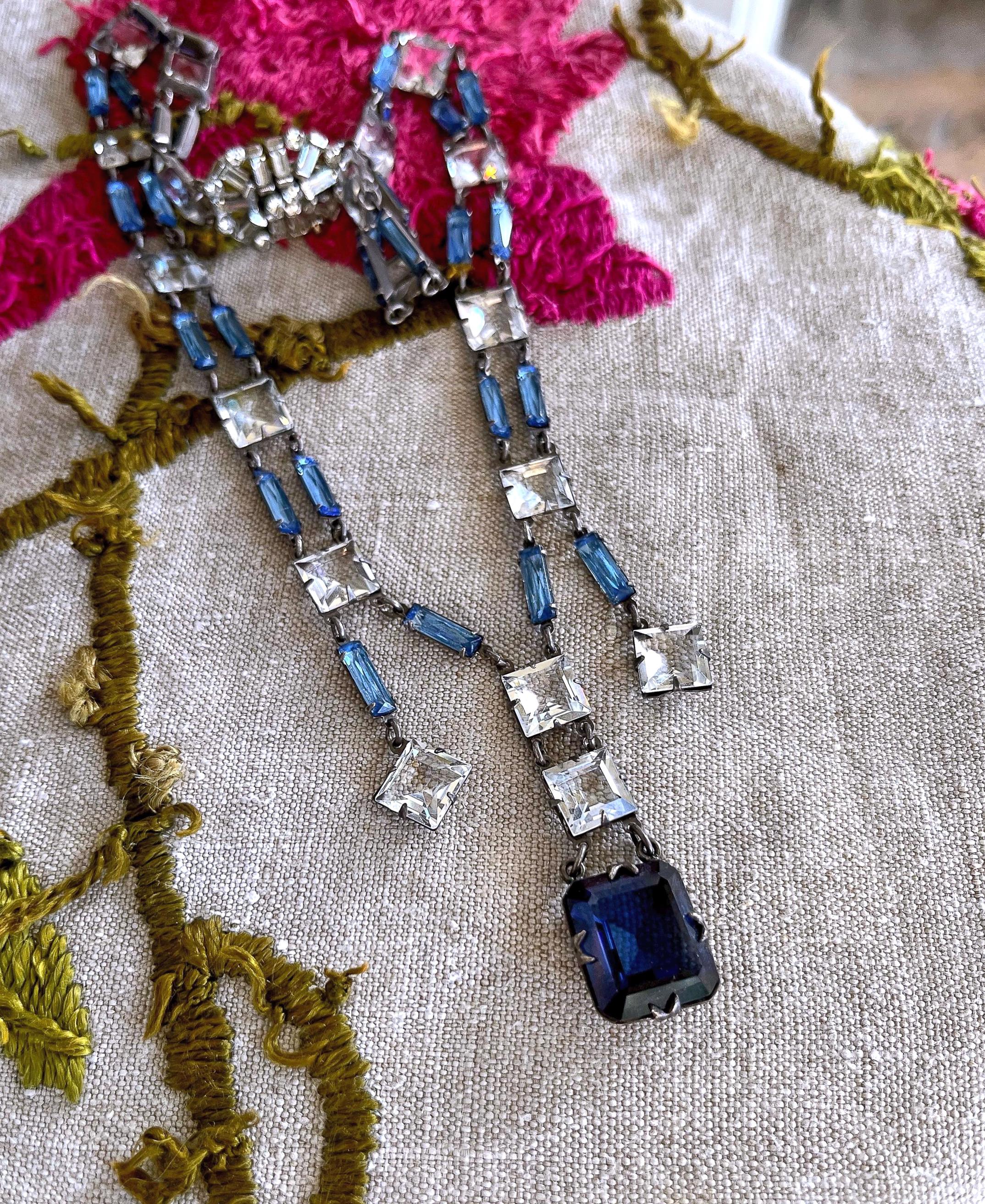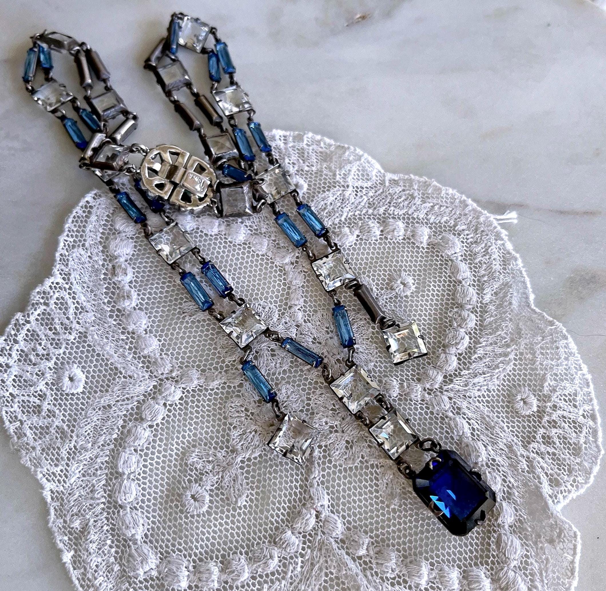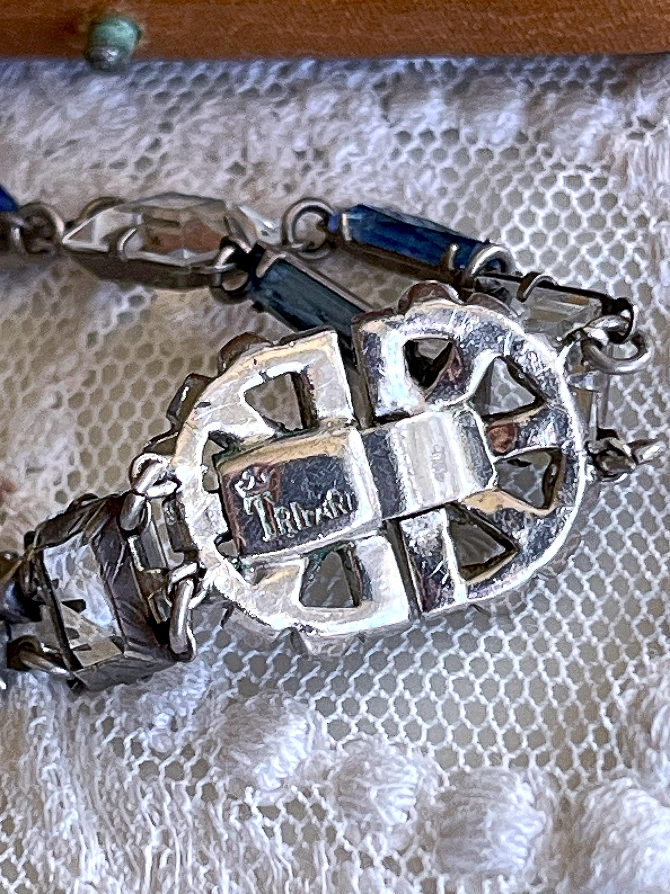 Featuring a rare Crown Trifari 1950s rhodium plated swag necklace adorned with prong set open back blue and white rhinestones. Necklace is in excellent vintage condition with a functional hallmarked slide clasp with all stones accounted for. Hallmarked with crown /Trifari necklace measures approximately 16 inches around with a 1.9 inch pendant drop at 31.5 grams respectively. Rare, beautifully designed and ready to wear!
