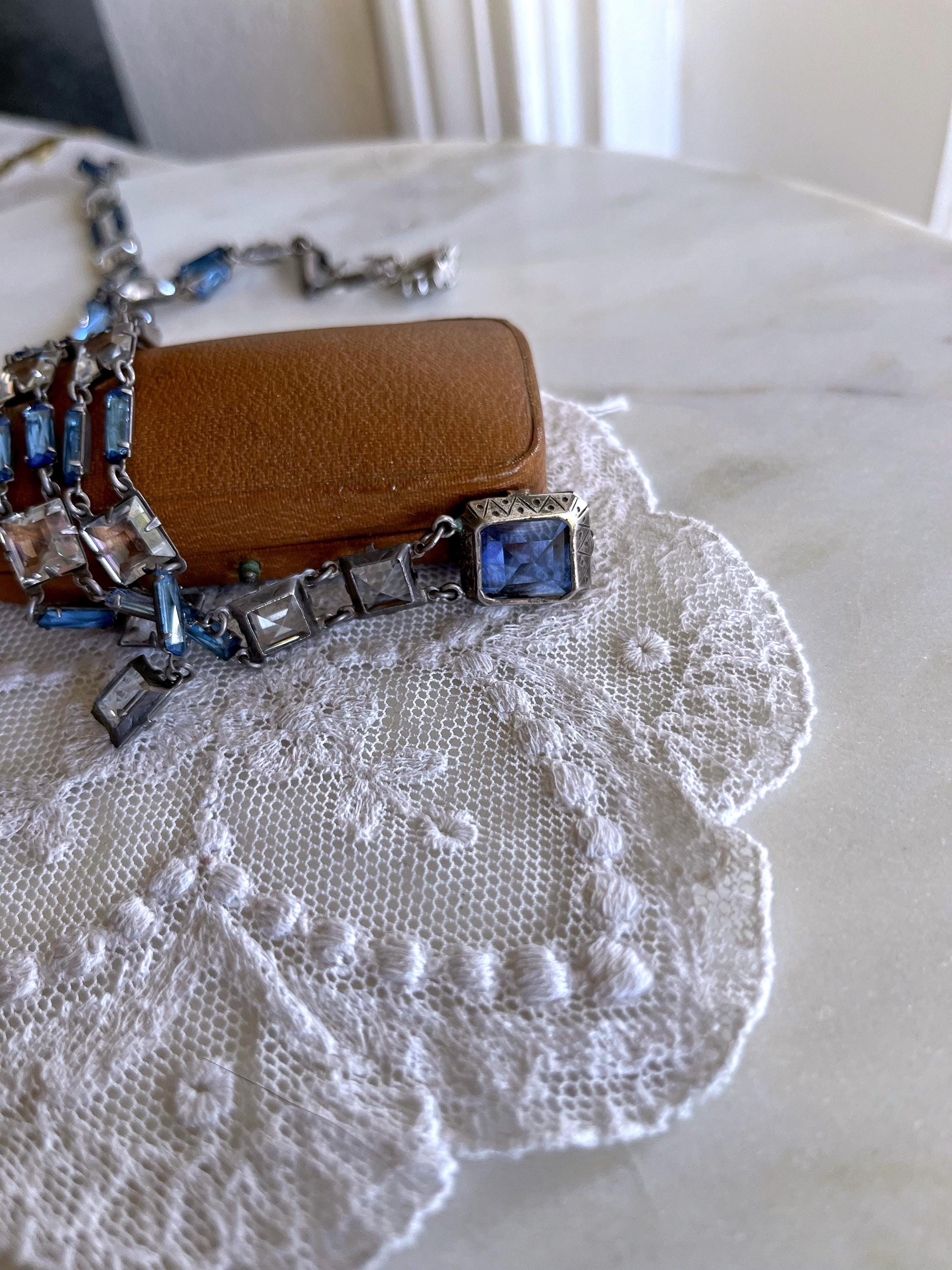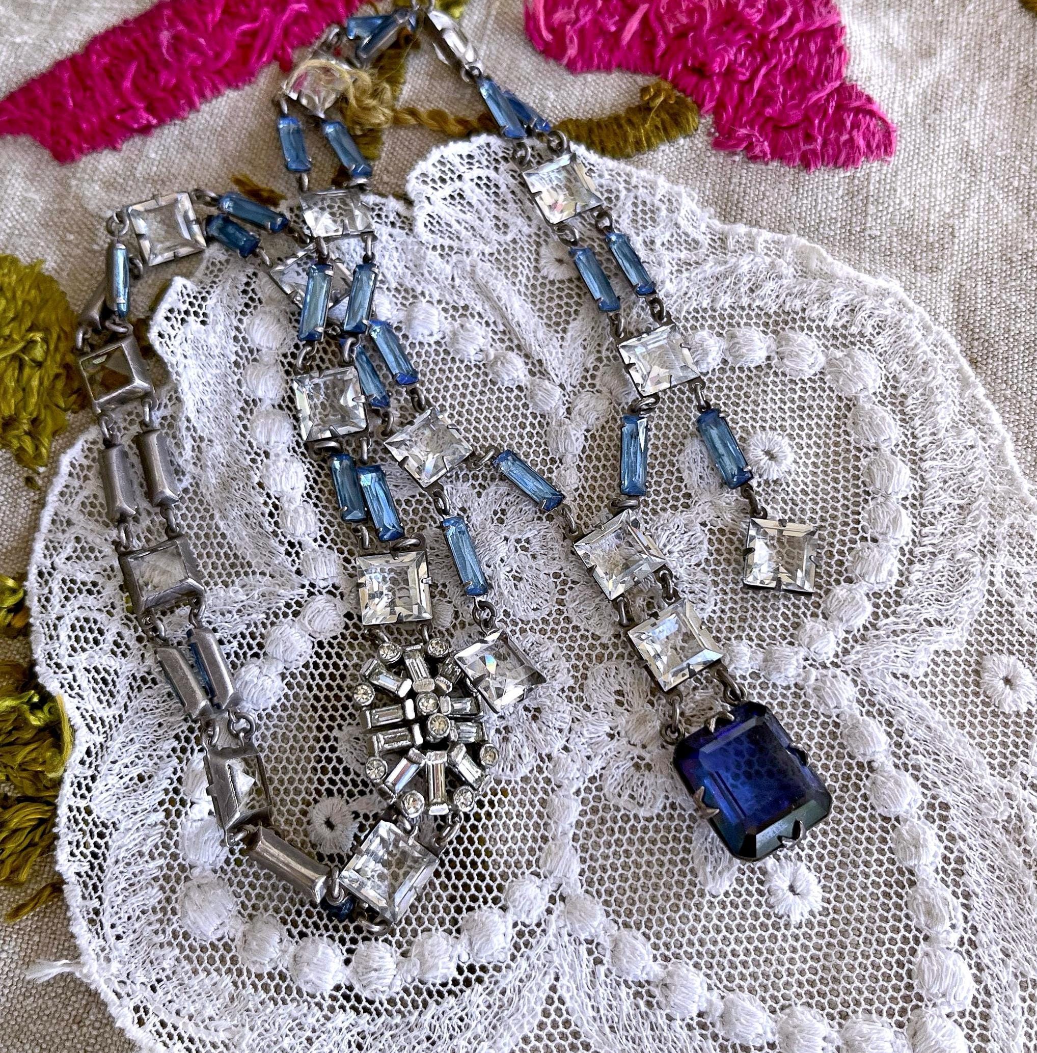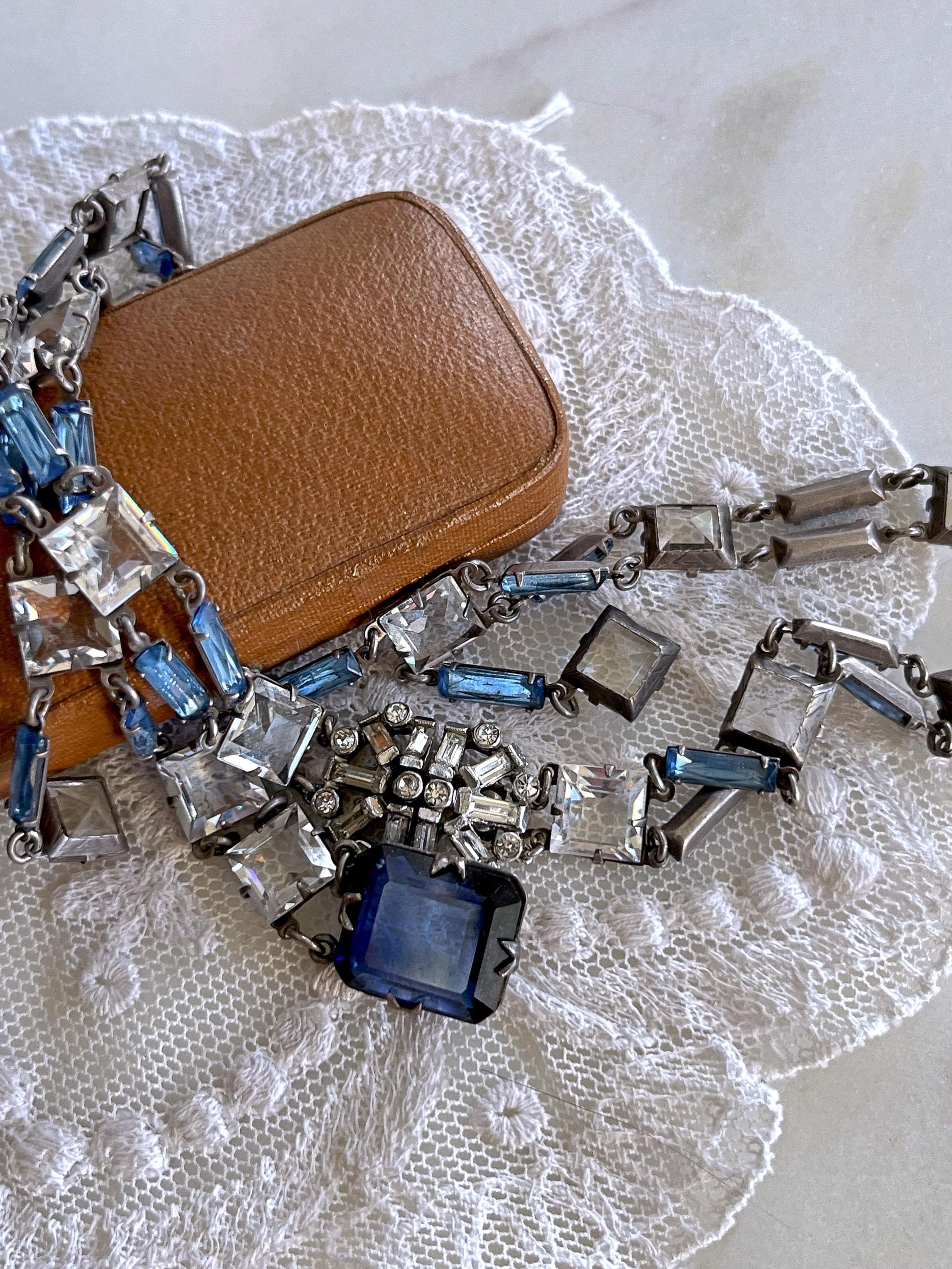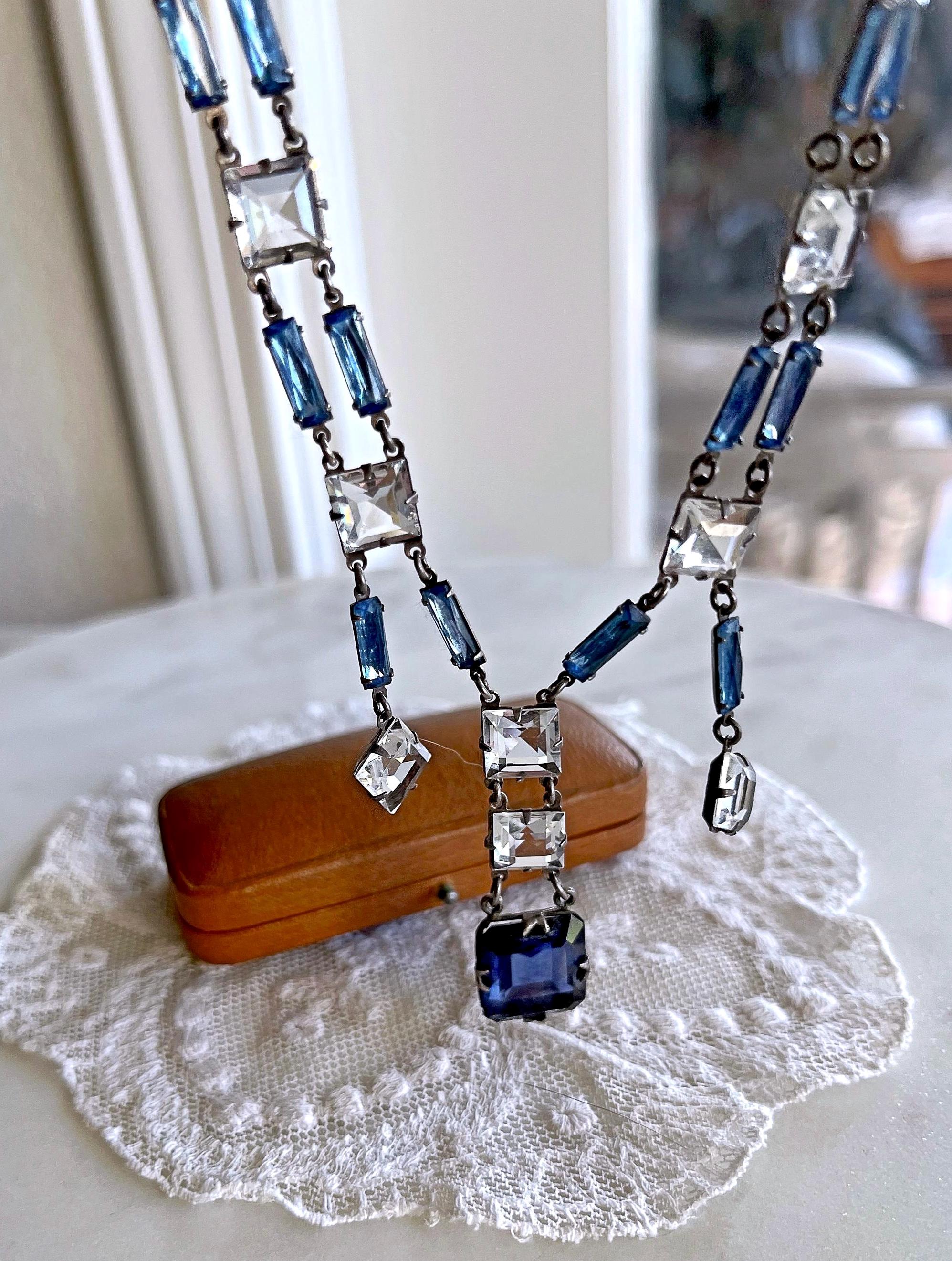 Featuring a rare Crown Trifari 1950s rhodium plated swag necklace adorned with prong set open back blue and white rhinestones. Necklace is in excellent vintage condition with a functional hallmarked slide clasp with all stones accounted for. Hallmarked with crown /Trifari necklace measures approximately 16 inches around with a 1.9 inch pendant drop at 31.5 grams respectively. Rare, beautifully designed and ready to wear!