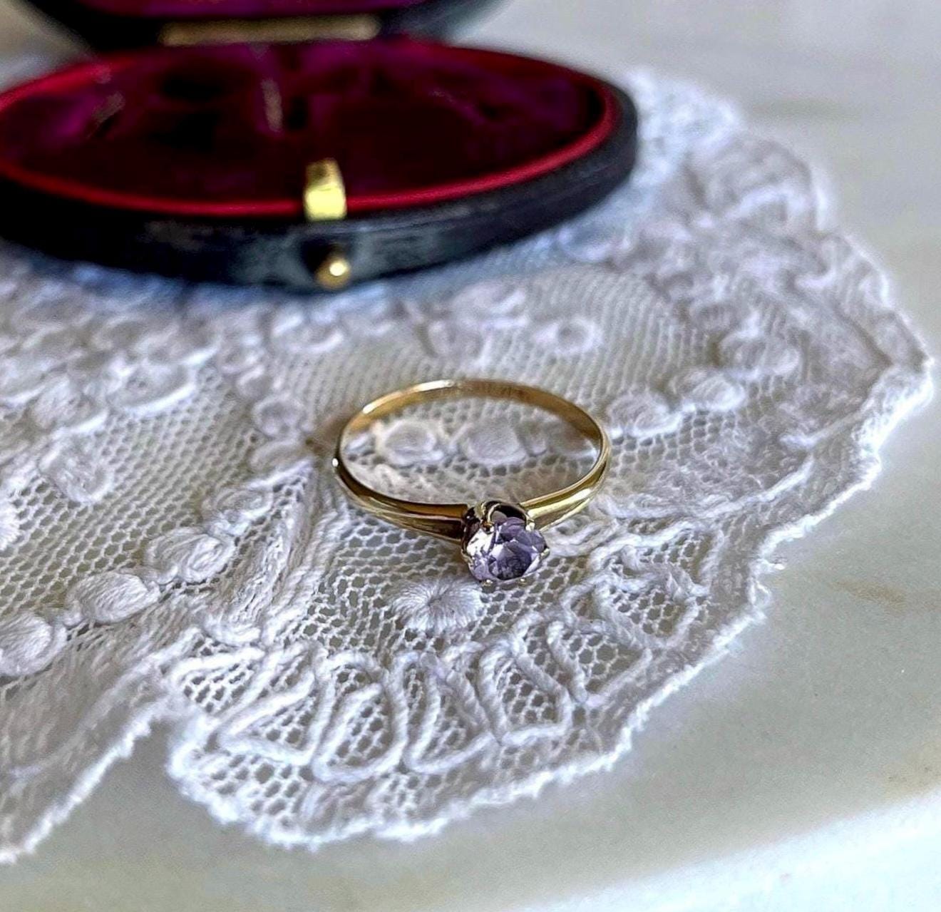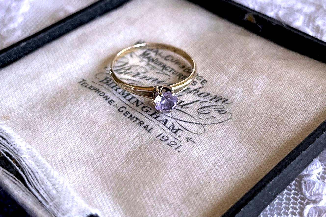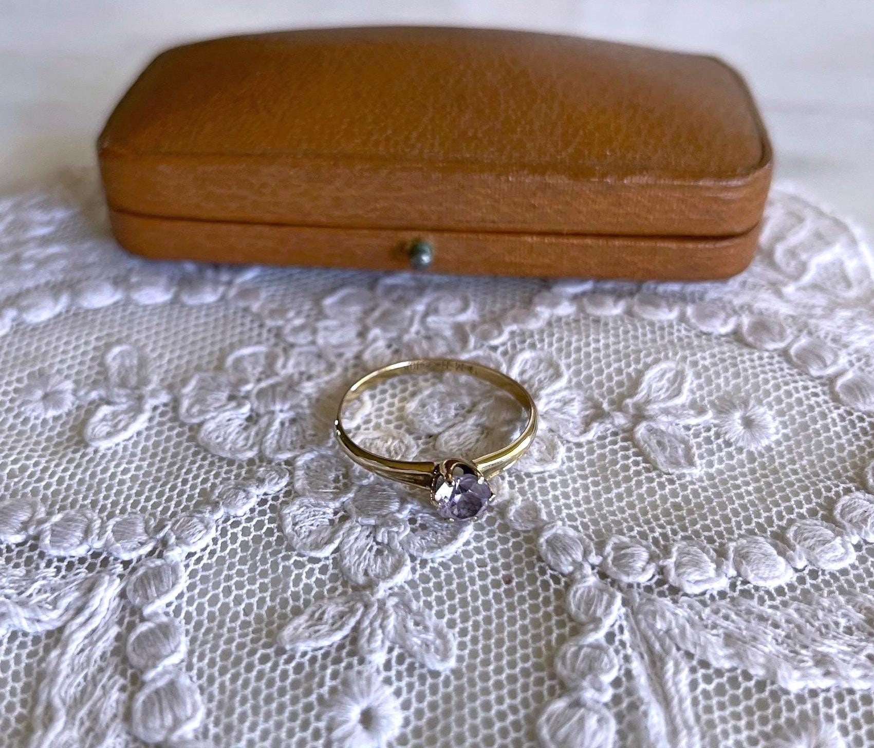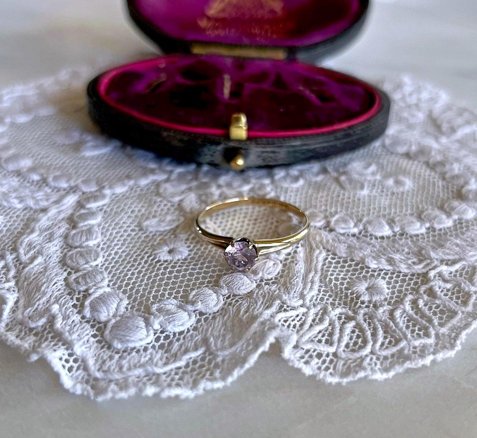 Featuring a brilliant vintage solid 10K yellow gold solitaire ring adorned with a sparkling faceted prong set pale pink CZ stone. Ring is approximately size 7.2 at 1.1 grams respectively and is in excellent vintage condition with normal wear, intact Stone faintly stamped on the inside of band. Beautifully designed this romantic ring sparkles like crazy!
