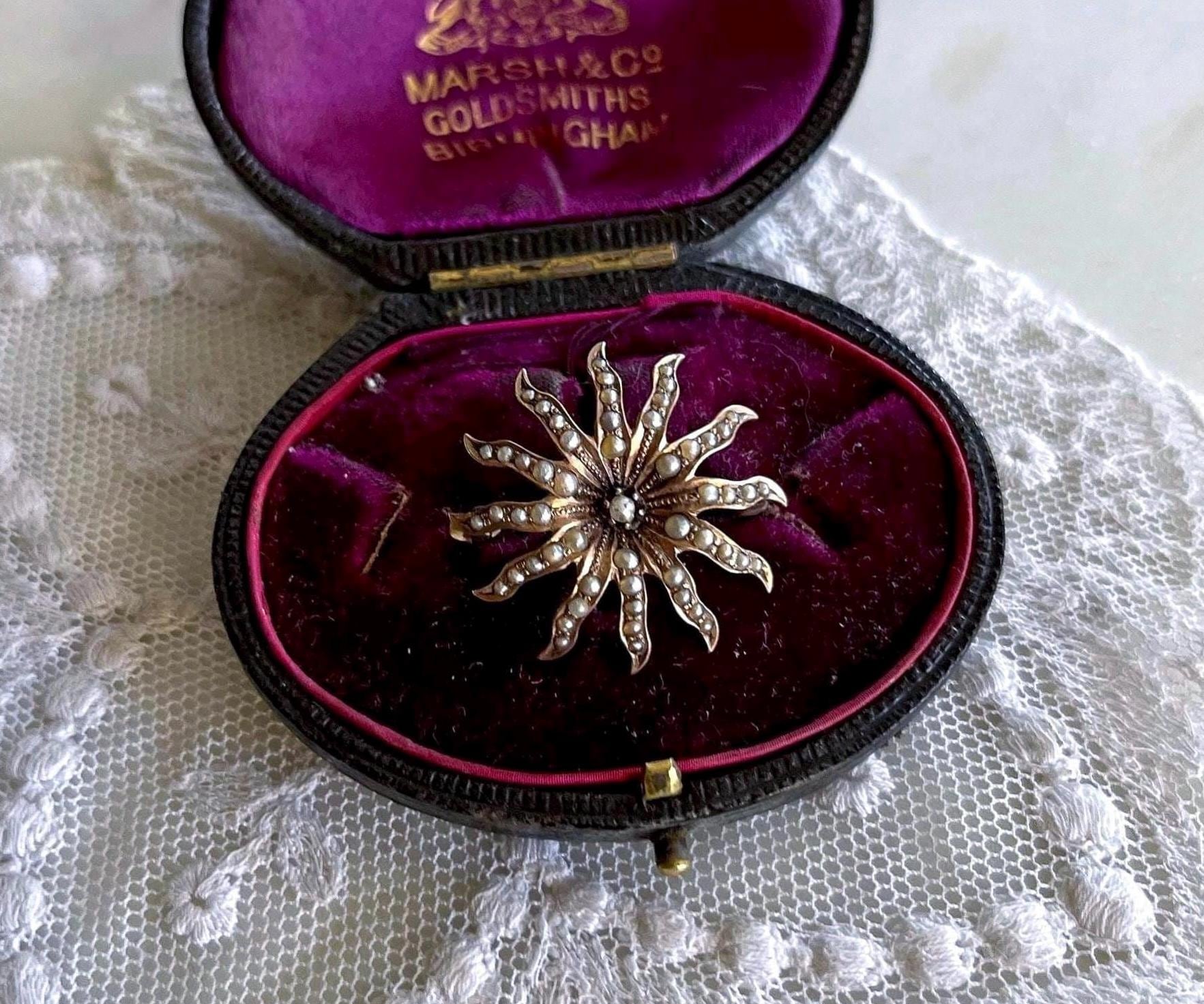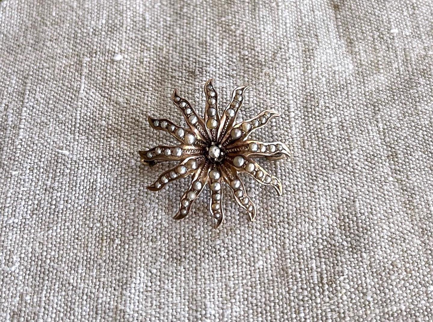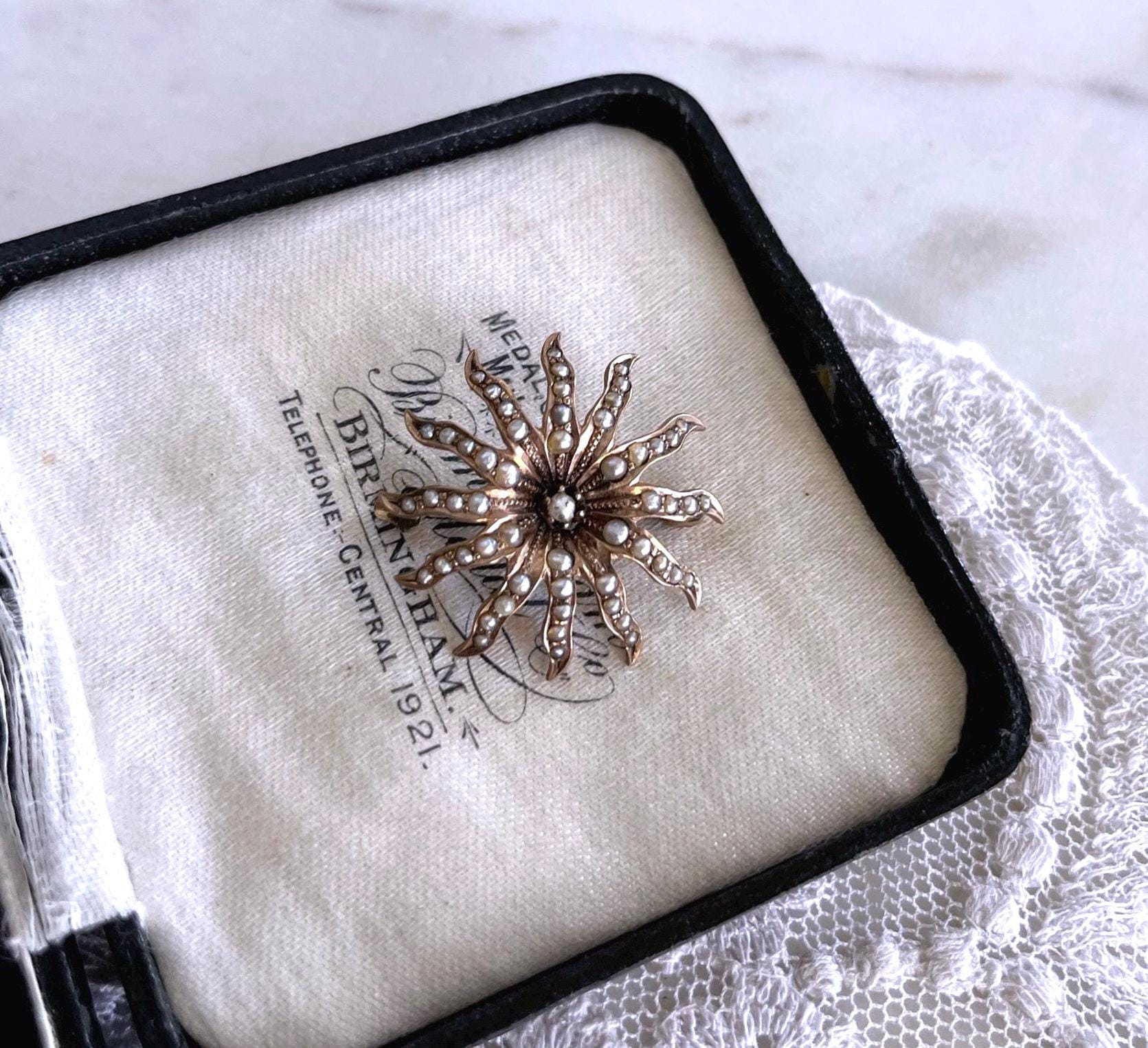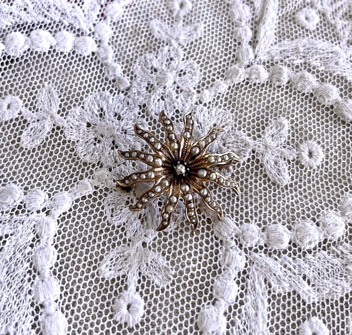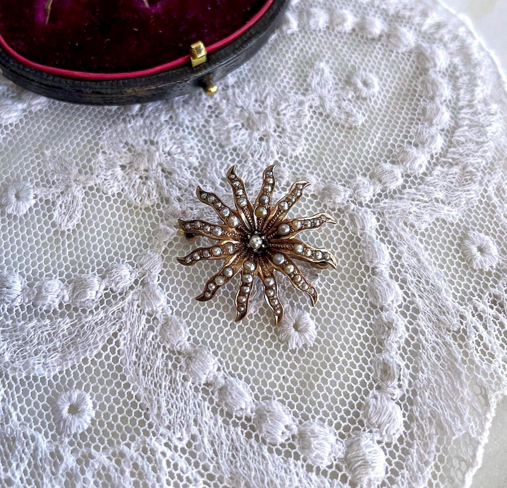 Featuring a lovely antique Victorian 9k yellow gold Starburst brooch accented with genuine Seed Pearls . Brooch measures approximately 1 inch in diameter at 2.98 grams and is in fine condition with intact and functional hinged C clasp, with all pearls intact and accounted for, unsigned and tested as 9k gold. This is a beautiful antique feminine piece, delicately handcrafted and collectible!