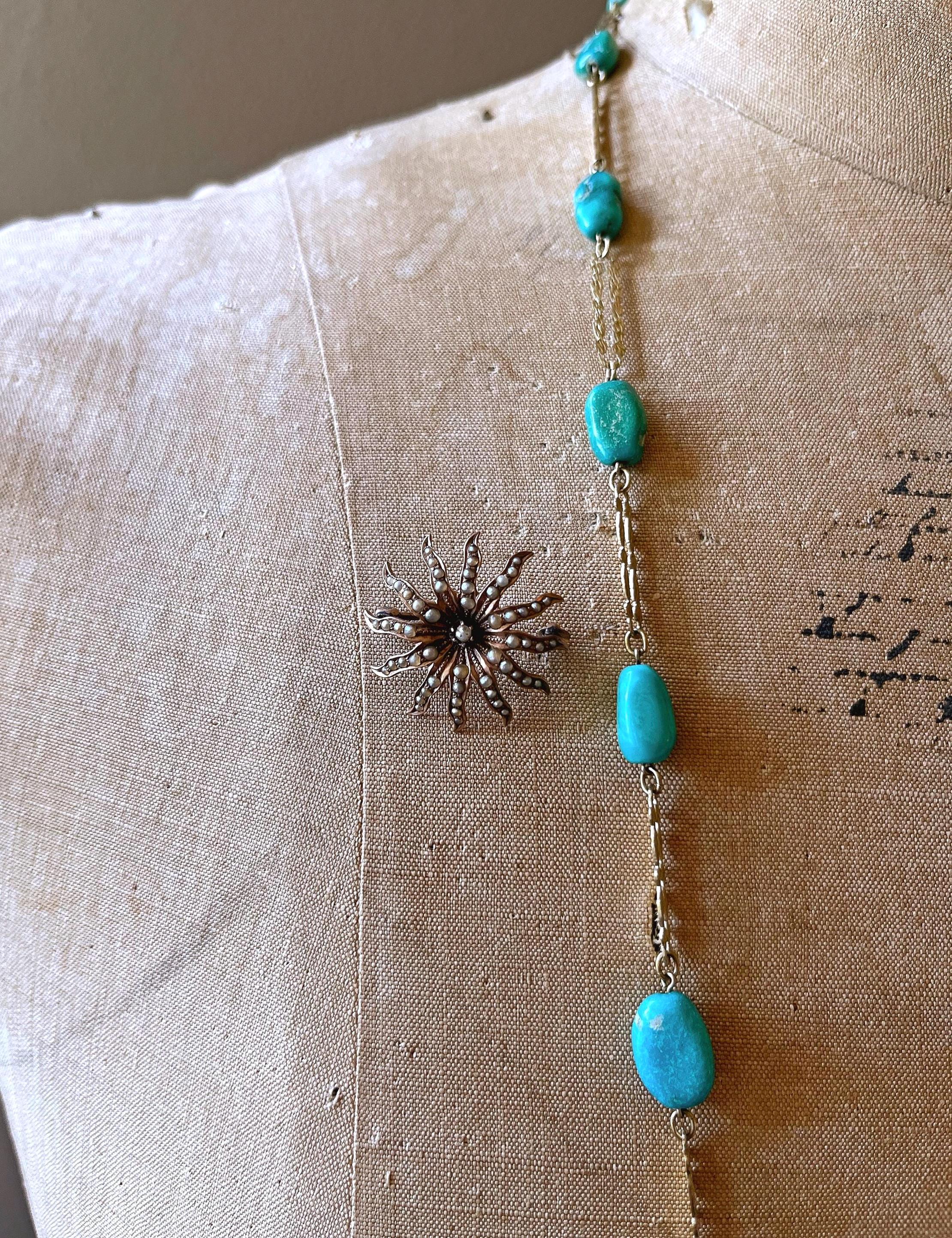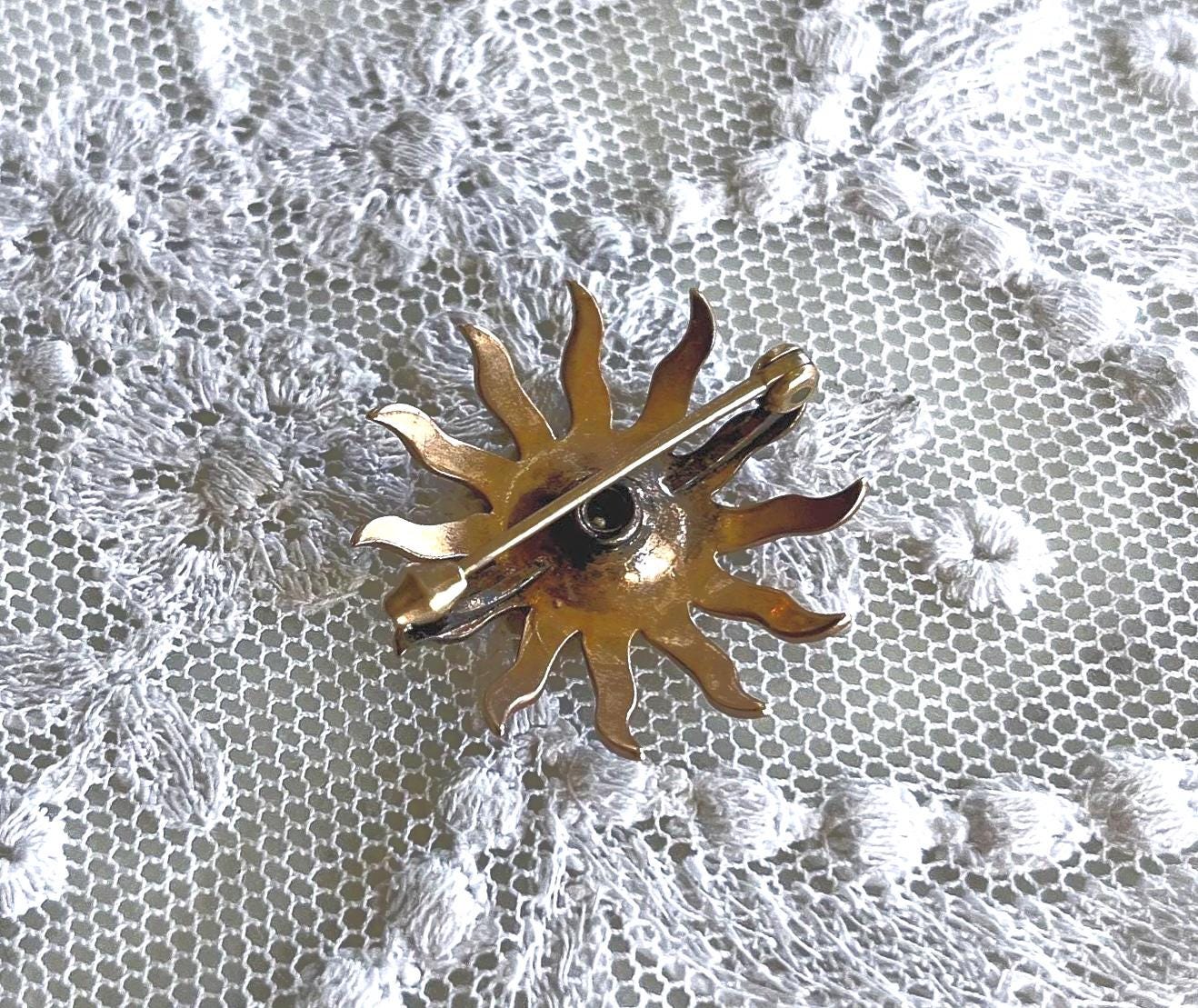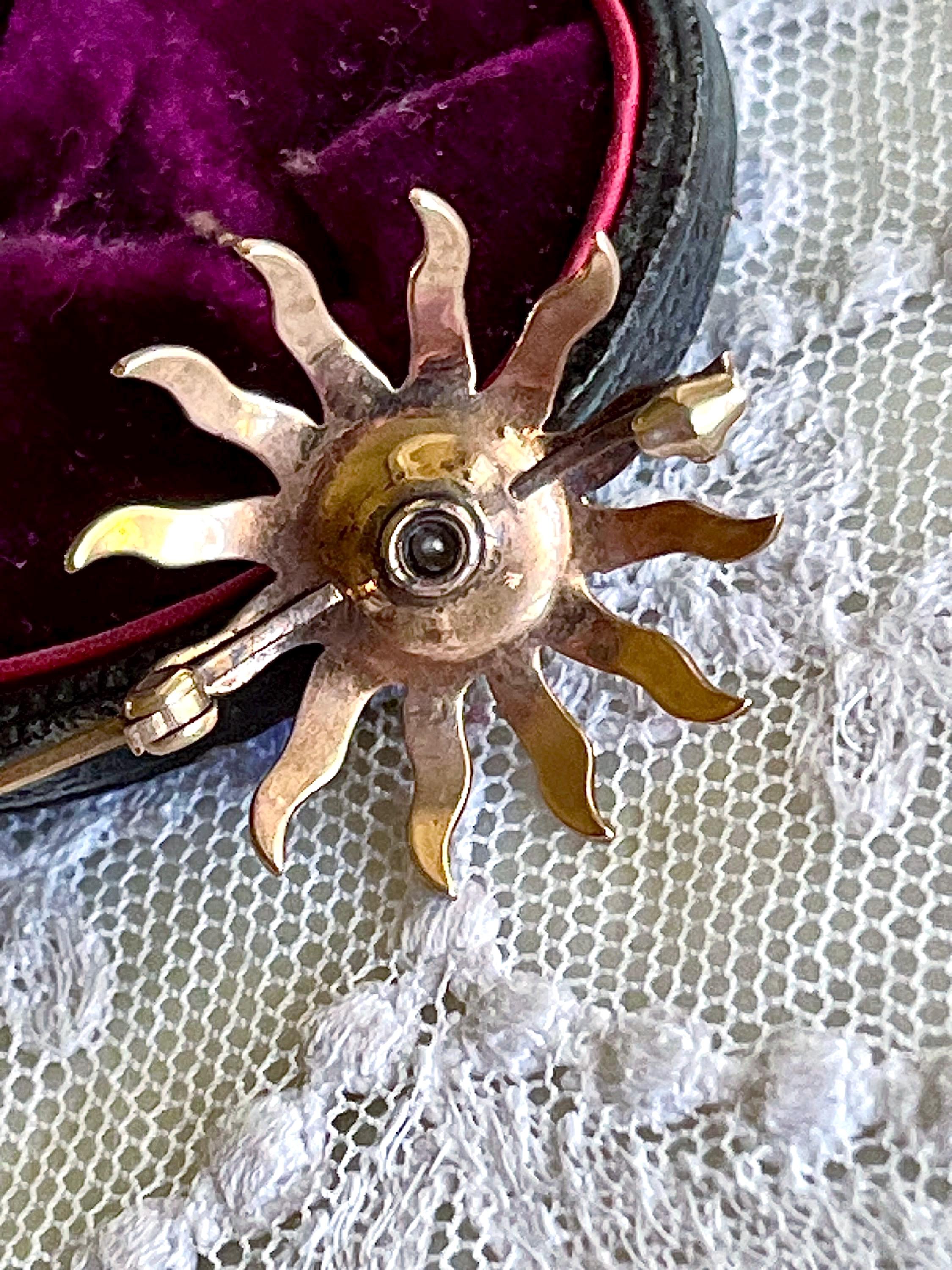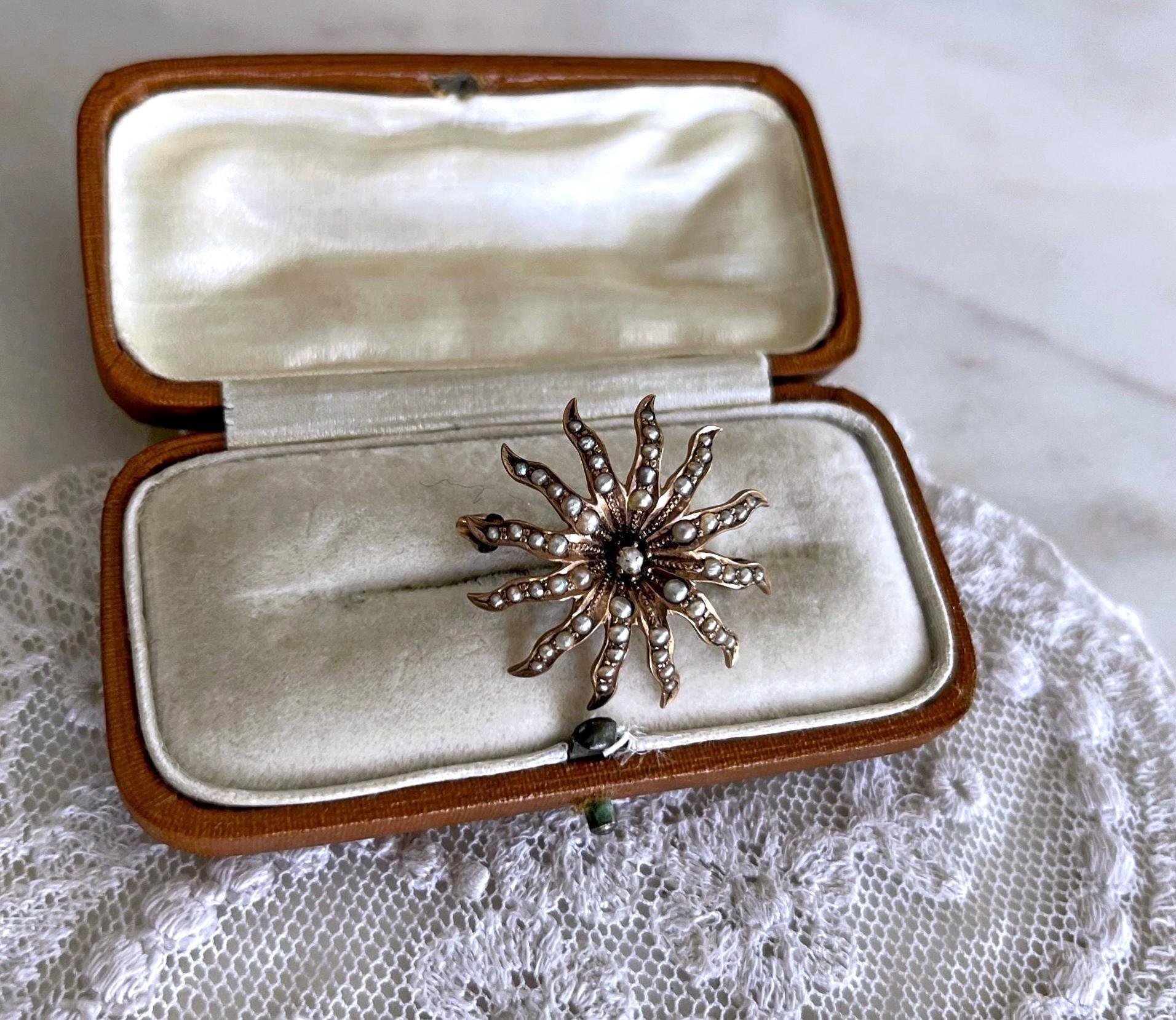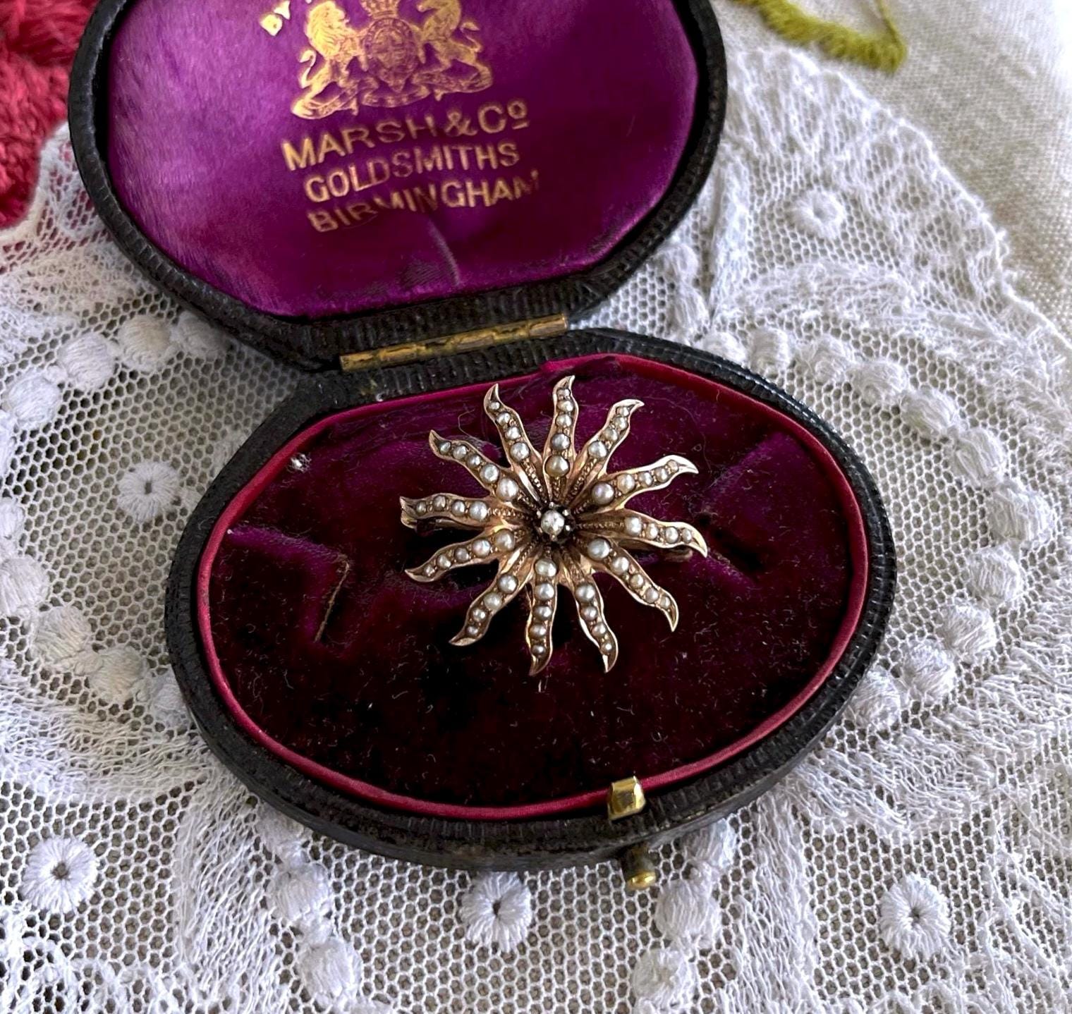 Featuring a lovely antique Victorian 9k yellow gold Starburst brooch accented with genuine Seed Pearls . Brooch measures approximately 1 inch in diameter at 2.98 grams and is in fine condition with intact and functional hinged C clasp, with all pearls intact and accounted for, unsigned and tested as 9k gold. This is a beautiful antique feminine piece, delicately handcrafted and collectible!