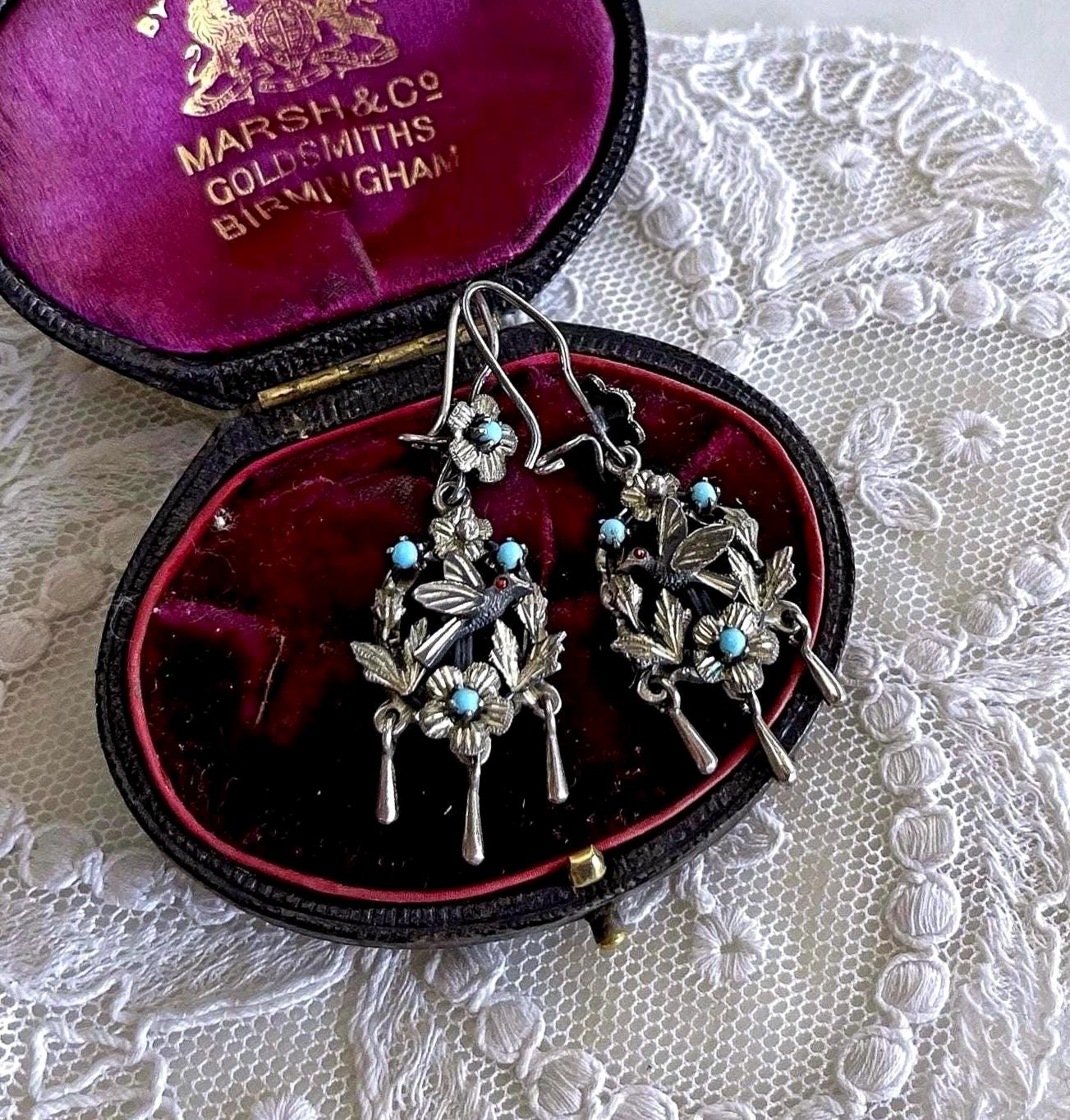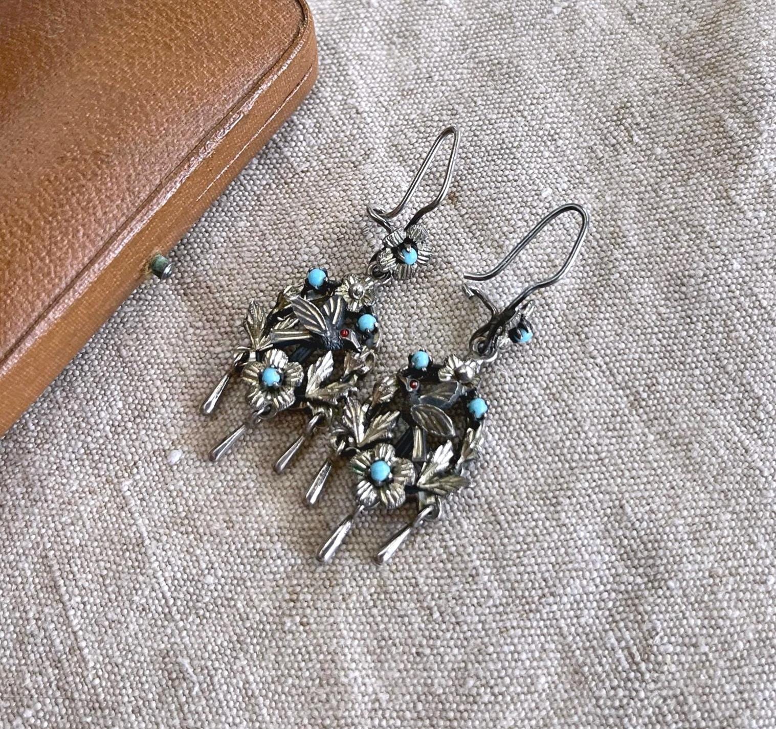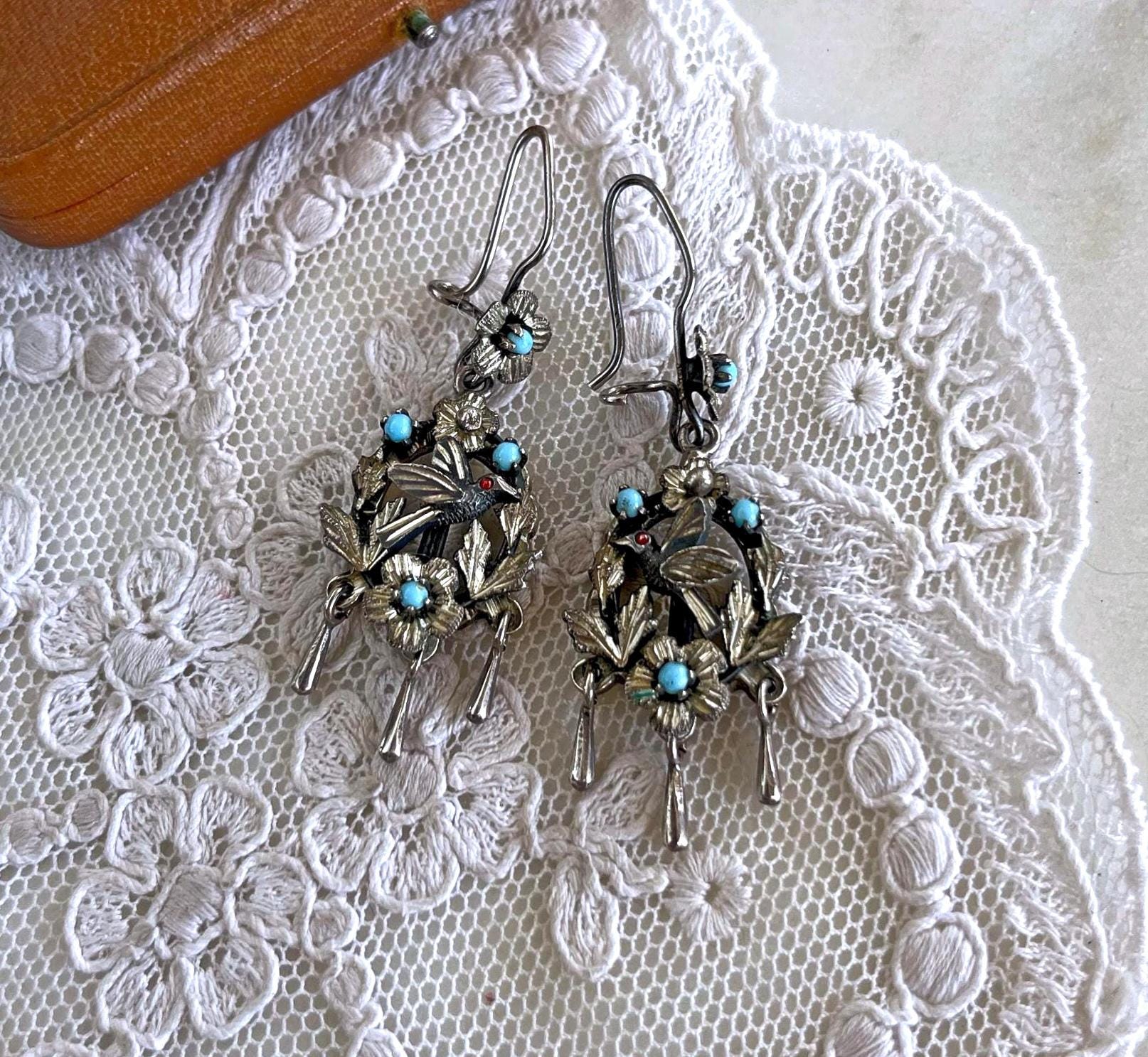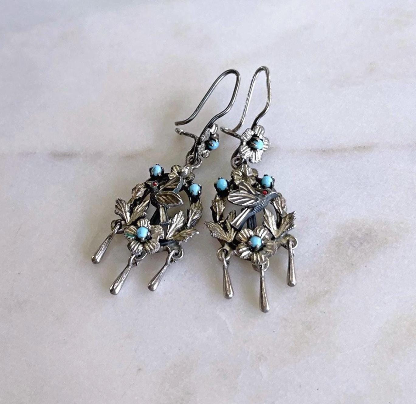 Featuring a gorgeous pair of vintage Victorian revival Frida Kahlo styled Mexico pierced sterling silver Bird drop earrings adorned with genuine Coral and turquoise seed beads. Earrings are in excellent vintage condition, with functional intact clasps with all stones present. Measuring approximately 2 inches long at 7.77 grams respectively. Stamped on reverse , these are so beautiful, highly collectible and wearable.