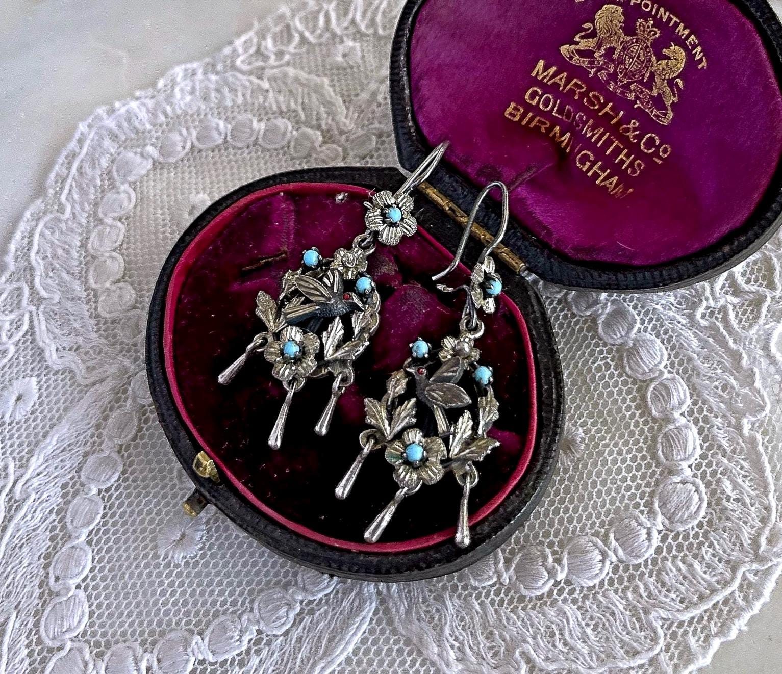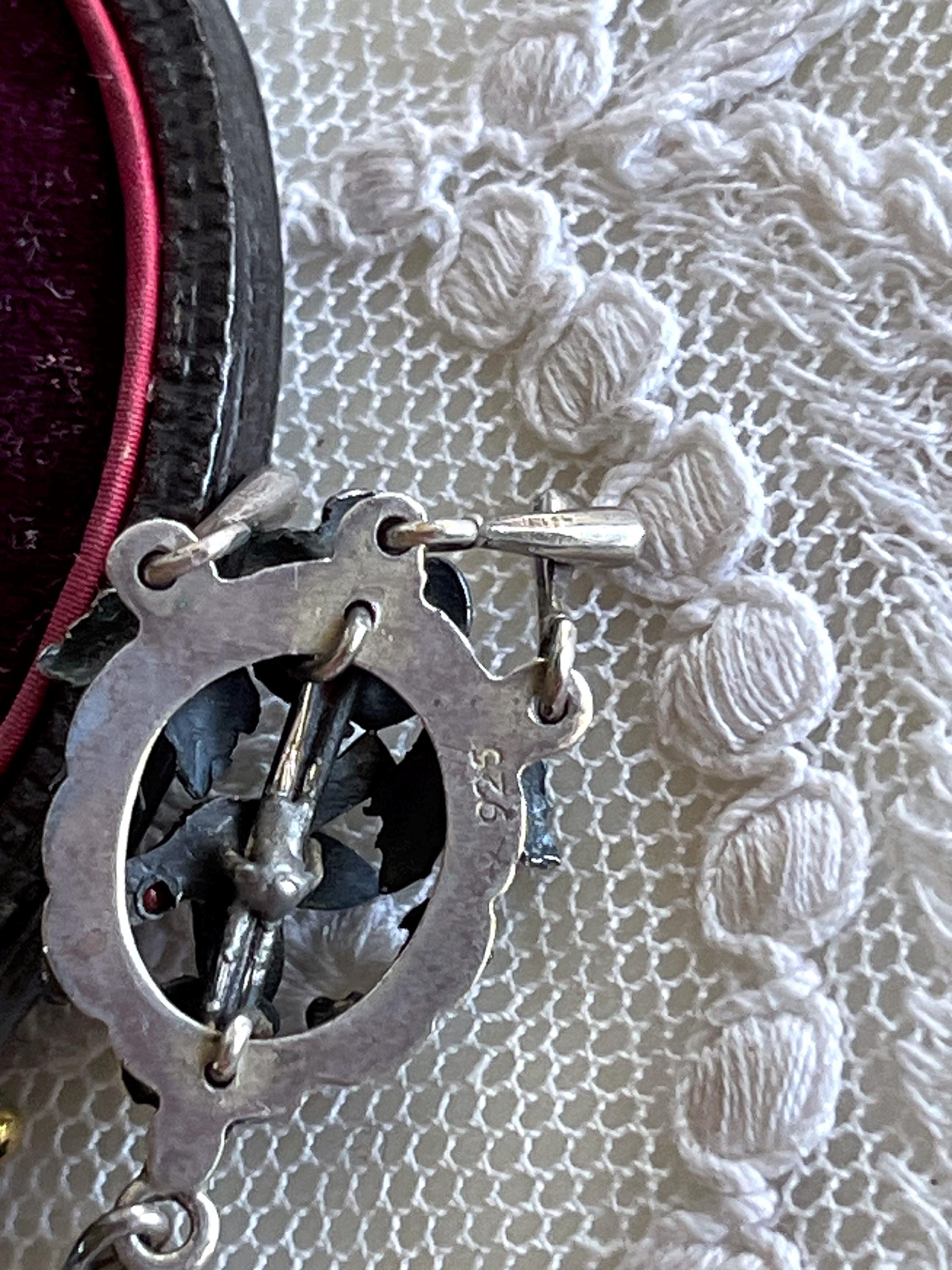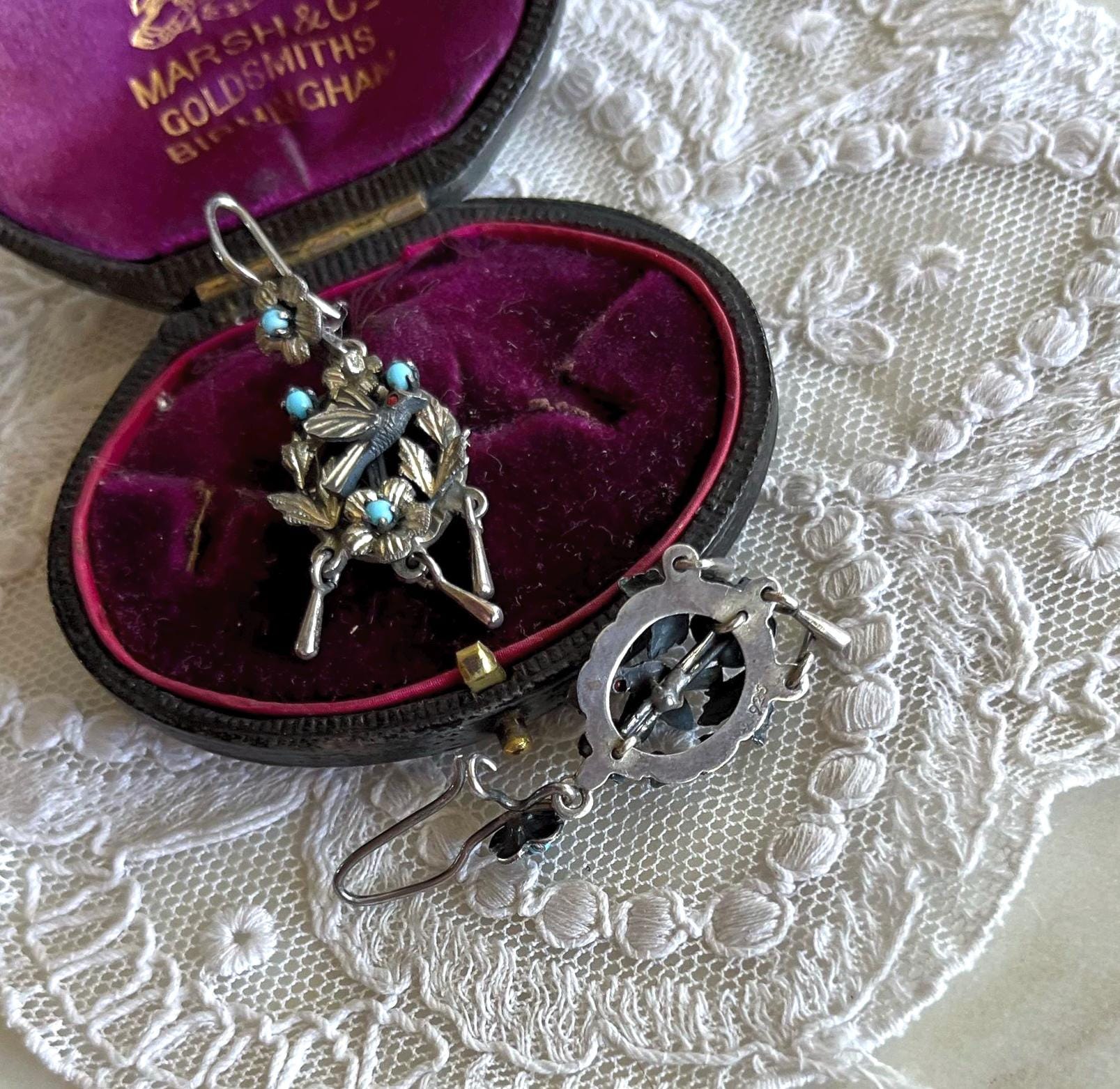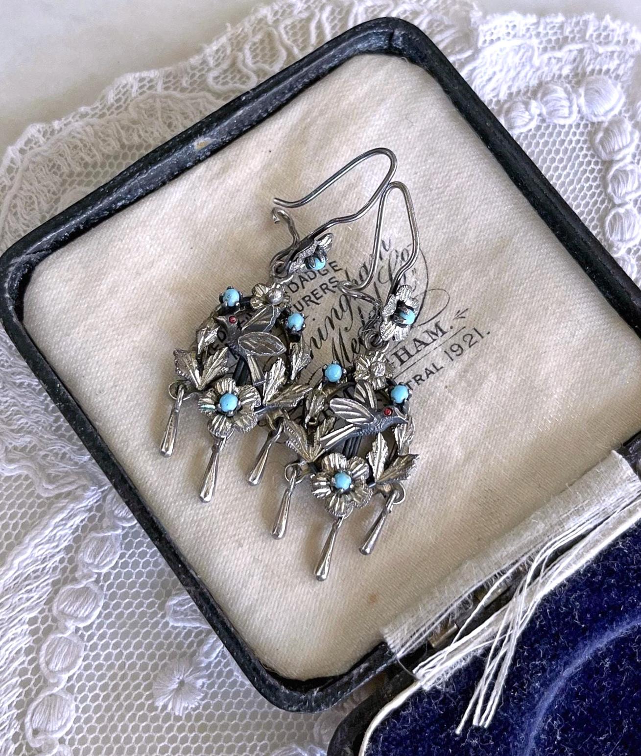 Featuring a gorgeous pair of vintage Victorian revival Frida Kahlo styled Mexico pierced sterling silver Bird drop earrings adorned with genuine Coral and turquoise seed beads. Earrings are in excellent vintage condition, with functional intact clasps with all stones present. Measuring approximately 2 inches long at 7.77 grams respectively. Stamped on reverse , these are so beautiful, highly collectible and wearable.
