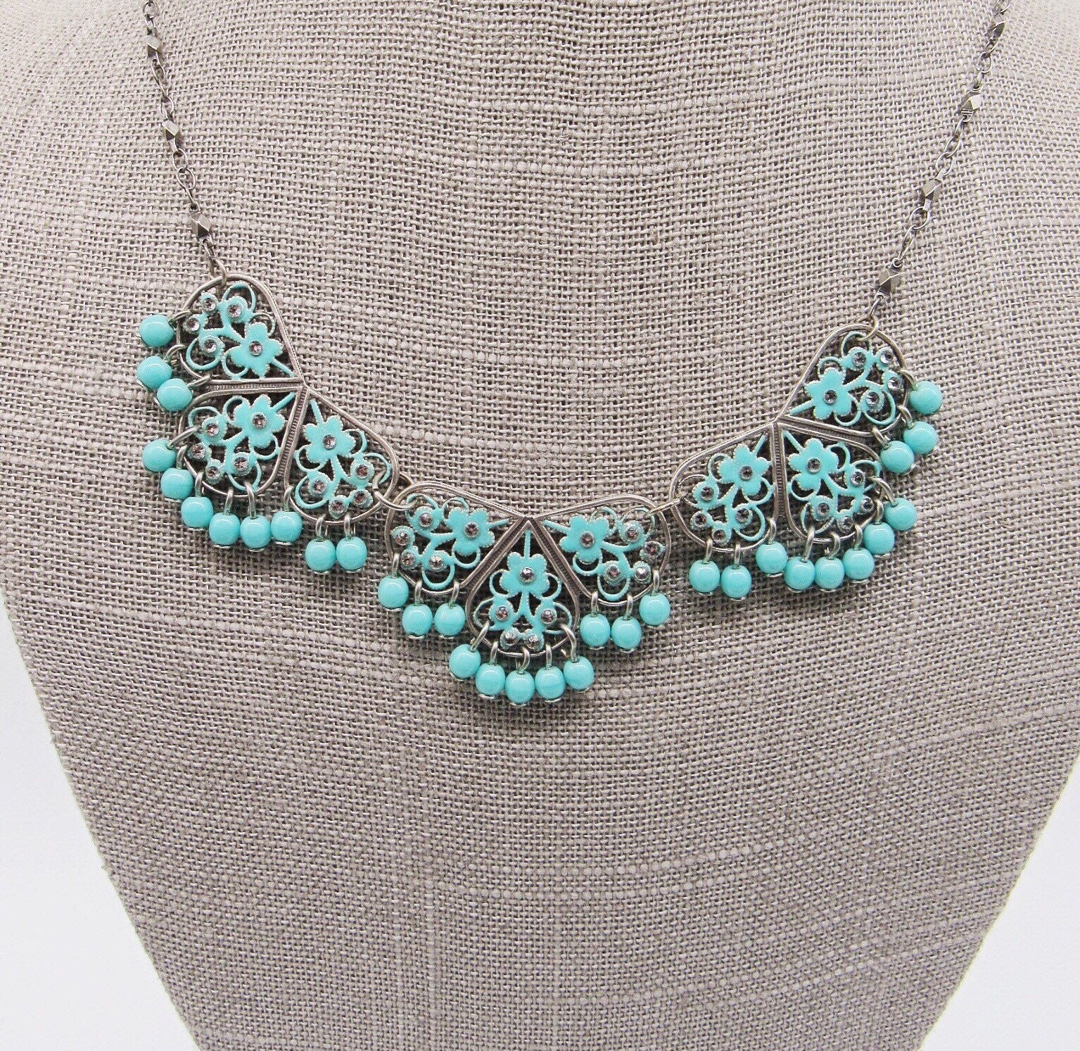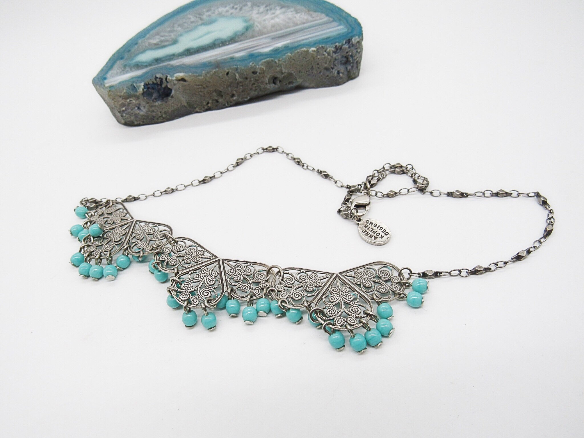 Featuring a signed vintage circa 1980s-90 Anne Koplik designs necklace adorned with enameled flowers, Swarovski crystals and turquoise ceramic beads set in silver tone settings and chain. Necklace is in excellent vintage condition with working clasp and signed Anne Koplik hangtag. Necklace measures 16 inches around with center focal point measuring 3.5 inches respectively. A wonderful example of Anne Kopliks beautiful designs, designed and handcrafted in the USA, perfect for summer and /or collecting.