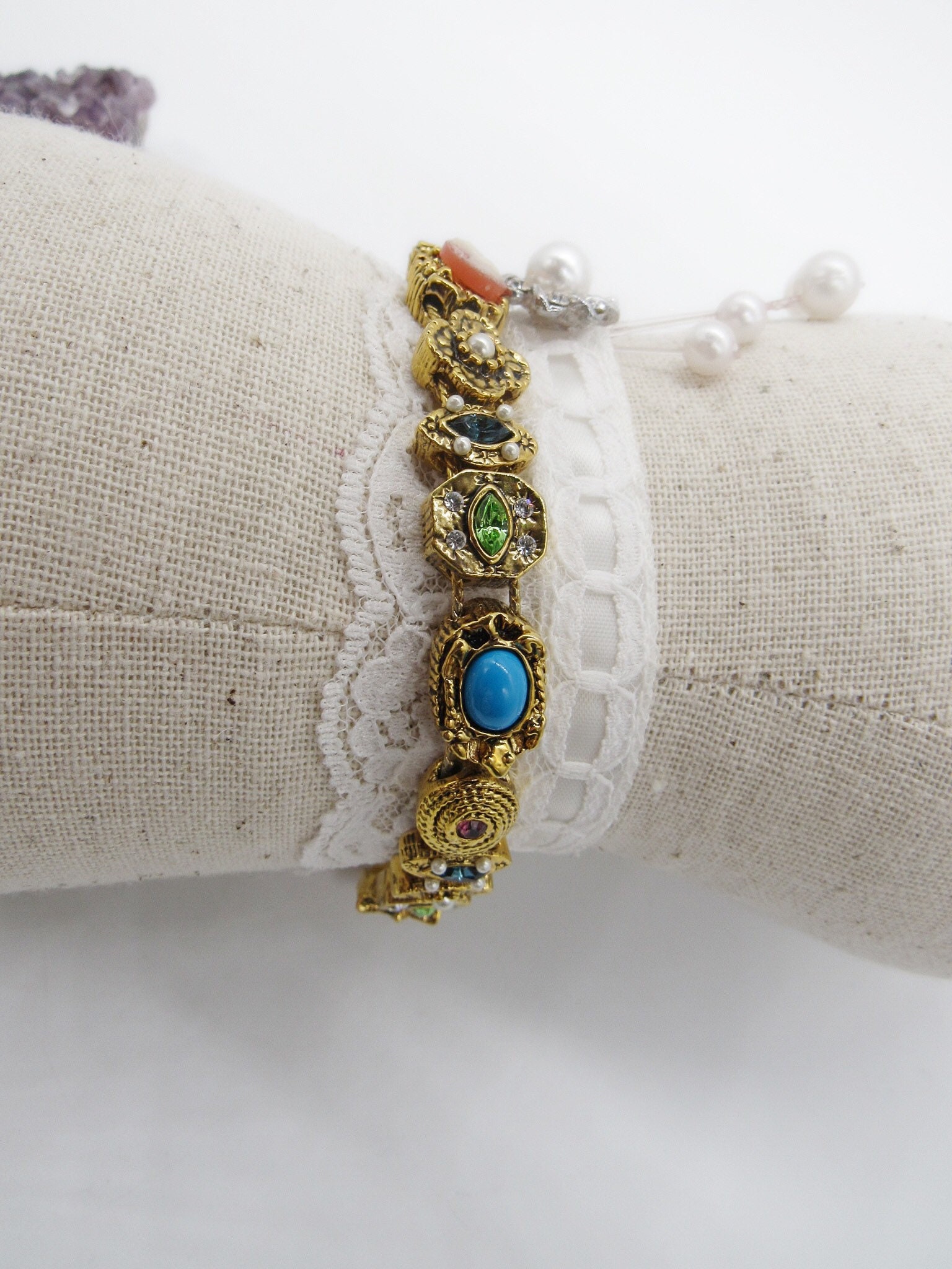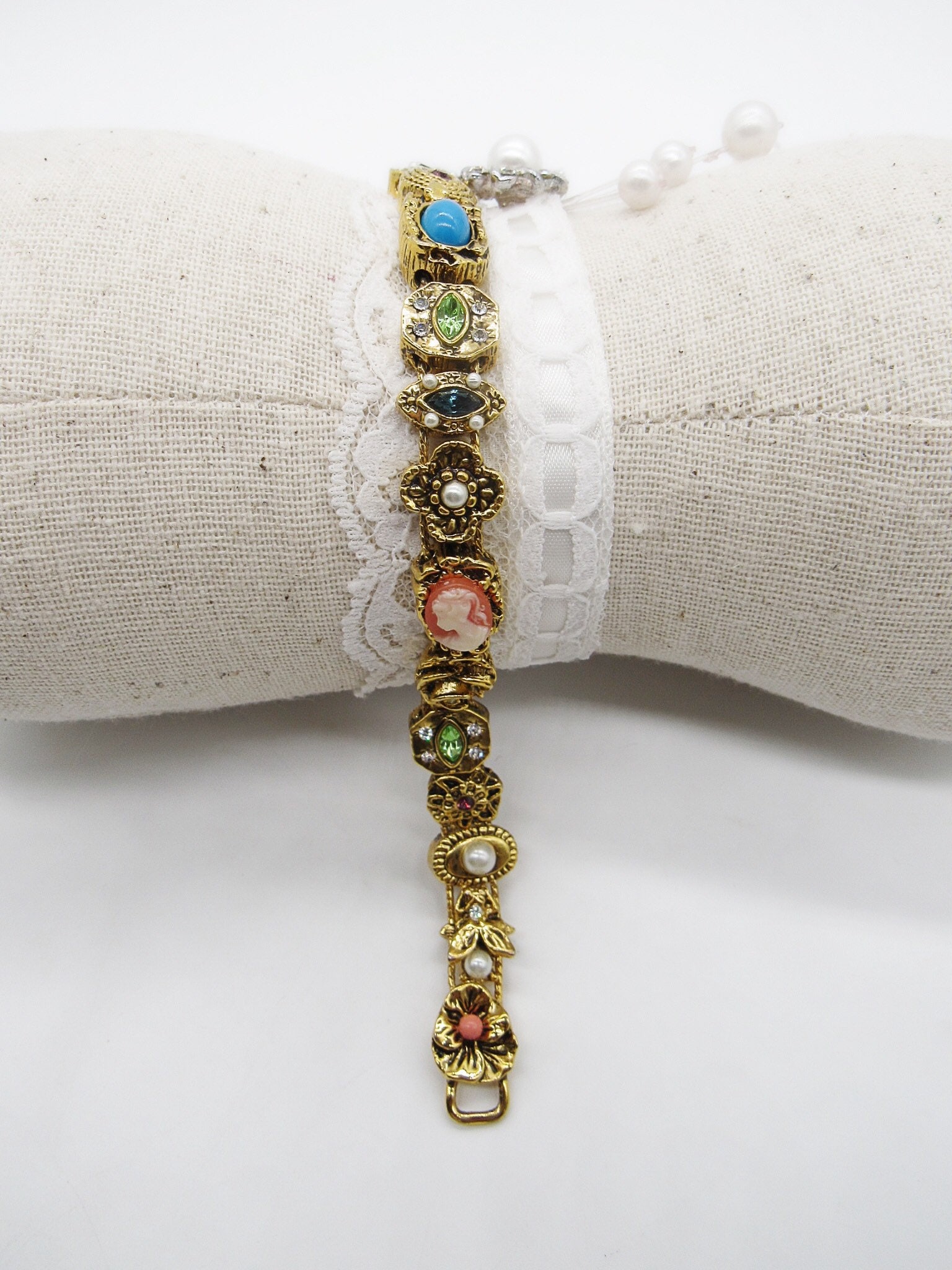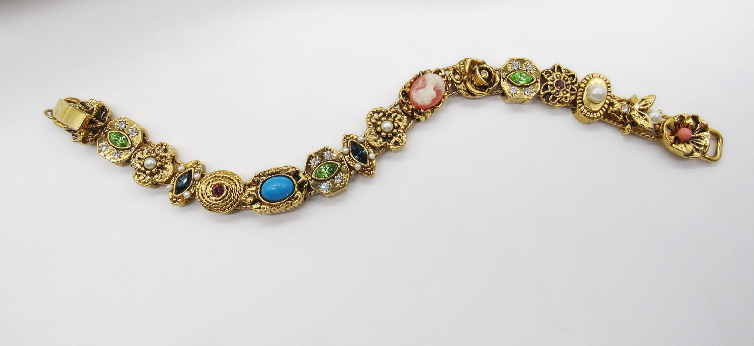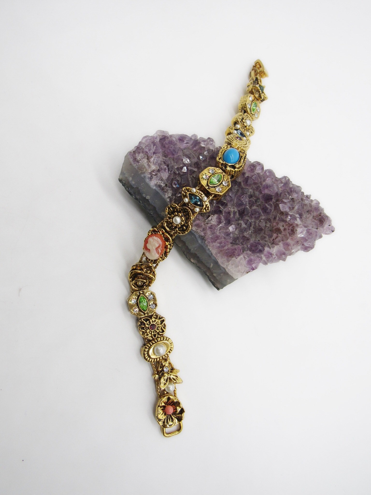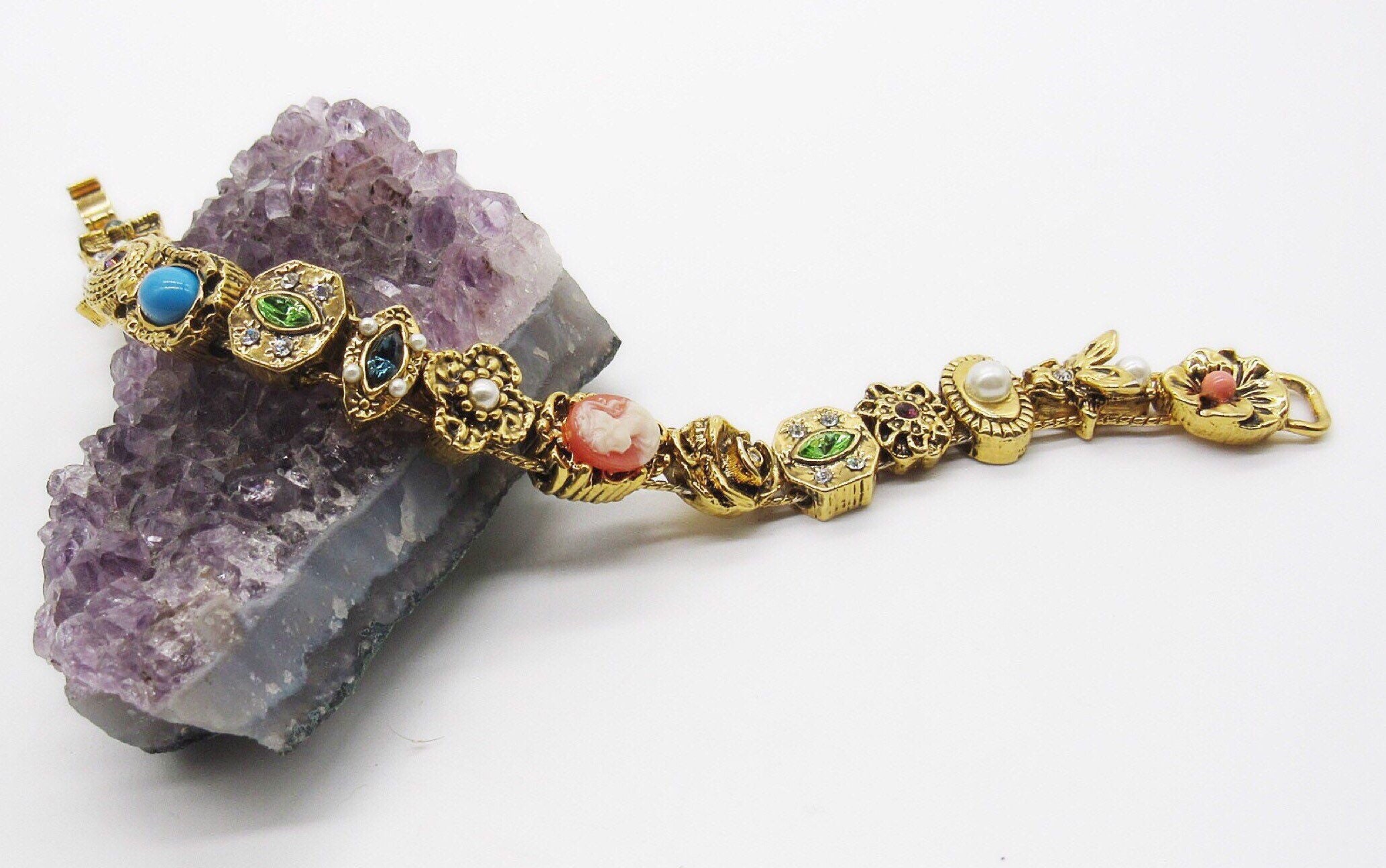 Featuring a beautiful unsigned Alexis Ashley Victorian revival charm slide bracelet. Adorned with fifteen ornate slide charms including a cameo, seed pearls, faceted multi colored Swarovski crystals, a decorative bee and flowers set in antiqued gold tone with two gold chains and working clasp. Bracelet is in excellent vintage and although unsigned it’s definitely an Alexis Ashley piece circa 1980s. A fantastic reproduction, well made with quality materials and looks as if it was never worn! Bracelet measures approximately 7.5 inches around.