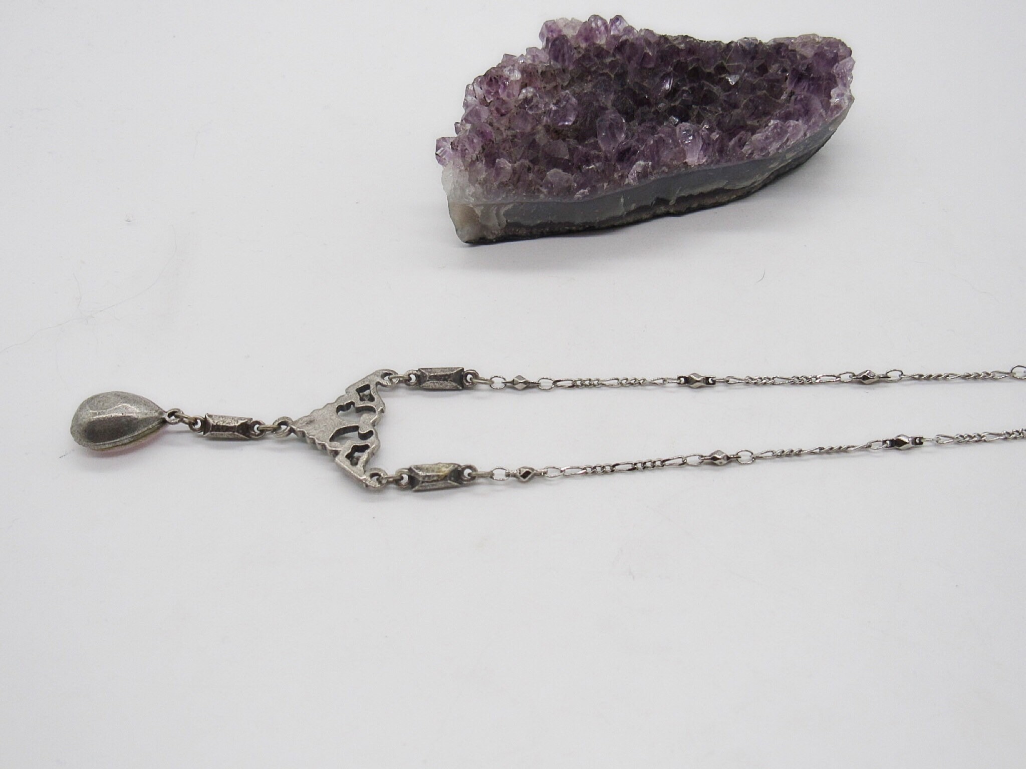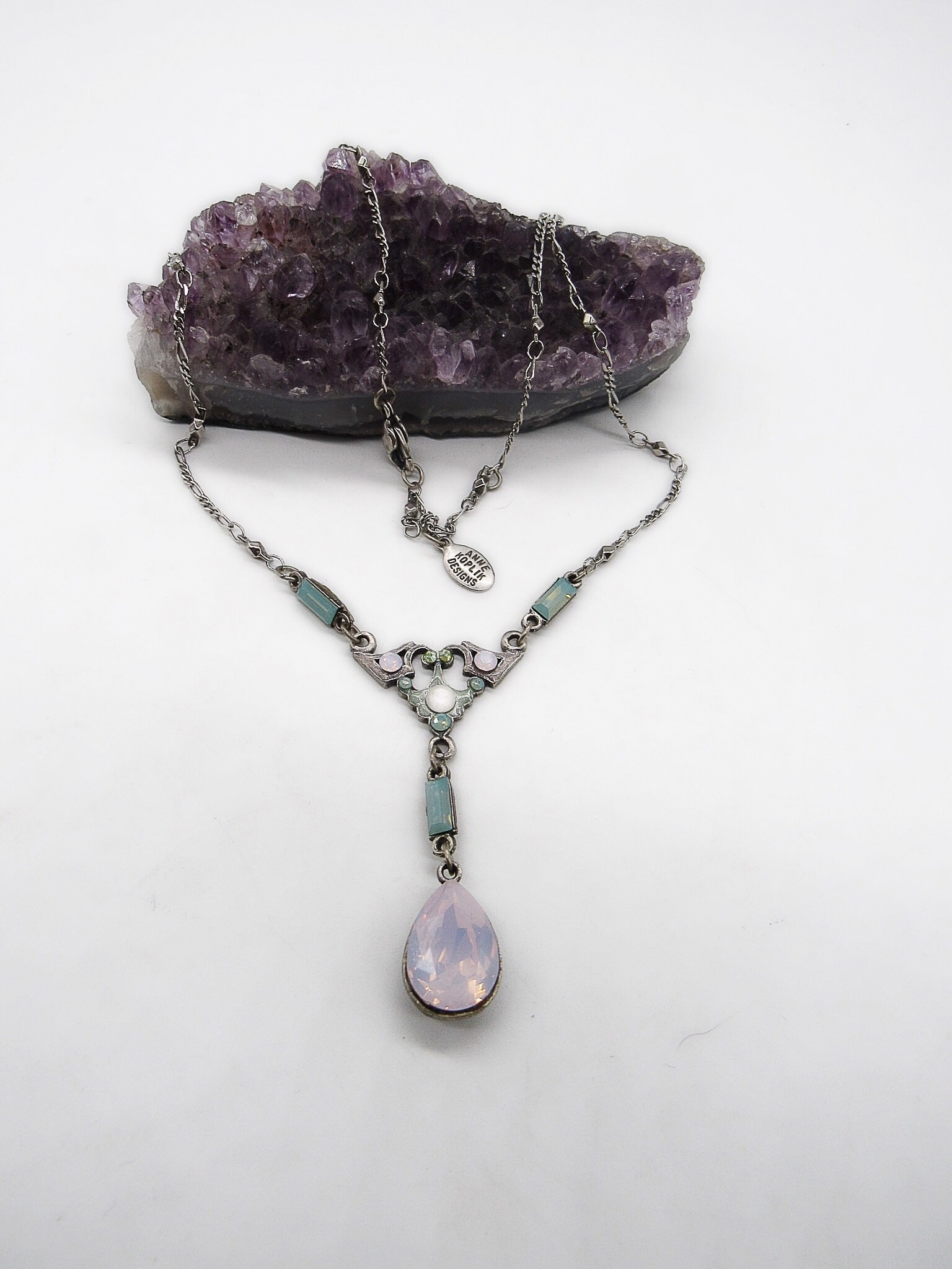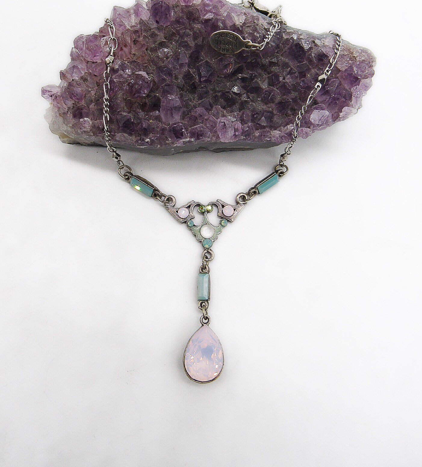 Featuring a beautiful feminine signed Anne Koplik vintage necklace adorned with round and tear drop faceted Rose Water Opal Swarovski crystals, faceted Aurora Borealis stones and rectangular Swarovski Pacific Opal stones set in closed antiqued silver tone. Necklace measures approximately 14 inches around with a 2 inch extender chain and signed Anne Koplik designs hangtag. Necklace is in excellent vintage condition with working clasp and normal wear.