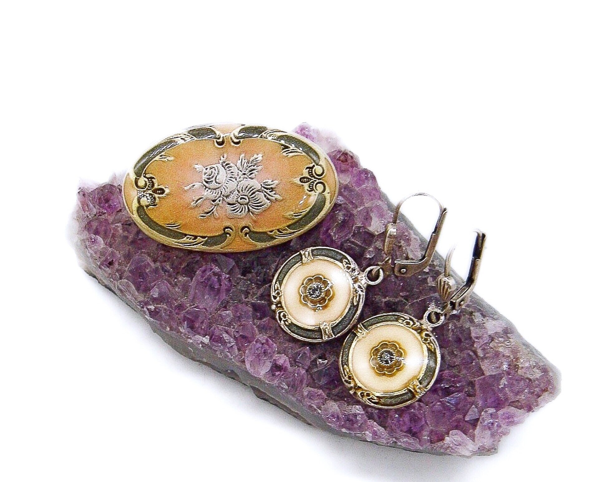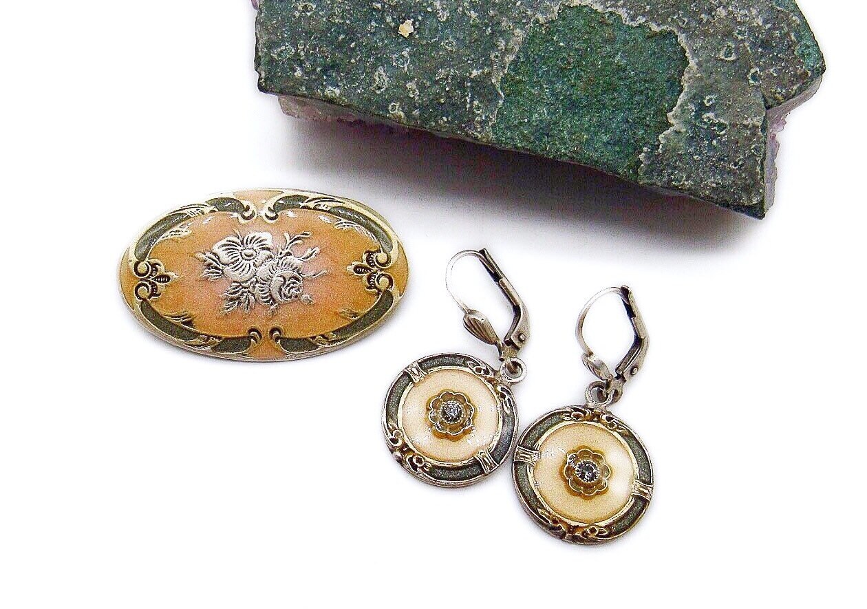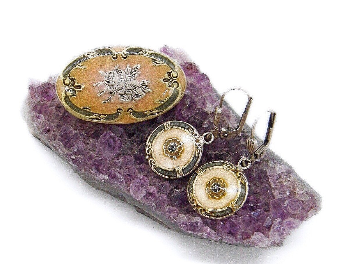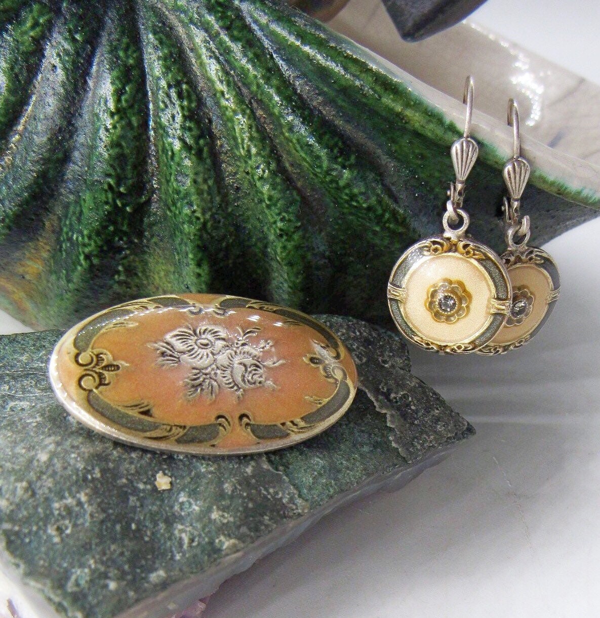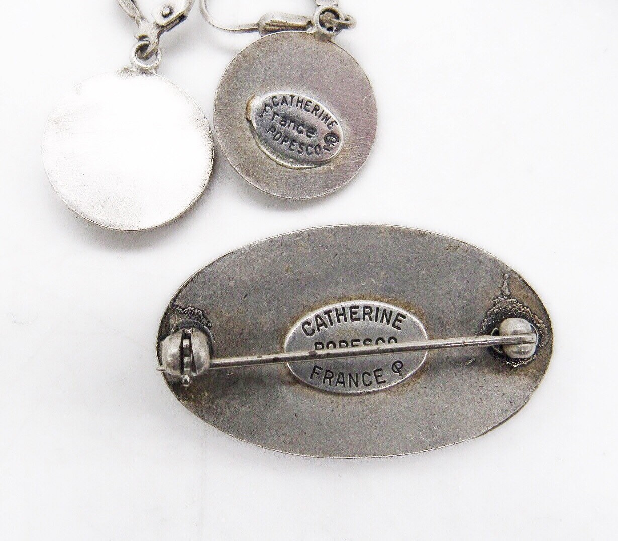 Featuring a beautiful dainty signed brooch and earrings set by Catherine Popesco of France, adorned with warm Butter Cream yellow, peach and green enamel with decorative scroll work and faceted Crystal accents. Earrings measure approximately 1 inch long with brooch measuring 1 1/4 by .75 inches respectively, all three pieces are in excellent vintage condition with working clasps and signed Catherine Popesco France plaques on the reverse. Designed and handcrafted in France utilizing vintage opponents, antique designs and excellent handwork! La Vie Parisienne!!!