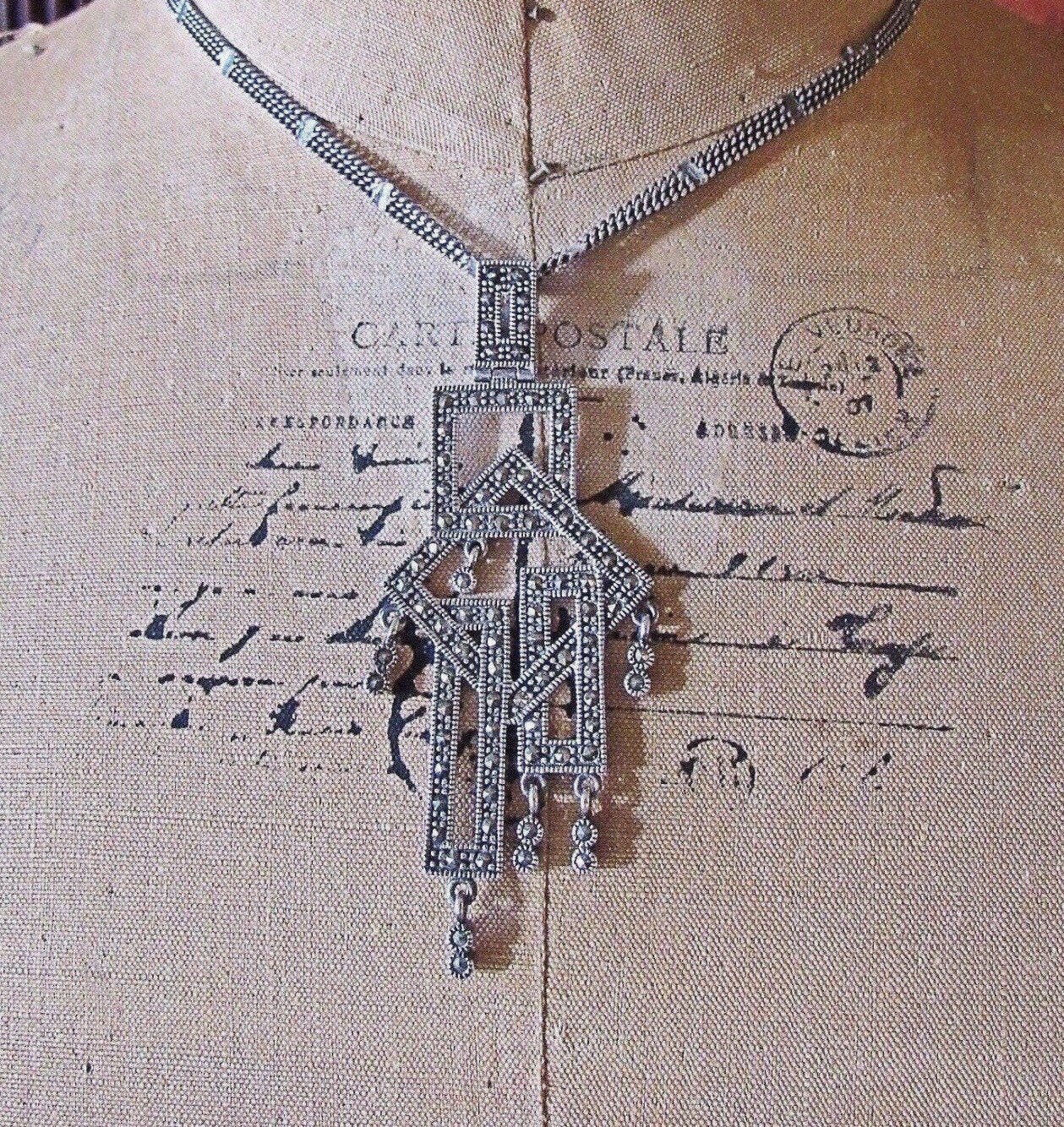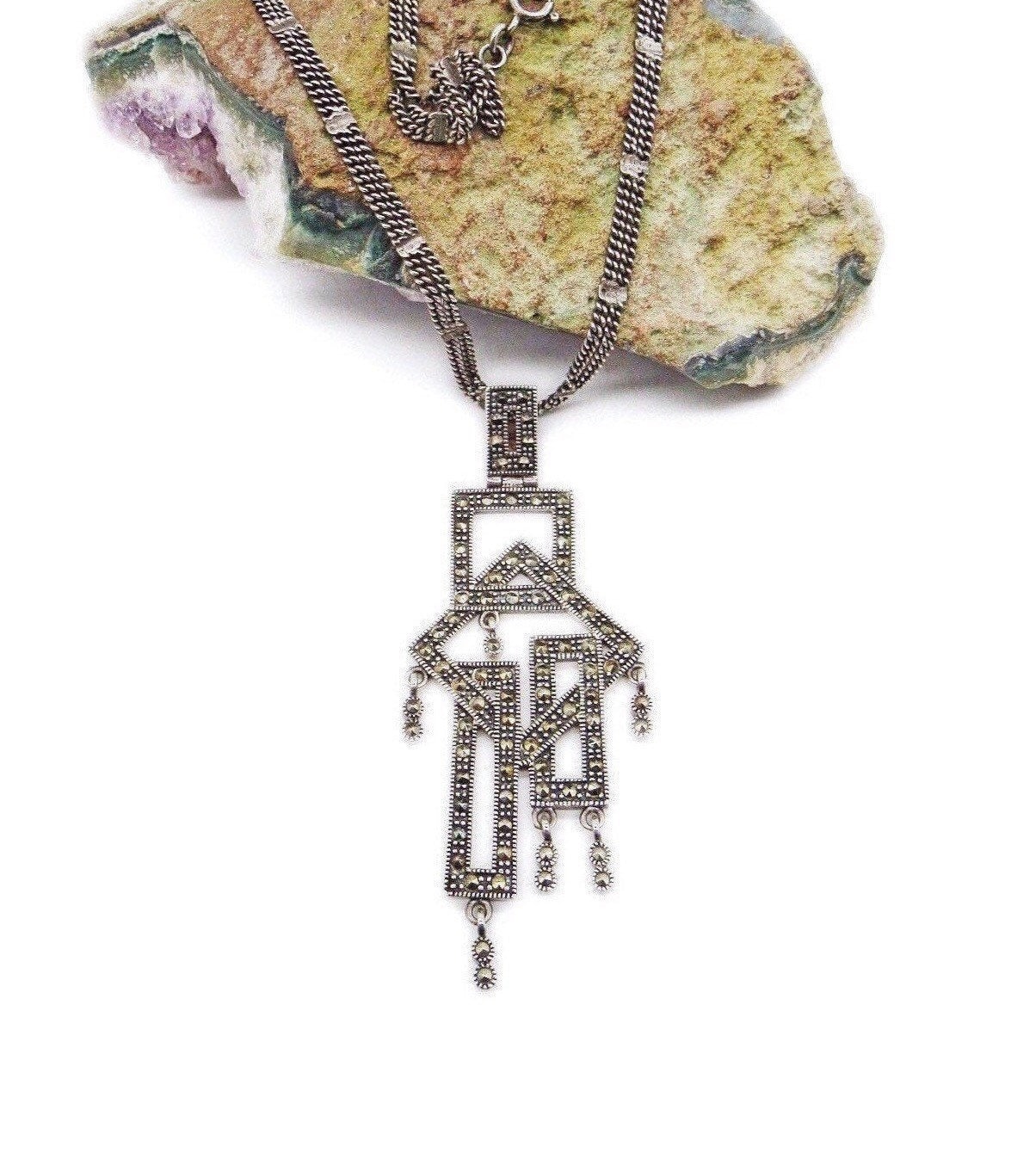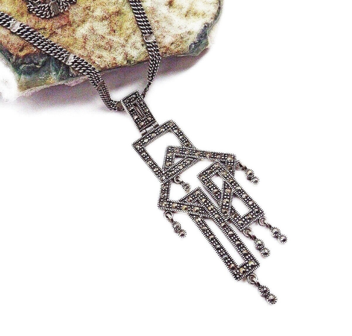 Featuring an outstanding vintage Art Deco styled signed sterling silver double chain necklace adorned with a 3 by 1 1/4 inch geometrical sterling pendant accented with brilliant faceted marcasite signed 925 TH on the reverse. Necklace measures approximately 16 inches around with a 3 inch pendant drop, all stones accounted for and functional clasp. Necklace is in excellent vintage condition with a nice slight patina. This is a beautiful unique piece, haven’t seen any like this!! 22.5 grams of gorgeous!
