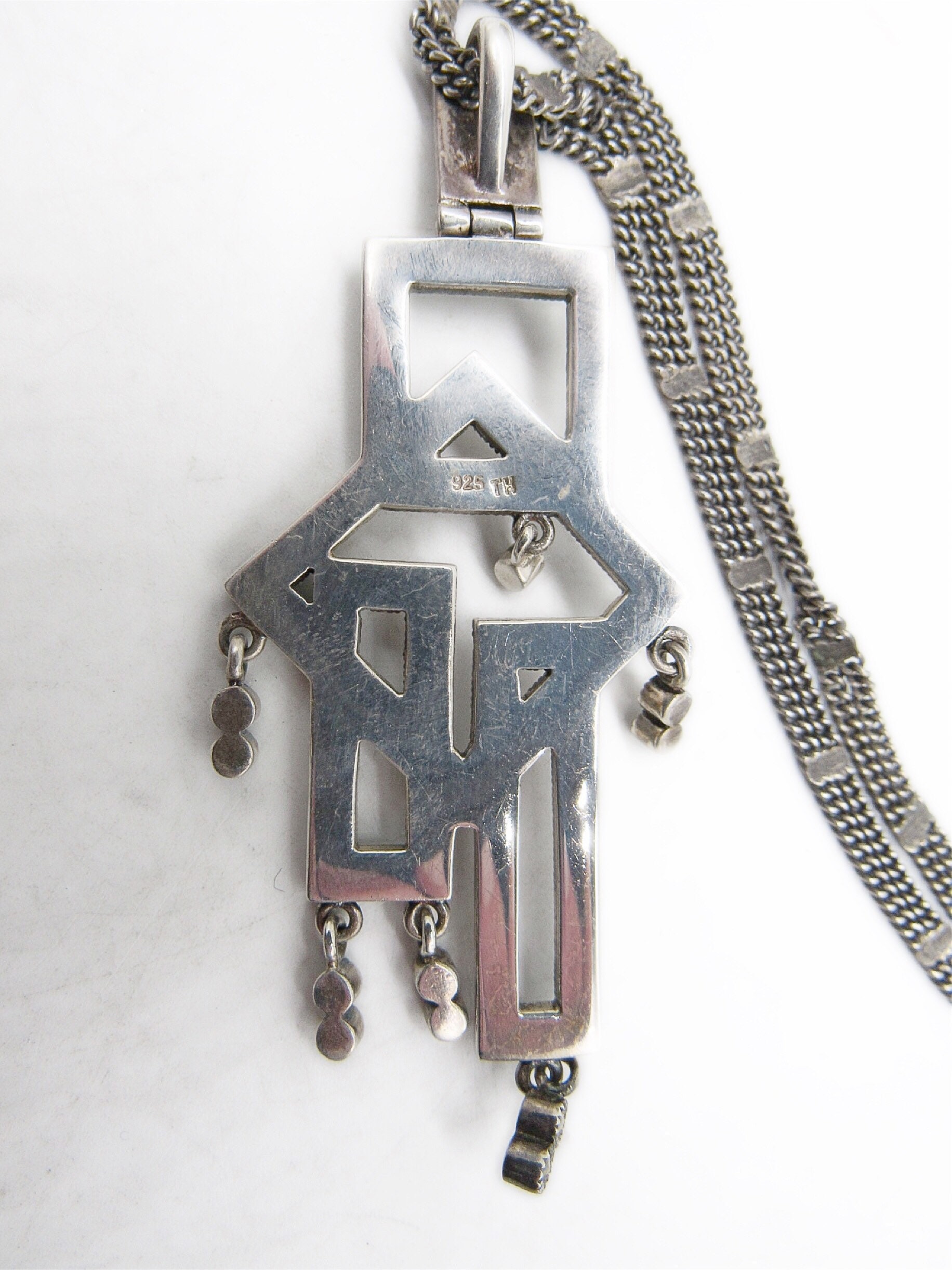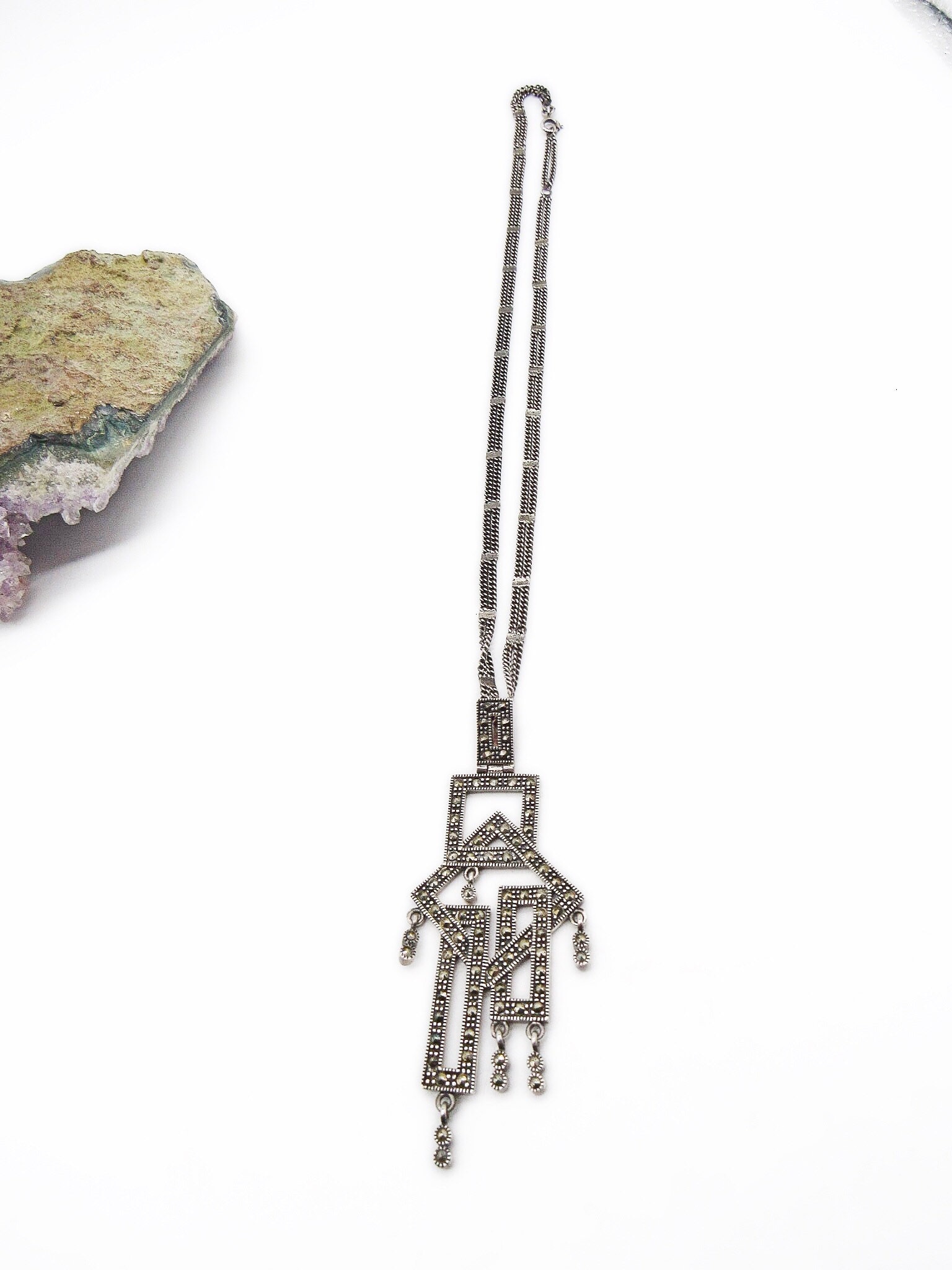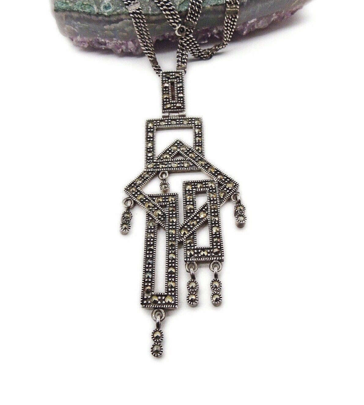 Featuring an outstanding vintage Art Deco styled signed sterling silver double chain necklace adorned with a 3 by 1 1/4 inch geometrical sterling pendant accented with brilliant faceted marcasite signed 925 TH on the reverse. Necklace measures approximately 16 inches around with a 3 inch pendant drop, all stones accounted for and functional clasp. Necklace is in excellent vintage condition with a nice slight patina. This is a beautiful unique piece, haven’t seen any like this!! 22.5 grams of gorgeous!