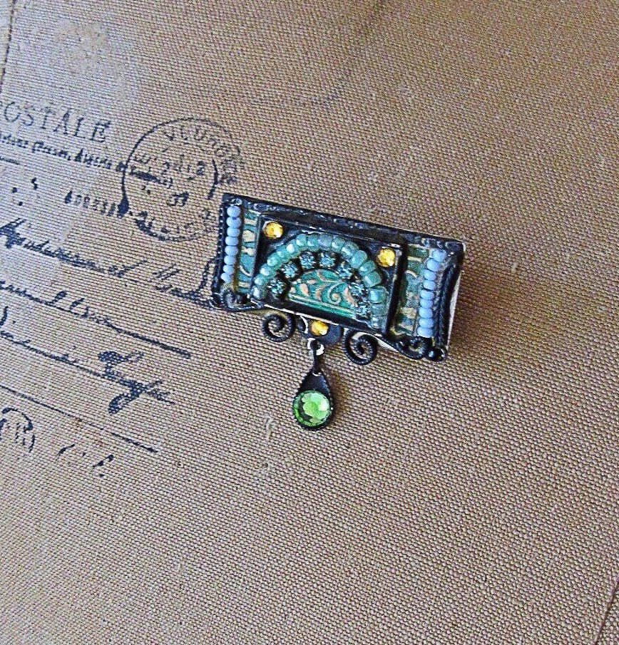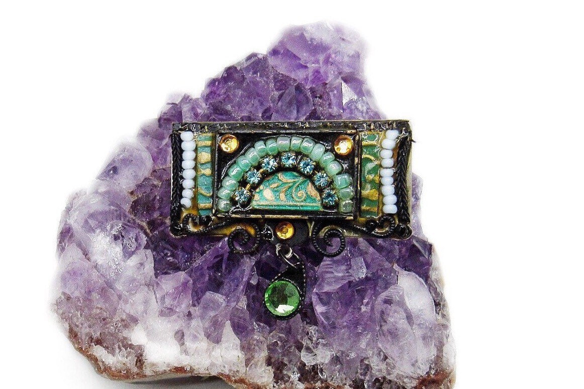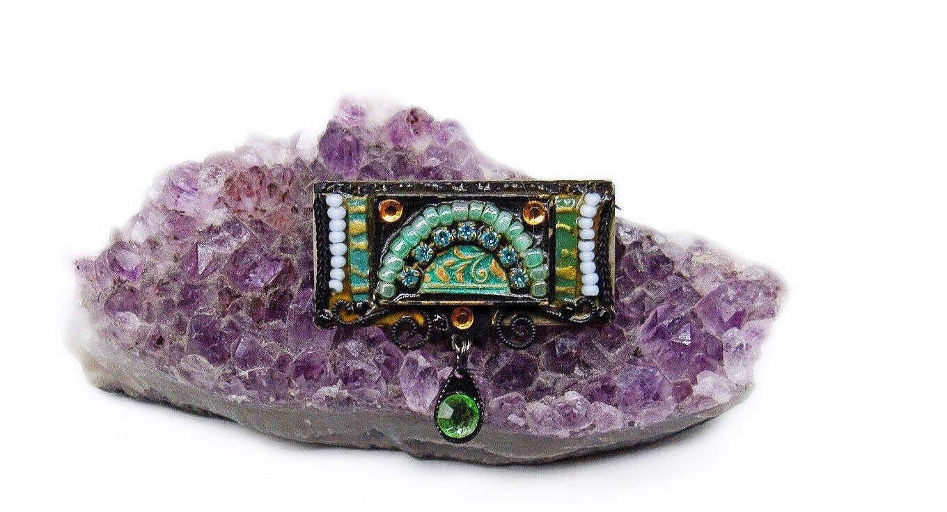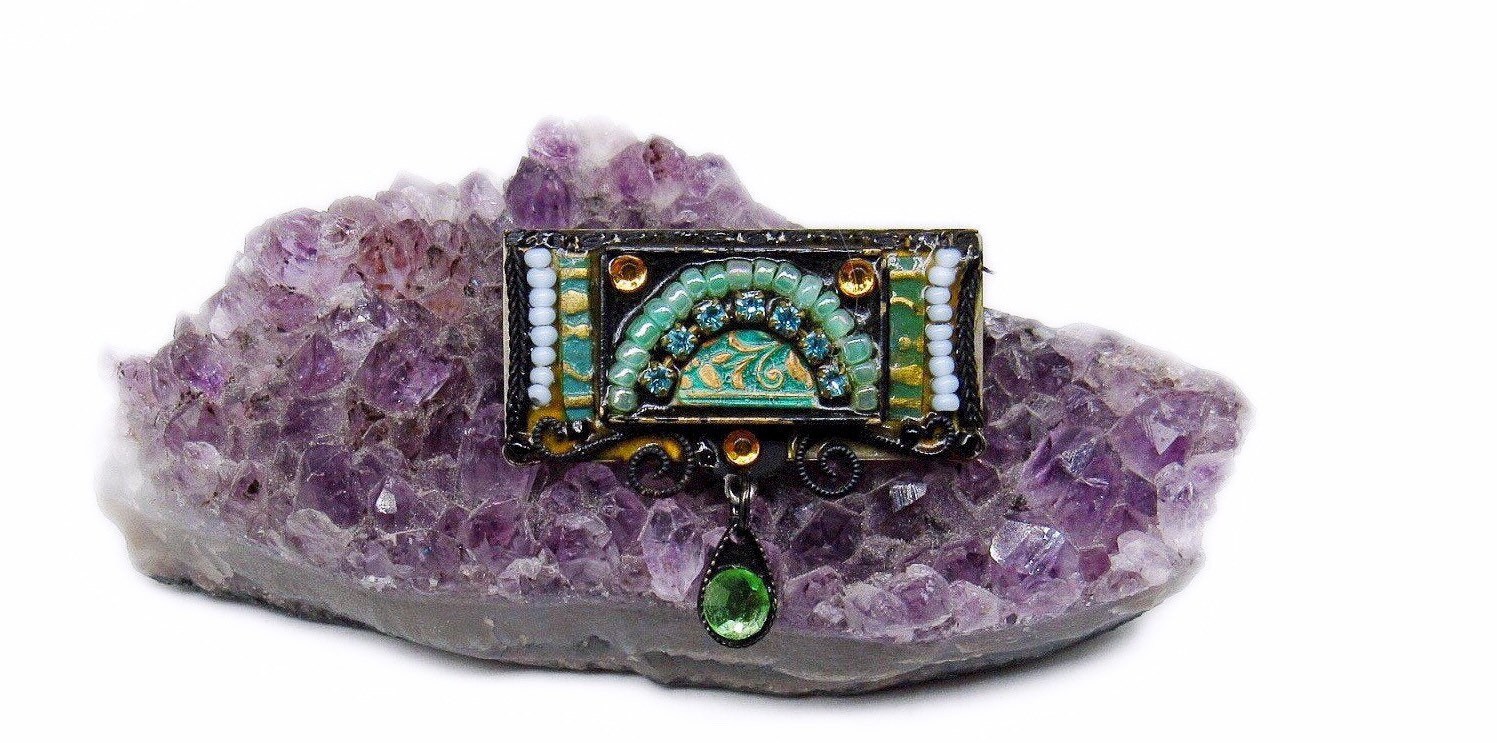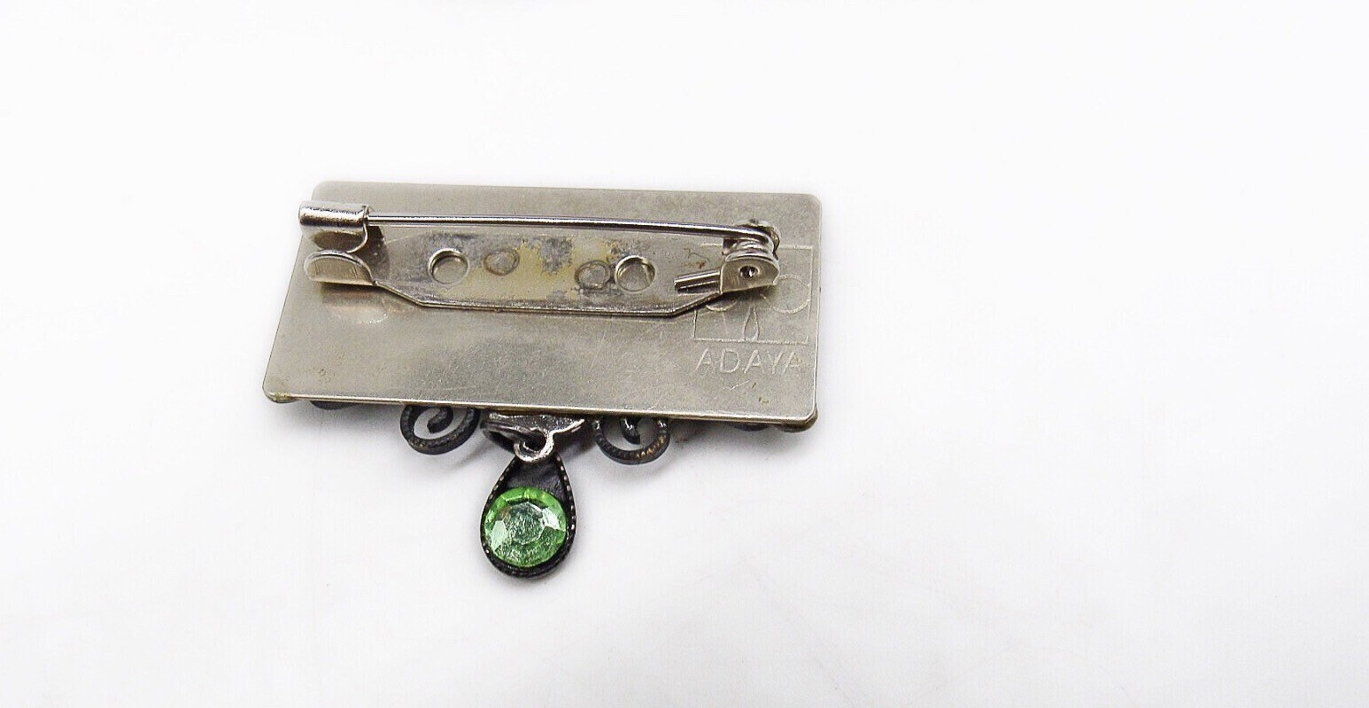 Featuring a beautifully handcrafted vintage Adaya by Maya Rayten gold and silver tone dangle brooch adorned with decorative hand painted enamel scroll work with luminous faceted Austrian Crystal accented with delicate barely blue Czech Glass beads and a faceted Peridot Austrian Crystal dangle. Brooch is in excellent vintage condition with working antique style fold over clasp, minimal wear and all stones accounted for with intact enamel work. Brooch measures approximately 1 1/4 by 1 1/8 inches respectively and is stamped ADAYA on the reverse. Designed and handcrafted in Israel!