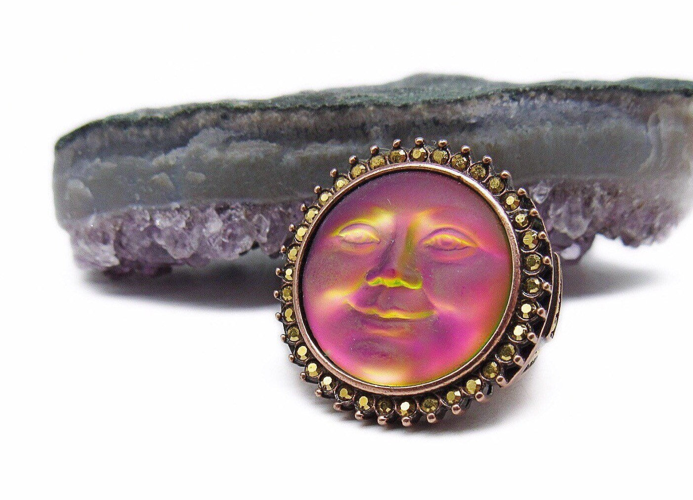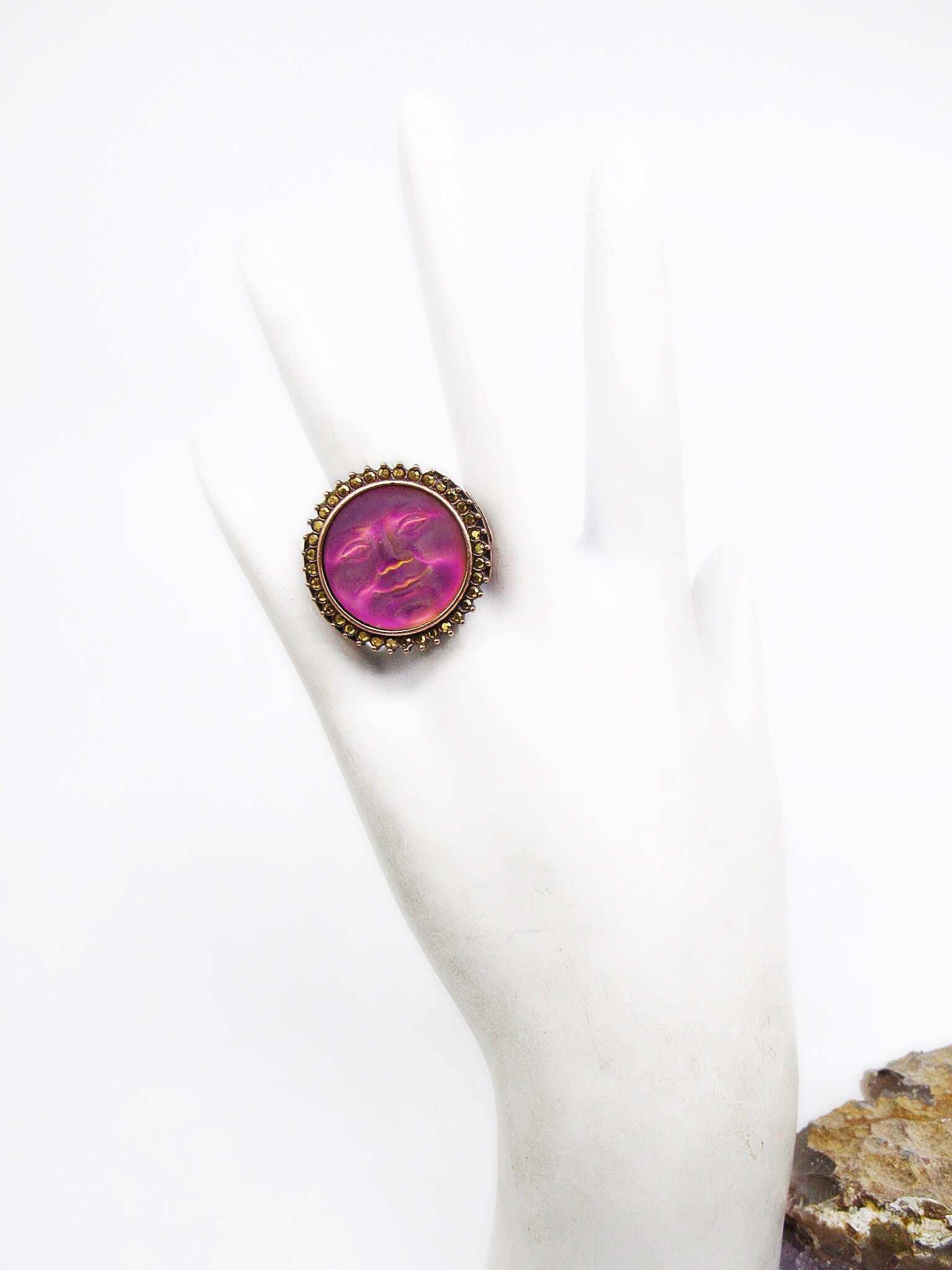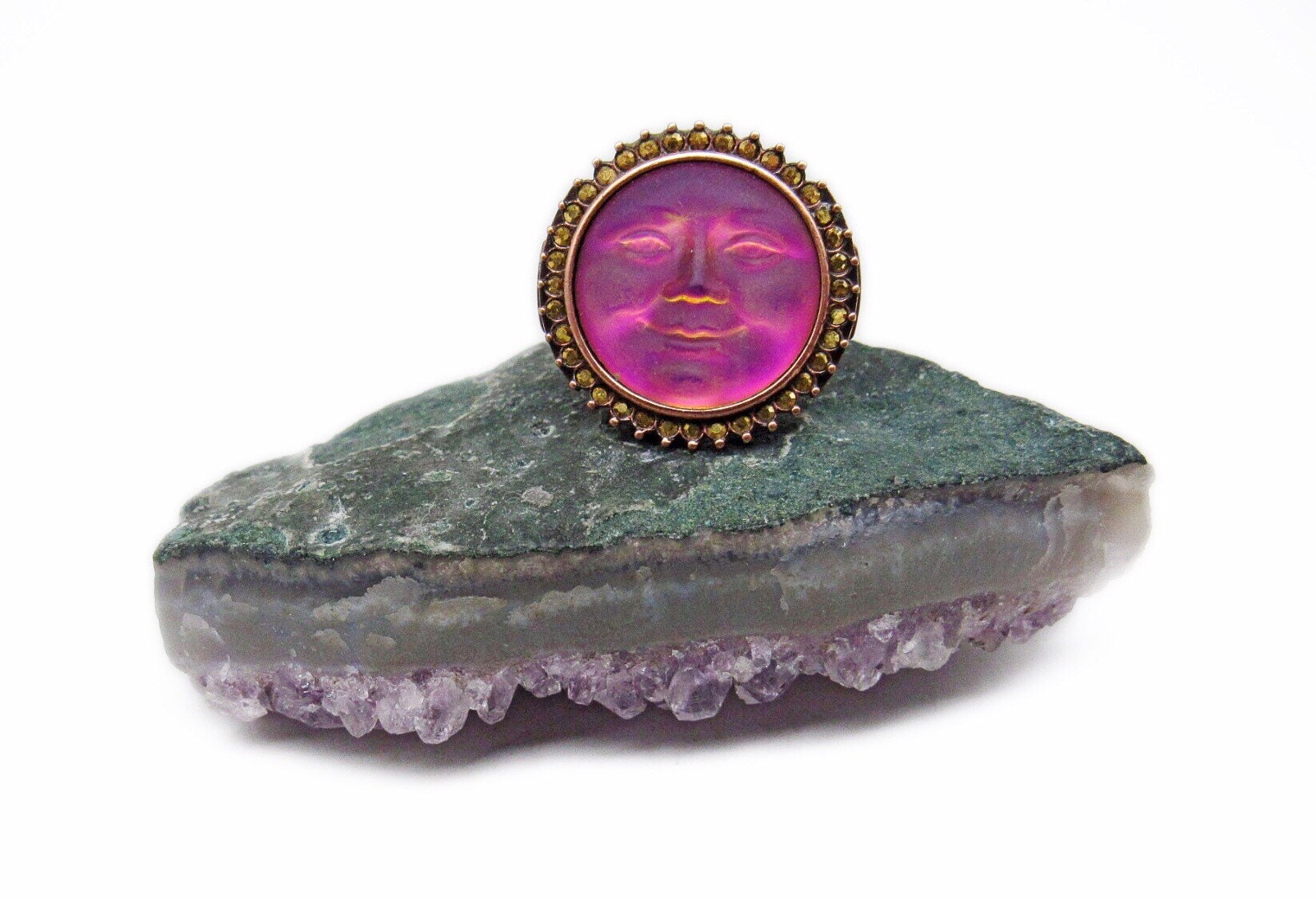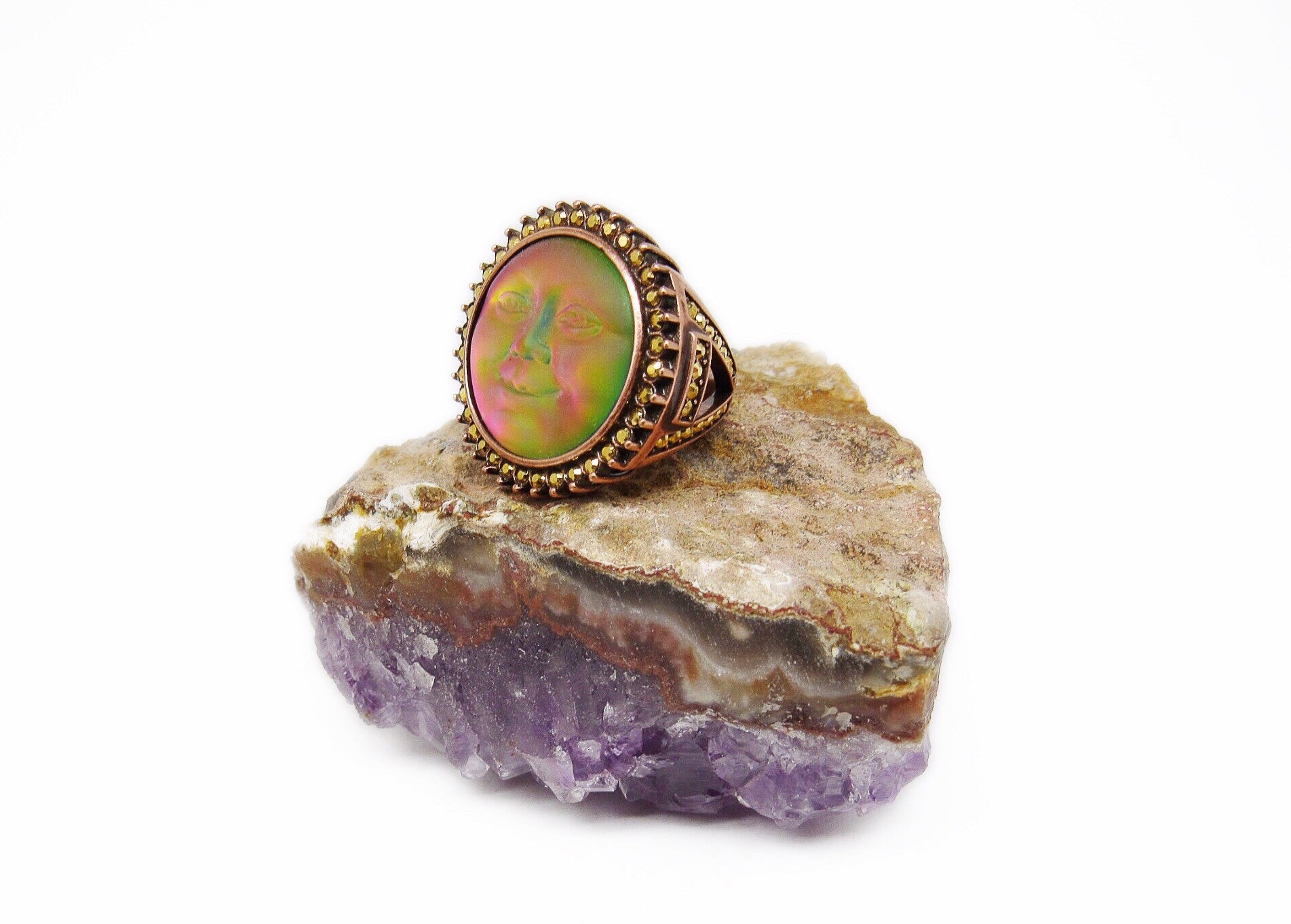 Featuring an amazing vintage Kirks Folly antiqued burnished brass tone statement ring adorned with a beautiful luminous 1 inch in diameter Rose tone Iridis opalescent Seaview Moon Face in a bezel pronged setting accented with a halo of round faceted Aurora Borealis Crystals. Ring is in excellent vintage condition signed KIRKS FOLLY on the inside of band, minimal wear with all stones accounted for. Ring is size 7 and shines Rose, green and yellow! A beautiful vintage piece!