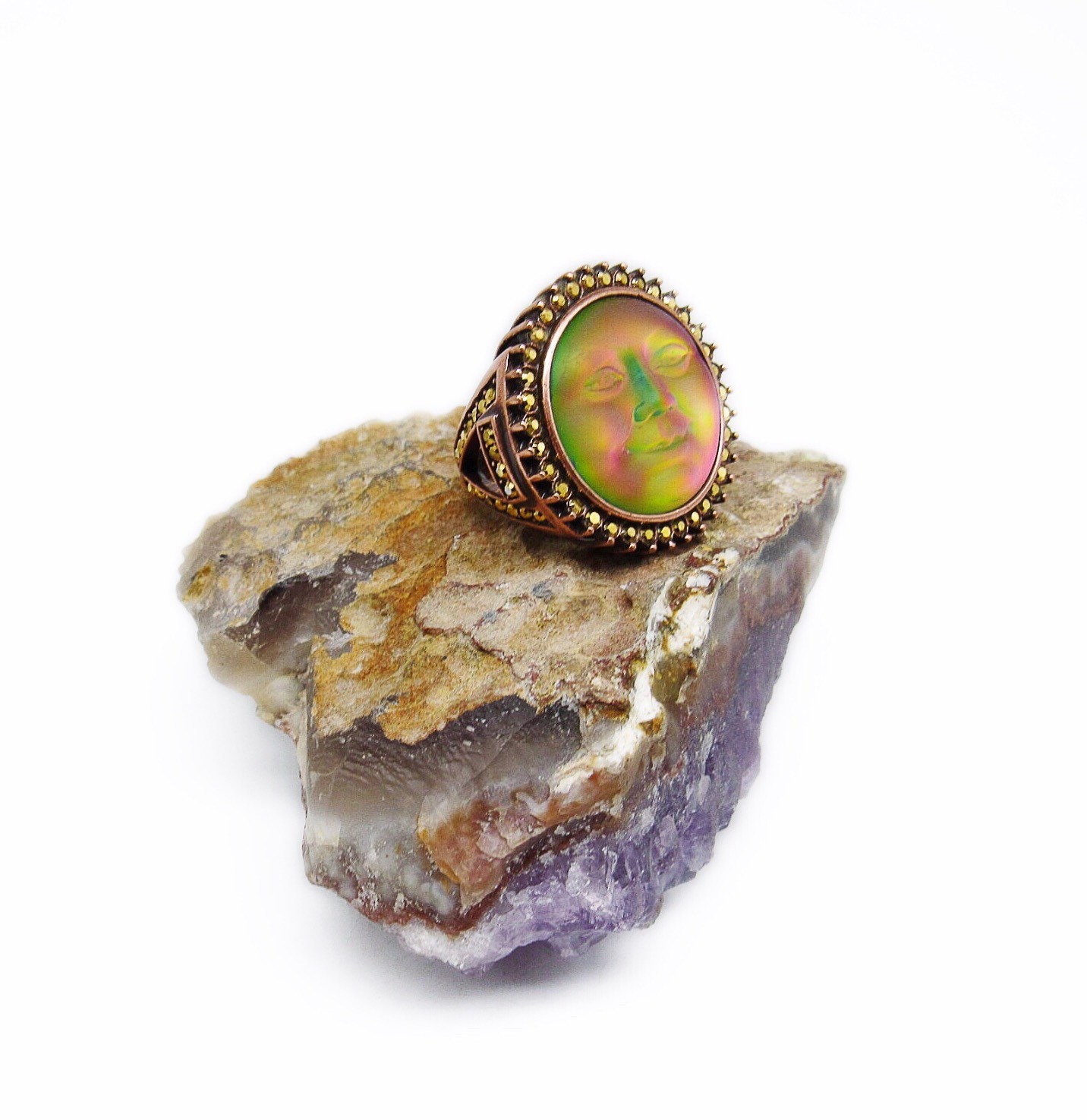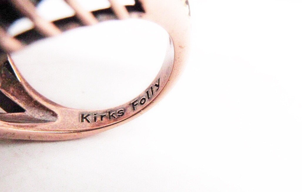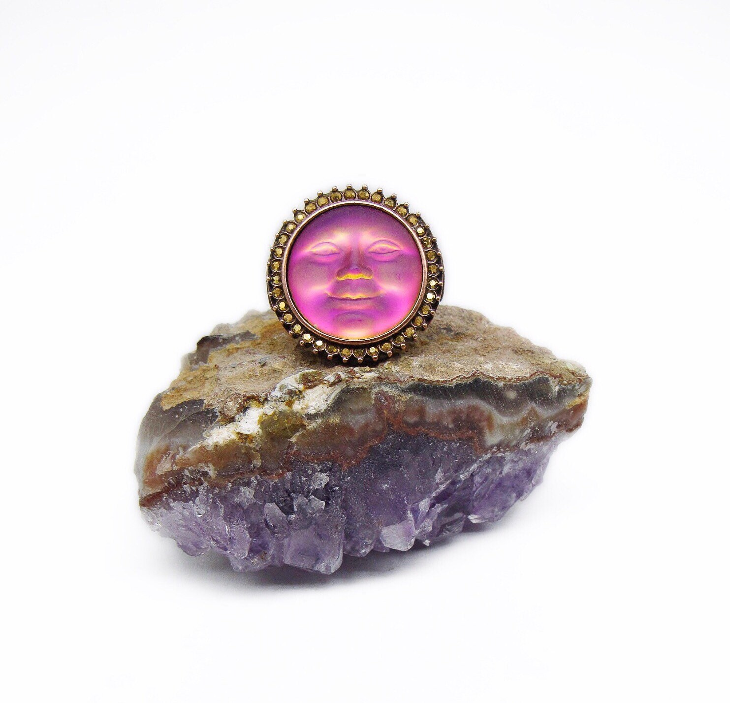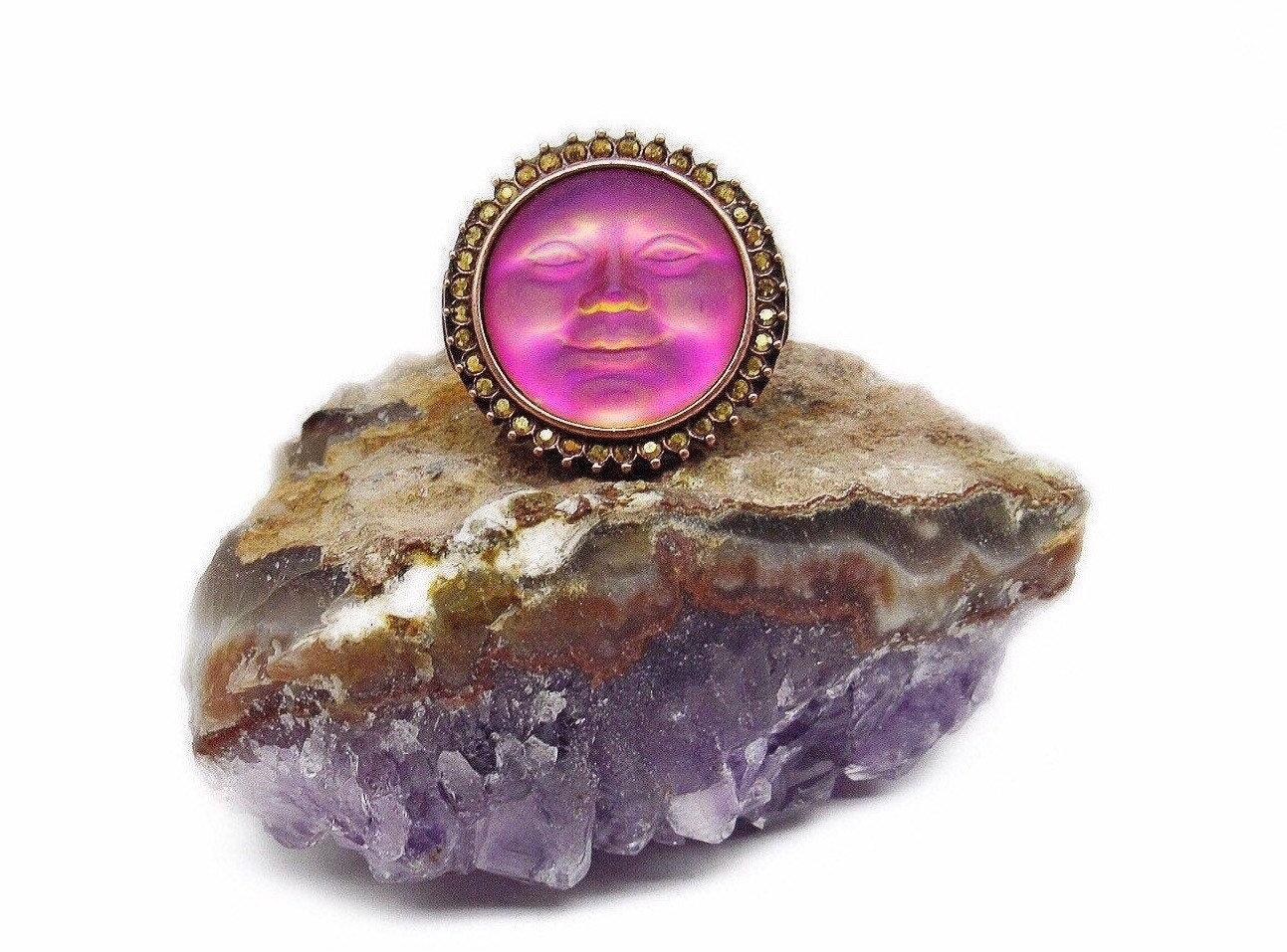 Featuring an amazing vintage Kirks Folly antiqued burnished brass tone statement ring adorned with a beautiful luminous 1 inch in diameter Rose tone Iridis opalescent Seaview Moon Face in a bezel pronged setting accented with a halo of round faceted Aurora Borealis Crystals. Ring is in excellent vintage condition signed KIRKS FOLLY on the inside of band, minimal wear with all stones accounted for. Ring is size 7 and shines Rose, green and yellow! A beautiful vintage piece!